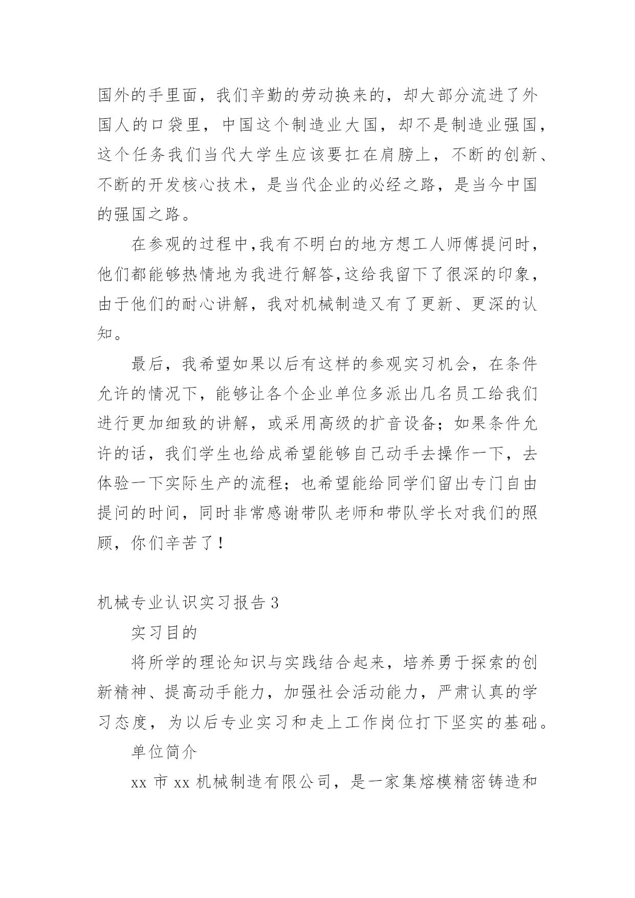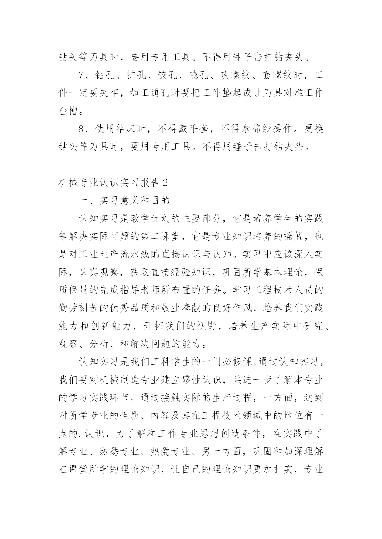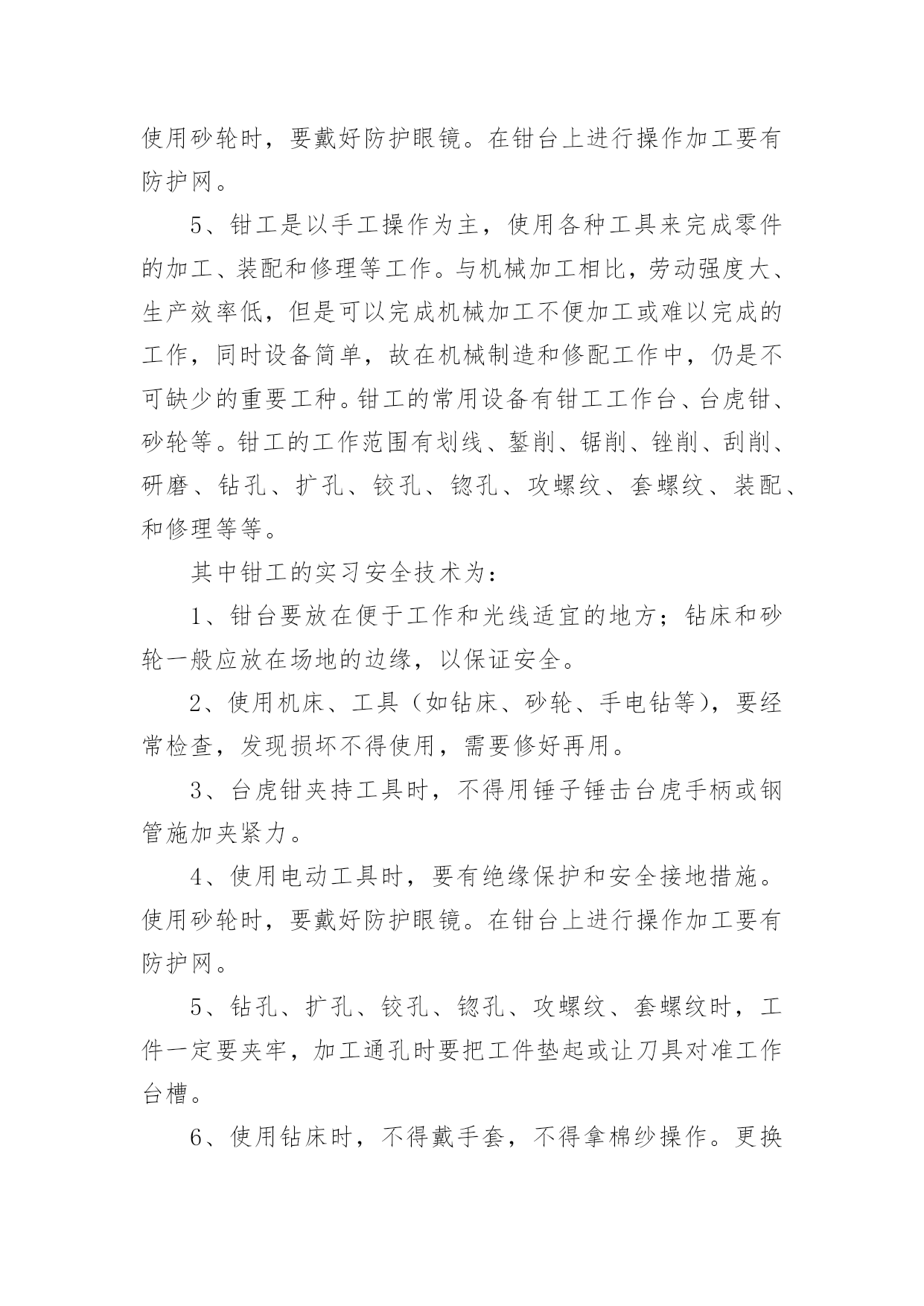 机械专业认识实习报告随着个人的文明素养不断提升,报告与我们的生活紧密相连,报告具有语言陈述性的特点。那么一般报告是怎么写的呢?下面是小编帮大家整理的机械专业认识实习报告,仅供参考,欢迎大家阅读。机械专业认识实习报告1生产实习是我们机械专业学习的一个重要环节,是我们将课堂上学到的理论知识与实际相结合的一个很好的机会,是对我们所学到的知识和检测所学知识的掌握程度一种重要手段。我们在xx模具分厂进行了为期两周的生产认识实习,在实习当中,我们学到了许多课本上没有的知识,培养我们的实践能力和创新能力,开拓我们的视野,培养我们生产实际中研究、观察、分析、解决问题的能力,真的是受益匪浅。一、实习目的、方法及任务。认识实习是本专业教学计划中的一个重要的实践性教学环节,主要目的如下:1、使学生对机械设计、制造及其自动化全过程有一个完整的理性认识;2、在生产实际学习生产技术、制造工艺、生产管理、加工设备、质量控制、车间及工厂布置等方面的知识;3、验证、巩固、加深和扩大已学课程的理论知识;4、为后续专业课的学习以及毕业设计奠定实践基础;5、培养学生分析、解决实际问题的能力;二、实习内容。1、根据车间的生产情况,公司安排我们进行了车工、磨工、铣工、钳工数控精加工和线切割六种加工工种;2、分析零件加工过程中采用的定位基面(粗基准、精基准)、夹具及其装夹的合理性。3、分析加工设备的工作原理、功能、传动方式、物料的定位、定向和输送方式、控制方式及调整方法。4、分析典型零件的结构、设计原则和制造工艺过程。三、实习要求。1、全面认识机械制造企业的生产组织与管理;2、熟悉机械制造工艺过程及各类物料的输送过程:3、了解机械制造自动化中的自动控制系统与功能;四、实习过程。(一)车工。车工是用车床加工的一种方法。车床主要用于加工各种回转表面,如内、外圆柱面,圆锥面,成形回转表面及端面等,车床还能加工螺纹面。若使用孔加工刀具(如钻头、铰刀等),还可加工内圆表面。按其结构及用途可分为:卧式车床、立式车床、转塔车床、多刀车床、仿形车床、单轴纵切自动车床、多轴棒料自动车床等,师傅强调车加工要注意以下几点:1、穿紧身防护服,袖口不要敞开;长发要将头发扎起来;在操作时,不能戴手套。2、在机床主轴上装卸卡盘要停机后进行,不可用电动机的力量来取卡盘。3、夹持工件的卡盘、拨盘、鸡心夹的凸出部分最好使用防护罩,以免绞住衣服或身体的其他部分,如无护罩,操作时就注意离开,不要靠得太近。4、车削细长工件时,为保证安全应采用中心架或跟刀架,长出车床部分应有标志。5、车削形状不规则的工件时,应装平衡块,并试转平衡后再切削。6、对切削下来的带状切屑、螺旋状长切屑,应用钩子及时清除,切忌用手拉。(二)磨削加工工。由于砂轮在磨削加工时具有超高速性、易脆性等特点,相比其他工种,更易造成安全事故,1、严禁两人或多人同时操纵一台磨床。更换新砂轮时,必须进行静平衡试验。2、磨削工件时,不能进刀过猛,以防止零件烧伤、退火现象发生,或砂轮破裂,造成设备损坏及人身安全事故。3、操作时应尽量避免正对砂轮,以防砂轮飞溅伤人。5、平面磨床吸盘可能失灵,工件未被吸稳,不得开动砂轮,防备工件飞出伤人或损坏设备。6、换向挡块必须仔细定位,防止机床部件越程,砂轮碰在机床上。7、测量和装卸工件时,必须停止工件转动。机床运转时严禁用手或其他身体部位接触工件、砂轮和其它机床运动部件。8、测量工件时,应将砂轮进给手轮退刀,防止砂轮快速引进时与工件发生碰撞。9、结束工作时,必须使各个液压开关处于停止位置,开车前也需确认。(三)钳工。钳工是以手工操作为主,使用各种工具来完成零件的加工、装配和修理等工作。与机械加工相比,劳动强度大、生产效率低,但是可以完成机械加工不便加工或难以完成的工作,同时设备简单,故在机械制造和修配工作中,仍是不可缺少的重要工种。钳工的常用设备有钳工工作台、台虎钳、砂轮等。钳工的工作范围有划线、錾削、锯削、锉削、刮削、研磨、钻孔、扩孔、铰孔、锪孔、攻螺纹、套螺纹、装配、和修理等等。其中钳工的实习安全技术为:1、钳台要放在便于工作和光线适宜的地方;钻床和砂轮一般应放在场地的边缘,以保证安全。2、使用机床、工具(如钻床、砂轮、手电钻等),要经常检查,发现损坏不得使用,需要修好再用。3、台虎钳夹持工具时,不得用锤子锤击台虎手柄或钢管施加夹紧力。4、使用电动工具时,要有绝缘保护和安全接地措施。使用砂轮时,要戴好防护眼镜。在钳台上进行操作加工要有防护网。5、钳工是以手工操作为主,使用各种工具来完成零件的加工、装配和修理等工作。与机械加工相比,劳动强度大、生产效率低,但是可以完成机械加工不便加工或难以完成的工作,同时设备简单,故在机械制造和修配工作中,仍是不可缺少的重要工种。钳工的常用设备有钳工工作台、台虎钳、砂轮等。钳工的工作范
