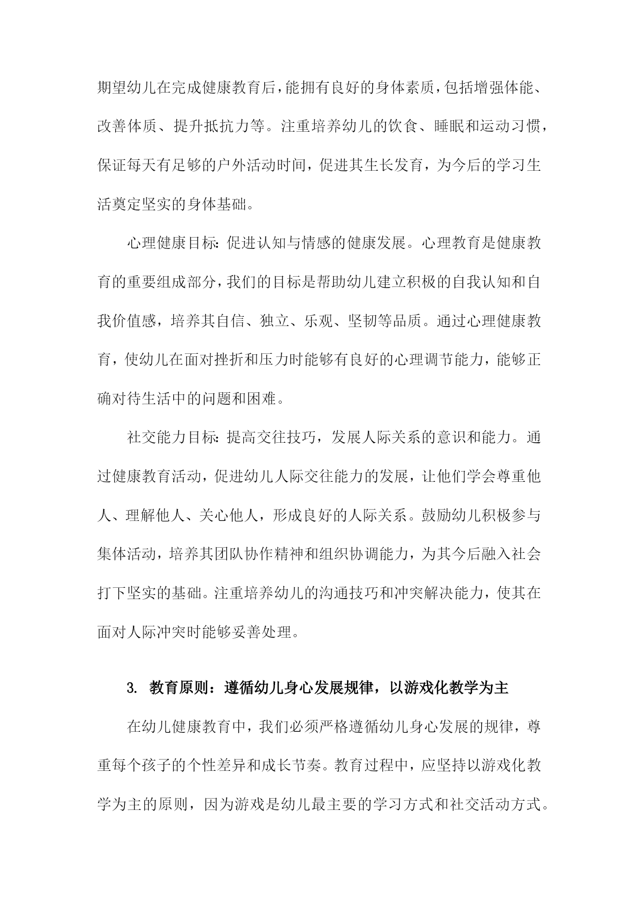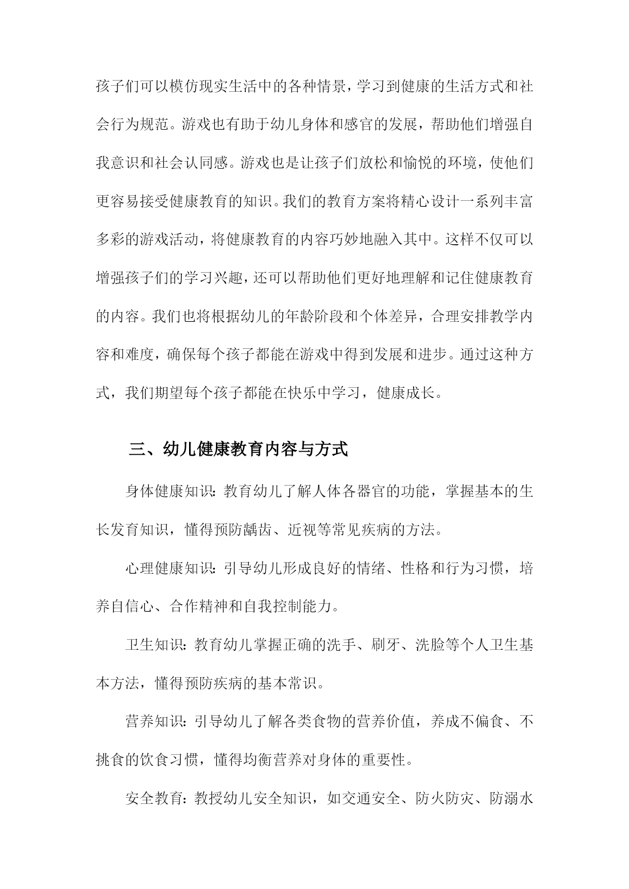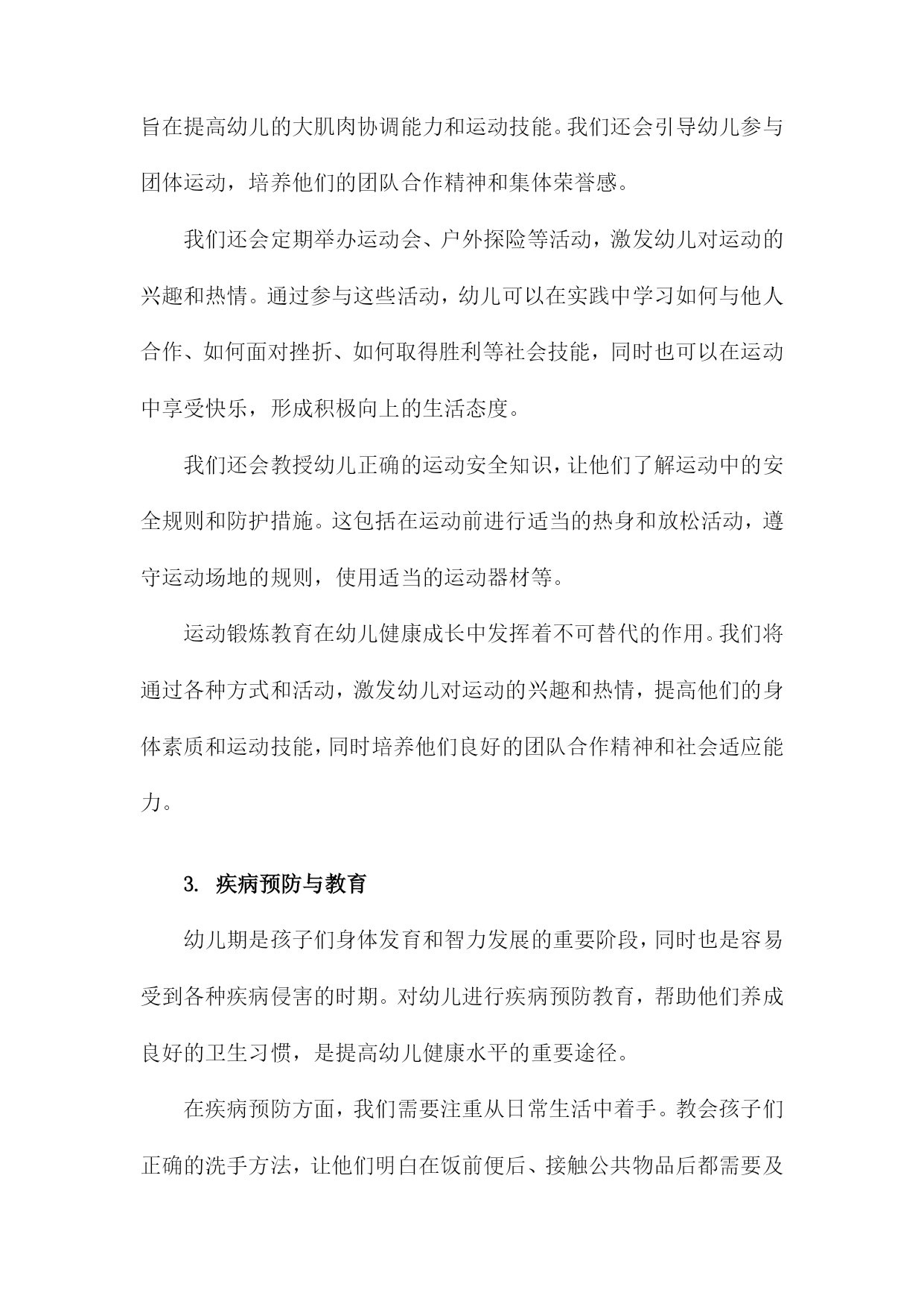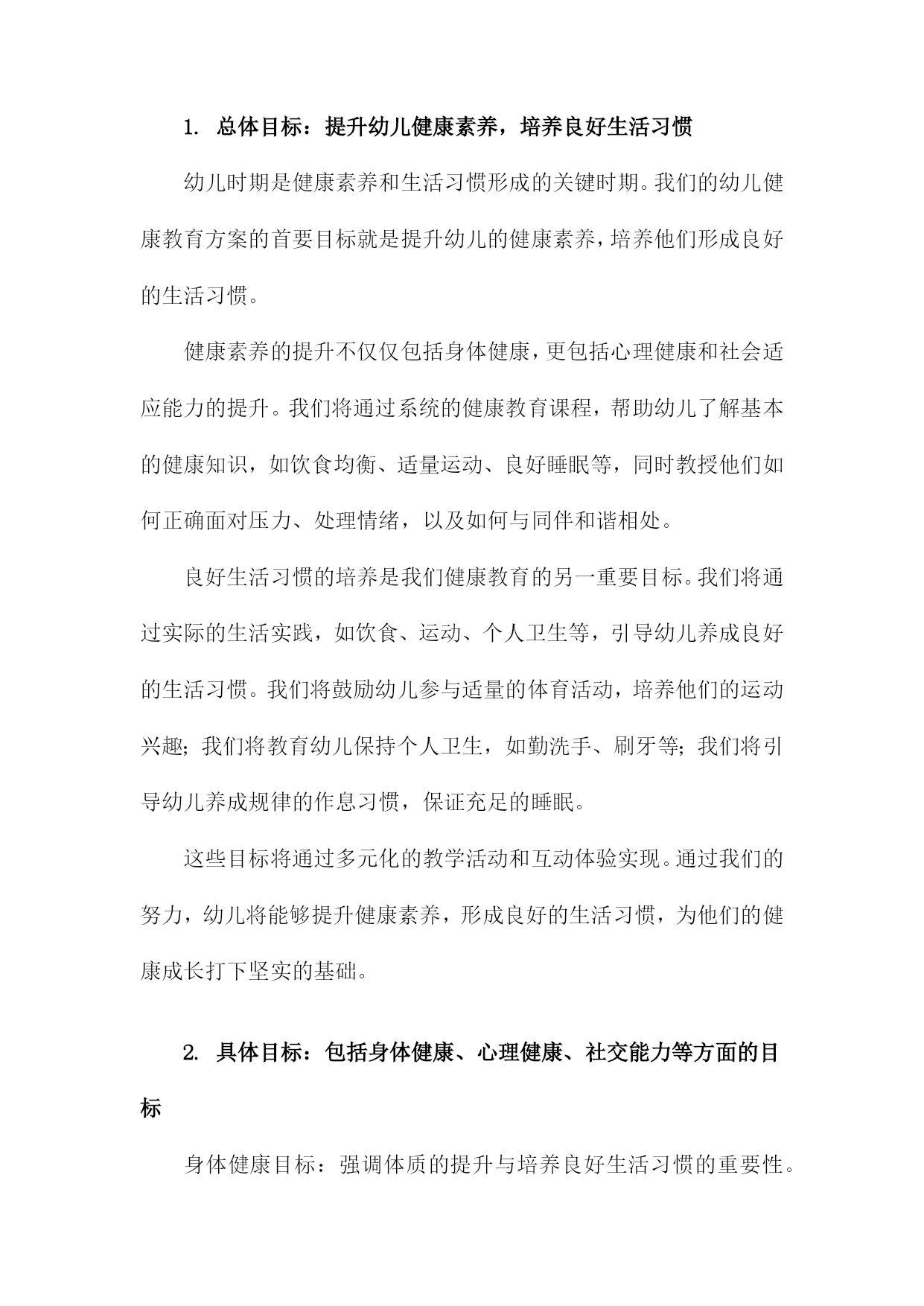 幼儿健康教育方案一、内容概要健康教育目标与原则:明确幼儿健康教育的目标,强调健康教育的连续性和系统性,确保幼儿全面发展的培养良好的生活习惯和心理素质。健康教育内容体系:构建全面的健康教育内容体系,涵盖身体健康、心理健康、安全防护、营养饮食等方面,确保幼儿在不同年龄段都能接受到相应的健康教育。教育方法与途径:介绍多种教育方法和途径,如课堂教学、亲子互动、游戏活动等,使健康教育更加生动有趣,激发幼儿的学习兴趣。实施步骤与时间安排:详细阐述健康教育的实施步骤和时间安排,确保教育活动的有序进行,提高教育效果。资源整合与利用:充分利用家庭、学校、社区等资源,发挥协同作用,提高健康教育的效果和质量。评估与反馈:建立评估机制,定期对幼儿健康教育的成果进行评估和反馈,以便及时调整教育方案,提高教育质量。通过本方案的实施,旨在提高幼儿对健康的认识和自我保健能力,培养良好的生活习惯和心理素质,为幼儿的全面发展奠定坚实基础。1.幼儿健康教育的意义幼儿时期是身心发展的重要阶段,也是形成良好生活习惯和健康行为的关键时期。幼儿健康教育对于儿童的全面发展具有深远的意义。良好的健康教育有助于幼儿形成健康的体魄,为其未来的学习和生活奠定坚实的物质基础。有效的健康教育能够帮助幼儿养成良好的个人卫生习惯和生活方式,降低疾病发生的风险,提高生活质量。通过健康教育,幼儿可以更好地理解身体健康与心理健康的紧密联系,促进心理发展和社会适应能力的提高。幼儿健康教育还能帮助家长和教师更好地了解幼儿身心发展的特点,从而提供更科学、更有效的教育和照顾。幼儿健康教育不仅是儿童健康成长的需要,也是社会文明进步的重要标志。2.当前幼儿健康教育面临的挑战和问题当前,幼儿健康教育面临着多方面的挑战和问题。随着社会的快速发展和人们生活方式的改变,幼儿的生活环境和习惯也在不断变化,这导致一些新的健康问题不断出现,传统的教育方式已经难以完全适应当前的健康需求。当前幼儿健康教育在家庭教育中的缺失也是一个突出问题。许多家长对幼儿健康教育的重视程度不够,缺乏科学的教育方法和知识,无法给予孩子正确的引导。幼儿园和学校健康教育师资力量不足,教师的专业水平和培训状况也参差不齐,这制约了健康教育的质量。还存在教育内容单方法陈旧、缺乏实践性等问题,无法有效激发幼儿的学习兴趣,难以达到预期的教育效果。我们需要针对这些问题进行深入研究和探索,寻找更有效的教育方法和策略,以推动幼儿健康教育的进一步发展。二、幼儿健康教育目标与原则系统性原则:幼儿健康教育应是一个系统的过程,涉及生理、心理、社会等多个方面,需要全面规划、分步实施。个性化原则:尊重每个幼儿的个体差异,根据幼儿的兴趣、能力和需求,制定个性化的教育方案。实践性原则:注重实践教育,通过游戏、活动等方式,让幼儿在亲身体验中学习和掌握健康知识和技能。家园共育原则:强调家庭与幼儿园的合作,共同营造良好的教育环境,促进幼儿健康成长。循序渐进原则:健康教育内容应由浅入深、由易到难,注重教育的连续性和阶段性,确保幼儿逐步形成良好的健康习惯。在实现这些目标和原则的过程中,需要精心设计和实施各类教育活动,使幼儿能在愉快的氛围中学习和成长。也需要家长和社会的积极参与和支持,共同为幼儿的健康成长创造良好的环境。1.总体目标:提升幼儿健康素养,培养良好生活习惯幼儿时期是健康素养和生活习惯形成的关键时期。我们的幼儿健康教育方案的首要目标就是提升幼儿的健康素养,培养他们形成良好的生活习惯。健康素养的提升不仅仅包括身体健康,更包括心理健康和社会适应能力的提升。我们将通过系统的健康教育课程,帮助幼儿了解基本的健康知识,如饮食均衡、适量运动、良好睡眠等,同时教授他们如何正确面对压力、处理情绪,以及如何与同伴和谐相处。良好生活习惯的培养是我们健康教育的另一重要目标。我们将通过实际的生活实践,如饮食、运动、个人卫生等,引导幼儿养成良好的生活习惯。我们将鼓励幼儿参与适量的体育活动,培养他们的运动兴趣;我们将教育幼儿保持个人卫生,如勤洗手、刷牙等;我们将引导幼儿养成规律的作息习惯,保证充足的睡眠。这些目标将通过多元化的教学活动和互动体验实现。通过我们的努力,幼儿将能够提升健康素养,形成良好的生活习惯,为他们的健康成长打下坚实的基础。2.具体目标:包括身体健康、心理健康、社交能力等方面的目标身体健康目标:强调体质的提升与培养良好生活习惯的重要性。期望幼儿在完成健康教育后,能拥有良好的身体素质,包括增强体能、改善体质、提升抵抗力等。注重培养幼儿的饮食、睡眠和运动习惯,保证每天有足够的户外活动时间,促进其生长发育,为今后的学习生活奠定坚实的身体基础。心理健康目标:促进认知与情感的健康发展。心理教育是健康教育的重要组成部分,我们的目标是帮助幼儿建立积极的自