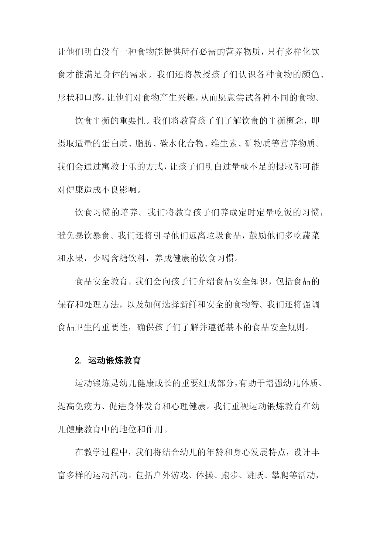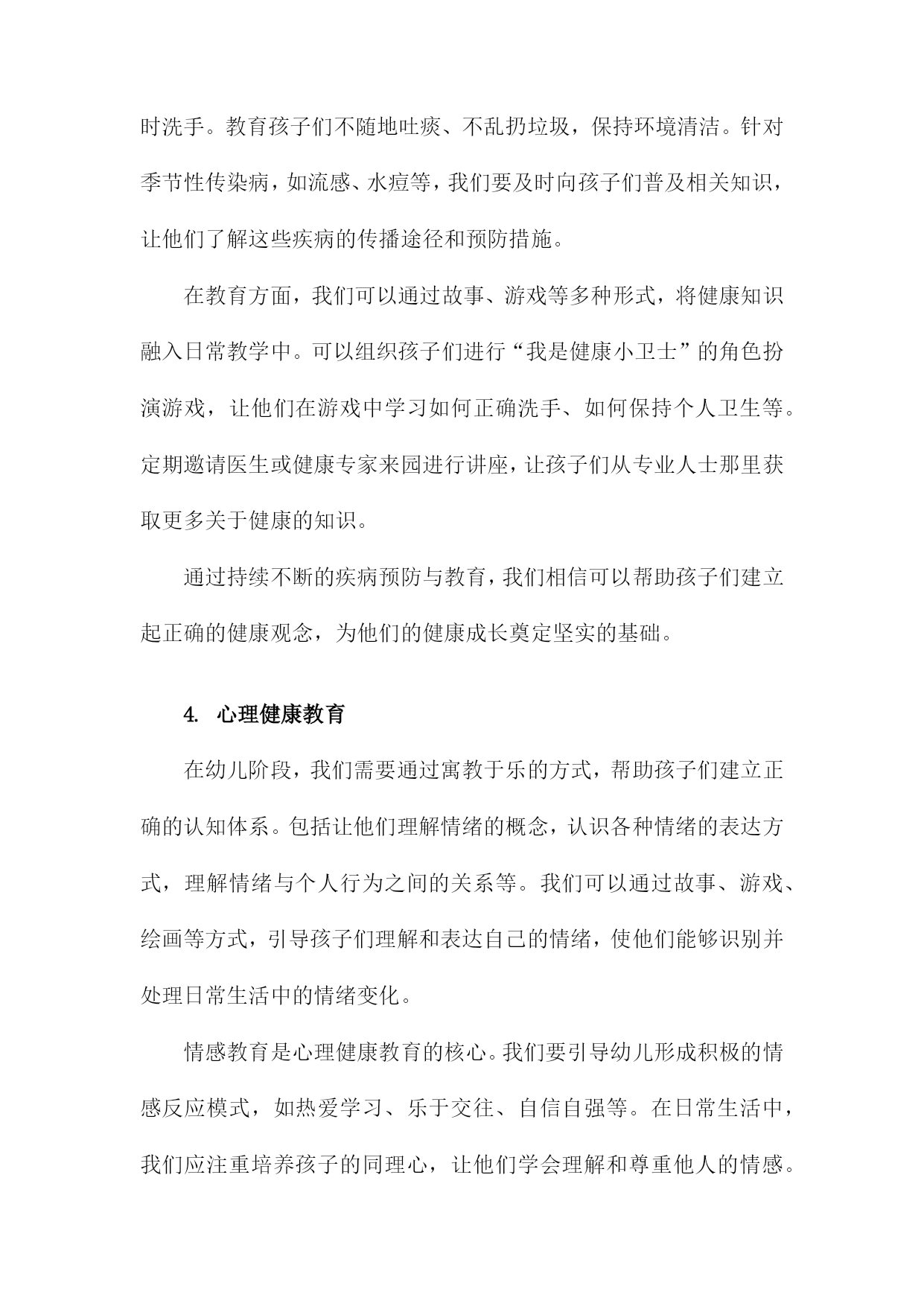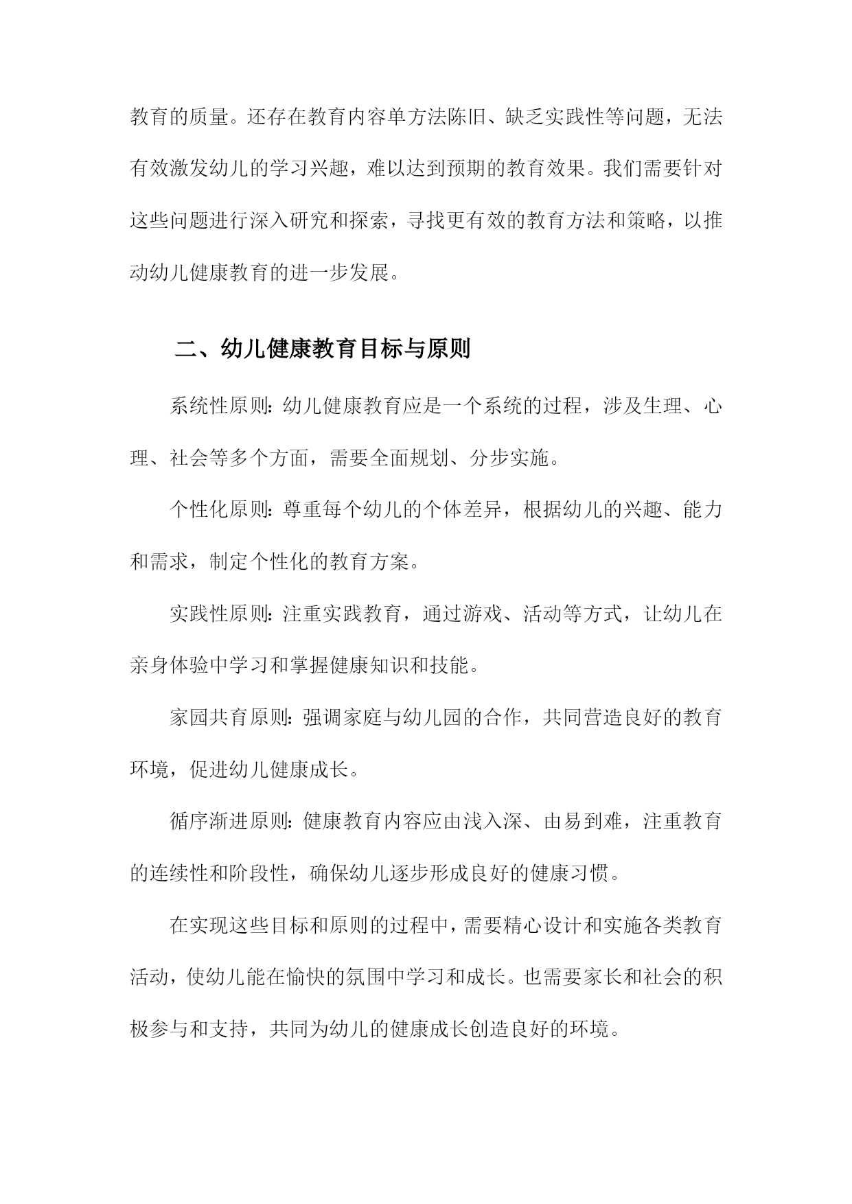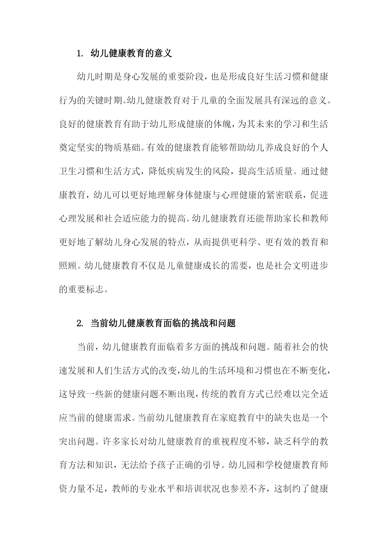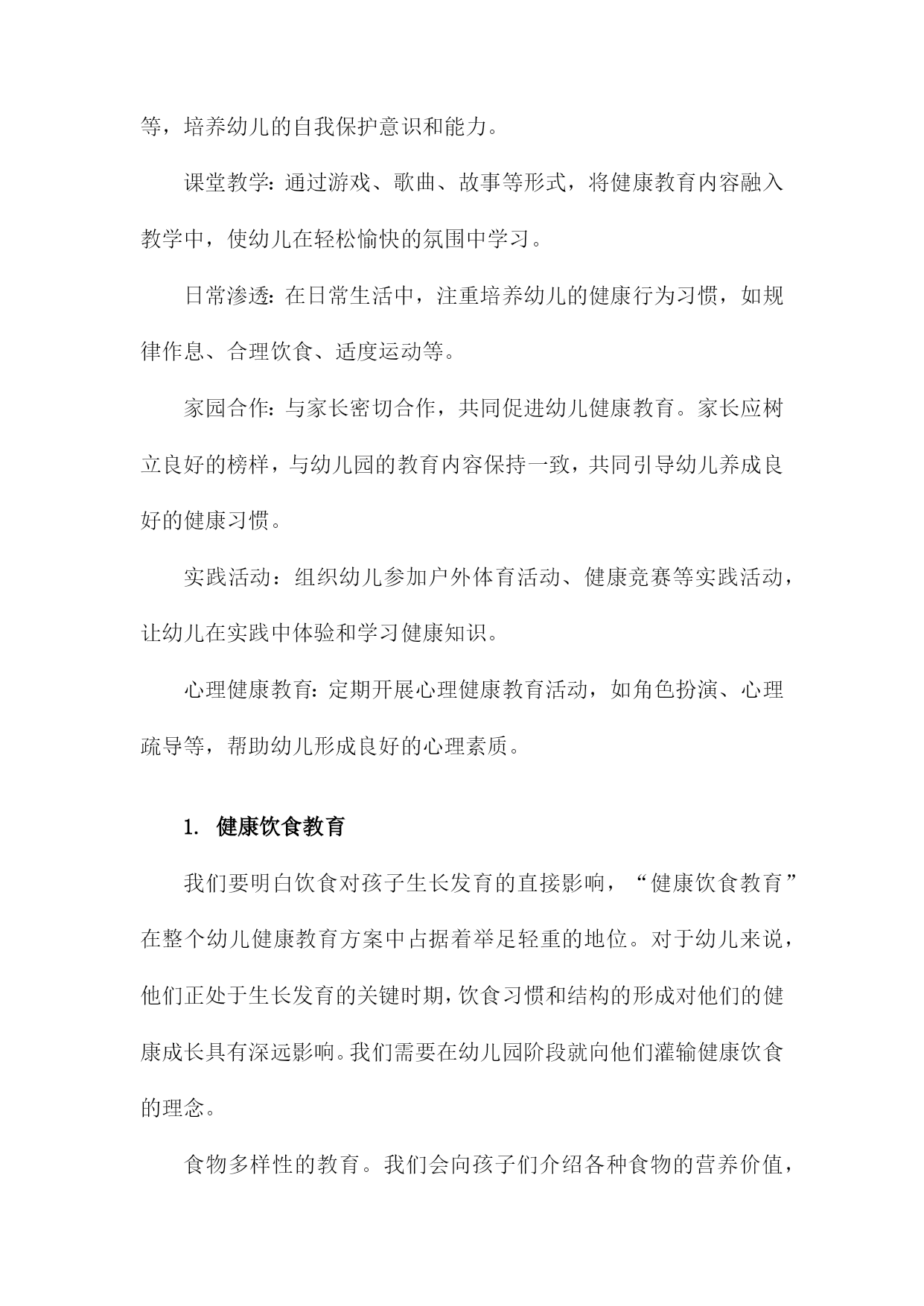 幼儿健康教育方案一、内容概要健康教育目标与原则:明确幼儿健康教育的目标,强调健康教育的连续性和系统性,确保幼儿全面发展的培养良好的生活习惯和心理素质。健康教育内容体系:构建全面的健康教育内容体系,涵盖身体健康、心理健康、安全防护、营养饮食等方面,确保幼儿在不同年龄段都能接受到相应的健康教育。教育方法与途径:介绍多种教育方法和途径,如课堂教学、亲子互动、游戏活动等,使健康教育更加生动有趣,激发幼儿的学习兴趣。实施步骤与时间安排:详细阐述健康教育的实施步骤和时间安排,确保教育活动的有序进行,提高教育效果。资源整合与利用:充分利用家庭、学校、社区等资源,发挥协同作用,提高健康教育的效果和质量。评估与反馈:建立评估机制,定期对幼儿健康教育的成果进行评估和反馈,以便及时调整教育方案,提高教育质量。通过本方案的实施,旨在提高幼儿对健康的认识和自我保健能力,培养良好的生活习惯和心理素质,为幼儿的全面发展奠定坚实基础。1.幼儿健康教育的意义幼儿时期是身心发展的重要阶段,也是形成良好生活习惯和健康行为的关键时期。幼儿健康教育对于儿童的全面发展具有深远的意义。良好的健康教育有助于幼儿形成健康的体魄,为其未来的学习和生活奠定坚实的物质基础。有效的健康教育能够帮助幼儿养成良好的个人卫生习惯和生活方式,降低疾病发生的风险,提高生活质量。通过健康教育,幼儿可以更好地理解身体健康与心理健康的紧密联系,促进心理发展和社会适应能力的提高。幼儿健康教育还能帮助家长和教师更好地了解幼儿身心发展的特点,从而提供更科学、更有效的教育和照顾。幼儿健康教育不仅是儿童健康成长的需要,也是社会文明进步的重要标志。2.当前幼儿健康教育面临的挑战和问题当前,幼儿健康教育面临着多方面的挑战和问题。随着社会的快速发展和人们生活方式的改变,幼儿的生活环境和习惯也在不断变化,这导致一些新的健康问题不断出现,传统的教育方式已经难以完全适应当前的健康需求。当前幼儿健康教育在家庭教育中的缺失也是一个突出问题。许多家长对幼儿健康教育的重视程度不够,缺乏科学的教育方法和知识,无法给予孩子正确的引导。幼儿园和学校健康教育师资力量不足,教师的专业水平和培训状况也参差不齐,这制约了健康教育的质量。还存在教育内容单方法陈旧、缺乏实践性等问题,无法有效激发幼儿的学习兴趣,难以达到预期的教育效果。我们需要针对这些问题进行深入研究和探索,寻找更有效的教育方法和策略,以推动幼儿健康教育的进一步发展。二、幼儿健康教育目标与原则系统性原则:幼儿健康教育应是一个系统的过程,涉及生理、心理、社会等多个方面,需要全面规划、分步实施。个性化原则:尊重每个幼儿的个体差异,根据幼儿的兴趣、能力和需求,制定个性化的教育方案。实践性原则:注重实践教育,通过游戏、活动等方式,让幼儿在亲身体验中学习和掌握健康知识和技能。家园共育原则:强调家庭与幼儿园的合作,共同营造良好的教育环境,促进幼儿健康成长。循序渐进原则:健康教育内容应由浅入深、由易到难,注重教育的连续性和阶段性,确保幼儿逐步形成良好的健康习惯。在实现这些目标和原则的过程中,需要精心设计和实施各类教育活动,使幼儿能在愉快的氛围中学习和成长。也需要家长和社会的积极参与和支持,共同为幼儿的健康成长创造良好的环境。1.总体目标:提升幼儿健康素养,培养良好生活习惯幼儿时期是健康素养和生活习惯形成的关键时期。我们的幼儿健康教育方案的首要目标就是提升幼儿的健康素养,培养他们形成良好的生活习惯。健康素养的提升不仅仅包括身体健康,更包括心理健康和社会适应能力的提升。我们将通过系统的健康教育课程,帮助幼儿了解基本的健康知识,如饮食均衡、适量运动、良好睡眠等,同时教授他们如何正确面对压力、处理情绪,以及如何与同伴和谐相处。良好生活习惯的培养是我们健康教育的另一重要目标。我们将通过实际的生活实践,如饮食、运动、个人卫生等,引导幼儿养成良好的生活习惯。我们将鼓励幼儿参与适量的体育活动,培养他们的运动兴趣;我们将教育幼儿保持个人卫生,如勤洗手、刷牙等;我们将引导幼儿养成规律的作息习惯,保证充足的睡眠。这些目标将通过多元化的教学活动和互动体验实现。通过我们的努力,幼儿将能够提升健康素养,形成良好的生活习惯,为他们的健康成长打下坚实的基础。2.具体目标:包括身体健康、心理健康、社交能力等方面的目标身体健康目标:强调体质的提升与培养良好生活习惯的重要性。期望幼儿在完成健康教育后,能拥有良好的身体素质,包括增强体能、改善体质、提升抵抗力等。注重培养幼儿的饮食、睡眠和运动习惯,保证每天有足够的户外活动时间,促进其生长发育,为今后的学习生活奠定坚实的身体基础。心理健康目标:促进认知与情感的健康发展。心理教育是健康教育的重要组成部分,我们的目标是帮助幼儿建立积极的自