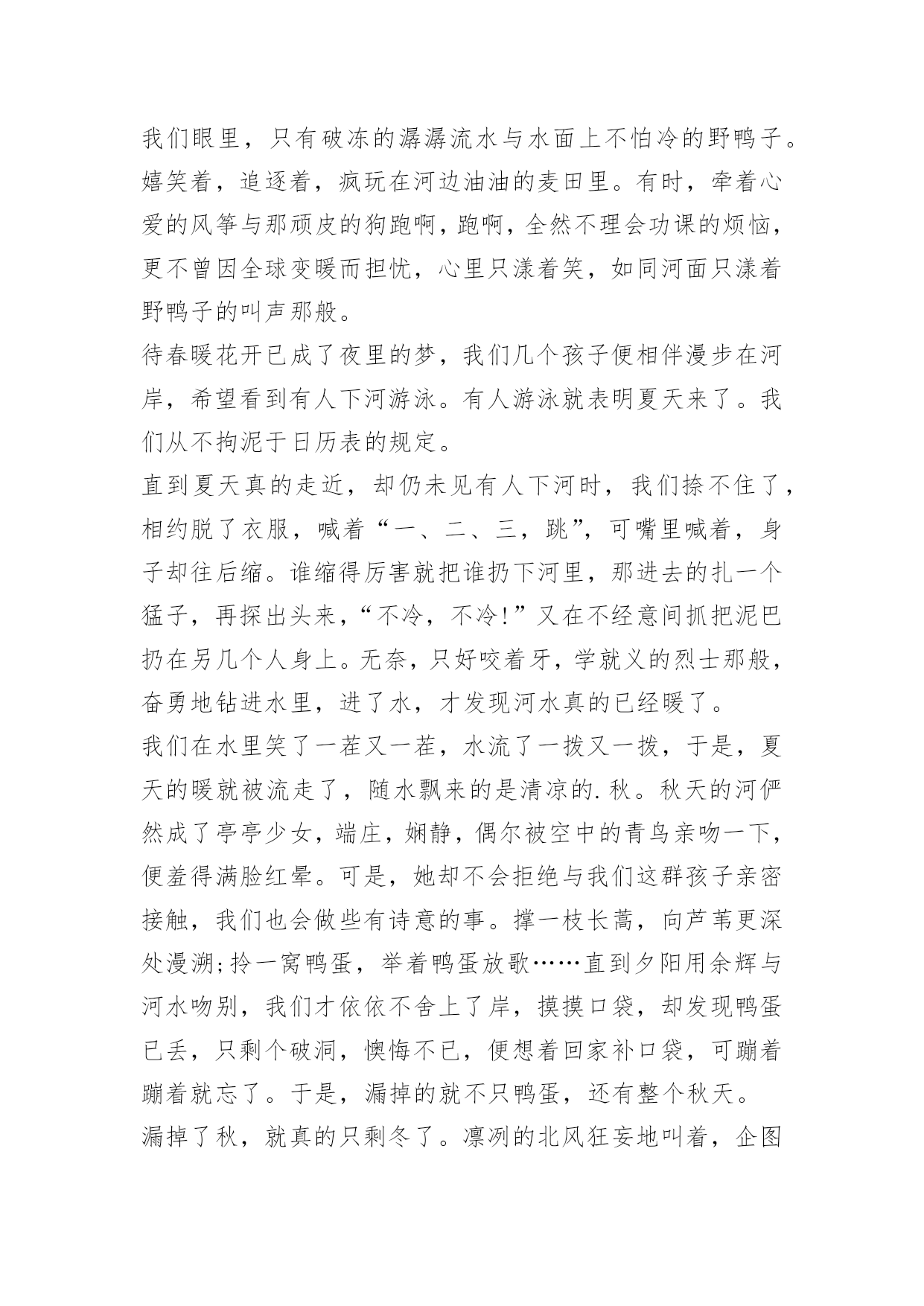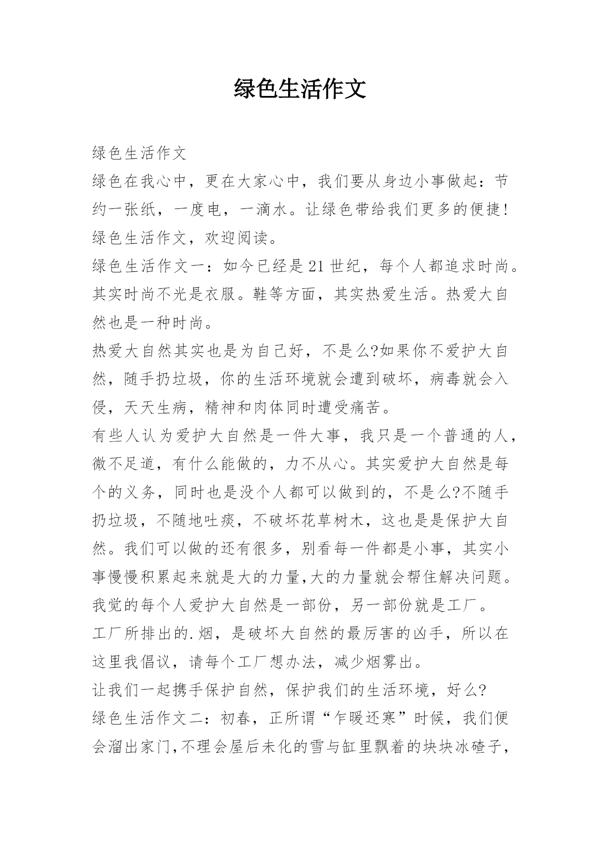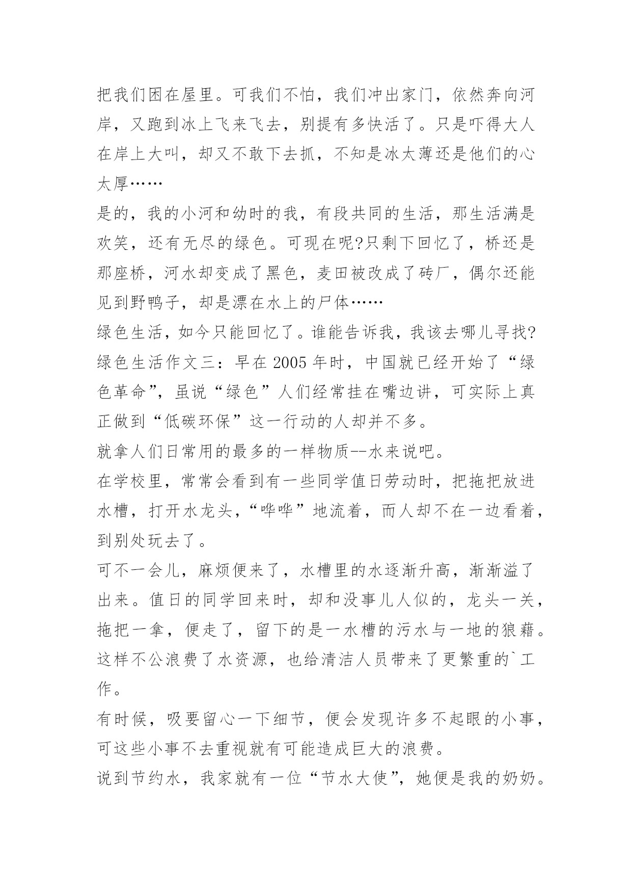 绿色生活作文绿色生活作文绿色在我心中,更在大家心中,我们要从身边小事做起:节约一张纸,一度电,一滴水。让绿色带给我们更多的便捷!绿色生活作文,欢迎阅读。绿色生活作文一:如今已经是21世纪,每个人都追求时尚。其实时尚不光是衣服。鞋等方面,其实热爱生活。热爱大自然也是一种时尚。热爱大自然其实也是为自己好,不是么?如果你不爱护大自然,随手扔垃圾,你的生活环境就会遭到破坏,病毒就会入侵,天天生病,精神和肉体同时遭受痛苦。有些人认为爱护大自然是一件大事,我只是一个普通的人,微不足道,有什么能做的,力不从心。其实爱护大自然是每个的义务,同时也是没个人都可以做到的,不是么?不随手扔垃圾,不随地吐痰,不破坏花草树木,这也是是保护大自然。我们可以做的还有很多,别看每一件都是小事,其实小事慢慢积累起来就是大的力量,大的力量就会帮住解决问题。我觉的每个人爱护大自然是一部份,另一部份就是工厂。工厂所排出的.烟,是破坏大自然的最厉害的凶手,所以在这里我倡议,请每个工厂想办法,减少烟雾出。让我们一起携手保护自然,保护我们的生活环境,好么?绿色生活作文二:初春,正所谓“乍暖还寒”时候,我们便会溜出家门,不理会屋后未化的雪与缸里飘着的块块冰碴子,我们眼里,只有破冻的潺潺流水与水面上不怕冷的野鸭子。嬉笑着,追逐着,疯玩在河边油油的麦田里。有时,牵着心爱的风筝与那顽皮的狗跑啊,跑啊,全然不理会功课的烦恼,更不曾因全球变暖而担忧,心里只漾着笑,如同河面只漾着野鸭子的叫声那般。待春暖花开已成了夜里的梦,我们几个孩子便相伴漫步在河岸,希望看到有人下河游泳。有人游泳就表明夏天来了。我们从不拘泥于日历表的规定。直到夏天真的走近,却仍未见有人下河时,我们捺不住了,相约脱了衣服,喊着“一、二、三,跳”,可嘴里喊着,身子却往后缩。谁缩得厉害就把谁扔下河里,那进去的扎一个猛子,再探出头来,“不冷,不冷!”又在不经意间抓把泥巴扔在另几个人身上。无奈,只好咬着牙,学就义的烈士那般,奋勇地钻进水里,进了水,才发现河水真的已经暖了。我们在水里笑了一茬又一茬,水流了一拨又一拨,于是,夏天的暖就被流走了,随水飘来的是清凉的.秋。秋天的河俨然成了亭亭少女,端庄,娴静,偶尔被空中的青鸟亲吻一下,便羞得满脸红晕。可是,她却不会拒绝与我们这群孩子亲密接触,我们也会做些有诗意的事。撑一枝长蒿,向芦苇更深处漫溯;拎一窝鸭蛋,举着鸭蛋放歌……直到夕阳用余辉与河水吻别,我们才依依不舍上了岸,摸摸口袋,却发现鸭蛋已丢,只剩个破洞,懊悔不已,便想着回家补口袋,可蹦着蹦着就忘了。于是,漏掉的就不只鸭蛋,还有整个秋天。漏掉了秋,就真的只剩冬了。凛冽的北风狂妄地叫着,企图把我们困在屋里。可我们不怕,我们冲出家门,依然奔向河岸,又跑到冰上飞来飞去,别提有多快活了。只是吓得大人在岸上大叫,却又不敢下去抓,不知是冰太薄还是他们的心太厚……是的,我的小河和幼时的我,有段共同的生活,那生活满是欢笑,还有无尽的绿色。可现在呢?只剩下回忆了,桥还是那座桥,河水却变成了黑色,麦田被改成了砖厂,偶尔还能见到野鸭子,却是漂在水上的尸体……绿色生活,如今只能回忆了。谁能告诉我,我该去哪儿寻找?绿色生活作文三:早在2005年时,中国就已经开始了“绿色革命”,虽说“绿色”人们经常挂在嘴边讲,可实际上真正做到“低碳环保”这一行动的人却并不多。就拿人们日常用的最多的一样物质--水来说吧。在学校里,常常会看到有一些同学值日劳动时,把拖把放进水槽,打开水龙头,“哗哗”地流着,而人却不在一边看着,到别处玩去了。可不一会儿,麻烦便来了,水槽里的水逐渐升高,渐渐溢了出来。值日的同学回来时,却和没事儿人似的,龙头一关,拖把一拿,便走了,留下的是一水槽的污水与一地的狼藉。这样不公浪费了水资源,也给清洁人员带来了更繁重的`工作。有时候,吸要留心一下细节,便会发现许多不起眼的小事,可这些小事不去重视就有可能造成巨大的浪费。说到节约水,我家就有一位“节水大使”,她便是我的奶奶。早上一起床,奶奶梳洗过后,把剩水倒入大桶,接着就用它洗拖把。最后还不忘废物利用--冲马桶。吃过午饭,妈妈要把之前的淘米水倒掉,没想到奶奶连忙阻止,说“别倒!这淘米水用处可大了,用它洗菜最好!”果然,洗出来的蔬菜又干净又有光泽。之后,大家都去午休了,唯有奶奶还在不停忙碌,一会儿用洗衣水洗院子地板,一会儿用肥皂水擦窗。我曾经问过她:“奶奶,你为什么要这么节约水呢?”她回答:“我们国家水资源不多,应该节约水啊!”节约水资源已是我们日常的一门必修课,不要小瞧一滴水,它说不定能造成巨大的浪费。