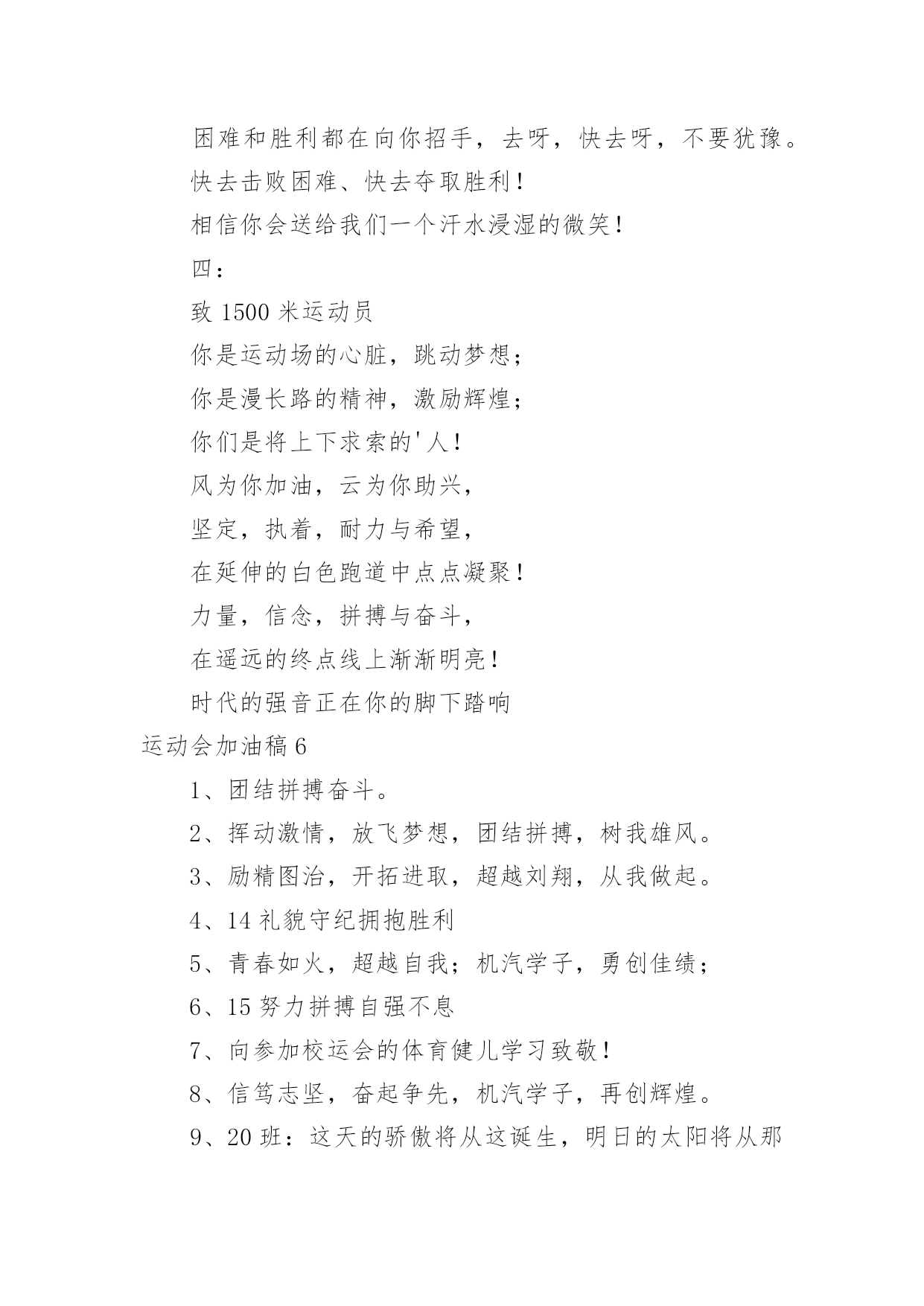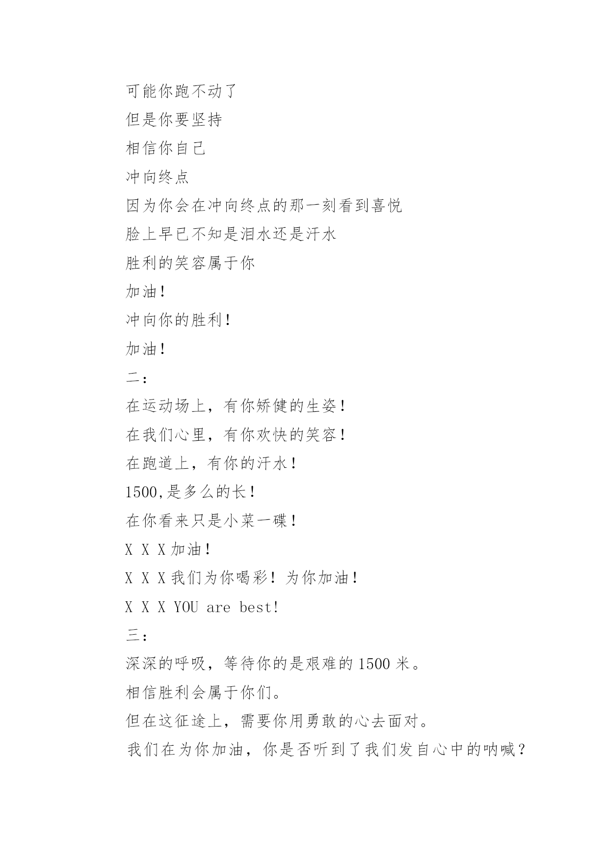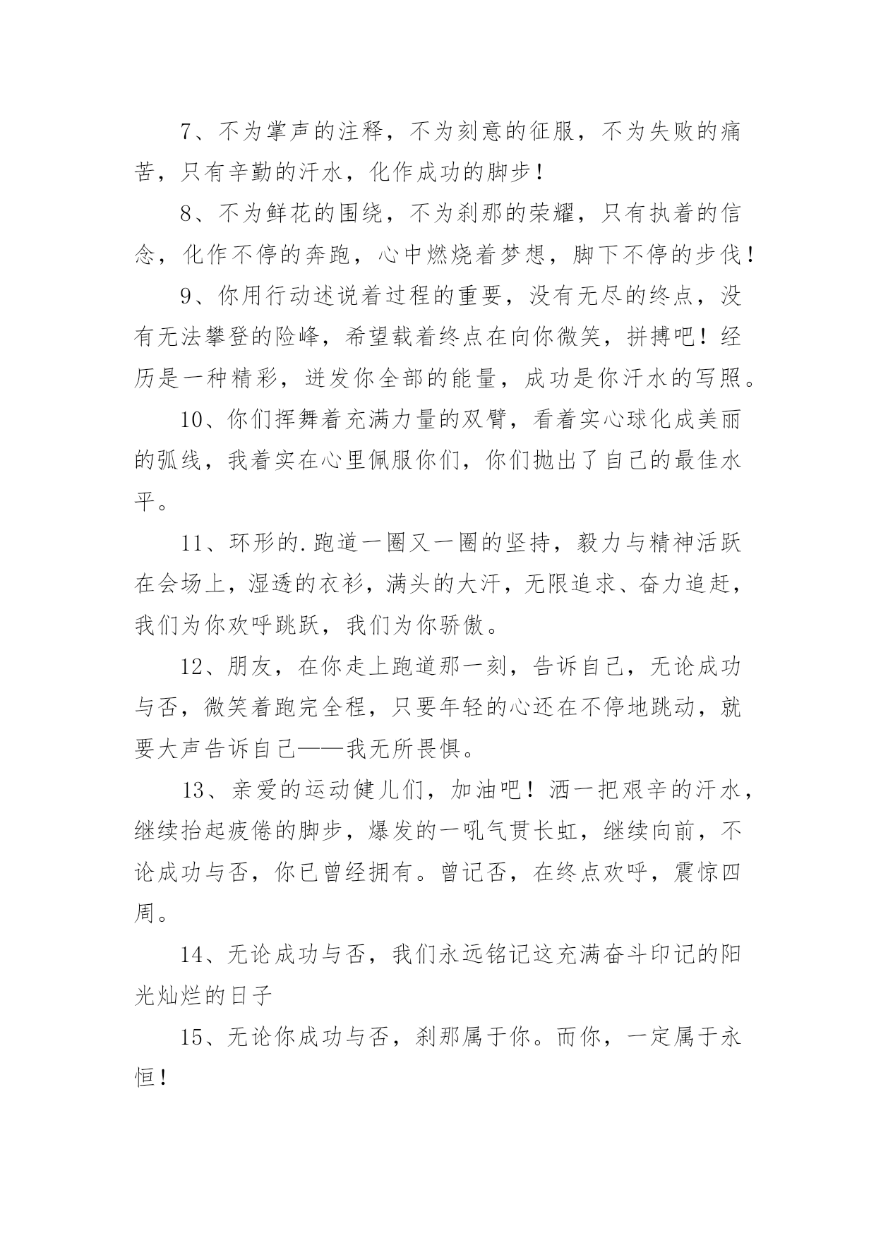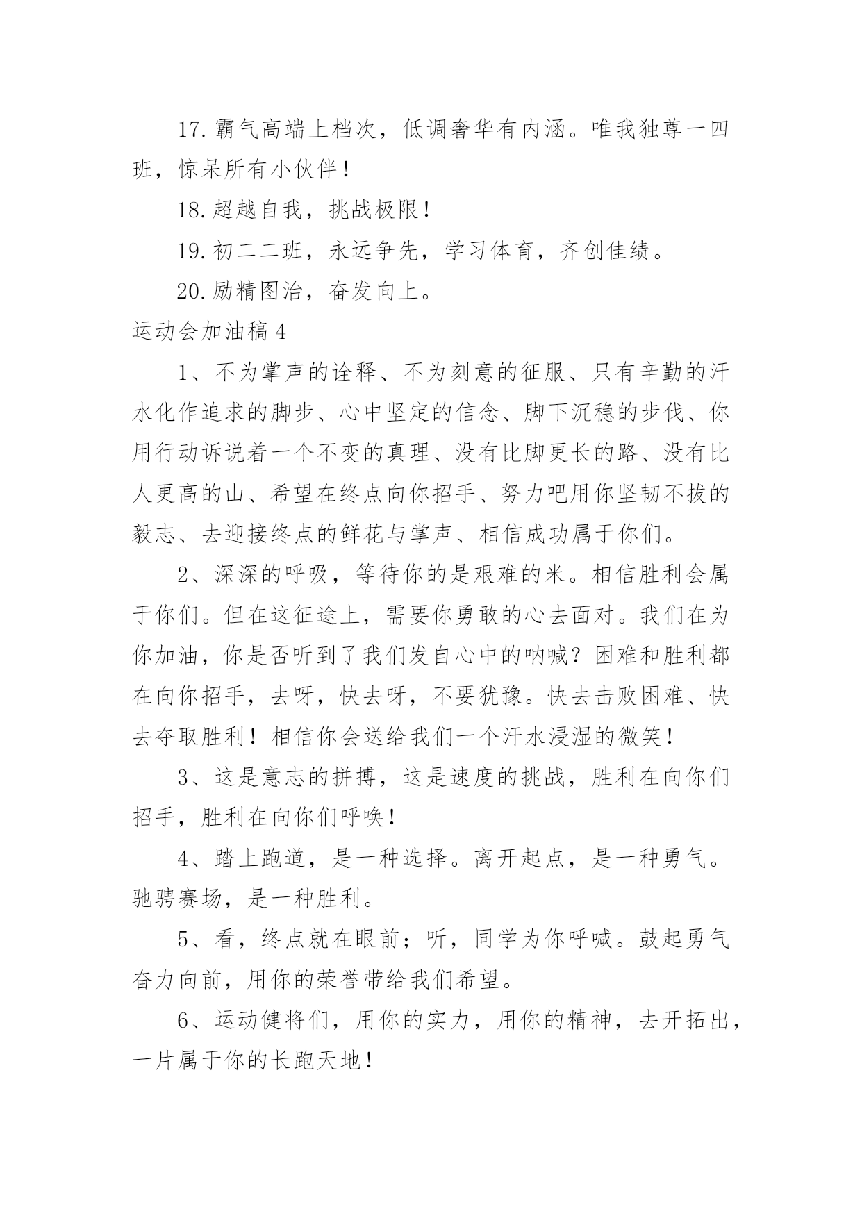 运动会加油稿运动会加油稿在现在的社会生活中,各种加油稿频频出现,借助加油稿可以给对方传达鼓励。那么加油稿一般是怎么写的呢?以下是小编整理的运动会加油稿,仅供参考,欢迎大家阅读。运动会加油稿1350米的跑道上,你正在飞驰,头一百米:你可能心急如焚,可心知落后就要挨打。次一百米:你也许有点心神不定,我是不是该安静的退开?再一百米:你正在进行着心理斗争,“生存”还“死亡”?末一百米:你仿佛心有余而力不足,其实“冲刺”不容易。但面对如此遥远的路途,如此激烈的竞争,你也许腿脚发麻,你也许有些茫然。但你可知道,在你身后,有同学们一双双期待的眼睛;在你身后,是你日日辛勤苦练流下的汗水。鼓起勇气,奋勇向前吧!为了集体的`荣誉,为了祖国的明天!运动会加油稿2一根小小的木棒,连接的是团结和友爱;一根小小的木棒,传递的是勇气和力量;一根小小的木棒,演绎的是奋斗和拼搏。你们的`汗水洒在跑道,浇灌着成功的花朵开放。你们的欢笑飞扬在赛场,为班争光,你们最棒!跑吧,追吧,在这个广阔的赛场上,你们似骏马似高弦的箭。冲吧,基础部的运动健儿们!运动会加油稿31.八二八二,独一无二,策马金安,为我二班。2.团结友爱,勤奋好学,活力飞扬。3.经数经数,推导无度,五年修满,一生是处。4.山中猛虎,出水蛟龙,XXX班,卧虎藏龙。5.百舸争流,永争第一,八二八二,独一无二。6.顽强拼搏,超越自我,不鸣则已,一鸣惊人。7.初二时代,八班最帅,团结友爱,样样厉害8.时不我待,努力举绩,一鼓作气,挑战佳绩。9.团结拼搏,奋发有为。10.努力拼搏,睿智进取,携手奋进,共创佳绩。11.齐心协力,争创佳绩,勇夺三军,所向披靡。12.团结一致,奋发拼搏,激扬青春,放飞梦想。13.学习竞赛,体育不怠,只要我在,不败。14.尊人尊己,友谊第一,少说多做,学习第一。15.三六三六,无限锦绣,三六三六,热血铸就。16.提高成绩,拿回手机。壮我五班,勇夺第一!17.霸气高端上档次,低调奢华有内涵。唯我独尊一四班,惊呆所有小伙伴!18.超越自我,挑战极限!19.初二二班,永远争先,学习体育,齐创佳绩。20.励精图治,奋发向上。运动会加油稿41、不为掌声的诠释、不为刻意的征服、只有辛勤的汗水化作追求的脚步、心中坚定的信念、脚下沉稳的步伐、你用行动诉说着一个不变的真理、没有比脚更长的路、没有比人更高的山、希望在终点向你招手、努力吧用你坚韧不拔的毅志、去迎接终点的鲜花与掌声、相信成功属于你们。2、深深的呼吸,等待你的是艰难的米。相信胜利会属于你们。但在这征途上,需要你勇敢的心去面对。我们在为你加油,你是否听到了我们发自心中的呐喊?困难和胜利都在向你招手,去呀,快去呀,不要犹豫。快去击败困难、快去夺取胜利!相信你会送给我们一个汗水浸湿的微笑!3、这是意志的拼搏,这是速度的挑战,胜利在向你们招手,胜利在向你们呼唤!4、踏上跑道,是一种选择。离开起点,是一种勇气。驰骋赛场,是一种胜利。5、看,终点就在眼前;听,同学为你呼喊。鼓起勇气奋力向前,用你的荣誉带给我们希望。6、运动健将们,用你的实力,用你的精神,去开拓出,一片属于你的长跑天地!7、不为掌声的注释,不为刻意的征服,不为失败的痛苦,只有辛勤的汗水,化作成功的脚步!8、不为鲜花的围绕,不为刹那的荣耀,只有执着的信念,化作不停的奔跑,心中燃烧着梦想,脚下不停的步伐!9、你用行动述说着过程的重要,没有无尽的终点,没有无法攀登的险峰,希望载着终点在向你微笑,拼搏吧!经历是一种精彩,迸发你全部的能量,成功是你汗水的写照。10、你们挥舞着充满力量的双臂,看着实心球化成美丽的弧线,我着实在心里佩服你们,你们抛出了自己的最佳水平。11、环形的.跑道一圈又一圈的坚持,毅力与精神活跃在会场上,湿透的衣衫,满头的大汗,无限追求、奋力追赶,我们为你欢呼跳跃,我们为你骄傲。12、朋友,在你走上跑道那一刻,告诉自己,无论成功与否,微笑着跑完全程,只要年轻的心还在不停地跳动,就要大声告诉自己——我无所畏惧。13、亲爱的运动健儿们,加油吧!洒一把艰辛的汗水,继续抬起疲倦的脚步,爆发的一吼气贯长虹,继续向前,不论成功与否,你已曾经拥有。曾记否,在终点欢呼,震惊四周。14、无论成功与否,我们永远铭记这充满奋斗印记的阳光灿烂的日子15、无论你成功与否,刹那属于你。而你,一定属于永恒!16、只要你没有遗憾地奋斗了,你就不必失望,你的生命已放出了闪光!17、成功永远属于每一个勇敢者!18、我们为你呐喊,力量给你信心给你,因为我们知道那一步步的前进十分勇敢。我们为你呐喊,虽然显得火热,但却希望你能加油。19、你带来的,是拼搏的精神;你带走的,是悦耳的呐喊;你付出的,是淋漓的汗水;你收获的,是轰鸣的掌声。运动的盛会为你们而召开,观众的掌声为你们而拍响,雄壮的号角为你们而擂起,成功的花朵为你们而芳