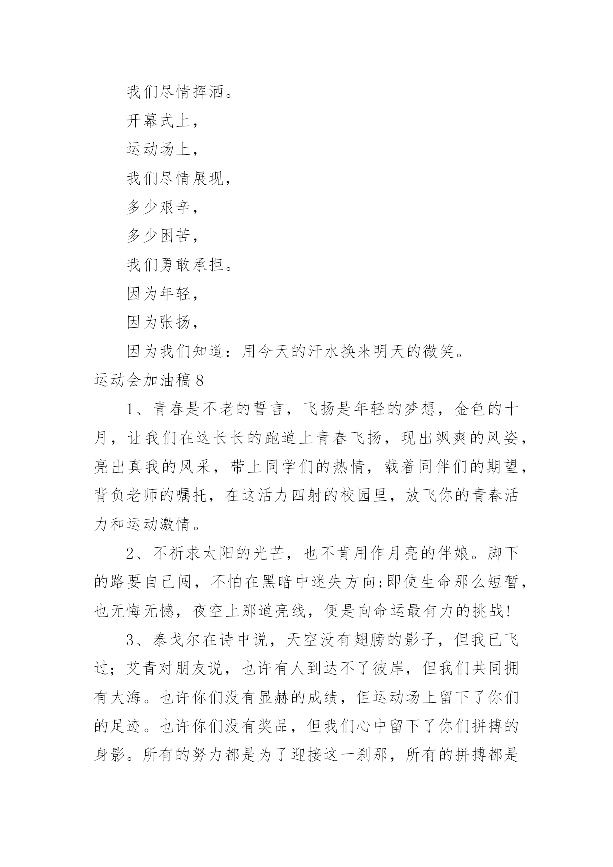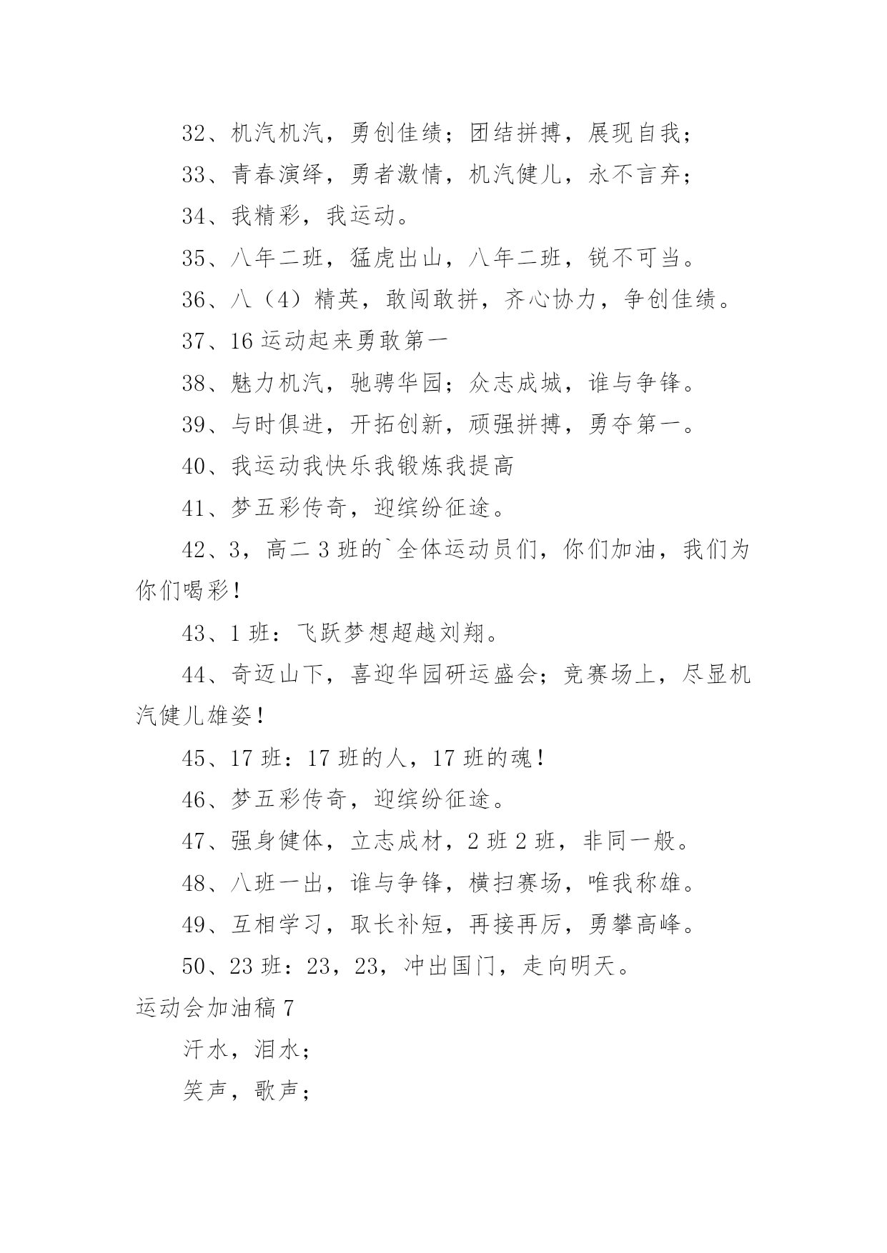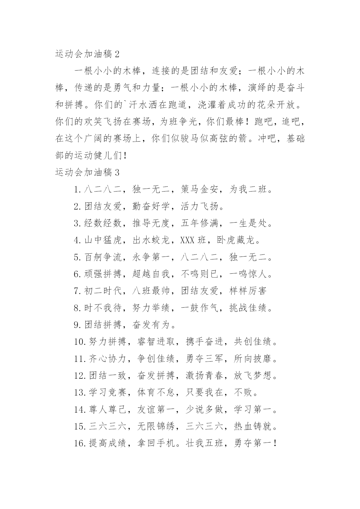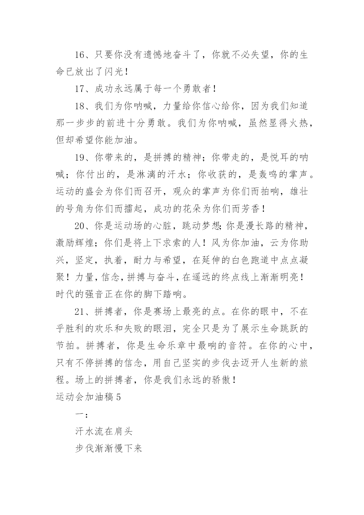 运动会加油稿运动会加油稿在现在的社会生活中,各种加油稿频频出现,借助加油稿可以给对方传达鼓励。那么加油稿一般是怎么写的呢?以下是小编整理的运动会加油稿,仅供参考,欢迎大家阅读。运动会加油稿1350米的跑道上,你正在飞驰,头一百米:你可能心急如焚,可心知落后就要挨打。次一百米:你也许有点心神不定,我是不是该安静的退开?再一百米:你正在进行着心理斗争,“生存”还“死亡”?末一百米:你仿佛心有余而力不足,其实“冲刺”不容易。但面对如此遥远的路途,如此激烈的竞争,你也许腿脚发麻,你也许有些茫然。但你可知道,在你身后,有同学们一双双期待的眼睛;在你身后,是你日日辛勤苦练流下的汗水。鼓起勇气,奋勇向前吧!为了集体的`荣誉,为了祖国的明天!运动会加油稿2一根小小的木棒,连接的是团结和友爱;一根小小的木棒,传递的是勇气和力量;一根小小的木棒,演绎的是奋斗和拼搏。你们的`汗水洒在跑道,浇灌着成功的花朵开放。你们的欢笑飞扬在赛场,为班争光,你们最棒!跑吧,追吧,在这个广阔的赛场上,你们似骏马似高弦的箭。冲吧,基础部的运动健儿们!运动会加油稿31.八二八二,独一无二,策马金安,为我二班。2.团结友爱,勤奋好学,活力飞扬。3.经数经数,推导无度,五年修满,一生是处。4.山中猛虎,出水蛟龙,XXX班,卧虎藏龙。5.百舸争流,永争第一,八二八二,独一无二。6.顽强拼搏,超越自我,不鸣则已,一鸣惊人。7.初二时代,八班最帅,团结友爱,样样厉害8.时不我待,努力举绩,一鼓作气,挑战佳绩。9.团结拼搏,奋发有为。10.努力拼搏,睿智进取,携手奋进,共创佳绩。11.齐心协力,争创佳绩,勇夺三军,所向披靡。12.团结一致,奋发拼搏,激扬青春,放飞梦想。13.学习竞赛,体育不怠,只要我在,不败。14.尊人尊己,友谊第一,少说多做,学习第一。15.三六三六,无限锦绣,三六三六,热血铸就。16.提高成绩,拿回手机。壮我五班,勇夺第一!17.霸气高端上档次,低调奢华有内涵。唯我独尊一四班,惊呆所有小伙伴!18.超越自我,挑战极限!19.初二二班,永远争先,学习体育,齐创佳绩。20.励精图治,奋发向上。运动会加油稿41、不为掌声的诠释、不为刻意的征服、只有辛勤的汗水化作追求的脚步、心中坚定的信念、脚下沉稳的步伐、你用行动诉说着一个不变的真理、没有比脚更长的路、没有比人更高的山、希望在终点向你招手、努力吧用你坚韧不拔的毅志、去迎接终点的鲜花与掌声、相信成功属于你们。2、深深的呼吸,等待你的是艰难的米。相信胜利会属于你们。但在这征途上,需要你勇敢的心去面对。我们在为你加油,你是否听到了我们发自心中的呐喊?困难和胜利都在向你招手,去呀,快去呀,不要犹豫。快去击败困难、快去夺取胜利!相信你会送给我们一个汗水浸湿的微笑!3、这是意志的拼搏,这是速度的挑战,胜利在向你们招手,胜利在向你们呼唤!4、踏上跑道,是一种选择。离开起点,是一种勇气。驰骋赛场,是一种胜利。5、看,终点就在眼前;听,同学为你呼喊。鼓起勇气奋力向前,用你的荣誉带给我们希望。6、运动健将们,用你的实力,用你的精神,去开拓出,一片属于你的长跑天地!7、不为掌声的注释,不为刻意的征服,不为失败的痛苦,只有辛勤的汗水,化作成功的脚步!8、不为鲜花的围绕,不为刹那的荣耀,只有执着的信念,化作不停的奔跑,心中燃烧着梦想,脚下不停的步伐!9、你用行动述说着过程的重要,没有无尽的终点,没有无法攀登的险峰,希望载着终点在向你微笑,拼搏吧!经历是一种精彩,迸发你全部的能量,成功是你汗水的写照。10、你们挥舞着充满力量的双臂,看着实心球化成美丽的弧线,我着实在心里佩服你们,你们抛出了自己的最佳水平。11、环形的.跑道一圈又一圈的坚持,毅力与精神活跃在会场上,湿透的衣衫,满头的大汗,无限追求、奋力追赶,我们为你欢呼跳跃,我们为你骄傲。12、朋友,在你走上跑道那一刻,告诉自己,无论成功与否,微笑着跑完全程,只要年轻的心还在不停地跳动,就要大声告诉自己——我无所畏惧。13、亲爱的运动健儿们,加油吧!洒一把艰辛的汗水,继续抬起疲倦的脚步,爆发的一吼气贯长虹,继续向前,不论成功与否,你已曾经拥有。曾记否,在终点欢呼,震惊四周。14、无论成功与否,我们永远铭记这充满奋斗印记的阳光灿烂的日子15、无论你成功与否,刹那属于你。而你,一定属于永恒!16、只要你没有遗憾地奋斗了,你就不必失望,你的生命已放出了闪光!17、成功永远属于每一个勇敢者!18、我们为你呐喊,力量给你信心给你,因为我们知道那一步步的前进十分勇敢。我们为你呐喊,虽然显得火热,但却希望你能加油。19、你带来的,是拼搏的精神;你带走的,是悦耳的呐喊;你付出的,是淋漓的汗水;你收获的,是轰鸣的掌声。运动的盛会为你们而召开,观众的掌声为你们而拍响,雄壮的号角为你们而擂起,成功的花朵为你们而芳