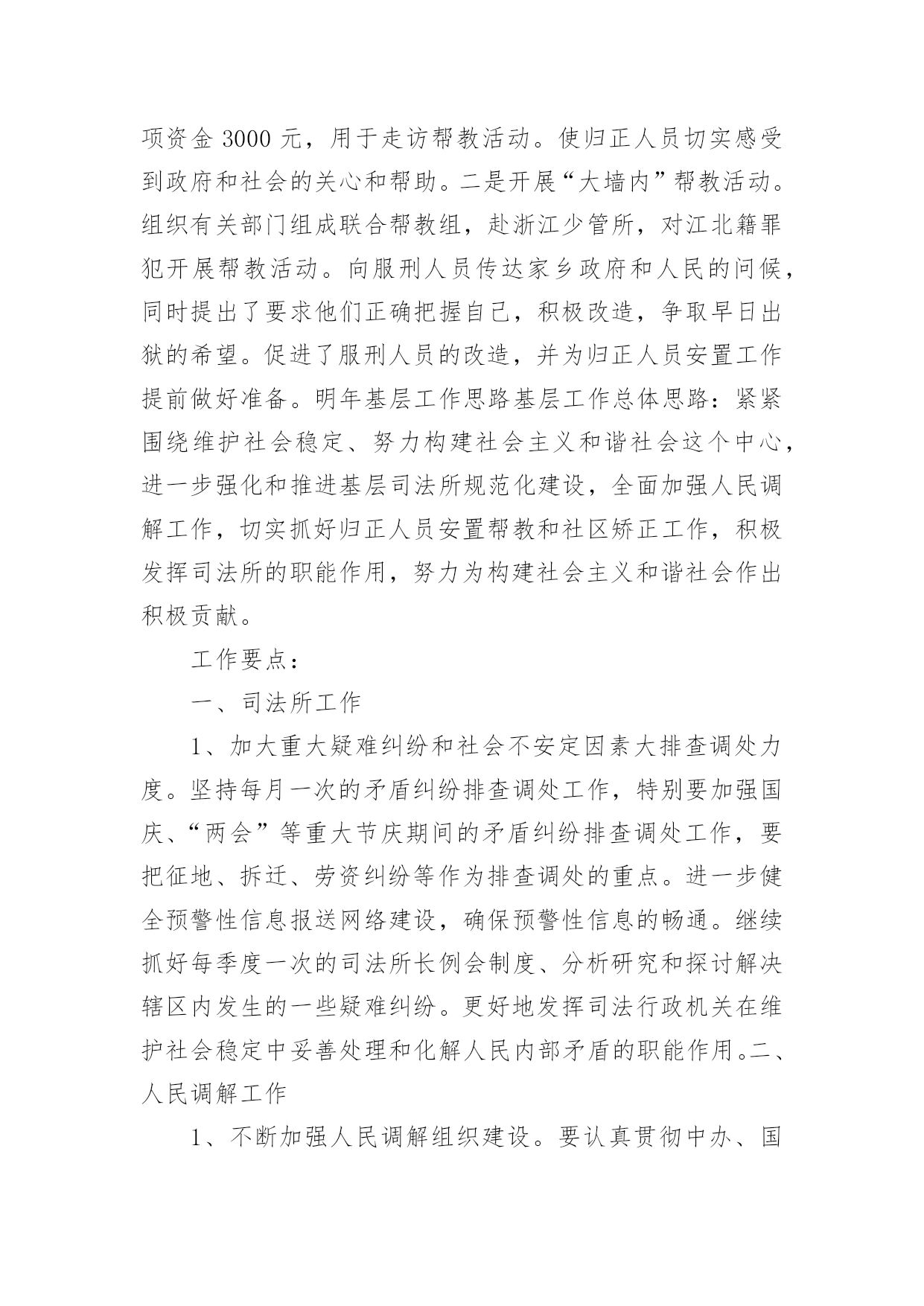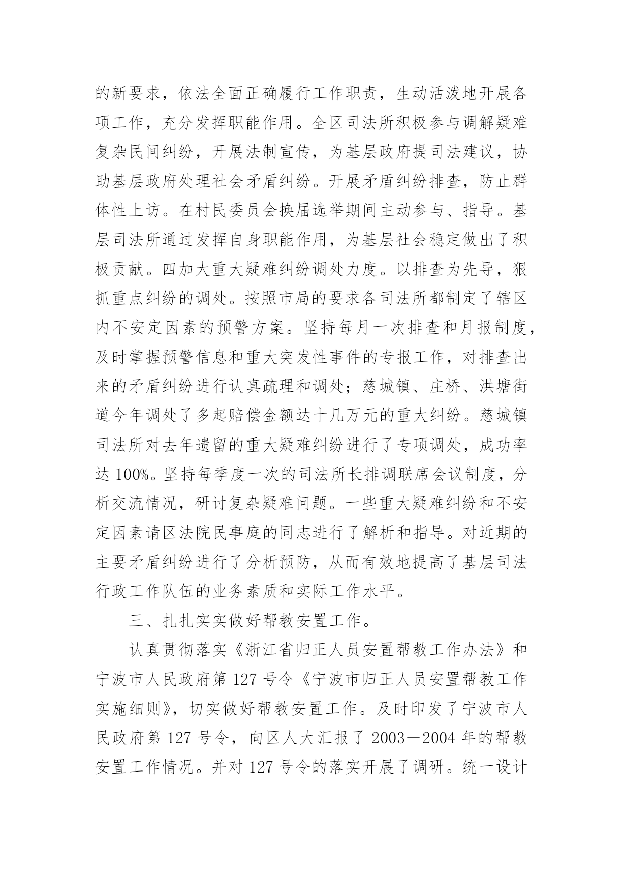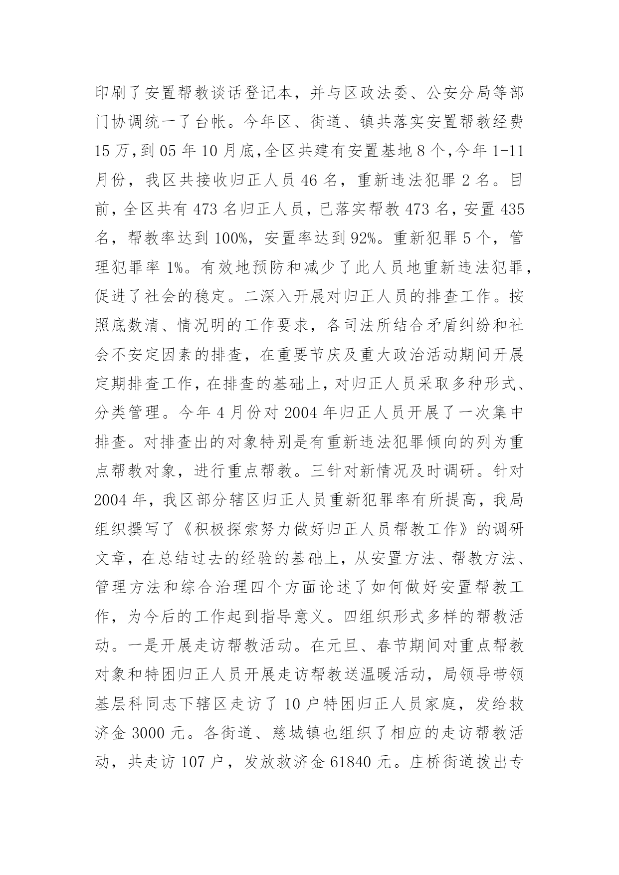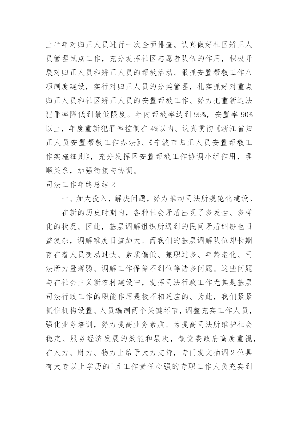 司法工作年终总结司法工作年终总结总结是事后对某一阶段的学习、工作或其完成情况加以回顾和分析的一种书面材料,通过它可以正确认识以往学习和工作中的优缺点,不如我们来制定一份总结吧。那么总结要注意有什么内容呢?以下是小编帮大家整理的司法工作年终总结,欢迎阅读,希望大家能够喜欢。司法工作年终总结1司法局基层科工作总结今年以来,我区基层司法行政工作在区委、区政府和局党组的领导下,在上级业务部门的指导下,以党的十六大精神和“三个代表”重要思想为指导,认真贯彻落实省、市司法行政工作会议精神,围绕改革、发展、稳定大局,以“平安江北”创建为契机,狠抓基层基础工作,为促进我区社会治安综合治理,优化投资环境,全面建设小康社会做出了积极贡献。1-11月份,全区一般民间纠纷排查1255起,已调处成功1211起,成功率96.5%,重大疑难纠纷排查38起,成功调处38起,调处成功率100%,社会不安定因素排查30起,成功调处16起,其余的都落实了预防。2009年工作情况总结如下:一、狠抓司法所规范化建设今年来,我区在推进基层司法行政事业发展中,狠抓了司法所规范化建设,并以此为契机,有力的促进了基层司法行政工作健康有序的向前发展。一加强司法所规范化建设。为进一步加强司法所规范化建设,不断提高我区司法所行政工作整体水平,充分调动司法所工作人员的积极性和创造性。根据市司法局[2004]11号文件关于《宁波市新一轮规范化司法所创建标准》的通知精神,结合我区司法行政工作实际制定、下发了《江北区司法所工作目标考核办法》。办法对司法所人员配备,基础设施、内部管理、考核方式等都作了详尽规定。按照抓基层、打基础、促发展的工作思路,着力提高全区司法所工作人员的素质、管理水平及工作质量,力争用三年时间,使全区司法所全面达到新一轮规范化建设标准的要求。并加强对司法所规范化建设地指导力度,就司法所建设,制度上墙等内容多次走访,统一制订司法所管理制度、司法所职责等上墙内容。目前已有4个司法所基本达到《新一轮司法所规范化建设》的标准。二、加强队伍建设,提高整体素质。我们通过继续开展“人民满意的司法所司法助理员”创建活动,进一步加强队伍的思想、政治和职业道德建设。并加强业务学习和相互交流,今年,分别组织司法所长,司法所内勤外出考察。先后到宁海,鄞州区进行学习。在组织人民调解干部培训班的同时,要求各司法所工作人员全部参加。通过多种形式的培训交流,提高了司法所工作人员的综合素质。三发挥职能、促进和谐发展。今年,指导司法所紧紧围绕当地党委、政府的中心工作,按照司法所规范化建设工作的新要求,依法全面正确履行工作职责,生动活泼地开展各项工作,充分发挥职能作用。全区司法所积极参与调解疑难复杂民间纠纷,开展法制宣传,为基层政府提司法建议,协助基层政府处理社会矛盾纠纷。开展矛盾纠纷排查,防止群体性上访。在村民委员会换届选举期间主动参与、指导。基层司法所通过发挥自身职能作用,为基层社会稳定做出了积极贡献。四加大重大疑难纠纷调处力度。以排查为先导,狠抓重点纠纷的调处。按照市局的要求各司法所都制定了辖区内不安定因素的预警方案。坚持每月一次排查和月报制度,及时掌握预警信息和重大突发性事件的专报工作,对排查出来的矛盾纠纷进行认真疏理和调处;慈城镇、庄桥、洪塘街道今年调处了多起赔偿金额达十几万元的重大纠纷。慈城镇司法所对去年遗留的重大疑难纠纷进行了专项调处,成功率达100%。坚持每季度一次的司法所长排调联席会议制度,分析交流情况,研讨复杂疑难问题。一些重大疑难纠纷和不安定因素请区法院民事庭的同志进行了解析和指导。对近期的主要矛盾纠纷进行了分析预防,从而有效地提高了基层司法行政工作队伍的业务素质和实际工作水平。三、扎扎实实做好帮教安置工作。认真贯彻落实《浙江省归正人员安置帮教工作办法》和宁波市人民政府第127号令《宁波市归正人员安置帮教工作实施细则》,切实做好帮教安置工作。及时印发了宁波市人民政府第127号令,向区人大汇报了2003-2004年的帮教安置工作情况。并对127号令的落实开展了调研。统一设计印刷了安置帮教谈话登记本,并与区政法委、公安分局等部门协调统一了台帐。今年区、街道、镇共落实安置帮教经费15万,到05年10月底,全区共建有安置基地8个,今年1-11月份,我区共接收归正人员46名,重新违法犯罪2名。目前,全区共有473名归正人员,已落实帮教473名,安置435名,帮教率达到100%,安置率达到92%。重新犯罪5个,管理犯罪率1%。有效地预防和减少了此人员地重新违法犯罪,促进了社会的稳定。二深入开展对归正人员的排查工作。按照底数清、情况明的工作要求,各司法所结合矛盾纠纷和社会不安定因素的排查,在重要节庆及重大政治活动期间开展定期排查工作,在排查的基础上,对归正人员采取多种形式、分类管理。今年4月份对