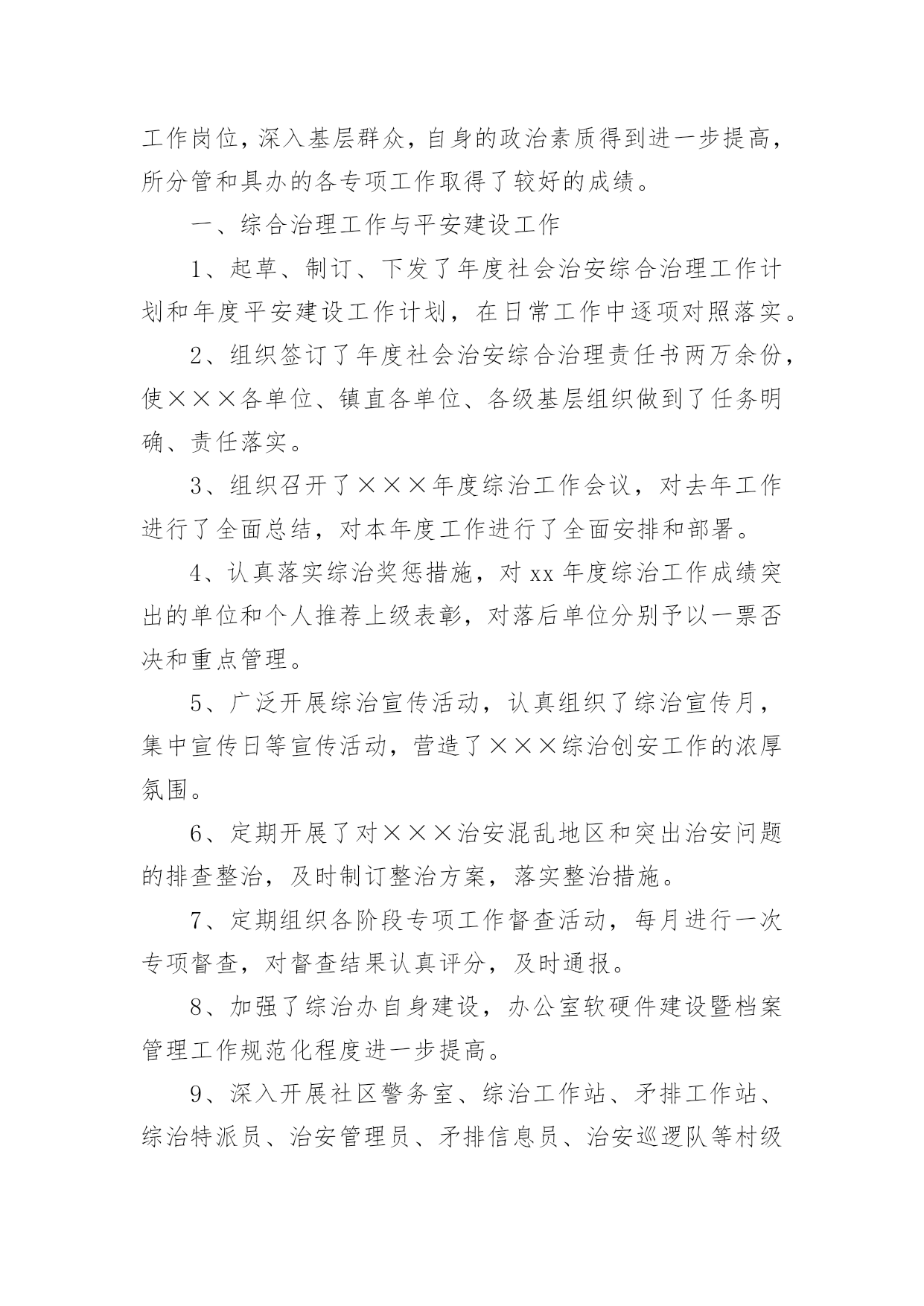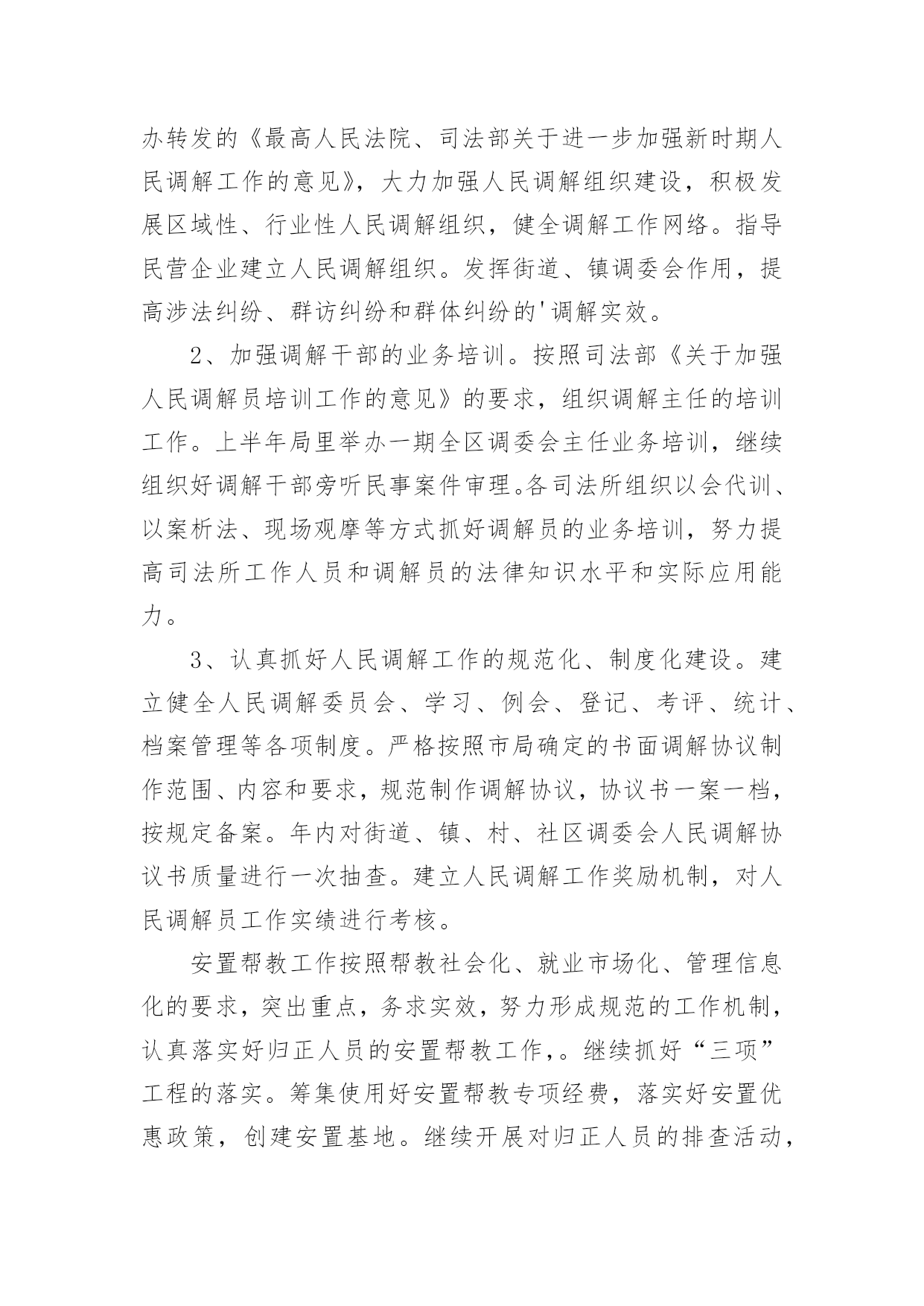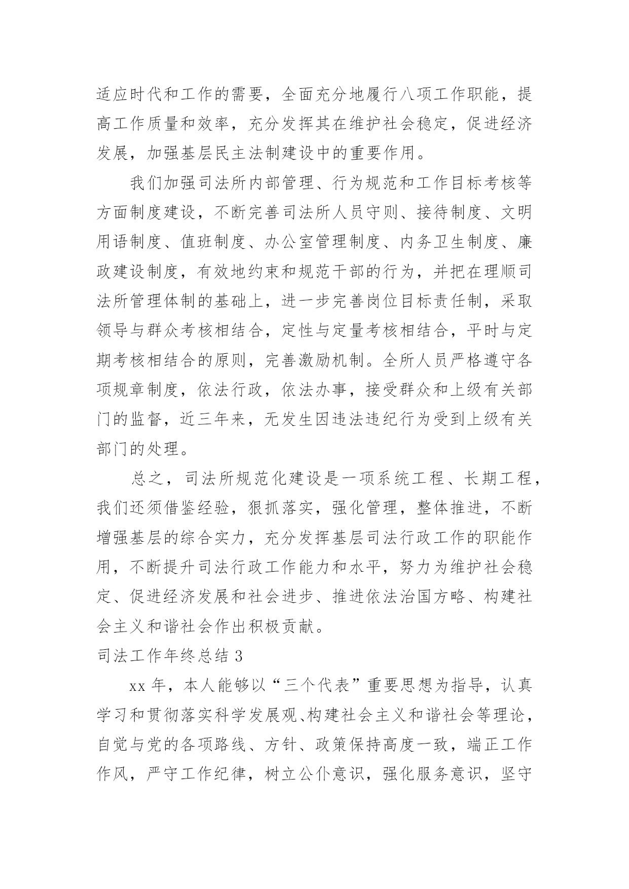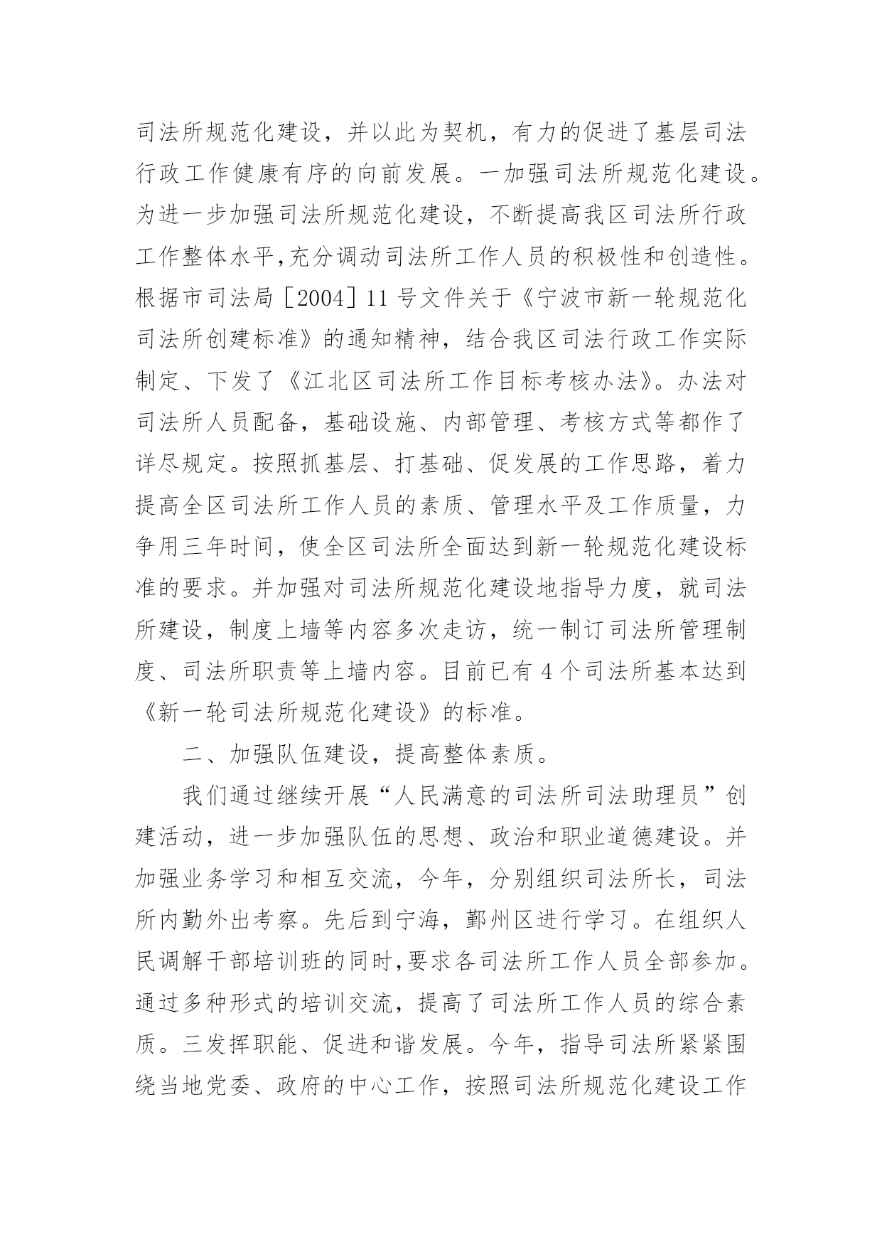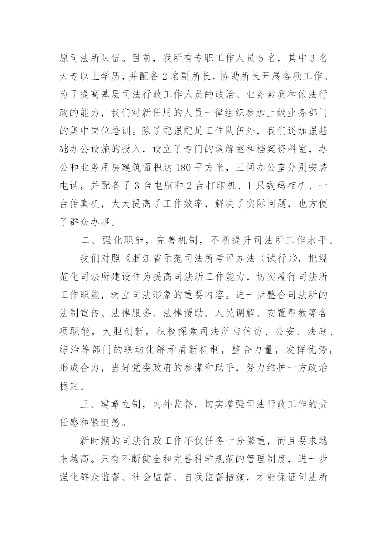 司法工作年终总结司法工作年终总结总结是事后对某一阶段的学习、工作或其完成情况加以回顾和分析的一种书面材料,通过它可以正确认识以往学习和工作中的优缺点,不如我们来制定一份总结吧。那么总结要注意有什么内容呢?以下是小编帮大家整理的司法工作年终总结,欢迎阅读,希望大家能够喜欢。司法工作年终总结1司法局基层科工作总结今年以来,我区基层司法行政工作在区委、区政府和局党组的领导下,在上级业务部门的指导下,以党的十六大精神和“三个代表”重要思想为指导,认真贯彻落实省、市司法行政工作会议精神,围绕改革、发展、稳定大局,以“平安江北”创建为契机,狠抓基层基础工作,为促进我区社会治安综合治理,优化投资环境,全面建设小康社会做出了积极贡献。1-11月份,全区一般民间纠纷排查1255起,已调处成功1211起,成功率96.5%,重大疑难纠纷排查38起,成功调处38起,调处成功率100%,社会不安定因素排查30起,成功调处16起,其余的都落实了预防。2009年工作情况总结如下:一、狠抓司法所规范化建设今年来,我区在推进基层司法行政事业发展中,狠抓了司法所规范化建设,并以此为契机,有力的促进了基层司法行政工作健康有序的向前发展。一加强司法所规范化建设。为进一步加强司法所规范化建设,不断提高我区司法所行政工作整体水平,充分调动司法所工作人员的积极性和创造性。根据市司法局[2004]11号文件关于《宁波市新一轮规范化司法所创建标准》的通知精神,结合我区司法行政工作实际制定、下发了《江北区司法所工作目标考核办法》。办法对司法所人员配备,基础设施、内部管理、考核方式等都作了详尽规定。按照抓基层、打基础、促发展的工作思路,着力提高全区司法所工作人员的素质、管理水平及工作质量,力争用三年时间,使全区司法所全面达到新一轮规范化建设标准的要求。并加强对司法所规范化建设地指导力度,就司法所建设,制度上墙等内容多次走访,统一制订司法所管理制度、司法所职责等上墙内容。目前已有4个司法所基本达到《新一轮司法所规范化建设》的标准。二、加强队伍建设,提高整体素质。我们通过继续开展“人民满意的司法所司法助理员”创建活动,进一步加强队伍的思想、政治和职业道德建设。并加强业务学习和相互交流,今年,分别组织司法所长,司法所内勤外出考察。先后到宁海,鄞州区进行学习。在组织人民调解干部培训班的同时,要求各司法所工作人员全部参加。通过多种形式的培训交流,提高了司法所工作人员的综合素质。三发挥职能、促进和谐发展。今年,指导司法所紧紧围绕当地党委、政府的中心工作,按照司法所规范化建设工作的新要求,依法全面正确履行工作职责,生动活泼地开展各项工作,充分发挥职能作用。全区司法所积极参与调解疑难复杂民间纠纷,开展法制宣传,为基层政府提司法建议,协助基层政府处理社会矛盾纠纷。开展矛盾纠纷排查,防止群体性上访。在村民委员会换届选举期间主动参与、指导。基层司法所通过发挥自身职能作用,为基层社会稳定做出了积极贡献。四加大重大疑难纠纷调处力度。以排查为先导,狠抓重点纠纷的调处。按照市局的要求各司法所都制定了辖区内不安定因素的预警方案。坚持每月一次排查和月报制度,及时掌握预警信息和重大突发性事件的专报工作,对排查出来的矛盾纠纷进行认真疏理和调处;慈城镇、庄桥、洪塘街道今年调处了多起赔偿金额达十几万元的重大纠纷。慈城镇司法所对去年遗留的重大疑难纠纷进行了专项调处,成功率达100%。坚持每季度一次的司法所长排调联席会议制度,分析交流情况,研讨复杂疑难问题。一些重大疑难纠纷和不安定因素请区法院民事庭的同志进行了解析和指导。对近期的主要矛盾纠纷进行了分析预防,从而有效地提高了基层司法行政工作队伍的业务素质和实际工作水平。三、扎扎实实做好帮教安置工作。认真贯彻落实《浙江省归正人员安置帮教工作办法》和宁波市人民政府第127号令《宁波市归正人员安置帮教工作实施细则》,切实做好帮教安置工作。及时印发了宁波市人民政府第127号令,向区人大汇报了2003-2004年的帮教安置工作情况。并对127号令的落实开展了调研。统一设计印刷了安置帮教谈话登记本,并与区政法委、公安分局等部门协调统一了台帐。今年区、街道、镇共落实安置帮教经费15万,到05年10月底,全区共建有安置基地8个,今年1-11月份,我区共接收归正人员46名,重新违法犯罪2名。目前,全区共有473名归正人员,已落实帮教473名,安置435名,帮教率达到100%,安置率达到92%。重新犯罪5个,管理犯罪率1%。有效地预防和减少了此人员地重新违法犯罪,促进了社会的稳定。二深入开展对归正人员的排查工作。按照底数清、情况明的工作要求,各司法所结合矛盾纠纷和社会不安定因素的排查,在重要节庆及重大政治活动期间开展定期排查工作,在排查的基础上,对归正人员采取多种形式、分类管理。今年4月份对