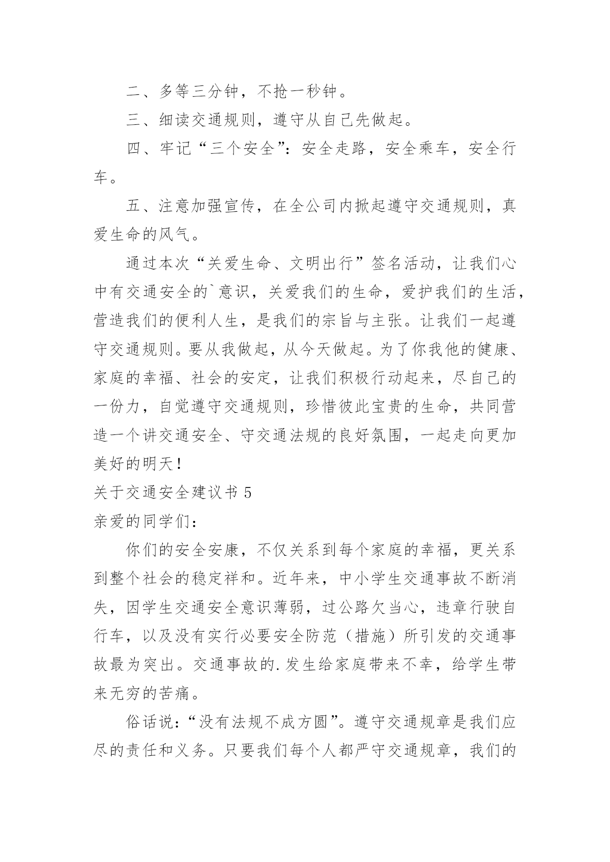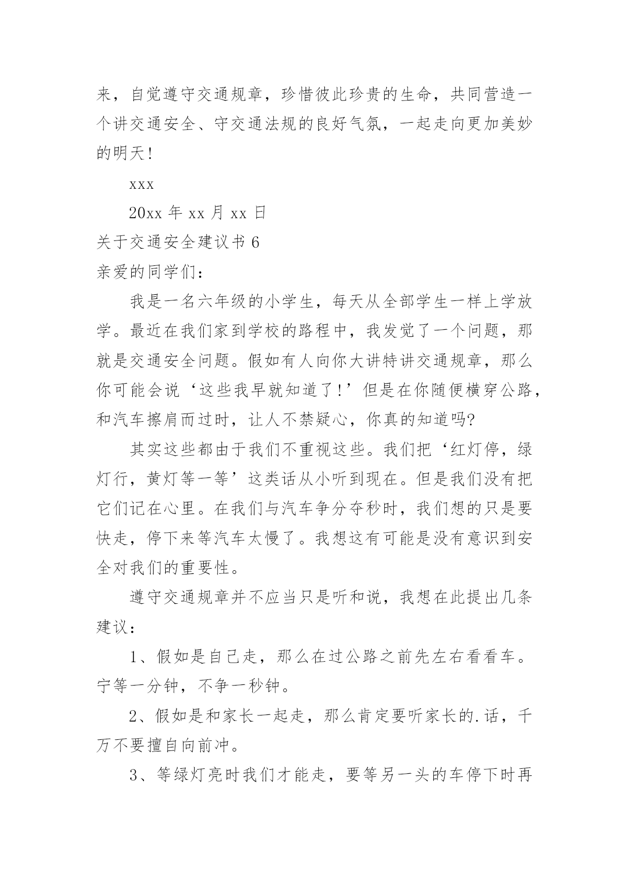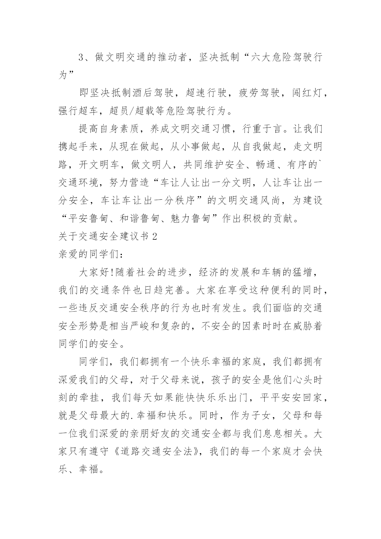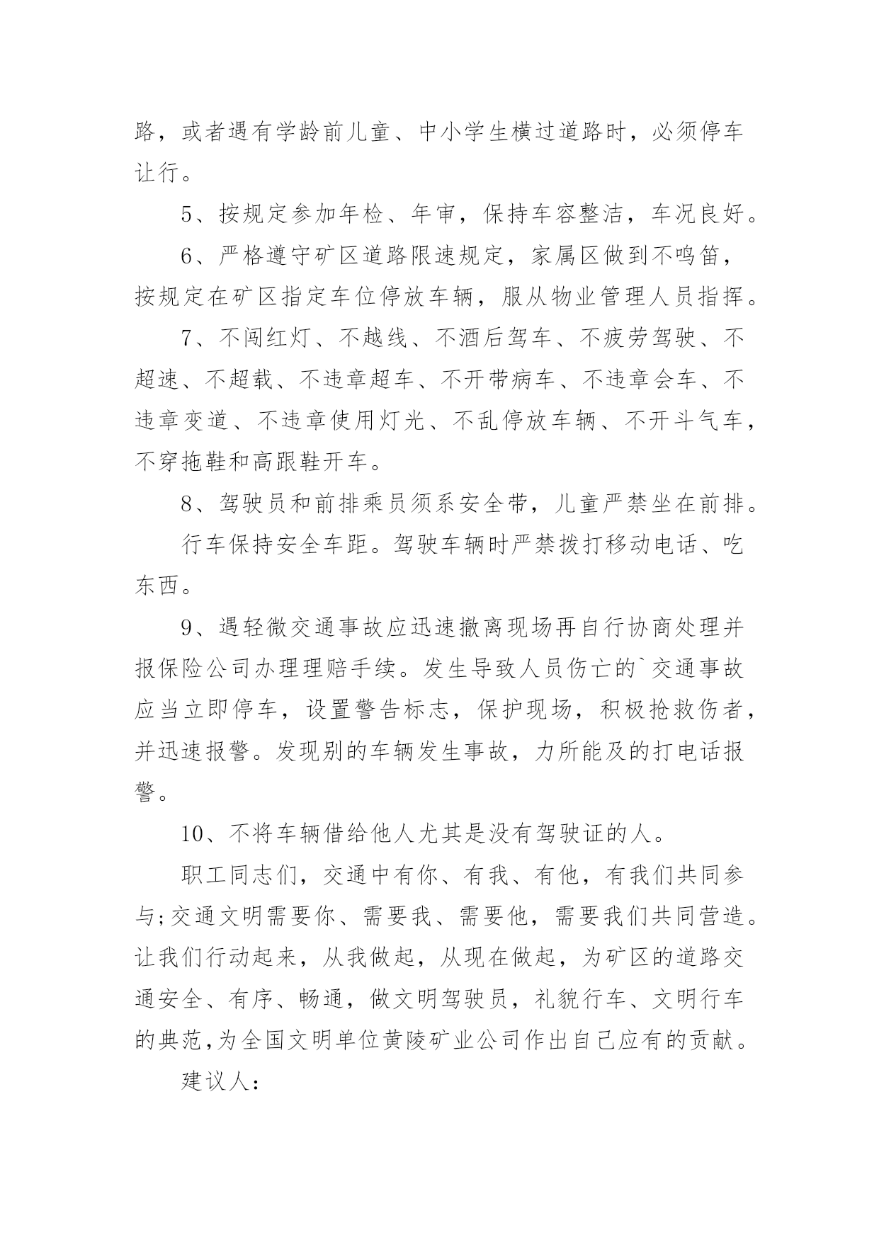 交通安全建议书关于交通安全建议书随着社会一步步向前发展,越来越多人会去使用建议书,在写作上,建议书有一定的书写规范。在写之前,可以先参考范文,以下是小编精心整理的关于交通安全建议书,希望对大家有所帮助。关于交通安全建议书1因为不遵守交通法规,我们看到了血的事实,经受了血的教训,那一幕幕令人心痛、惨不忍睹的画面,那一个个因抢救无效而离我们远去的人们,最后留给我们的都是心灵上的创伤和对离去者无尽的痛惜。我们在痛惜他们的同时,更应该清醒地认识到:遵守交通法规,就是珍爱生命!我们向广大驾驶员倡议:1、做文明交通的宣传者,积极宣传“六大交通文明行为”即大力倡导机动车礼让斑马线,机动车按序排队通行,机动车有序停放,文明使用车灯,行人、非机动车各行其道,行人、非机动车过街遵守信号等文明交通行为。2、做文明交通的实践者,自觉摒弃“六大交通陋习”即自觉告别违反交通信号,交通拥堵时插队,开车打手机,不系安全带,行人、非机动车闯入机动车道行驶,行人过街不走人行横道等交通陋习。3、做文明交通的推动者,坚决抵制“六大危险驾驶行为”即坚决抵制酒后驾驶,超速行驶,疲劳驾驶,闯红灯,强行超车,超员/超载等危险驾驶行为。提高自身素质,养成文明交通习惯,行重于言。让我们携起手来,从现在做起,从小事做起,从自我做起,走文明路,开文明车,做文明人,共同维护安全、畅通、有序的`交通环境,努力营造“车让人让出一分文明,人让车让出一分安全,车让车让出一分秩序”的文明交通风尚,为建设“平安鲁甸、和谐鲁甸、魅力鲁甸”作出积极的贡献。关于交通安全建议书2亲爱的同学们:大家好!随着社会的进步,经济的发展和车辆的猛增,我们的交通条件也日趋完善。大家在享受这种便利的同时,一些违反交通安全秩序的行为也时有发生。我们面临的交通安全形势是相当严峻和复杂的,不安全的因素时时在威胁着同学们的安全。同学们,我们都拥有一个快乐幸福的家庭,我们都拥有深爱我们的父母,对于父母来说,孩子的安全是他们心头时刻的牵挂,我们每天如果能快快乐乐出门,平平安安回家,就是父母最大的.幸福和快乐。同时,作为子女,父母和每一位我们深爱的亲朋好友的交通安全都与我们息息相关。大家只有遵守《道路交通安全法》,我们的每一个家庭才会快乐、幸福。重视交通安全是我们每个人的义务,更是我们每位同学的责任。我们要牢固树立交通安全意识,自觉遵守交通法规,掌握交通安全知识,提高自我保护能力。让我们携起手来呵护这文明之花,珍爱彼此的生命吧!在此,学校政教处向全体同学发出以下建议:1、认真学习《中华人民共和国道路交通安全法》,牢固树立安全行路的意识,增强交通法制观念。2、行人应在人行道上行走,如无人行道,靠路边右侧行走,横过道路走斑马线;步行或骑自行车过马路时,做到“一停、二看、三通过”。3、不闯红灯、不乱穿道路、不在道路上嬉闹玩耍,不越护栏、不追车、不抛物击车。4、出行时,不乘坐非法营运的交通工具,不搭载轻便摩托车或改装电动车;坐车时不向窗外乱扔东西。5、骑车靠右,不逆行、不双手离把、不互相追逐、不扶身并行;不突然猛拐;骑车时不载人、不戴耳塞听音乐。6、上学时,必须在校门前下车,服从学校的指挥。7、严禁学生驾驶机动车到校上课。8、主动宣传交通安全法规,积极参加交通安全社会公益活动。9、爱护交通标志、标线,不在绿地护栏、交通标志等,不随意移动、遮挡甚至破坏交通标志、标线。10、积极协助学校做好交通监督管理工作,发现不文明交通行为,应主动劝阻,对不听劝告者应尽快向学校反映;遇交通事故主动报警。亲爱的同学们,创造良好的交通环境是每一位学生应尽的义务和责任,为了家庭的幸福和社会的安定,让我们积极行动起来,珍视安全,珍爱生命,自觉遵守交通法规,从自己做起、从小事做起、从今天做起,共同营造一个道路畅通、交通和谐、出行文明的平安校园。建议人:xx时间:20xx年xx月xx日关于交通安全建议书3广大职工家属同志们:在春节来临之际,为进一步加强矿区交通安全的宣传教育,营造安全有序的交通氛围,建设交通安全宣传教育工作长效机制,提升职工交通法制意识、安全意识和公德意识,确保安全、畅通、文明、和谐的矿区交通环境,杜绝不文明、不安全交通现象,做到遵守规则、崇尚文明、珍爱生命,共创平安和谐矿区环境。让广大职工过一个祥和快乐的春节,矿区交通安全志愿者向全公司员工发出如下倡议:1、自觉遵守交通法规,维护矿区交通秩序。2、服从交通民警和灯光信号的指挥,河滨路严禁随意停放车辆,确保道路畅通,积极协助矿区保卫人员的管理工作。3、积极参加交通安全学习和宣传教育活动,并主动热情宣传交通安全常识。4、驾车遇有盲人、行走不便的残疾人、老年人横过道路,或者遇有学龄前儿童、中小学生横过道路时,必须停车让行。5、按规定参加年检、年审,保持车容整洁,车况良好。6、严格遵守矿区道路限速规定,家
