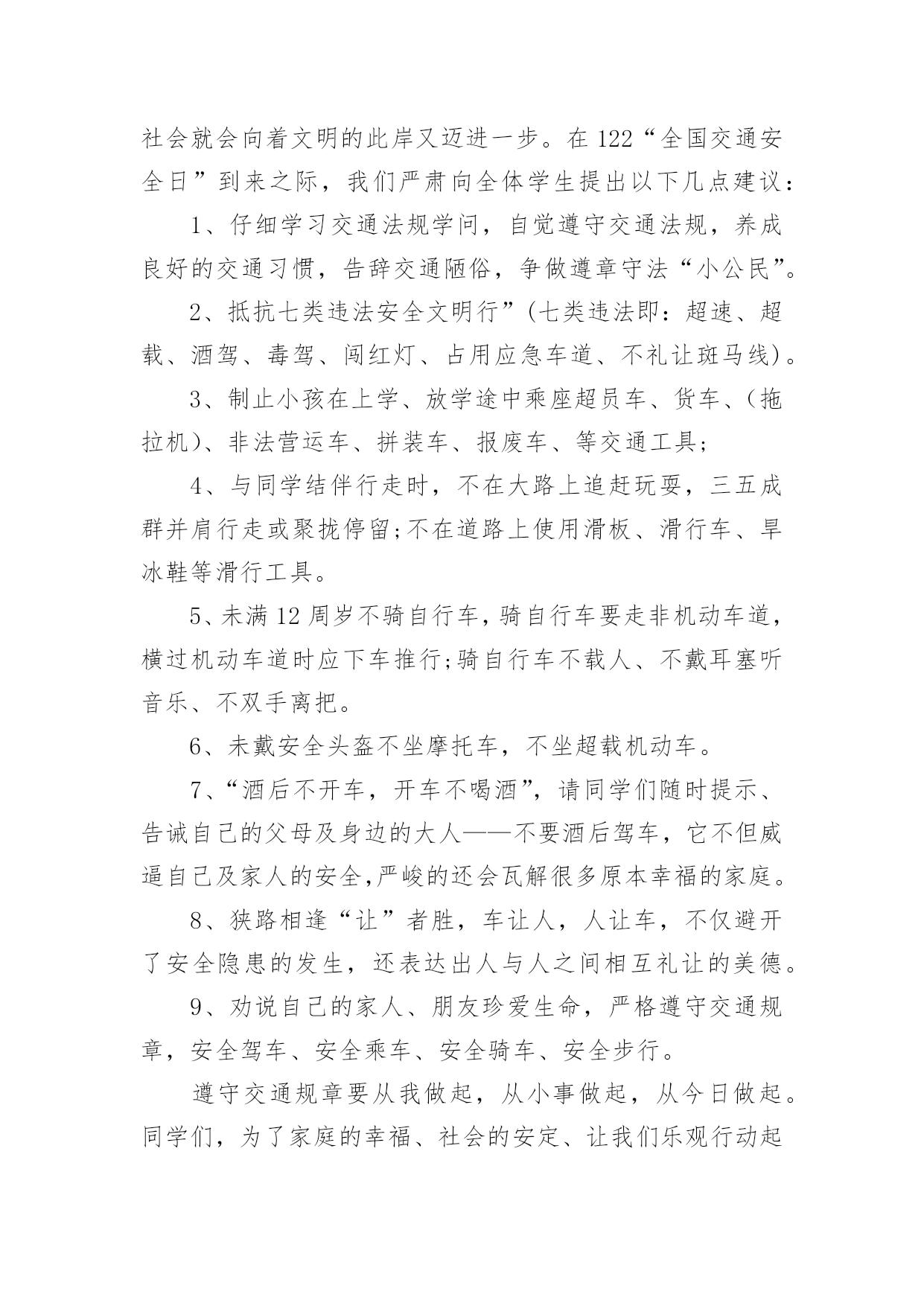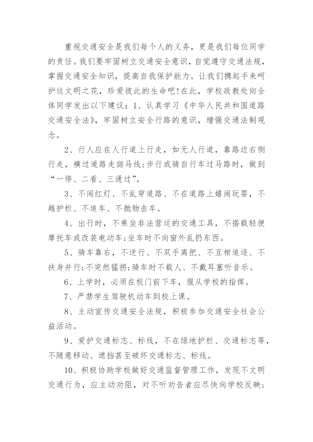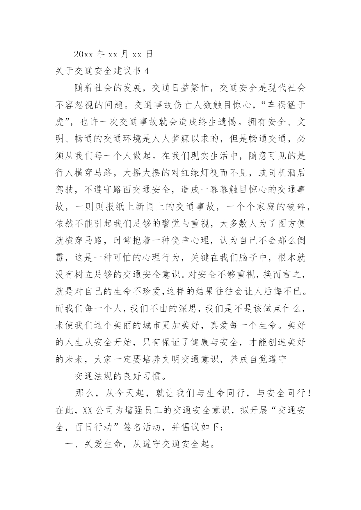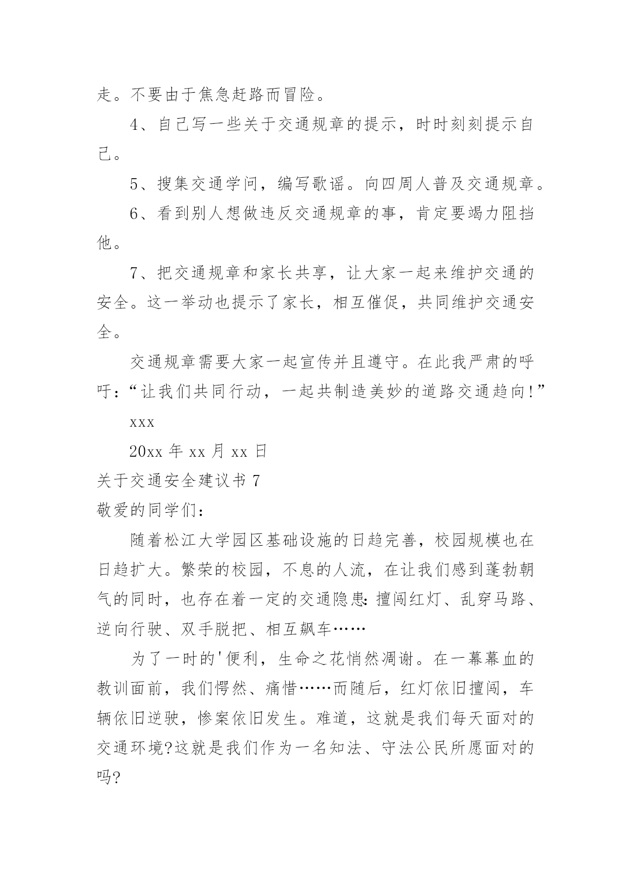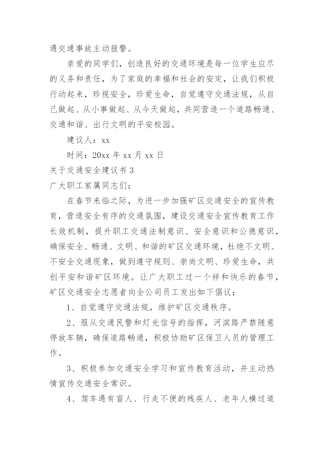 交通安全建议书关于交通安全建议书随着社会一步步向前发展,越来越多人会去使用建议书,在写作上,建议书有一定的书写规范。在写之前,可以先参考范文,以下是小编精心整理的关于交通安全建议书,希望对大家有所帮助。关于交通安全建议书1因为不遵守交通法规,我们看到了血的事实,经受了血的教训,那一幕幕令人心痛、惨不忍睹的画面,那一个个因抢救无效而离我们远去的人们,最后留给我们的都是心灵上的创伤和对离去者无尽的痛惜。我们在痛惜他们的同时,更应该清醒地认识到:遵守交通法规,就是珍爱生命!我们向广大驾驶员倡议:1、做文明交通的宣传者,积极宣传“六大交通文明行为”即大力倡导机动车礼让斑马线,机动车按序排队通行,机动车有序停放,文明使用车灯,行人、非机动车各行其道,行人、非机动车过街遵守信号等文明交通行为。2、做文明交通的实践者,自觉摒弃“六大交通陋习”即自觉告别违反交通信号,交通拥堵时插队,开车打手机,不系安全带,行人、非机动车闯入机动车道行驶,行人过街不走人行横道等交通陋习。3、做文明交通的推动者,坚决抵制“六大危险驾驶行为”即坚决抵制酒后驾驶,超速行驶,疲劳驾驶,闯红灯,强行超车,超员/超载等危险驾驶行为。提高自身素质,养成文明交通习惯,行重于言。让我们携起手来,从现在做起,从小事做起,从自我做起,走文明路,开文明车,做文明人,共同维护安全、畅通、有序的`交通环境,努力营造“车让人让出一分文明,人让车让出一分安全,车让车让出一分秩序”的文明交通风尚,为建设“平安鲁甸、和谐鲁甸、魅力鲁甸”作出积极的贡献。关于交通安全建议书2亲爱的同学们:大家好!随着社会的进步,经济的发展和车辆的猛增,我们的交通条件也日趋完善。大家在享受这种便利的同时,一些违反交通安全秩序的行为也时有发生。我们面临的交通安全形势是相当严峻和复杂的,不安全的因素时时在威胁着同学们的安全。同学们,我们都拥有一个快乐幸福的家庭,我们都拥有深爱我们的父母,对于父母来说,孩子的安全是他们心头时刻的牵挂,我们每天如果能快快乐乐出门,平平安安回家,就是父母最大的.幸福和快乐。同时,作为子女,父母和每一位我们深爱的亲朋好友的交通安全都与我们息息相关。大家只有遵守《道路交通安全法》,我们的每一个家庭才会快乐、幸福。重视交通安全是我们每个人的义务,更是我们每位同学的责任。我们要牢固树立交通安全意识,自觉遵守交通法规,掌握交通安全知识,提高自我保护能力。让我们携起手来呵护这文明之花,珍爱彼此的生命吧!在此,学校政教处向全体同学发出以下建议:1、认真学习《中华人民共和国道路交通安全法》,牢固树立安全行路的意识,增强交通法制观念。2、行人应在人行道上行走,如无人行道,靠路边右侧行走,横过道路走斑马线;步行或骑自行车过马路时,做到“一停、二看、三通过”。3、不闯红灯、不乱穿道路、不在道路上嬉闹玩耍,不越护栏、不追车、不抛物击车。4、出行时,不乘坐非法营运的交通工具,不搭载轻便摩托车或改装电动车;坐车时不向窗外乱扔东西。5、骑车靠右,不逆行、不双手离把、不互相追逐、不扶身并行;不突然猛拐;骑车时不载人、不戴耳塞听音乐。6、上学时,必须在校门前下车,服从学校的指挥。7、严禁学生驾驶机动车到校上课。8、主动宣传交通安全法规,积极参加交通安全社会公益活动。9、爱护交通标志、标线,不在绿地护栏、交通标志等,不随意移动、遮挡甚至破坏交通标志、标线。10、积极协助学校做好交通监督管理工作,发现不文明交通行为,应主动劝阻,对不听劝告者应尽快向学校反映;遇交通事故主动报警。亲爱的同学们,创造良好的交通环境是每一位学生应尽的义务和责任,为了家庭的幸福和社会的安定,让我们积极行动起来,珍视安全,珍爱生命,自觉遵守交通法规,从自己做起、从小事做起、从今天做起,共同营造一个道路畅通、交通和谐、出行文明的平安校园。建议人:xx时间:20xx年xx月xx日关于交通安全建议书3广大职工家属同志们:在春节来临之际,为进一步加强矿区交通安全的宣传教育,营造安全有序的交通氛围,建设交通安全宣传教育工作长效机制,提升职工交通法制意识、安全意识和公德意识,确保安全、畅通、文明、和谐的矿区交通环境,杜绝不文明、不安全交通现象,做到遵守规则、崇尚文明、珍爱生命,共创平安和谐矿区环境。让广大职工过一个祥和快乐的春节,矿区交通安全志愿者向全公司员工发出如下倡议:1、自觉遵守交通法规,维护矿区交通秩序。2、服从交通民警和灯光信号的指挥,河滨路严禁随意停放车辆,确保道路畅通,积极协助矿区保卫人员的管理工作。3、积极参加交通安全学习和宣传教育活动,并主动热情宣传交通安全常识。4、驾车遇有盲人、行走不便的残疾人、老年人横过道路,或者遇有学龄前儿童、中小学生横过道路时,必须停车让行。5、按规定参加年检、年审,保持车容整洁,车况良好。6、严格遵守矿区道路限速规定,家