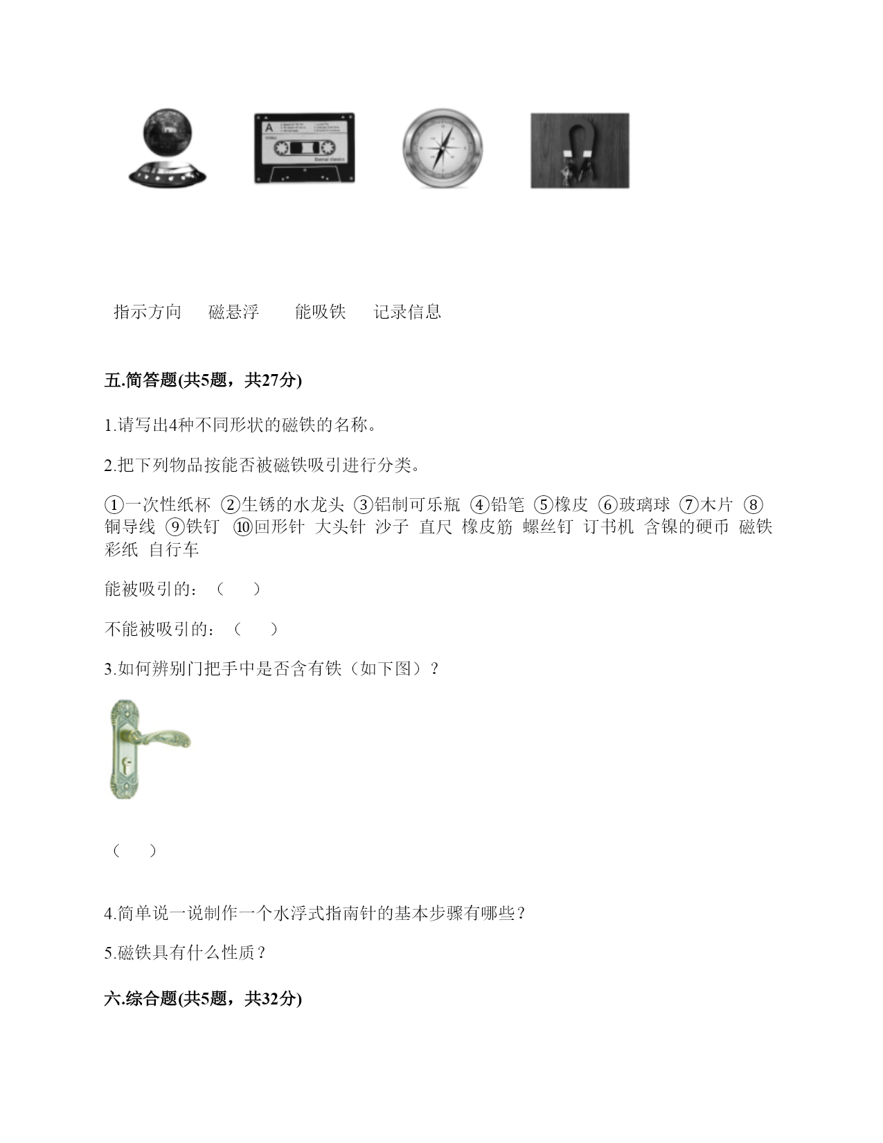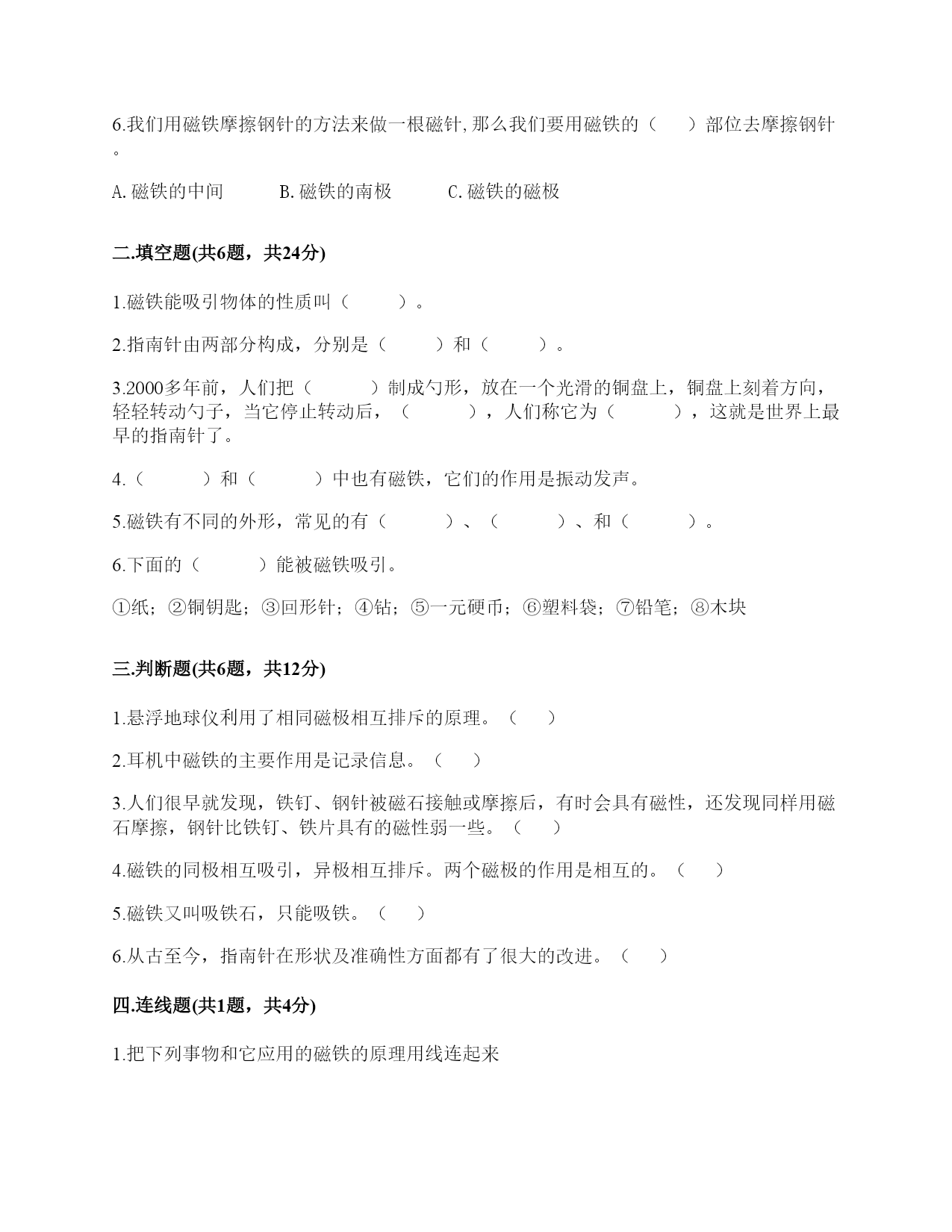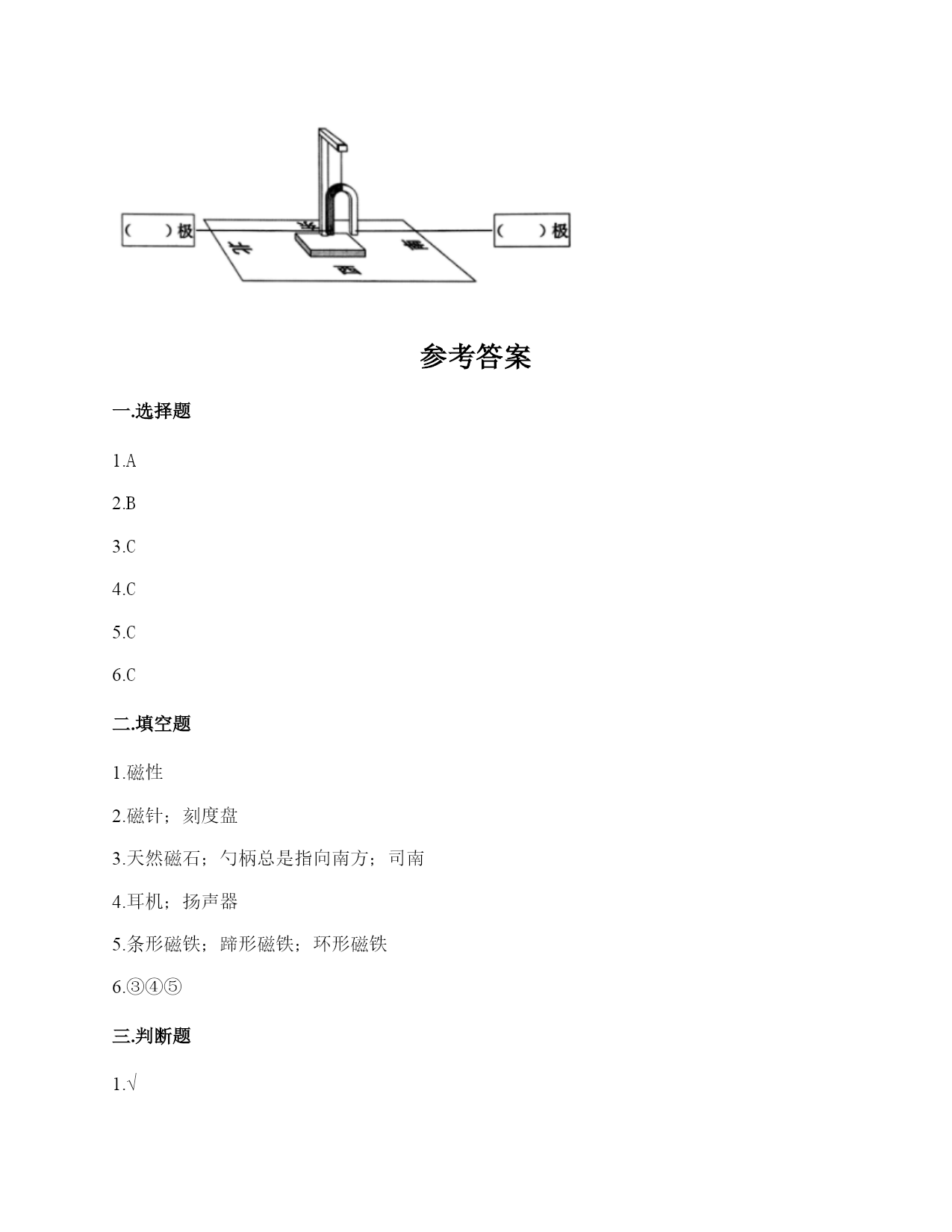 小学科学《磁铁》练习题一.选择题(共6题,共12分)1.如图所示,将小钢珠放置在蹄形磁铁上,最终小钢珠会滚到()处。A.AB.BC.C2.如图所示,提出指南针的四种放置方法的科学家是()。A.张衡B.沈括C.祖冲之3.下列物体不能被磁铁吸引的是()A.一元硬币B.铁钉C.五分硬币4.我们在制作水浮式指南针时,选取的材料有()。A.钢针、吹塑纸、条形磁铁B.指南针、吹塑纸、条形磁铁、盛水盘C.钢针、吹塑纸、条形磁铁、盛水盘、指南针5.指南针是利用磁铁能够()的特点制成的。A.吸铁B.导航C.指示南北方向6.我们用磁铁摩擦钢针的方法来做一根磁针,那么我们要用磁铁的()部位去摩擦钢针。A.磁铁的中间B.磁铁的南极C.磁铁的磁极二.填空题(共6题,共24分)1.磁铁能吸引物体的性质叫()。2.指南针由两部分构成,分别是()和()。3.2000多年前,人们把()制成勺形,放在一个光滑的铜盘上,铜盘上刻着方向,轻轻转动勺子,当它停止转动后,(),人们称它为(),这就是世界上最早的指南针了。4.()和()中也有磁铁,它们的作用是振动发声。5.磁铁有不同的外形,常见的有()、()、和()。6.下面的()能被磁铁吸引。①纸;②铜钥匙;③回形针;④钻;⑤一元硬币;⑥塑料袋;⑦铅笔;⑧木块三.判断题(共6题,共12分)1.悬浮地球仪利用了相同磁极相互排斥的原理。()2.耳机中磁铁的主要作用是记录信息。()3.人们很早就发现,铁钉、钢针被磁石接触或摩擦后,有时会具有磁性,还发现同样用磁石摩擦,钢针比铁钉、铁片具有的磁性弱一些。()4.磁铁的同极相互吸引,异极相互排斥。两个磁极的作用是相互的。()5.磁铁又叫吸铁石,只能吸铁。()6.从古至今,指南针在形状及准确性方面都有了很大的改进。()四.连线题(共1题,共4分)1.把下列事物和它应用的磁铁的原理用线连起来指示方向磁悬浮能吸铁记录信息五.简答题(共5题,共27分)1.请写出4种不同形状的磁铁的名称。2.把下列物品按能否被磁铁吸引进行分类。①一次性纸杯②生锈的水龙头③铝制可乐瓶④铅笔⑤橡皮⑥玻璃球⑦木片⑧铜导线⑨铁钉⑩回形针大头针沙子直尺橡皮筋螺丝钉订书机含镍的硬币磁铁彩纸自行车能被吸引的:()不能被吸引的:()3.如何辨别门把手中是否含有铁(如下图)?()4.简单说一说制作一个水浮式指南针的基本步骤有哪些?5.磁铁具有什么性质?六.综合题(共5题,共32分)1.下列哪些物体含有磁铁?把含有磁铁的物体圈出来。2.将一条形磁铁悬挂,手拿另一条形磁铁,当两磁铁的磁极互相靠近时,会有什么现象?把结果记录入下表。3.子枫想用钢针制作一个指南针,他的操作过程如下图所示,请仔细观察,并解决问题。1.如图所示的步骤叫做()。A.消磁B.磁化C.加磁2.制作磁针时,要用磁铁的磁极位置在钢针上()。A.来回反复摩擦B.沿一个方向反复摩擦C.先沿一个方向摩擦几次,再沿反方向摩擦几次3.制作磁针时,用磁铁的()在钢针上反复摩擦。A.一个磁极B.两个磁极C.中间部位4.如图是子枫在()。A.固定钢针B.测试钢针的磁性如图是子枫在用真正的指南针()。A.确定方向B.测量方向4.在图中标出东、南、西三个方向。5.请根据图中的情况,判断蹄形磁铁的磁极。参考答案一.选择题1.A2.B3.C4.C5.C6.C二.填空题1.磁性2.磁针;刻度盘3.天然磁石;勺柄总是指向南方;司南4.耳机;扬声器5.条形磁铁;蹄形磁铁;环形磁铁6.③④⑤三.判断题1.√2.×3.√4.×5.×6.√四.连线题1.如下:五.简答题1.常见的不同形状的磁铁:条形磁铁、蹄形磁铁、环形磁铁、方形磁铁、圆形磁铁等。2.能被吸引的:;不能被吸引的:3.利用磁铁的磁性来检查门把手是否含有铁,如果吸引说明含有铁,如果不吸引说明不含有铁。4.制作步骤为:(1)准备材料;(2)制作磁针;(3)安装磁针;(4)校验磁针;(5)标注磁极。5.(1)磁铁有磁性,可以吸引铁制的物品。(2)磁铁具有磁极,每一个磁铁有N极和S极两种磁极,是成对存在。(3)当两个磁铁互相靠近,相同的磁极会互相排斥推开,不相同的磁极会互相吸引黏住。所以说:同极相斥,异极相吸。六.综合题1.如下:2.吸引;吸引;排斥;同极相斥,异极相吸。3.BBABA4.东西南5.北南