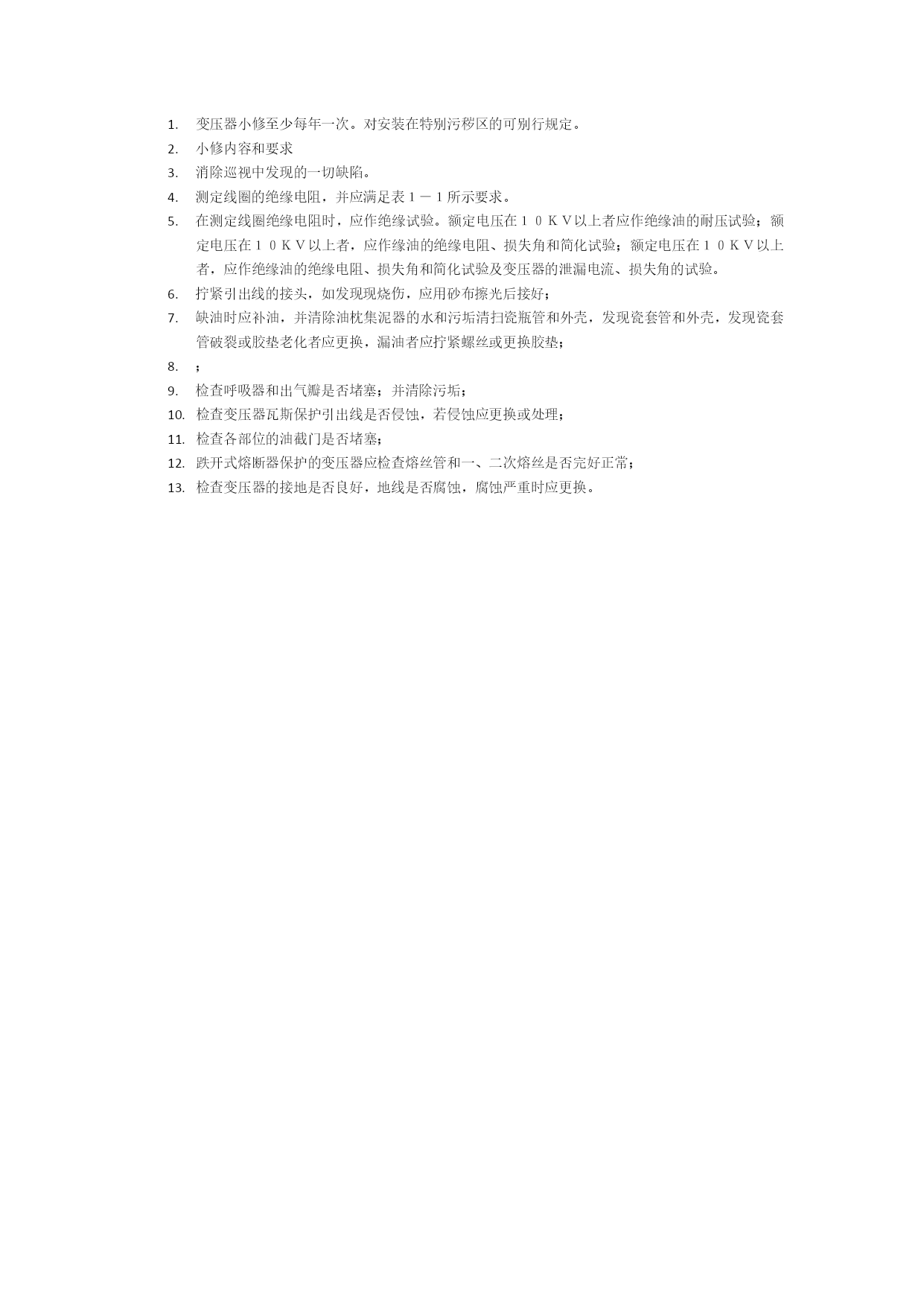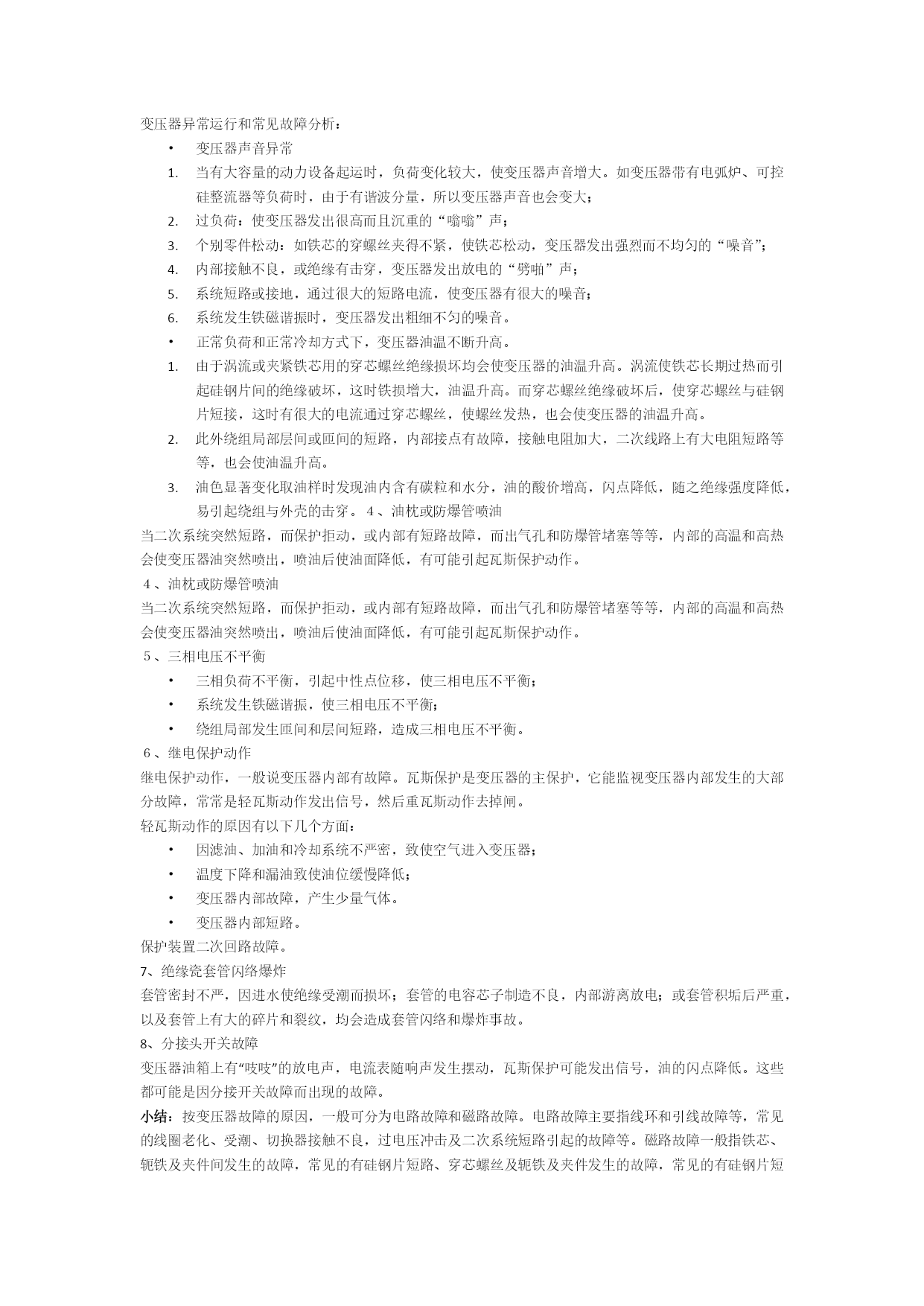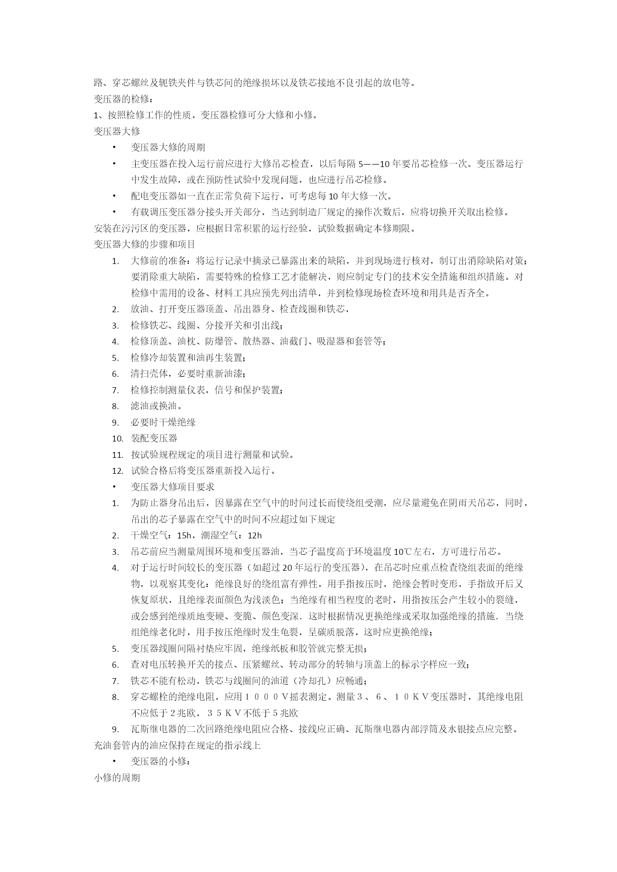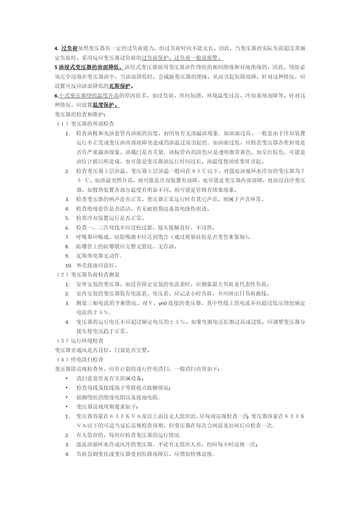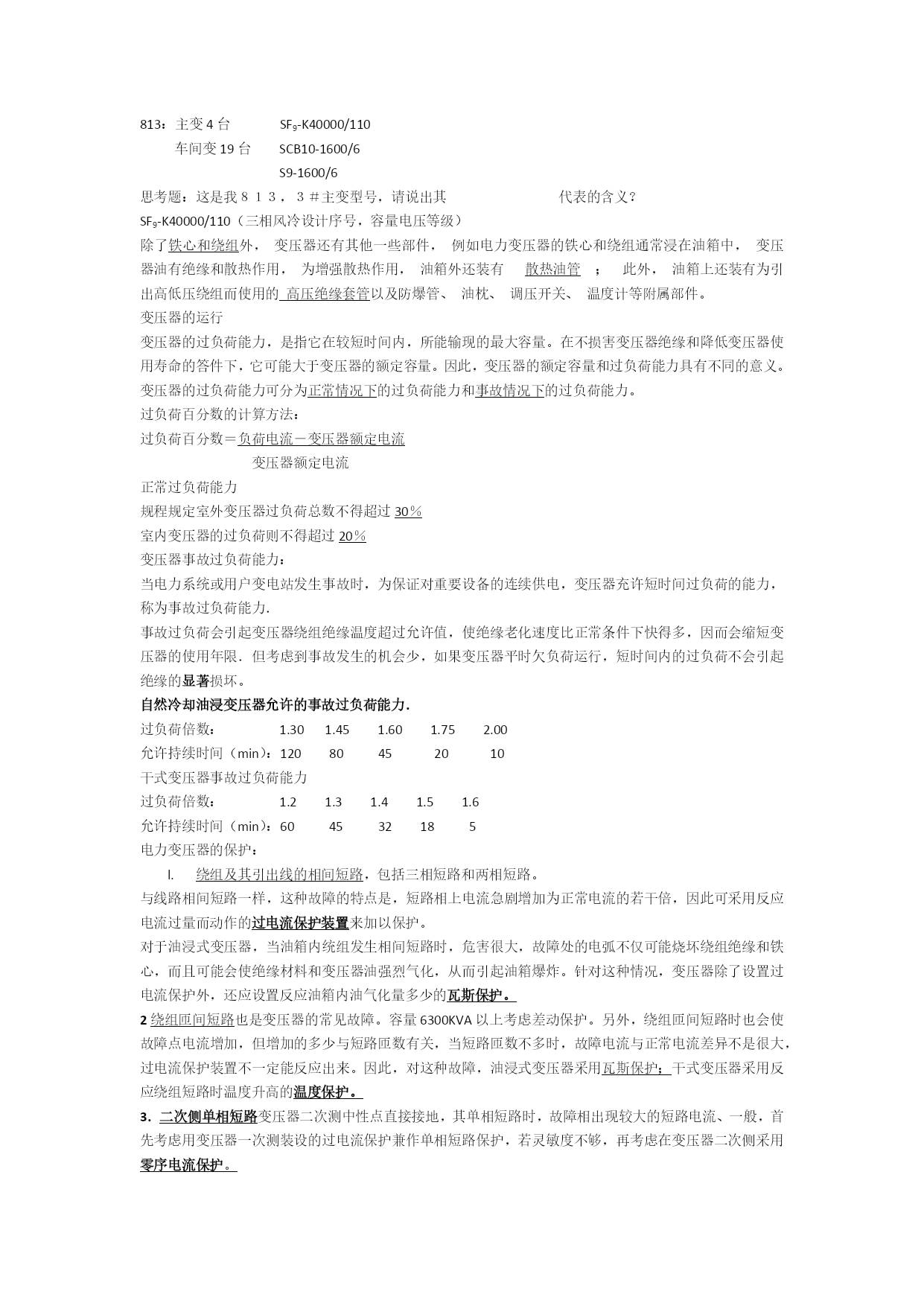教学的目标1、理解变压器的工作原理,及重要参数。2、知道变压器的构造3、了解变压器的运行方式4、电力变压器的保护5、了解变压器的检查和维护一、概述电力变压器(以下简称变压器)是用来改变交流电压大小的电气设备.它根据电磁感应的原理,把某一等级的交流电压换成另一等级的交流电压,以满足不同负荷的需要.当多个电站联合起来组成一个电力系统时,除需要输电线路等设备外,也要依靠变压器把各种电压不相等的线路连接起来,形成一个系统.所以变压器在电力系统中,是不可缺少的重要设备如图:E1=n1(△φ/△t)E2=n2(△φ/△t)E1/E2=n1/n2由于原、副线圈的电阻都很小,所以,U1=E1,U2=E2U1/U2=n1/n2思考:怎样让电压升高或降低?变压器的主要技术参数:1、额定电压:变压器的额定电压应与所有连接的输变电线路电压相符合,我国输变电线路电压等级(KV)为:0.38、3、6、10、35、63、110、220、330、500变压器的产品系列是以高压的电压等级而分的目前我们厂变压器电压等级分别(KV)为:0.38、6、10、35、110五个等级2、额定频率额定频率是所设计的运行频率,我国为50HZ3、额定容量它是表观容量的惯用值,表征传输电能的大小。4、额定电流变压器的额定电流是由绕组的额定容量除以该绕组的额定电压及相应的相系数(单相为1,三相为√3),而算得的流经绕组线端的电流。5、绕组联结组标号还有分接范围,空载电流、空载损耗和空载合闸电流、阻抗电压和负载损耗以及冷却方式等。股份公司变压器数据型号统计:股份:主变2台S210-31500/110车间变29台S9-1600/6SCB10-1600/6磷铵主变1台SF9-K25000/110车间变31台SCB10-1600/6813:主变4台SF9-K40000/110车间变19台SCB10-1600/6S9-1600/6思考题:这是我813,3#主变型号,请说出其代表的含义?SF9-K40000/110(三相风冷设计序号,容量电压等级)除了铁心和绕组外,变压器还有其他一些部件,例如电力变压器的铁心和绕组通常浸在油箱中,变压器油有绝缘和散热作用,为增强散热作用,油箱外还装有散热油管;此外,油箱上还装有为引出高低压绕组而使用的高压绝缘套管以及防爆管、油枕、调压开关、温度计等附属部件。变压器的运行变压器的过负荷能力,是指它在较短时间内,所能输现的最大容量。在不损害变压器绝缘和降低变压器使用寿命的答件下,它可能大于变压器的额定容量。因此,变压器的额定容量和过负荷能力具有不同的意义。变压器的过负荷能力可分为正常情况下的过负荷能力和事故情况下的过负荷能力。过负荷百分数的计算方法:过负荷百分数=负荷电流-变压器额定电流变压器额定电流正常过负荷能力规程规定室外变压器过负荷总数不得超过30%室内变压器的过负荷则不得超过20%变压器事故过负荷能力:当电力系统或用户变电站发生事故时,为保证对重要设备的连续供电,变压器充许短时间过负荷的能力,称为事故过负荷能力.事故过负荷会引起变压器绕组绝缘温度超过允许值,使绝缘老化速度比正常条件下快得多,因而会缩短变压器的使用年限.但考虑到事故发生的机会少,如果变压器平时欠负荷运行,短时间内的过负荷不会引起绝缘的显著损坏。自然冷却油浸变压器允许的事故过负荷能力.过负荷倍数:1.301.451.601.752.00允许持续时间(min):12080452010干式变压器事故过负荷能力过负荷倍数:1.21.31.41.51.6允许持续时间(min):604532185电力变压器的保护:绕组及其引出线的相间短路,包括三相短路和两相短路。与线路相间短路一样,这种故障的特点是,短路相上电流急剧增加为正常电流的若干倍,因此可采用反应电流过量而动作的过电流保护装置来加以保护。对于油浸式变压器,当油箱内统组发生相间短路时,危害很大,故障处的电弧不仅可能烧坏绕组绝缘和铁心,而且可能会使绝缘材料和变压器油强烈气化,从而引起油箱爆炸。针对这种情况,变压器除了设置过电流保护外,还应设置反应油箱内油气化量多少的瓦斯保护。2绕组匝间短路也是变压器的常见故障。容量6300KVA以上考虑差动保护。另外,绕组匝间短路时也会使故障点电流增加,但增加的多少与短路匝数有关,当短路匝数不多时,故障电流与正常电流差异不是很大,过电流保护装置不一定能反应出来。因此,对这种故障,油浸式变压器采用瓦斯保护;干式变压器采用反应绕组短路时温度升高的温度保护。3.二次侧单相短路变压器二次测中性点直接接地,其单相短路时,故障相出现较大的短路电流、一般,首先考虑用变压器一次测装设的过电流保护兼作单相短路保护,若灵敏度不