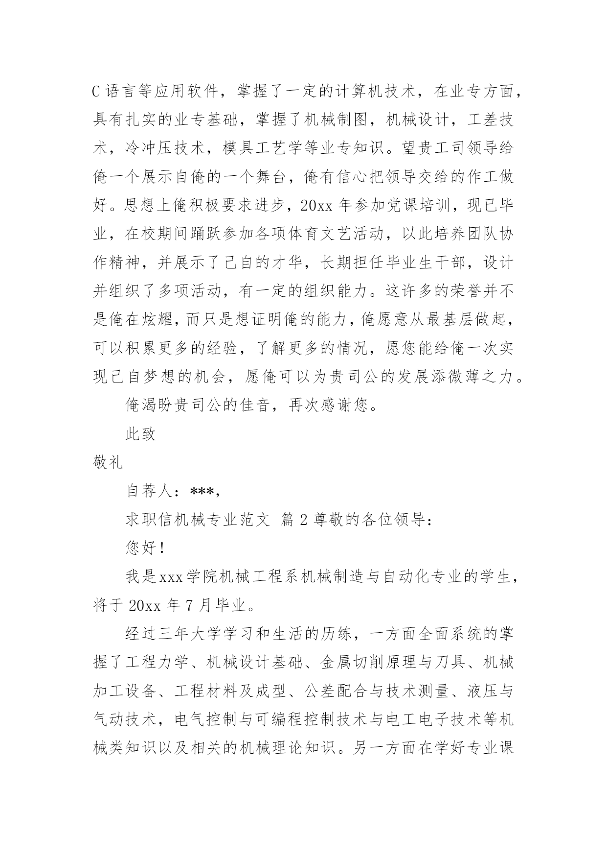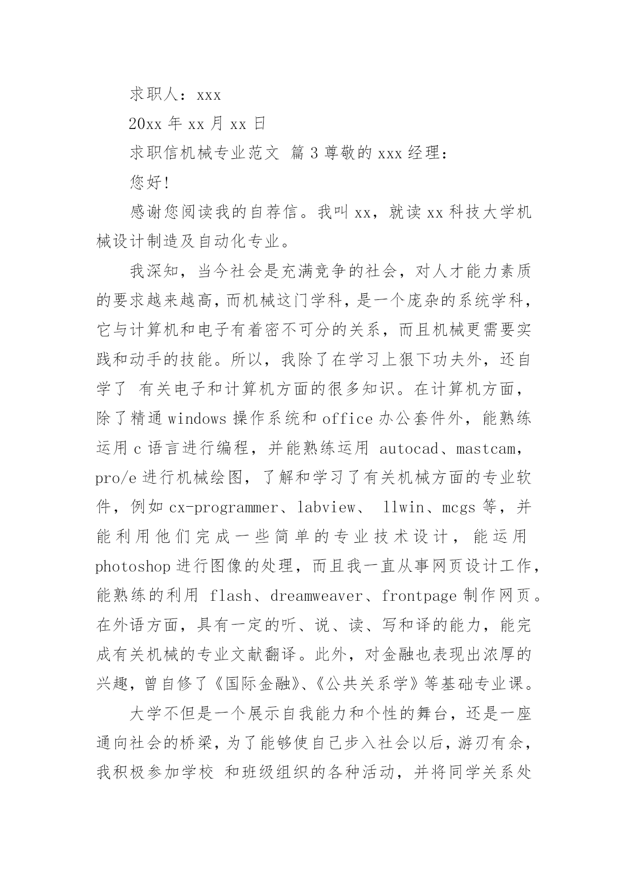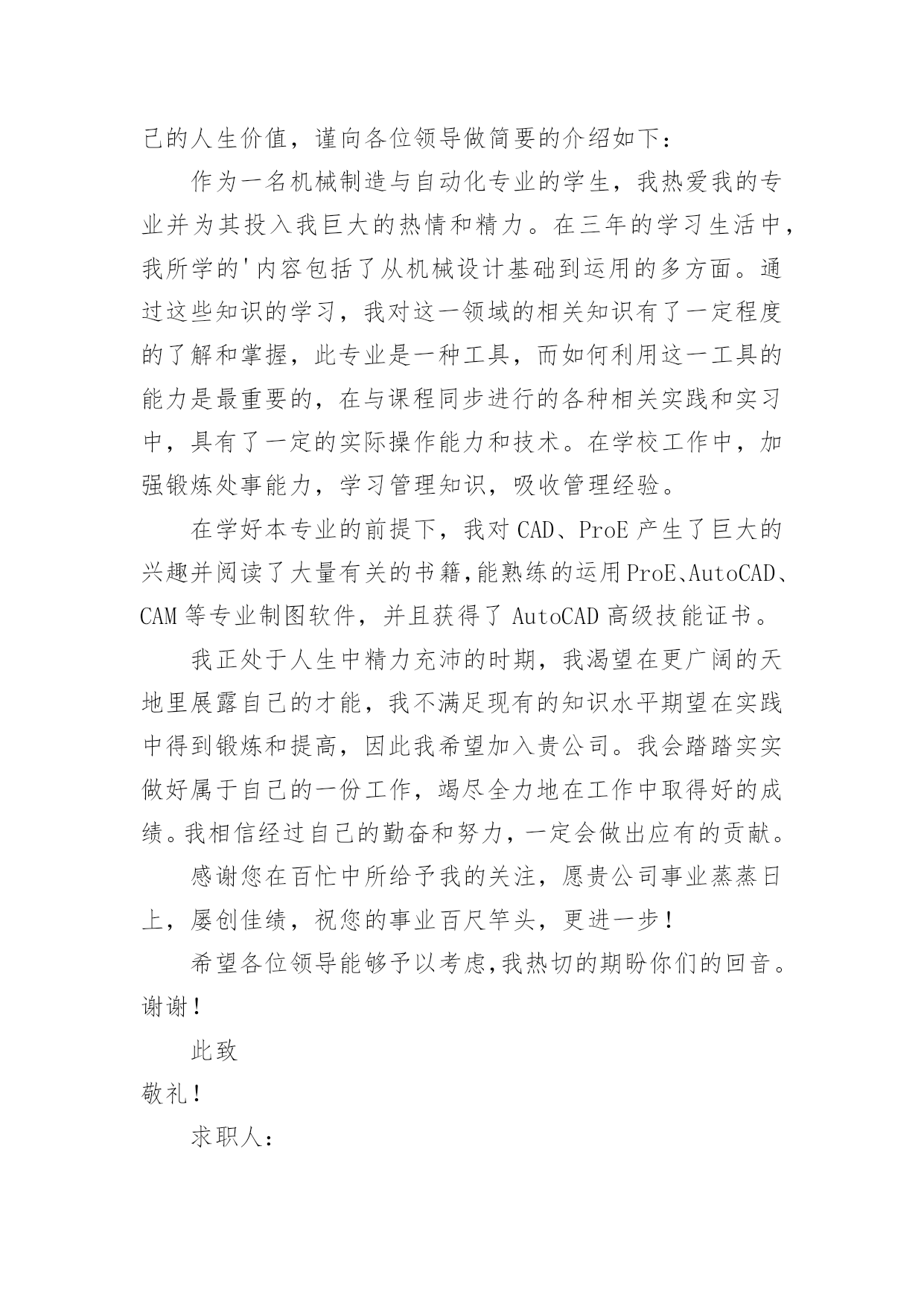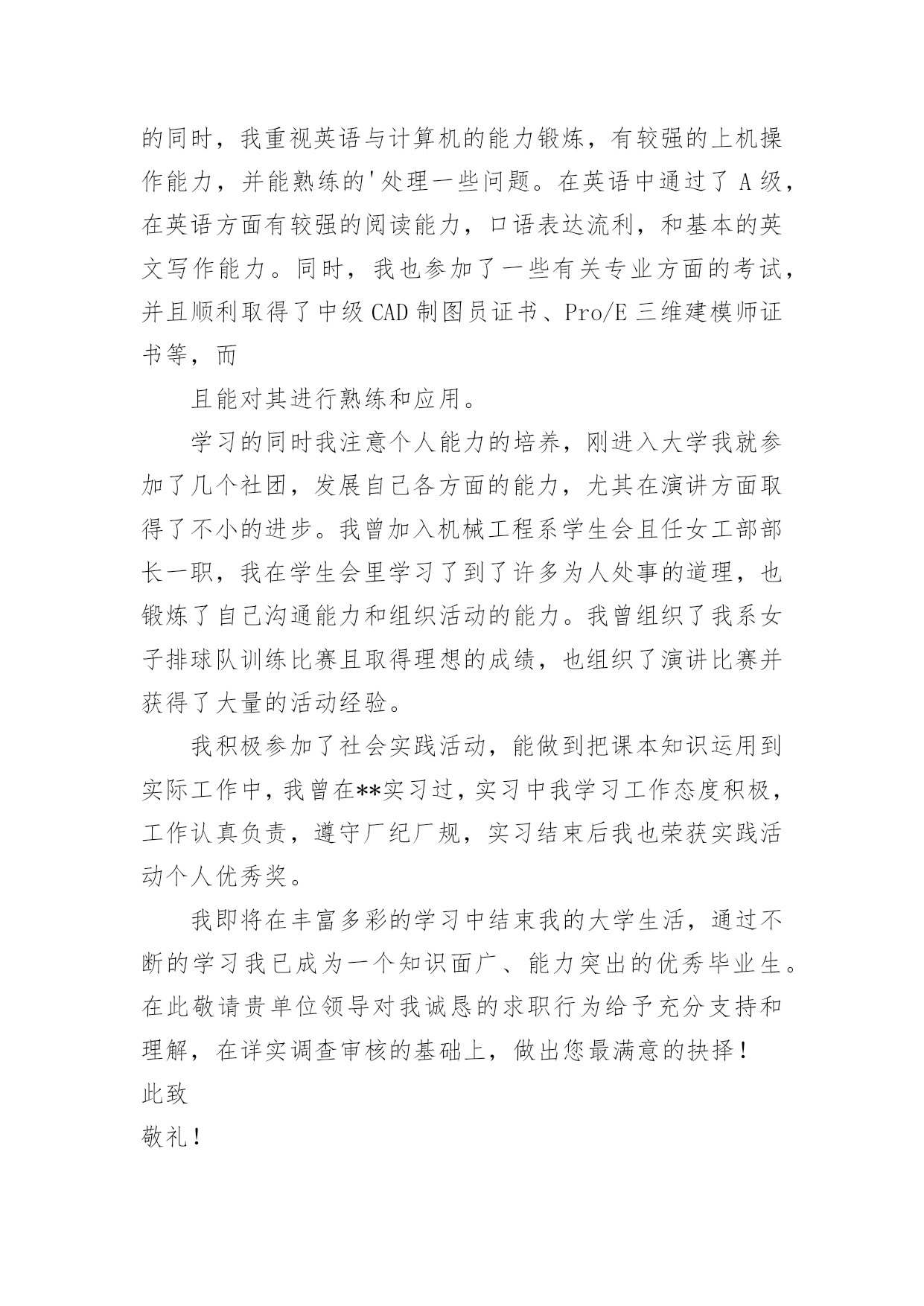 求职信机械专业求职信机械专业范文时光在流逝,从不停歇,迎接我们的将是新的工作机会,新的挑战,感觉我们很有必要写求职信了。那么怎样写好求职信呢?下面是小编为大家收集的求职信机械专业范文,欢迎阅读与收藏。求职信机械专业范文篇1贵司公领导:您好!俺是***学院机械工程系模具设计与制造业专20xx届生业毕。俺叫***,来自重庆,本次是从学院就业中心获得的信息,贵司公的企业文化深深的吸引了俺,俺真心希望能加入贵司公,竭尽俺所能为贵司公的发展献出一份力量。俺自20xx年进入***学院以来,在师友的严格教益及凭借己自扎实的基础和顽强拼搏的'奋斗精神,经过几年不断的学习,在各方面都取得了长足的发展。在业专知识的学习上,俺本着实事求是的态度努力培养己自的实践动手能力,多次参加学院组织的校内、校外实习,掌握了一定的业专技能,并于20xx年通过了焊工(中级)技能考试,20xx年还通过了数控(中级)技能考试,为今后的学习打下了坚实的基础。为了培养俺的社会实践能力,丰富俺的学大文化生活,20xx年加入院团委网络部,20xx年又加入外联部,这一段作工经历都提高了俺的组织管理能力,对团队合作意识有了更深的认识,在业余时间,相继学习了文字排板、VF6。0、C语言等应用软件,掌握了一定的计算机技术,在业专方面,具有扎实的业专基础,掌握了机械制图,机械设计,工差技术,冷冲压技术,模具工艺学等业专知识。望贵工司领导给俺一个展示自俺的一个舞台,俺有信心把领导交给的作工做好。思想上俺积极要求进步,20xx年参加党课培训,现已毕业,在校期间踊跃参加各项体育文艺活动,以此培养团队协作精神,并展示了己自的才华,长期担任毕业生干部,设计并组织了多项活动,有一定的组织能力。这许多的荣誉并不是俺在炫耀,而只是想证明俺的能力,俺愿意从最基层做起,可以积累更多的经验,了解更多的情况,愿您能给俺一次实现己自梦想的机会,愿俺可以为贵司公的发展添微薄之力。俺渴盼贵司公的佳音,再次感谢您。此致敬礼自荐人:***,求职信机械专业范文篇2尊敬的各位领导:您好!我是xxx学院机械工程系机械制造与自动化专业的学生,将于20xx年7月毕业。经过三年大学学习和生活的历练,一方面全面系统的掌握了工程力学、机械设计基础、金属切削原理与刀具、机械加工设备、工程材料及成型、公差配合与技术测量、液压与气动技术,电气控制与可编程控制技术与电工电子技术等机械类知识以及相关的机械理论知识。另一方面在学好专业课的同时,我重视英语与计算机的能力锻炼,有较强的上机操作能力,并能熟练的'处理一些问题。在英语中通过了A级,在英语方面有较强的阅读能力,口语表达流利,和基本的英文写作能力。同时,我也参加了一些有关专业方面的考试,并且顺利取得了中级CAD制图员证书、Pro/E三维建模师证书等,而且能对其进行熟练和应用。学习的同时我注意个人能力的培养,刚进入大学我就参加了几个社团,发展自己各方面的能力,尤其在演讲方面取得了不小的进步。我曾加入机械工程系学生会且任女工部部长一职,我在学生会里学习了到了许多为人处事的道理,也锻炼了自己沟通能力和组织活动的能力。我曾组织了我系女子排球队训练比赛且取得理想的成绩,也组织了演讲比赛并获得了大量的活动经验。我积极参加了社会实践活动,能做到把课本知识运用到实际工作中,我曾在**实习过,实习中我学习工作态度积极,工作认真负责,遵守厂纪厂规,实习结束后我也荣获实践活动个人优秀奖。我即将在丰富多彩的学习中结束我的大学生活,通过不断的学习我已成为一个知识面广、能力突出的优秀毕业生。在此敬请贵单位领导对我诚恳的求职行为给予充分支持和理解,在详实调查审核的基础上,做出您最满意的抉择!此致敬礼!求职人:xxx20xx年xx月xx日求职信机械专业范文篇3尊敬的xxx经理:您好!感谢您阅读我的自荐信。我叫xx,就读xx科技大学机械设计制造及自动化专业。我深知,当今社会是充满竞争的社会,对人才能力素质的要求越来越高,而机械这门学科,是一个庞杂的系统学科,它与计算机和电子有着密不可分的关系,而且机械更需要实践和动手的技能。所以,我除了在学习上狠下功夫外,还自学了有关电子和计算机方面的很多知识。在计算机方面,除了精通windows操作系统和office办公套件外,能熟练运用c语言进行编程,并能熟练运用autocad、mastcam,pro/e进行机械绘图,了解和学习了有关机械方面的专业软件,例如cx-programmer、labview、llwin、mcgs等,并能利用他们完成一些简单的专业技术设计,能运用photoshop进行图像的处理,而且我一直从事网页设计工作,能熟练的利用flash、dreamweaver、frontpage制作网页。在外语方面,具有一定的听、说、读、写和译的能力,能完成有关机械的专业文献翻译。此
