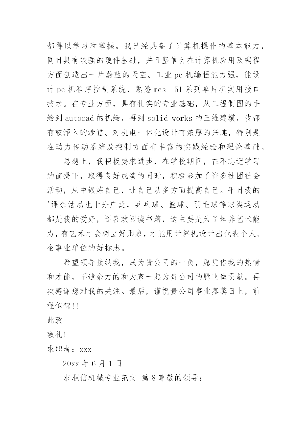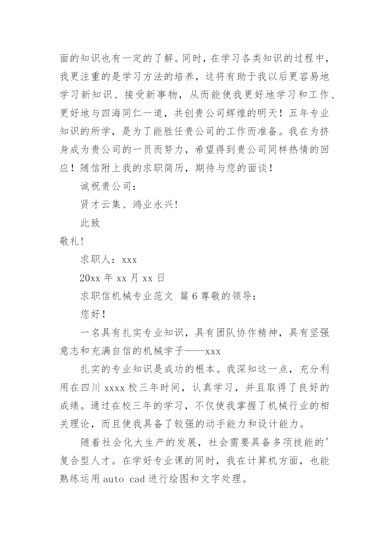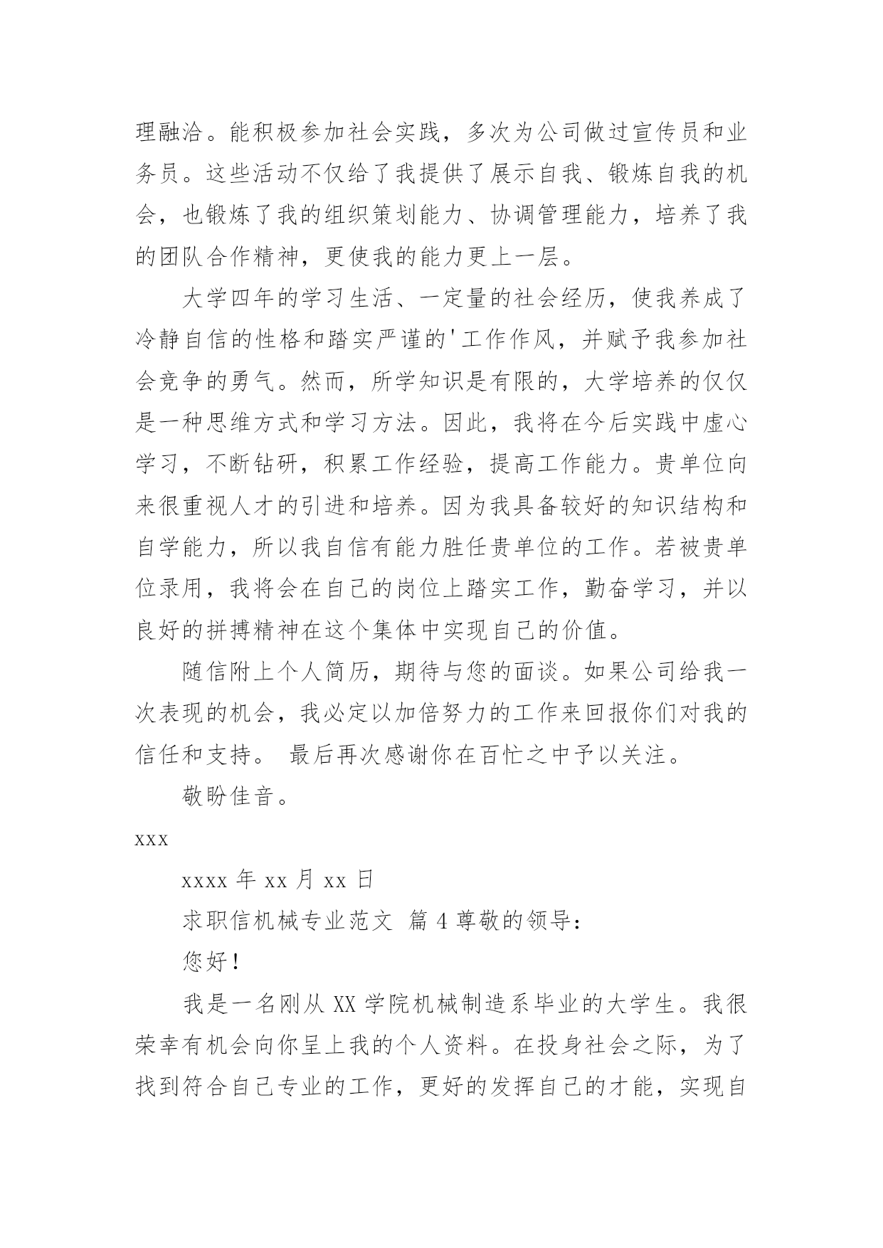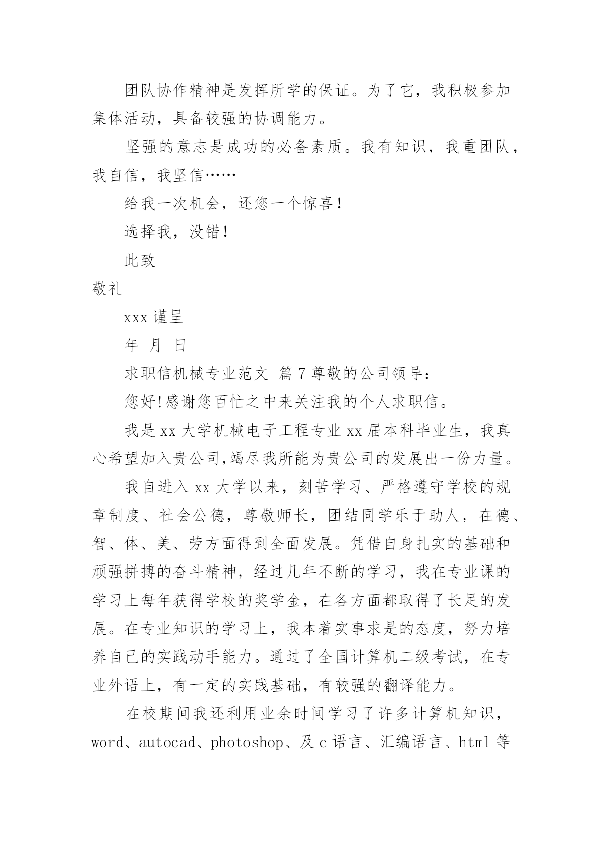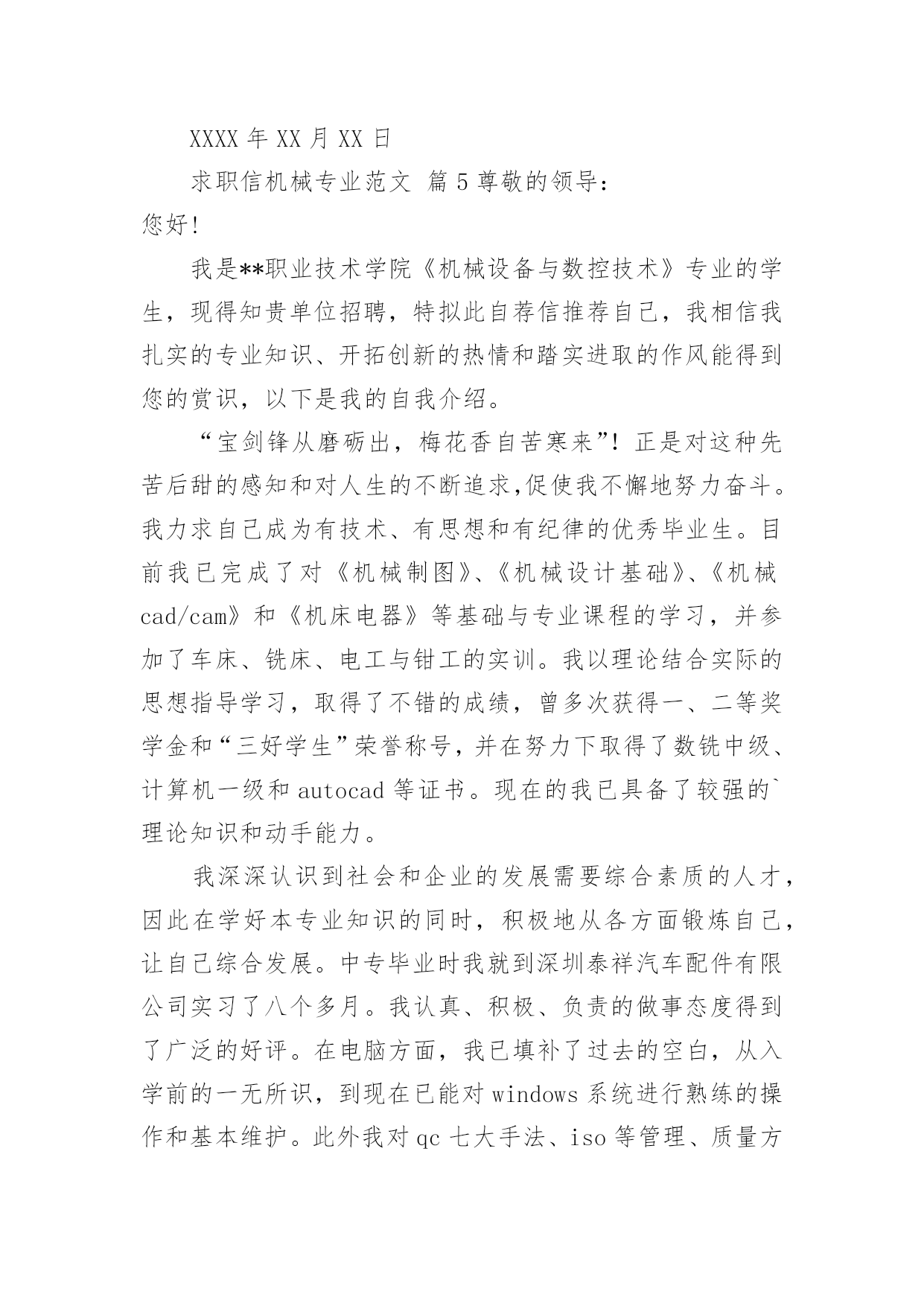 求职信机械专业求职信机械专业范文时光在流逝,从不停歇,迎接我们的将是新的工作机会,新的挑战,感觉我们很有必要写求职信了。那么怎样写好求职信呢?下面是小编为大家收集的求职信机械专业范文,欢迎阅读与收藏。求职信机械专业范文篇1贵司公领导:您好!俺是***学院机械工程系模具设计与制造业专20xx届生业毕。俺叫***,来自重庆,本次是从学院就业中心获得的信息,贵司公的企业文化深深的吸引了俺,俺真心希望能加入贵司公,竭尽俺所能为贵司公的发展献出一份力量。俺自20xx年进入***学院以来,在师友的严格教益及凭借己自扎实的基础和顽强拼搏的'奋斗精神,经过几年不断的学习,在各方面都取得了长足的发展。在业专知识的学习上,俺本着实事求是的态度努力培养己自的实践动手能力,多次参加学院组织的校内、校外实习,掌握了一定的业专技能,并于20xx年通过了焊工(中级)技能考试,20xx年还通过了数控(中级)技能考试,为今后的学习打下了坚实的基础。为了培养俺的社会实践能力,丰富俺的学大文化生活,20xx年加入院团委网络部,20xx年又加入外联部,这一段作工经历都提高了俺的组织管理能力,对团队合作意识有了更深的认识,在业余时间,相继学习了文字排板、VF6。0、C语言等应用软件,掌握了一定的计算机技术,在业专方面,具有扎实的业专基础,掌握了机械制图,机械设计,工差技术,冷冲压技术,模具工艺学等业专知识。望贵工司领导给俺一个展示自俺的一个舞台,俺有信心把领导交给的作工做好。思想上俺积极要求进步,20xx年参加党课培训,现已毕业,在校期间踊跃参加各项体育文艺活动,以此培养团队协作精神,并展示了己自的才华,长期担任毕业生干部,设计并组织了多项活动,有一定的组织能力。这许多的荣誉并不是俺在炫耀,而只是想证明俺的能力,俺愿意从最基层做起,可以积累更多的经验,了解更多的情况,愿您能给俺一次实现己自梦想的机会,愿俺可以为贵司公的发展添微薄之力。俺渴盼贵司公的佳音,再次感谢您。此致敬礼自荐人:***,求职信机械专业范文篇2尊敬的各位领导:您好!我是xxx学院机械工程系机械制造与自动化专业的学生,将于20xx年7月毕业。经过三年大学学习和生活的历练,一方面全面系统的掌握了工程力学、机械设计基础、金属切削原理与刀具、机械加工设备、工程材料及成型、公差配合与技术测量、液压与气动技术,电气控制与可编程控制技术与电工电子技术等机械类知识以及相关的机械理论知识。另一方面在学好专业课的同时,我重视英语与计算机的能力锻炼,有较强的上机操作能力,并能熟练的'处理一些问题。在英语中通过了A级,在英语方面有较强的阅读能力,口语表达流利,和基本的英文写作能力。同时,我也参加了一些有关专业方面的考试,并且顺利取得了中级CAD制图员证书、Pro/E三维建模师证书等,而且能对其进行熟练和应用。学习的同时我注意个人能力的培养,刚进入大学我就参加了几个社团,发展自己各方面的能力,尤其在演讲方面取得了不小的进步。我曾加入机械工程系学生会且任女工部部长一职,我在学生会里学习了到了许多为人处事的道理,也锻炼了自己沟通能力和组织活动的能力。我曾组织了我系女子排球队训练比赛且取得理想的成绩,也组织了演讲比赛并获得了大量的活动经验。我积极参加了社会实践活动,能做到把课本知识运用到实际工作中,我曾在**实习过,实习中我学习工作态度积极,工作认真负责,遵守厂纪厂规,实习结束后我也荣获实践活动个人优秀奖。我即将在丰富多彩的学习中结束我的大学生活,通过不断的学习我已成为一个知识面广、能力突出的优秀毕业生。在此敬请贵单位领导对我诚恳的求职行为给予充分支持和理解,在详实调查审核的基础上,做出您最满意的抉择!此致敬礼!求职人:xxx20xx年xx月xx日求职信机械专业范文篇3尊敬的xxx经理:您好!感谢您阅读我的自荐信。我叫xx,就读xx科技大学机械设计制造及自动化专业。我深知,当今社会是充满竞争的社会,对人才能力素质的要求越来越高,而机械这门学科,是一个庞杂的系统学科,它与计算机和电子有着密不可分的关系,而且机械更需要实践和动手的技能。所以,我除了在学习上狠下功夫外,还自学了有关电子和计算机方面的很多知识。在计算机方面,除了精通windows操作系统和office办公套件外,能熟练运用c语言进行编程,并能熟练运用autocad、mastcam,pro/e进行机械绘图,了解和学习了有关机械方面的专业软件,例如cx-programmer、labview、llwin、mcgs等,并能利用他们完成一些简单的专业技术设计,能运用photoshop进行图像的处理,而且我一直从事网页设计工作,能熟练的利用flash、dreamweaver、frontpage制作网页。在外语方面,具有一定的听、说、读、写和译的能力,能完成有关机械的专业文献翻译。此