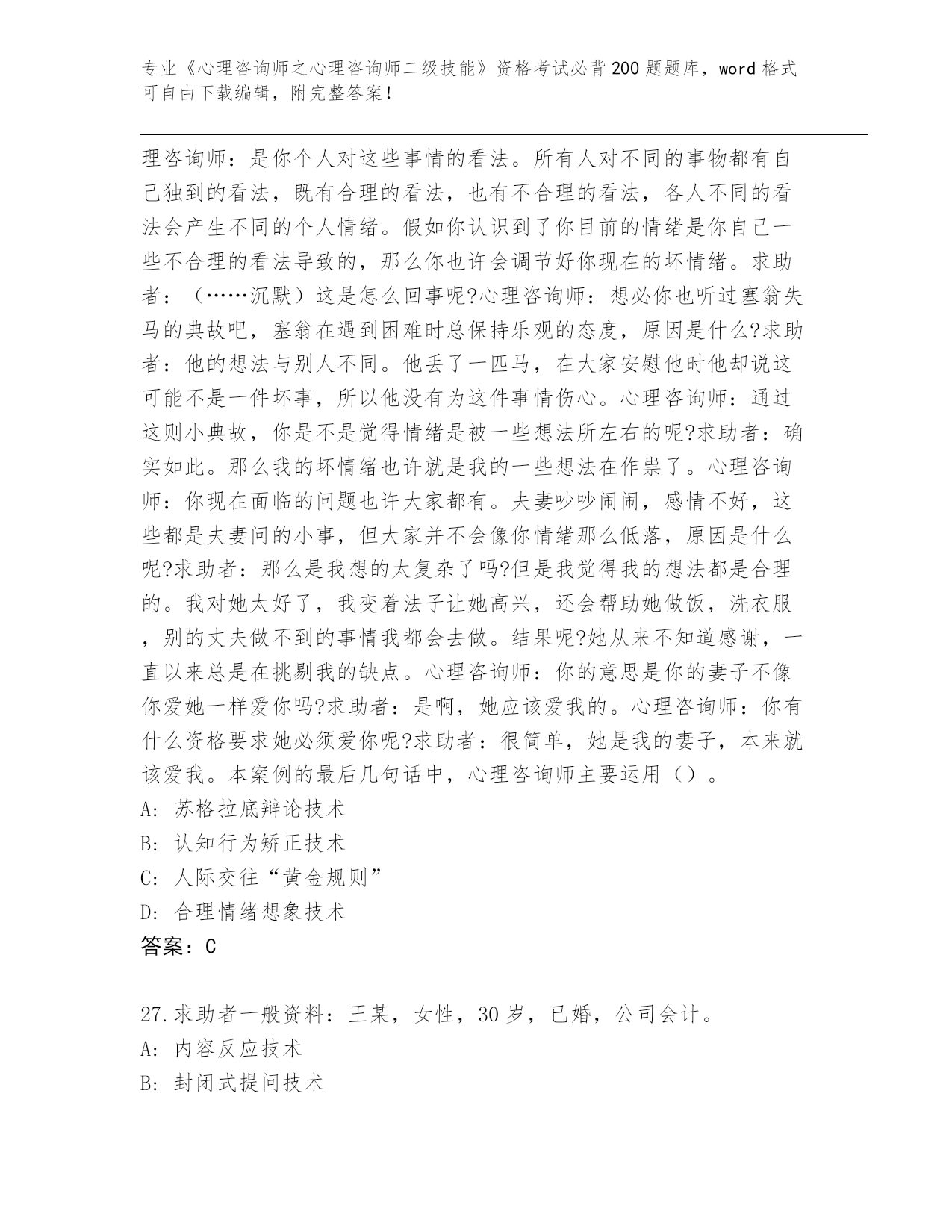 安徽省《心理咨询师之心理咨询师二级技能》资格考试必背200题完整版【网校专用】