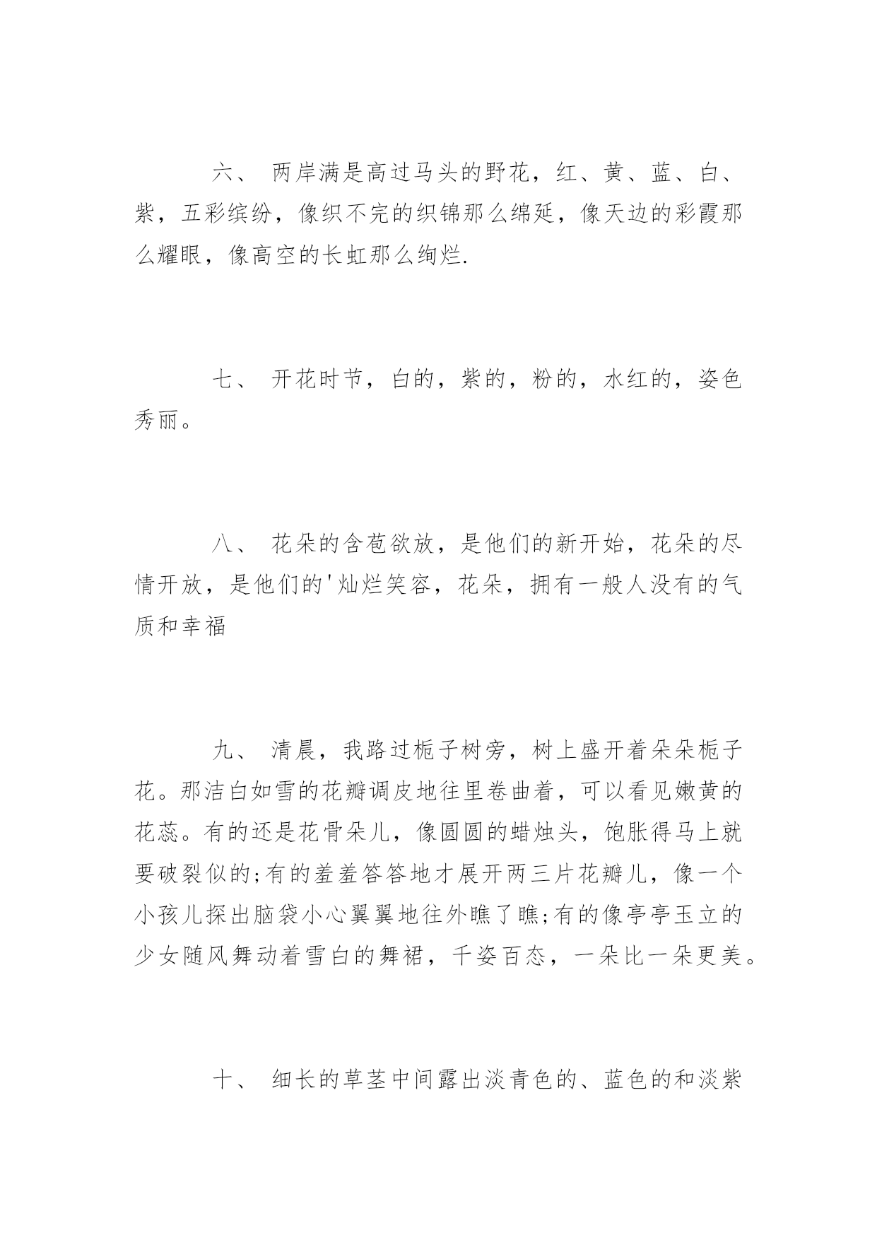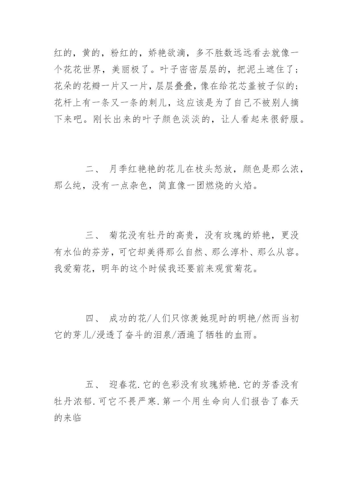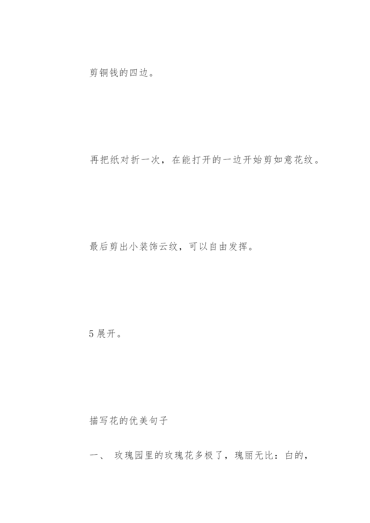 云纹花的剪纸教程简单又漂亮云纹花的剪纸教程简单又漂亮云纹是剪纸中的一种常见手法,一直深受老百姓的喜爱。小编为大家力荐了云纹花的剪纸方法,给大家作为参考,希望能帮到大家!云纹花的剪纸材料剪刀纸云纹花的剪纸方法方形纸折两次,成三角形。在三角形的顶部剪一条弧线,是铜钱的中心。剪铜钱的四边。再把纸对折一次,在能打开的一边开始剪如意花纹。最后剪出小装饰云纹,可以自由发挥。5展开。描写花的优美句子一、玫瑰园里的玫瑰花多极了,瑰丽无比:白的,红的,黄的,粉红的,娇艳欲滴,多不胜数远远看去就像一个花花世界,美丽极了。叶子密密层层的,把泥土遮住了;花朵的花瓣一片又一片,层层叠叠,像在给花芯盖被子似的;花杆上有一条又一条的刺儿,这应该是为了自己不被别人摘下来吧。刚长出来的叶子颜色淡淡的,让人看起来很舒服。二、月季红艳艳的花儿在枝头怒放,颜色是那么浓,那么纯,没有一点杂色,简直像一团燃烧的火焰。三、菊花没有牡丹的高贵,没有玫瑰的娇艳,更没有水仙的芬芳,可它却美得那么自然、那么淳朴、那么从容。我爱菊花,明年的这个时候我还要前来观赏菊花。四、成功的花/人们只惊羡她现时的明艳/然而当初它的芽儿/浸透了奋斗的泪泉/洒遍了牺牲的血雨。五、迎春花.它的色彩没有玫瑰娇艳.它的芳香没有牡丹浓郁.可它不畏严寒.第一个用生命向人们报告了春天的来临六、两岸满是高过马头的野花,红、黄、蓝、白、紫,五彩缤纷,像织不完的织锦那么绵延,像天边的彩霞那么耀眼,像高空的长虹那么绚烂.七、开花时节,白的,紫的,粉的,水红的,姿色秀丽。八、花朵的含苞欲放,是他们的新开始,花朵的尽情开放,是他们的'灿烂笑容,花朵,拥有一般人没有的气质和幸福九、清晨,我路过栀子树旁,树上盛开着朵朵栀子花。那洁白如雪的花瓣调皮地往里卷曲着,可以看见嫩黄的花蕊。有的还是花骨朵儿,像圆圆的蜡烛头,饱胀得马上就要破裂似的;有的羞羞答答地才展开两三片花瓣儿,像一个小孩儿探出脑袋小心翼翼地往外瞧了瞧;有的像亭亭玉立的少女随风舞动着雪白的舞裙,千姿百态,一朵比一朵更美。十、细长的草茎中间露出淡青色的、蓝色的和淡紫色的矢车菊。