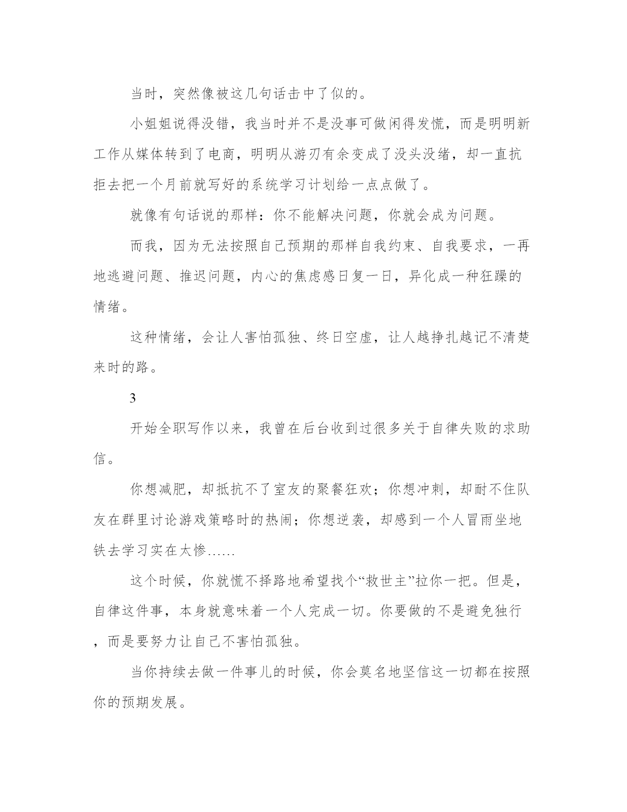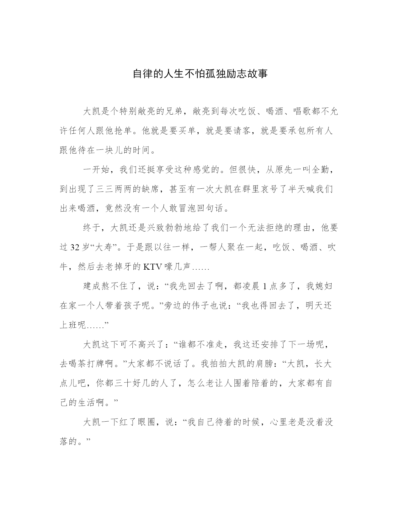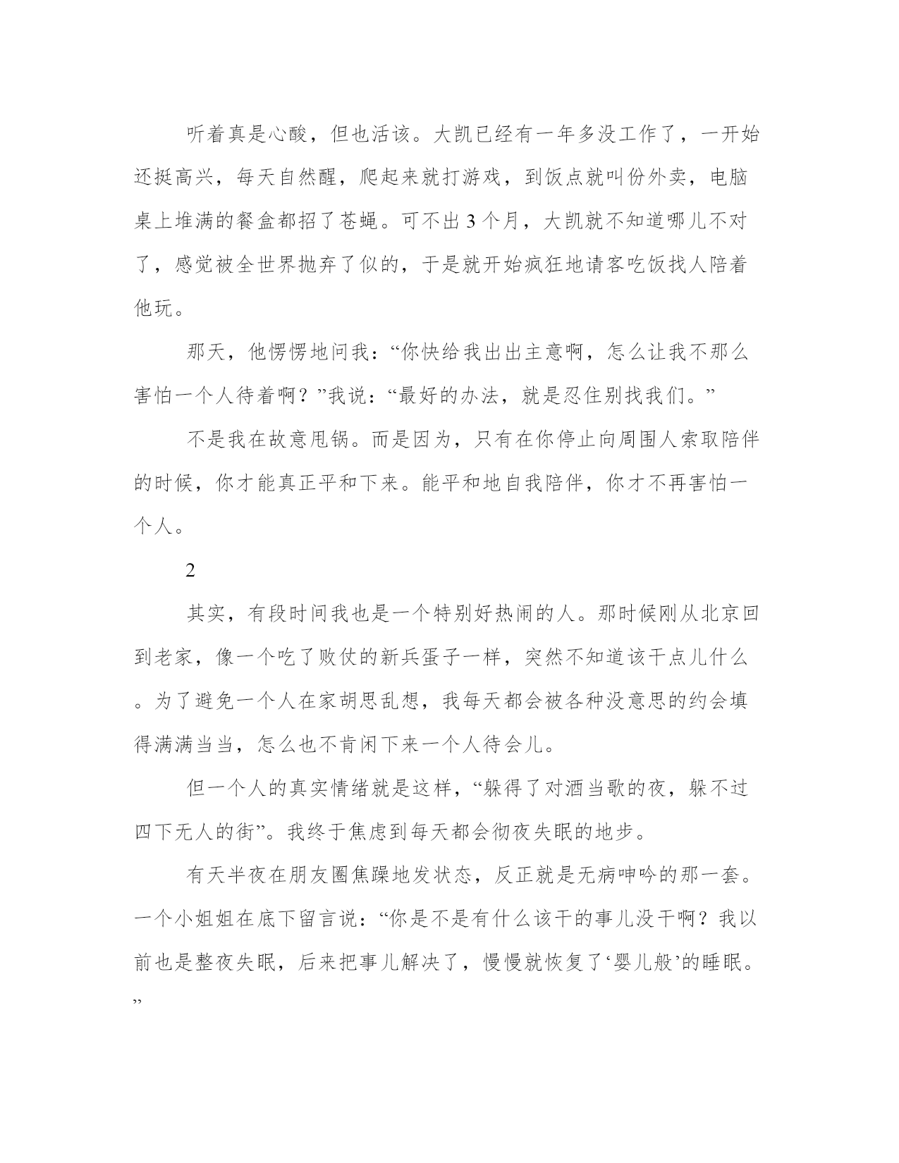自律的人生不怕孤独励志故事大凯是个特别敞亮的兄弟,敞亮到每次吃饭、喝酒、唱歌都不允许任何人跟他抢单。他就是要买单,就是要请客,就是要承包所有人跟他待在一块儿的时间。一开始,我们还挺享受这种感觉的。但很快,从原先一叫全勤,到出现了三三两两的缺席,甚至有一次大凯在群里哀号了半天喊我们出来喝酒,竟然没有一个人敢冒泡回句话。终于,大凯还是兴致勃勃地给了我们一个无法拒绝的理由,他要过32岁“大寿”。于是跟以往一样,一帮人聚在一起,吃饭、喝酒、吹牛,然后去老掉牙的KTV嚎几声……建成熬不住了,说:“我先回去了啊,都凌晨1点多了,我媳妇在家一个人带着孩子呢。”旁边的伟子也说:“我也得回去了,明天还上班呢……”大凯这下可不高兴了:“谁都不准走,我这还安排了下一场呢,去喝茶打牌啊。”大家都不说话了。我拍拍大凯的肩膀:“大凯,长大点儿吧,你都三十好几的人了,怎么老让人围着陪着的,大家都有自己的生活啊。”大凯一下红了眼圈,说:“我自己待着的时候,心里老是没着没落的。”听着真是心酸,但也活该。大凯已经有一年多没工作了,一开始还挺高兴,每天自然醒,爬起来就打游戏,到饭点就叫份外卖,电脑桌上堆满的餐盒都招了苍蝇。可不出3个月,大凯就不知道哪儿不对了,感觉被全世界抛弃了似的,于是就开始疯狂地请客吃饭找人陪着他玩。那天,他愣愣地问我:“你快给我出出主意啊,怎么让我不那么害怕一个人待着啊?”我说:“最好的办法,就是忍住别找我们。”不是我在故意甩锅。而是因为,只有在你停止向周围人索取陪伴的时候,你才能真正平和下来。能平和地自我陪伴,你才不再害怕一个人。2其实,有段时间我也是一个特别好热闹的人。那时候刚从北京回到老家,像一个吃了败仗的新兵蛋子一样,突然不知道该干点儿什么。为了避免一个人在家胡思乱想,我每天都会被各种没意思的约会填得满满当当,怎么也不肯闲下来一个人待会儿。但一个人的真实情绪就是这样,“躲得了对酒当歌的夜,躲不过四下无人的街”。我终于焦虑到每天都会彻夜失眠的地步。有天半夜在朋友圈焦躁地发状态,反正就是无病呻吟的那一套。一个小姐姐在底下留言说:“你是不是有什么该干的事儿没干啊?我以前也是整夜失眠,后来把事儿解决了,慢慢就恢复了‘婴儿般’的睡眠。”当时,突然像被这几句话击中了似的。小姐姐说得没错,我当时并不是没事可做闲得发慌,而是明明新工作从媒体转到了电商,明明从游刃有余变成了没头没绪,却一直抗拒去把一个月前就写好的系统学习计划给一点点做了。就像有句话说的那样:你不能解决问题,你就会成为问题。而我,因为无法按照自己预期的那样自我约束、自我要求,一再地逃避问题、推迟问题,内心的焦虑感日复一日,异化成一种狂躁的情绪。这种情绪,会让人害怕孤独、终日空虚,让人越挣扎越记不清楚来时的路。3开始全职写作以来,我曾在后台收到过很多关于自律失败的求助信。你想减肥,却抵抗不了室友的聚餐狂欢;你想冲刺,却耐不住队友在群里讨论游戏策略时的热闹;你想逆袭,却感到一个人冒雨坐地铁去学习实在太惨……这个时候,你就慌不择路地希望找个“救世主”拉你一把。但是,自律这件事,本身就意味着一个人完成一切。你要做的不是避免独行,而是要努力让自己不害怕孤独。当你持续去做一件事儿的时候,你会莫名地坚信这一切都在按照你的预期发展。只有保持让自己日复一日地处于一种正向积累的良性状态里,你才会真正体会到一种不再害怕孤独的满足感。所谓,浅水喧闹,深潭无波。最终,那些能够沉下心来、坚持自律的人,才能在一个人待着的时候,心里却是满的。这个时候,当然也就无所谓孤独了。