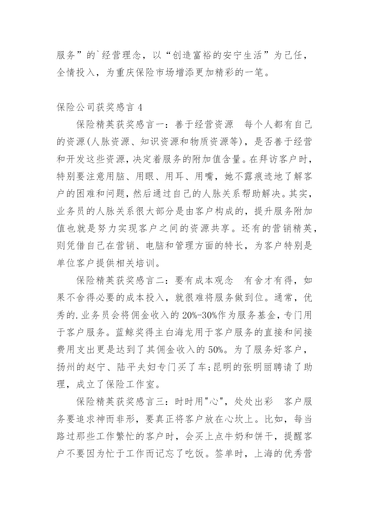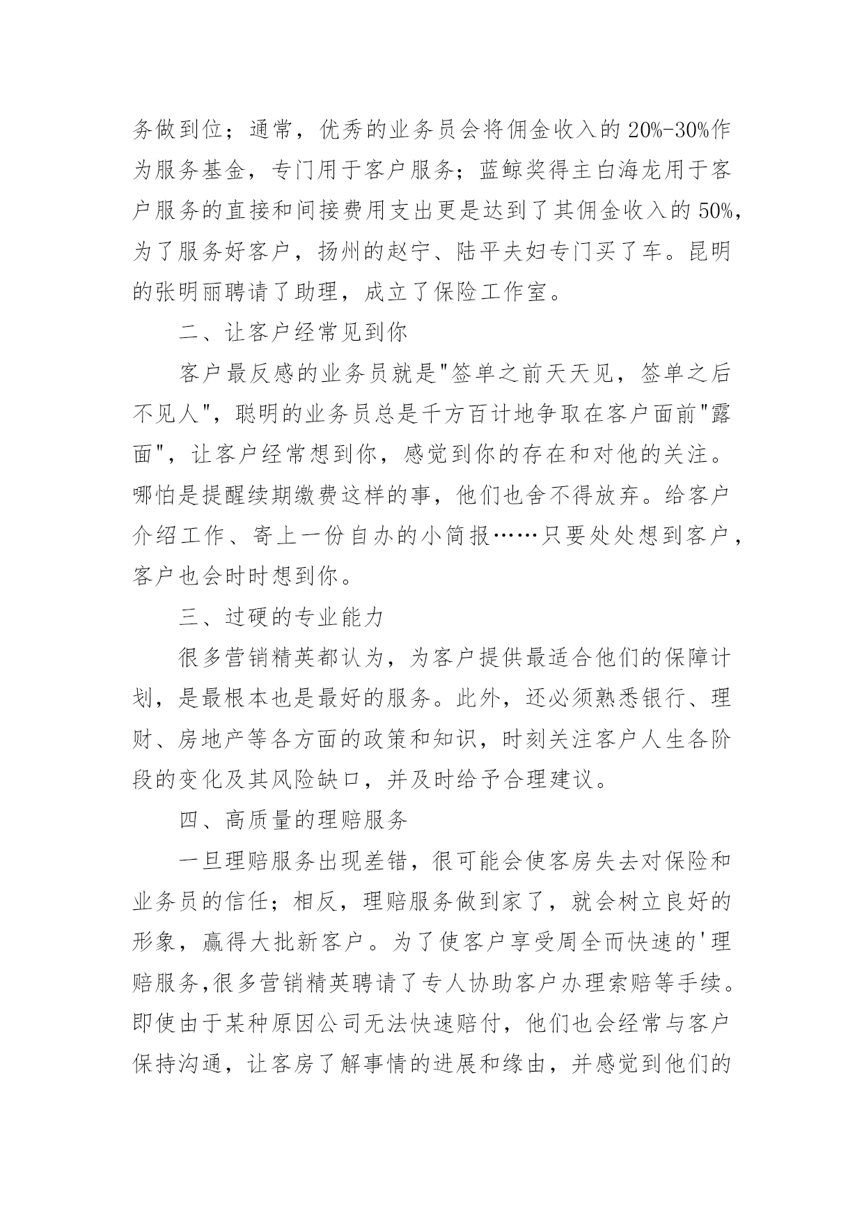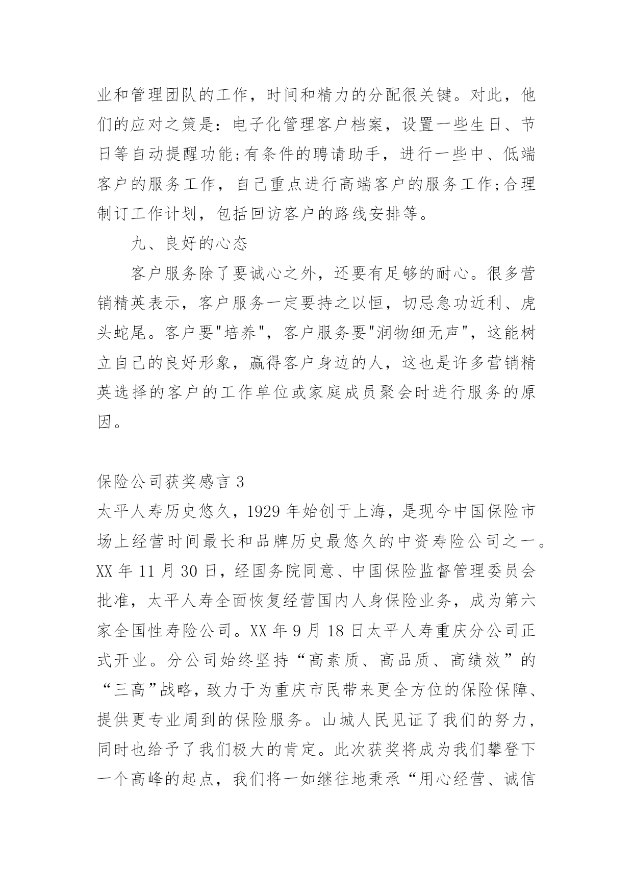 保险公司获奖感言在生活、工作和学习中,我们常常会因为所接触的人和事而备受启迪,这时可用写感言的方式将其记录下来。那么感言该怎么写?想必这让大家都很苦恼吧,下面是小编收集整理的保险公司获奖感言,欢迎大家借鉴与参考,希望对大家有所帮助。保险公司获奖感言1尊敬的各位领导、各位同仁:大家好!今天,我作为人寿保险20xx年度获奖代表在这里发言,和大家一起分享工作的喜悦和体会,感到十分的激动。在20xx年,我在工作中取得了一定的成绩,这得益于在座的各位领导我的关心和培养;得益于各位同仁的.支持与帮助,更得益于人寿优秀的团队氛围和企业文化。作为个体,我只是大海中的一滴水,我能扬波起浪,完全是因为有大海的深邃和广阔;离开了大海,这一滴水很快就会蒸发;所以凝聚才能产生力量,团结才能够诞生兴旺。作为一名来自人寿营销一线的员工,承蒙领导的器重和厚爱,评选我为全市的营销能手和标兵,我心中充满了自豪与感激。保险公司获奖感言2一、要有成本观念有舍才有得,如果不舍得必要的成本投入,就很难将服务做到位;通常,优秀的业务员会将佣金收入的20%-30%作为服务基金,专门用于客户服务;蓝鲸奖得主白海龙用于客户服务的直接和间接费用支出更是达到了其佣金收入的50%,为了服务好客户,扬州的赵宁、陆平夫妇专门买了车。昆明的张明丽聘请了助理,成立了保险工作室。二、让客户经常见到你客户最反感的业务员就是"签单之前天天见,签单之后不见人",聪明的业务员总是千方百计地争取在客户面前"露面",让客户经常想到你,感觉到你的存在和对他的关注。哪怕是提醒续期缴费这样的事,他们也舍不得放弃。给客户介绍工作、寄上一份自办的小简报……只要处处想到客户,客户也会时时想到你。三、过硬的专业能力很多营销精英都认为,为客户提供最适合他们的保障计划,是最根本也是最好的服务。此外,还必须熟悉银行、理财、房地产等各方面的政策和知识,时刻关注客户人生各阶段的变化及其风险缺口,并及时给予合理建议。四、高质量的理赔服务一旦理赔服务出现差错,很可能会使客房失去对保险和业务员的信任;相反,理赔服务做到家了,就会树立良好的形象,赢得大批新客户。为了使客户享受周全而快速的'理赔服务,很多营销精英聘请了专人协助客户办理索赔等手续。即使由于某种原因公司无法快速赔付,他们也会经常与客户保持沟通,让客房了解事情的进展和缘由,并感觉到他们的努力。五、善于经营资源每个人都有自己的资源(人脉资源、知识资源和物质资源等),是否善于经营和开发这些资源,决定着服务的附加值含量。在拜访客户时,特别要注意用脑、用眼、用耳、用嘴,她不露痕迹地了解客户的困难和问题,然后通过自己的人脉关系帮助解决。其实,业务员的人脉关系很大部分是由客户构成的,提升服务附加值也就是努力实现客户之间的资源共享。还有的营销精英,则凭借自己在营销、电脑和管理方面的特长,为客户特别是单位客户提供相关培训。六、不断创新有的业务员一谈起客户服务就是请客送礼。千万不要刻意地去请客、送礼否则客户会置疑你的文化素养,甚至想:"羊毛出在羊身上,你送得越多,一定从我这儿赚得越多。"客户服务虽然需要成本支出,却不能用"钱"加以衡量和堆砌。关键是因人而异,不断创新。七、时时用"心",处处出彩客户服务要追求神而非形,要真正将客户放在心坎上。比如,每当路过那些工作繁忙的客户时,会买上点牛奶和饼干,提醒客户不要因为忙于工作而记忘了吃饭。签单时,上海的优秀营销员顾佩华发现客户的签名不漂亮,就请人为客户设计了签名,客户的意外和惊喜难以言表。八、合理分配时间和精力服务高手的客户数量一般在几百到几千之间,再加上展业和管理团队的工作,时间和精力的分配很关键。对此,他们的应对之策是:电子化管理客户档案,设置一些生日、节日等自动提醒功能;有条件的聘请助手,进行一些中、低端客户的服务工作,自己重点进行高端客户的服务工作;合理制订工作计划,包括回访客户的路线安排等。九、良好的心态客户服务除了要诚心之外,还要有足够的耐心。很多营销精英表示,客户服务一定要持之以恒,切忌急功近利、虎头蛇尾。客户要"培养",客户服务要"润物细无声",这能树立自己的良好形象,赢得客户身边的人,这也是许多营销精英选择的客户的工作单位或家庭成员聚会时进行服务的原因。保险公司获奖感言3太平人寿历史悠久,1929年始创于上海,是现今中国保险市场上经营时间最长和品牌历史最悠久的中资寿险公司之一。XX年11月30日,经国务院同意、中国保险监督管理委员会批准,太平人寿全面恢复经营国内人身保险业务,成为第六家全国性寿险公司。XX年9月18日太平人寿重庆分公司正式开业。分公司始终坚持“高素质、高品质、高绩效”的“三高”战略,致力于为重庆市民带来更全方位的保险保障、提供更专业周到的保险服务。山城人民见证了我们的努力,同时也给予了我们极大的肯定。此次获奖将成为