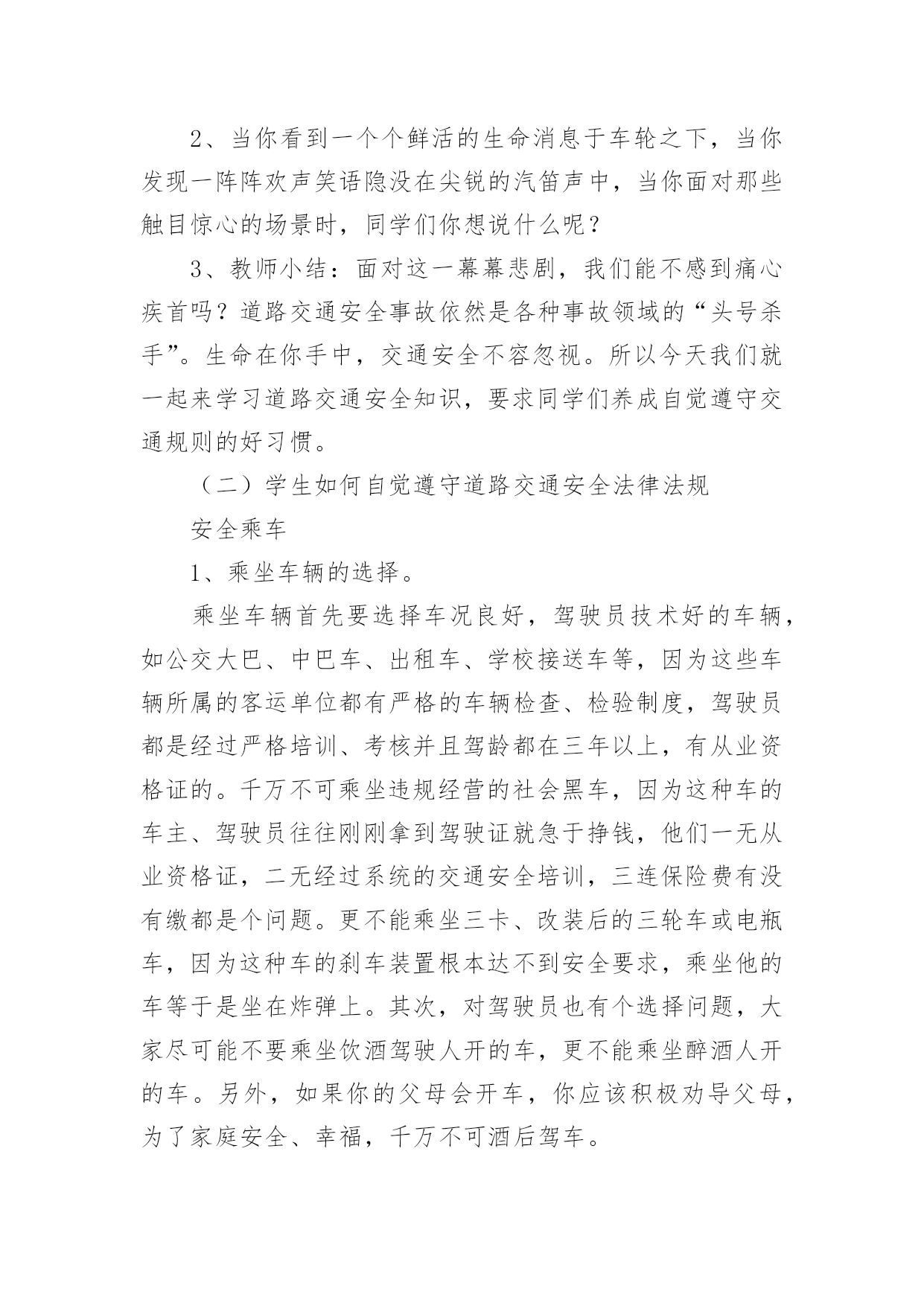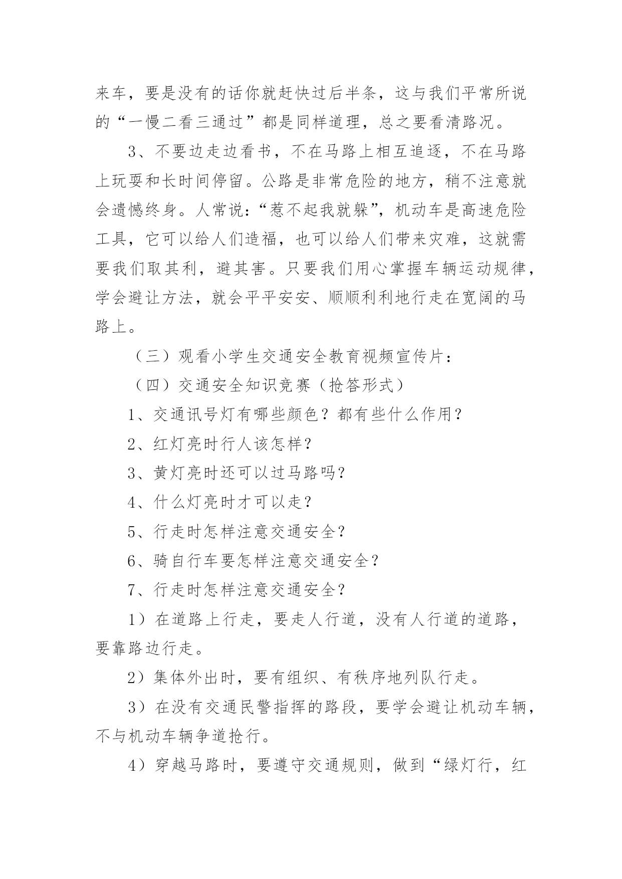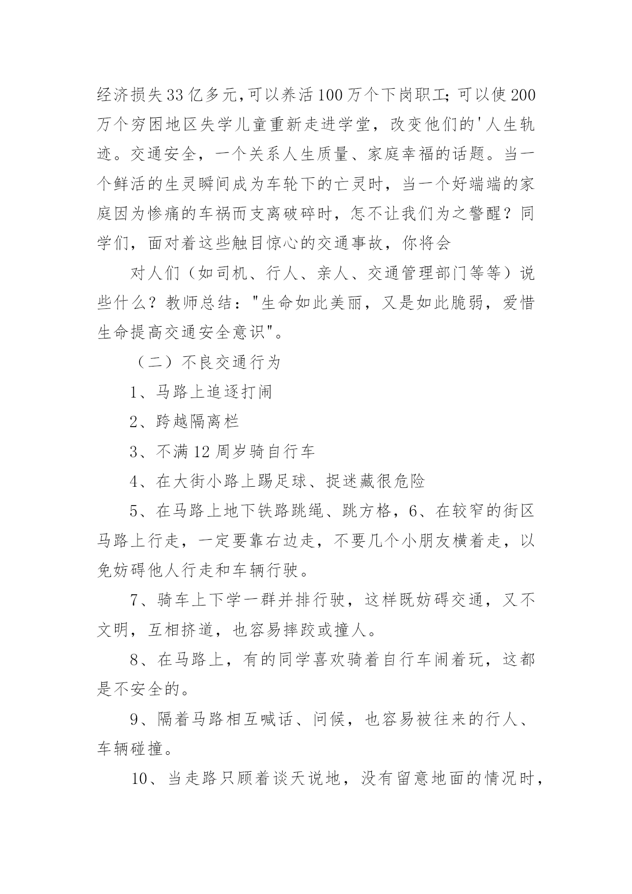 小学交通安全教育教案优秀作为一位优秀的人民教师,可能需要进行教案编写工作,教案是备课向课堂教学转化的关节点。优秀的教案都具备一些什么特点呢?下面是小编为大家收集的小学交通安全教育教案优秀,仅供参考,希望能够帮助到大家。小学交通安全教育教案优秀1一、活动目的:1、通过教师的讲、同学间的讨论等形式引起同学们对交通安全的重视。2、让学生进一步了解一些与他们生活密切相关的交通规则,懂得自觉遵守交通规则的重要性及不遵守交通规则所带来的危害性,明白为了自己和大家的安全,人人都必须遵守交通规则。3、形成人人学习、讲文明安全行知识的氛围,培养学生自我保护的意识和能力以及热爱生命的情感,为他们的健康成长打好基础。二、班会过程:(一)导入1、随着经济的日益发展,我们大地球母亲已变得越来越美丽,马路上车辆川流不息的景象随处可见。然而由于有些人交通安全意识的淡薄,在车水马龙的马路上演了一幕幕不可挽回的悲剧。2、当你看到一个个鲜活的生命消息于车轮之下,当你发现一阵阵欢声笑语隐没在尖锐的汽笛声中,当你面对那些触目惊心的场景时,同学们你想说什么呢?3、教师小结:面对这一幕幕悲剧,我们能不感到痛心疾首吗?道路交通安全事故依然是各种事故领域的“头号杀手”。生命在你手中,交通安全不容忽视。所以今天我们就一起来学习道路交通安全知识,要求同学们养成自觉遵守交通规则的好习惯。(二)学生如何自觉遵守道路交通安全法律法规安全乘车1、乘坐车辆的选择。乘坐车辆首先要选择车况良好,驾驶员技术好的车辆,如公交大巴、中巴车、出租车、学校接送车等,因为这些车辆所属的客运单位都有严格的车辆检查、检验制度,驾驶员都是经过严格培训、考核并且驾龄都在三年以上,有从业资格证的。千万不可乘坐违规经营的社会黑车,因为这种车的车主、驾驶员往往刚刚拿到驾驶证就急于挣钱,他们一无从业资格证,二无经过系统的交通安全培训,三连保险费有没有缴都是个问题。更不能乘坐三卡、改装后的三轮车或电瓶车,因为这种车的刹车装置根本达不到安全要求,乘坐他的车等于是坐在炸弹上。其次,对驾驶员也有个选择问题,大家尽可能不要乘坐饮酒驾驶人开的车,更不能乘坐醉酒人开的车。另外,如果你的父母会开车,你应该积极劝导父母,为了家庭安全、幸福,千万不可酒后驾车。2、乘车途中的安全。乘坐汽车后不要将头、手伸出窗外,以防车辆与车辆交会时发生危险。不要向车外抛洒物品和吐痰,不要在车辆行驶途中与驾驶员闲谈,不要在车上嬉笑打闹。在大人后面乘坐二轮摩托车时要戴好安全头盔,坐摩托车、电瓶车、自行车都要正向骑坐而不要侧坐,不要把脚往轮胎里面伸,以防跌落或轧伤。安全骑车1、骑自行车(包括电动自行车,下同)不能走机动车道。因为法律规定:“机动车、非机动车、行人实行分道通行”。你走机动车道违反法律,既然法律没有给你在机动车道内的通行权,你就不要在机动车道行驶,如果你硬要走机动车道,往往容易导致交通事故发生。2、骑自行车不要逆向行驶。因为法律规定:“机动车、非机动车实行右侧通行”。你逆向行驶的话,就可能与对面行驶车辆发生碰撞。3、骑自行车不要直穿十字路口。需要穿过十字路口,应该根据道路标线,按“右侧通行”原则从非机动车道内绕道而行。还有,驾驶自行车、电动自行车、三轮车横过机动车道应当下车推行,包括过人行横道线自行车也应该下车推行。4、骑自行车不要成群结队、揪肩搭背、嬉笑打闹、双手离把。自行车转弯时,尽可能伸出你的'左、右手,示意你要转弯的方向。因为现在道路上的机动车实在太多,加上部分驾驶员的超速行驶,我们已来不得半点疏忽和麻痹。特别是没有划分机动车道、非机动车道和人行道的道路上,机动车在道路中间通行,非机动车和行人应当在道路两侧通行,更要注意骑车安全。在现在的道路上,要保证骑车安全也不是一件容易的事情,请千万不可再做出成群结队、揪肩搭背、嬉笑打闹、双手离把的危险动作来,否则就有可能为自己的卤莽行为承担后果。5、经常对自己所骑车辆进行检查维修,确保车况良好。上学、放学骑车时注意检查车辆,重点检查车辆的制动、车铃是否完好,该修的修,该换的换,不要让不安全隐患留给自己。安全走路1、分道行走,自觉靠右。所谓右侧通行,是指在道路上行进方向的右侧通行。在城区或其他有人行横道线的地方,横过道路一定要走在人行横道线内,因为这是法律赋予行人绝对通行权的地方,一定要充分利用,并按照红灯停、绿灯行的规则通行。如有车辆要强行闯向人行横道线时,你可伸出左、右手示意它减速慢行,千万不可犹豫不决。2、不盲目横穿。横过公路其实是一件很危险的事情,许多汽车与行人发生的碰撞事故,极大多数是在行人横穿公路时发生的。我们知道,汽车不是说停就停得下来的,所以我们可要特别小心。我们可以学习借鉴香港人的走法,采取“先望左、后望右”的办法,即:到达公路边先看看左面有没有来车,要是没有的话你先过前半条;再看看