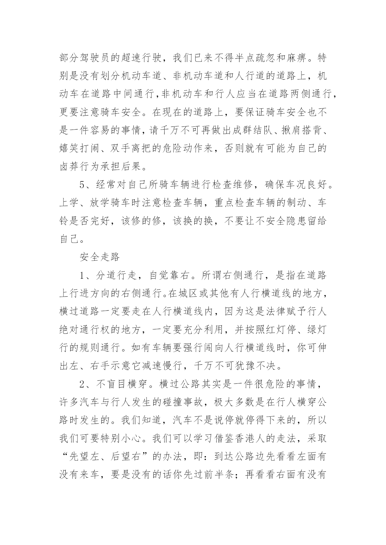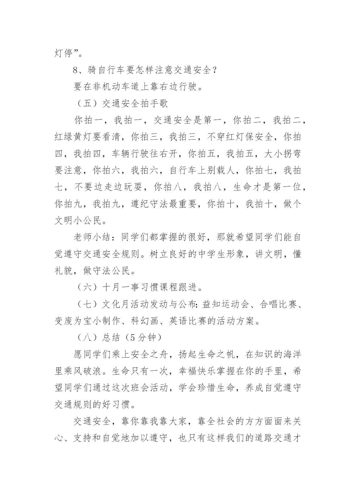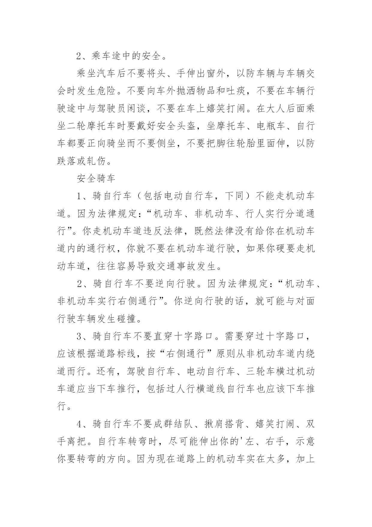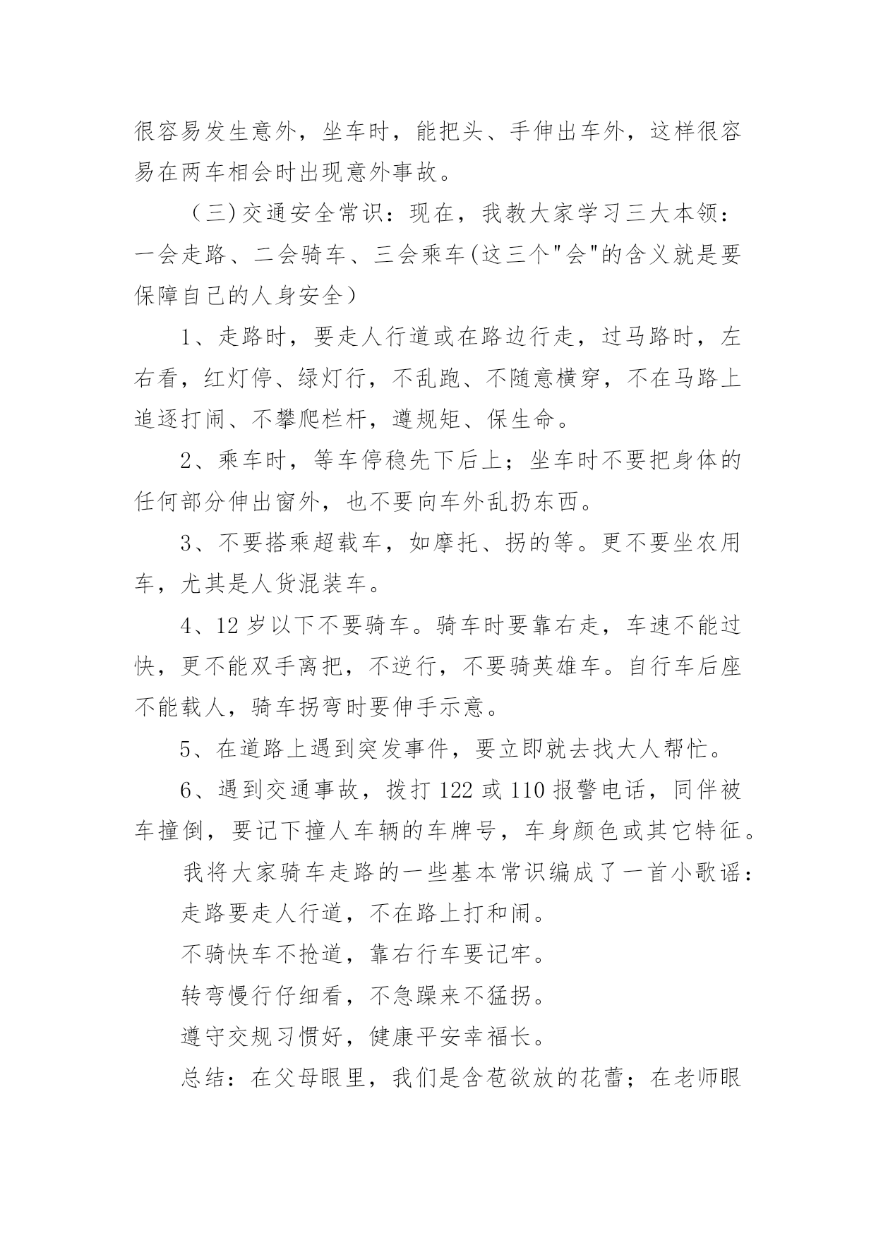 小学交通安全教育教案优秀作为一位优秀的人民教师,可能需要进行教案编写工作,教案是备课向课堂教学转化的关节点。优秀的教案都具备一些什么特点呢?下面是小编为大家收集的小学交通安全教育教案优秀,仅供参考,希望能够帮助到大家。小学交通安全教育教案优秀1一、活动目的:1、通过教师的讲、同学间的讨论等形式引起同学们对交通安全的重视。2、让学生进一步了解一些与他们生活密切相关的交通规则,懂得自觉遵守交通规则的重要性及不遵守交通规则所带来的危害性,明白为了自己和大家的安全,人人都必须遵守交通规则。3、形成人人学习、讲文明安全行知识的氛围,培养学生自我保护的意识和能力以及热爱生命的情感,为他们的健康成长打好基础。二、班会过程:(一)导入1、随着经济的日益发展,我们大地球母亲已变得越来越美丽,马路上车辆川流不息的景象随处可见。然而由于有些人交通安全意识的淡薄,在车水马龙的马路上演了一幕幕不可挽回的悲剧。2、当你看到一个个鲜活的生命消息于车轮之下,当你发现一阵阵欢声笑语隐没在尖锐的汽笛声中,当你面对那些触目惊心的场景时,同学们你想说什么呢?3、教师小结:面对这一幕幕悲剧,我们能不感到痛心疾首吗?道路交通安全事故依然是各种事故领域的“头号杀手”。生命在你手中,交通安全不容忽视。所以今天我们就一起来学习道路交通安全知识,要求同学们养成自觉遵守交通规则的好习惯。(二)学生如何自觉遵守道路交通安全法律法规安全乘车1、乘坐车辆的选择。乘坐车辆首先要选择车况良好,驾驶员技术好的车辆,如公交大巴、中巴车、出租车、学校接送车等,因为这些车辆所属的客运单位都有严格的车辆检查、检验制度,驾驶员都是经过严格培训、考核并且驾龄都在三年以上,有从业资格证的。千万不可乘坐违规经营的社会黑车,因为这种车的车主、驾驶员往往刚刚拿到驾驶证就急于挣钱,他们一无从业资格证,二无经过系统的交通安全培训,三连保险费有没有缴都是个问题。更不能乘坐三卡、改装后的三轮车或电瓶车,因为这种车的刹车装置根本达不到安全要求,乘坐他的车等于是坐在炸弹上。其次,对驾驶员也有个选择问题,大家尽可能不要乘坐饮酒驾驶人开的车,更不能乘坐醉酒人开的车。另外,如果你的父母会开车,你应该积极劝导父母,为了家庭安全、幸福,千万不可酒后驾车。2、乘车途中的安全。乘坐汽车后不要将头、手伸出窗外,以防车辆与车辆交会时发生危险。不要向车外抛洒物品和吐痰,不要在车辆行驶途中与驾驶员闲谈,不要在车上嬉笑打闹。在大人后面乘坐二轮摩托车时要戴好安全头盔,坐摩托车、电瓶车、自行车都要正向骑坐而不要侧坐,不要把脚往轮胎里面伸,以防跌落或轧伤。安全骑车1、骑自行车(包括电动自行车,下同)不能走机动车道。因为法律规定:“机动车、非机动车、行人实行分道通行”。你走机动车道违反法律,既然法律没有给你在机动车道内的通行权,你就不要在机动车道行驶,如果你硬要走机动车道,往往容易导致交通事故发生。2、骑自行车不要逆向行驶。因为法律规定:“机动车、非机动车实行右侧通行”。你逆向行驶的话,就可能与对面行驶车辆发生碰撞。3、骑自行车不要直穿十字路口。需要穿过十字路口,应该根据道路标线,按“右侧通行”原则从非机动车道内绕道而行。还有,驾驶自行车、电动自行车、三轮车横过机动车道应当下车推行,包括过人行横道线自行车也应该下车推行。4、骑自行车不要成群结队、揪肩搭背、嬉笑打闹、双手离把。自行车转弯时,尽可能伸出你的'左、右手,示意你要转弯的方向。因为现在道路上的机动车实在太多,加上部分驾驶员的超速行驶,我们已来不得半点疏忽和麻痹。特别是没有划分机动车道、非机动车道和人行道的道路上,机动车在道路中间通行,非机动车和行人应当在道路两侧通行,更要注意骑车安全。在现在的道路上,要保证骑车安全也不是一件容易的事情,请千万不可再做出成群结队、揪肩搭背、嬉笑打闹、双手离把的危险动作来,否则就有可能为自己的卤莽行为承担后果。5、经常对自己所骑车辆进行检查维修,确保车况良好。上学、放学骑车时注意检查车辆,重点检查车辆的制动、车铃是否完好,该修的修,该换的换,不要让不安全隐患留给自己。安全走路1、分道行走,自觉靠右。所谓右侧通行,是指在道路上行进方向的右侧通行。在城区或其他有人行横道线的地方,横过道路一定要走在人行横道线内,因为这是法律赋予行人绝对通行权的地方,一定要充分利用,并按照红灯停、绿灯行的规则通行。如有车辆要强行闯向人行横道线时,你可伸出左、右手示意它减速慢行,千万不可犹豫不决。2、不盲目横穿。横过公路其实是一件很危险的事情,许多汽车与行人发生的碰撞事故,极大多数是在行人横穿公路时发生的。我们知道,汽车不是说停就停得下来的,所以我们可要特别小心。我们可以学习借鉴香港人的走法,采取“先望左、后望右”的办法,即:到达公路边先看看左面有没有来车,要是没有的话你先过前半条;再看看