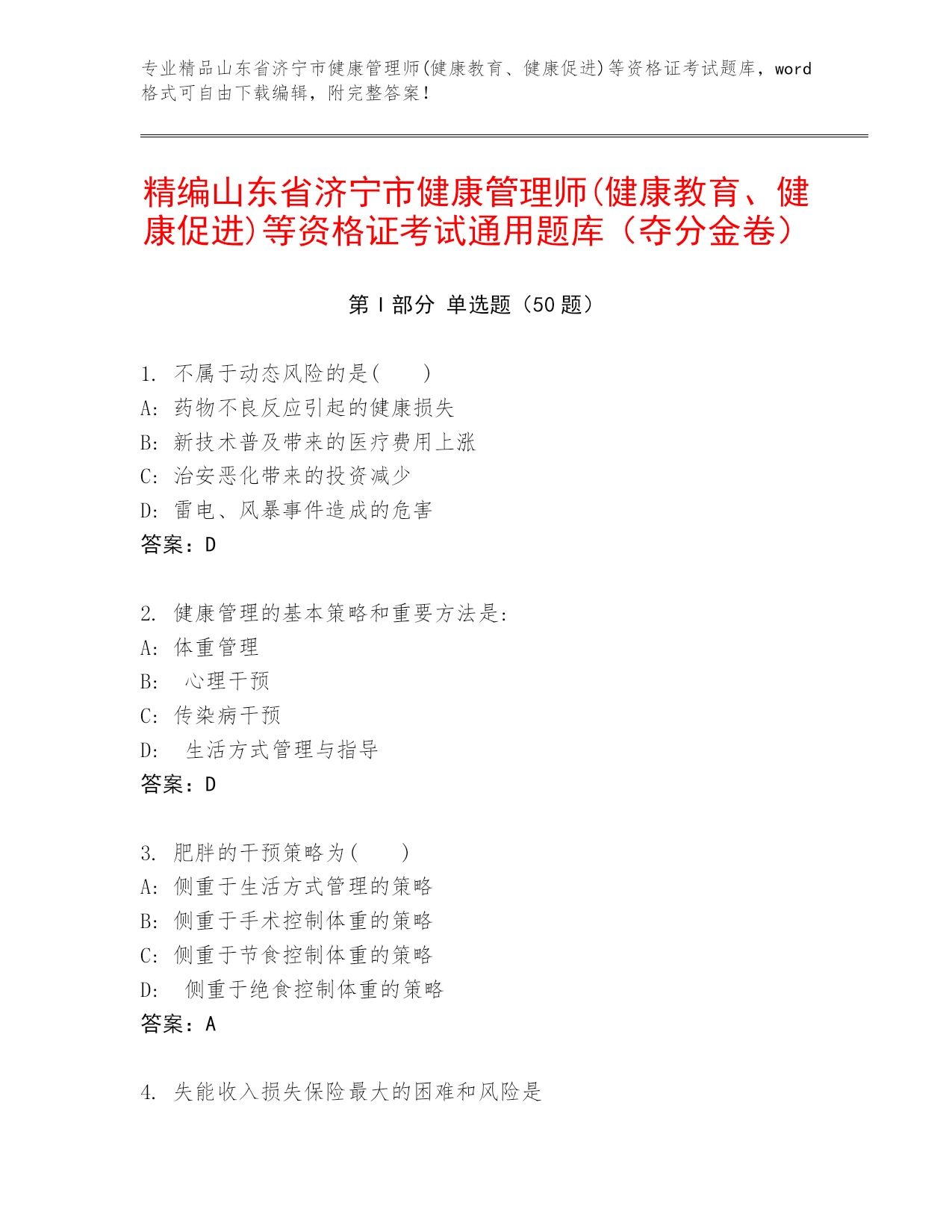 精编山东省济宁市健康管理师(健康教育、健康促进)等资格证考试通用题库(夺分金卷).docx