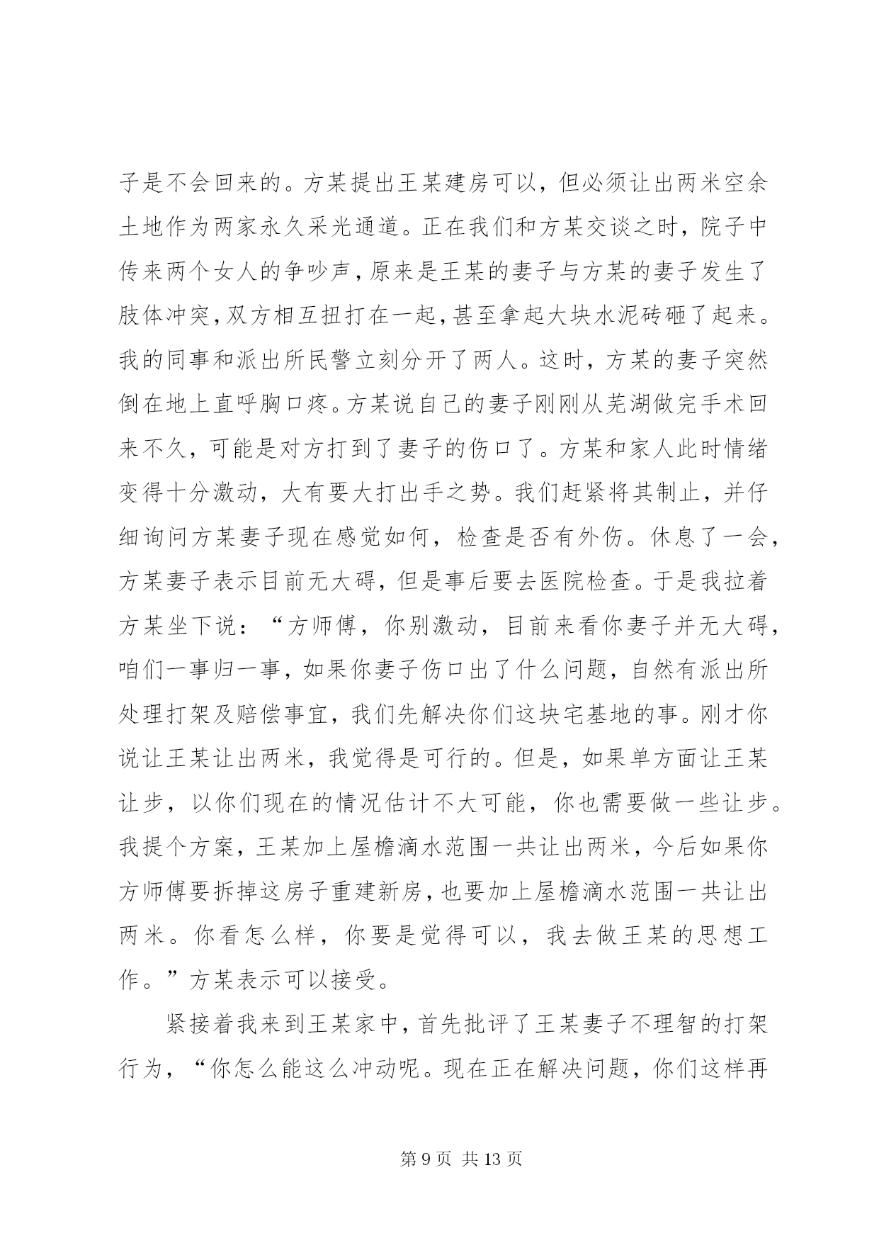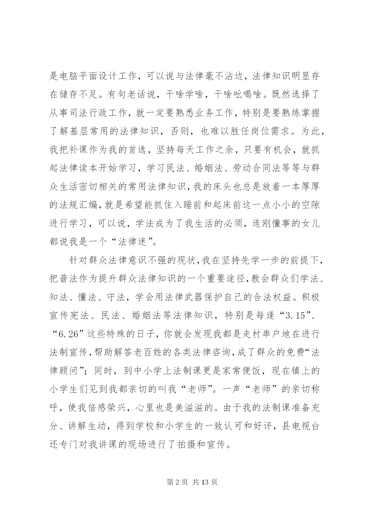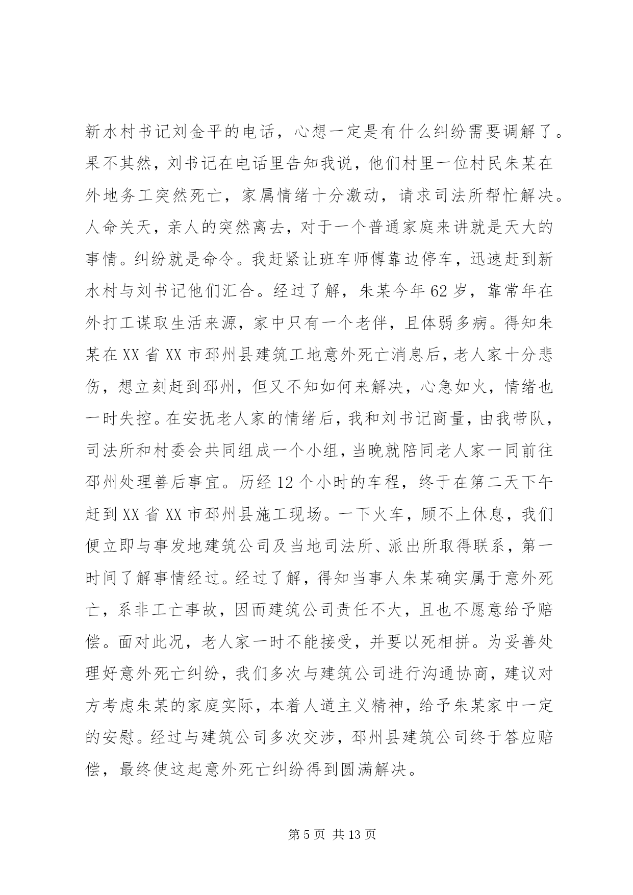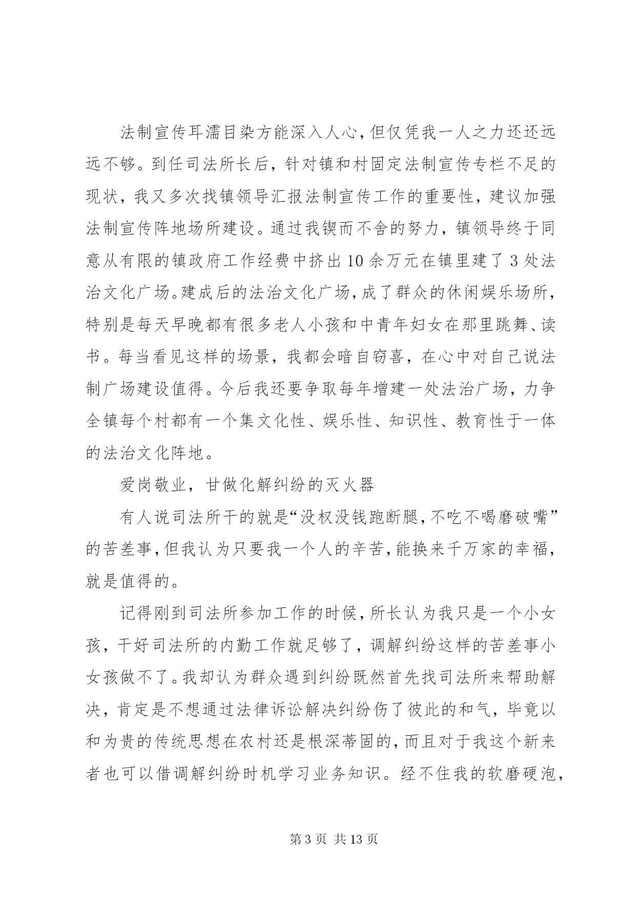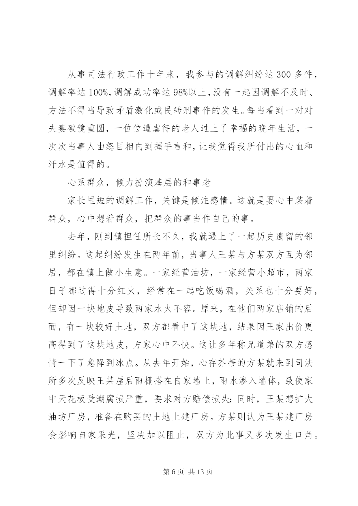 第PAGE\*Arabic\*MERGEFORMAT13页共NUMPAGES\*MERGEFORMAT13页县司法所所长先进事迹材料我叫,现XX县区司法局司法所所长。初听到我的名字,我相信在做的很多同志可能认为我是一名男同志。然而,我却是地道的女汉子。我人如其名,只要你跟我相处一会,你就会发现我的性格也跟我的名字一样,泼辣果断,同时带有一点坚强执着的韧性。我担任司法所长虽然才一年多时间,但我从事基层司法行政工作已经十年了。十年的基层调解生涯,十年的酸甜苦辣,虽苦尤甘,唯有身临其境,方能品味其中甘甜。因此,今天我给大家汇报的题目是《躬身基层,倾心调解化民忧》。学法普法,当好法律知识的播种机大家都知道,在基层工作,特别是在基层司法所工作,面对的一项重要工作任务就是调解矛盾纠纷。这可以说是我们基层司法所的一项主打业务,也是我们在基层党委政府和人民群众中展示职能、树立形象的重要载体和抓手。同时,多年的调解工作,也使我感受到,基层矛盾纠纷为什么总是调不完,为什么总是不断地发生,其中一个重要的原因,就是基层群众不学法、不懂法、法律意识淡薄是导致民间纠纷不断的主要原因之一。为此,我认为必须首先要培养增加基层群众法律素养,只有提升他们的法律素质,才能从源头上预防和减少矛盾纠纷的发生和发展。作为我本人来说,虽然是毕业于省警官职业学院法律专业,也算是科班出生,但我在从事司法行政系统工作之前一直从事的是电脑平面设计工作,可以说与法律毫不沾边,法律知识明显存在储存不足。有句老话说,干啥学啥,干啥吆喝啥。既然选择了从事司法行政工作,就一定要熟悉业务工作,特别是要熟练掌握了解基层常用的法律知识,否则,也难以胜任岗位需求。为此,我把补课作为我的首选,坚持每天工作之余,只要有机会,就抓起法律读本开始学习,学习民法、婚姻法、劳动合同法等等与群众生活密切相关的常用法律知识,我的床头也总是放着一本厚厚的法规汇编,就是希望能抓住入睡前和起床前这一点小小的空隙进行学习,可以说,学法成为了我生活的必须,连刚懂事的女儿都说我是一个“法律迷”。针对群众法律意识不强的现状,我在坚持先学一步的前提下,把普法作为提升群众法律知识的一个重要途径,教会群众们学法、知法、懂法、守法,学会用法律武器保护自己的合法权益。积极宣传宪法、民法、婚姻法等法律知识,特别是每逢“3.15”、“6.26”这些特殊的日子,你就会发现我都是走村串户地在进行法制宣传,帮助解答老百姓的各类法律咨询,成了群众的免费“法律顾问”;同时,到中小学上法制课更是家常便饭,现在镇上的小学生们见到我都亲切的叫我“老师”。一声“老师”的亲切称呼,使我倍感荣兴,心里也是美滋滋的。由于我的法制课准备充分、讲解生动,得到学校和小学生的一致认可和好评,县电视台还专门对我讲课的现场进行了拍摄和宣传。法制宣传耳濡目染方能深入人心,但仅凭我一人之力还还远远不够。到任司法所长后,针对镇和村固定法制宣传专栏不足的现状,我又多次找镇领导汇报法制宣传工作的重要性,建议加强法制宣传阵地场所建设。通过我锲而不舍的努力,镇领导终于同意从有限的镇政府工作经费中挤出10余万元在镇里建了3处法治文化广场。建成后的法治文化广场,成了群众的休闲娱乐场所,特别是每天早晚都有很多老人小孩和中青年妇女在那里跳舞、读书。每当看见这样的场景,我都会暗自窃喜,在心中对自己说法制广场建设值得。今后我还要争取每年增建一处法治广场,力争全镇每个村都有一个集文化性、娱乐性、知识性、教育性于一体的法治文化阵地。爱岗敬业,甘做化解纠纷的灭火器有人说司法所干的就是“没权没钱跑断腿,不吃不喝磨破嘴”的苦差事,但我认为只要我一个人的辛苦,能换来千万家的幸福,就是值得的。记得刚到司法所参加工作的时候,所长认为我只是一个小女孩,干好司法所的内勤工作就足够了,调解纠纷这样的苦差事小女孩做不了。我却认为群众遇到纠纷既然首先找司法所来帮助解决,肯定是不想通过法律诉讼解决纠纷伤了彼此的和气,毕竟以和为贵的传统思想在农村还是根深蒂固的,而且对于我这个新来者也可以借调解纠纷时机学习业务知识。经不住我的软磨硬泡,所长终于答应让我参与所有的纠纷调解工作。其实,那时我并不懂调解工作,我认为只要有热情就行了。可是第一次参加调解就受到的莫大的“委屈”,当时的调解场景至今还历历在目。那是一起邻里纠纷,一方当事人李某平时就非常的蛮横,邻居关系长期不和。邻居建房需要粉刷,搭建的脚手架需要临时占用他李某家的宅基地,正在搭建时却遭到李某的竭力反对和阻碍。我和所长赶到现场的时候,双方还在激烈的争吵,眼看就要动手打起来时,我本能的上前去制止,想将他们双方拉开。当时没有多想,我就直接去拉李某,可是李某却一把把我推倒在地,对我破口大骂,质问我算哪根葱,凭什么拉他。认为我是明显地帮助对方,让对方好动手打他。听到