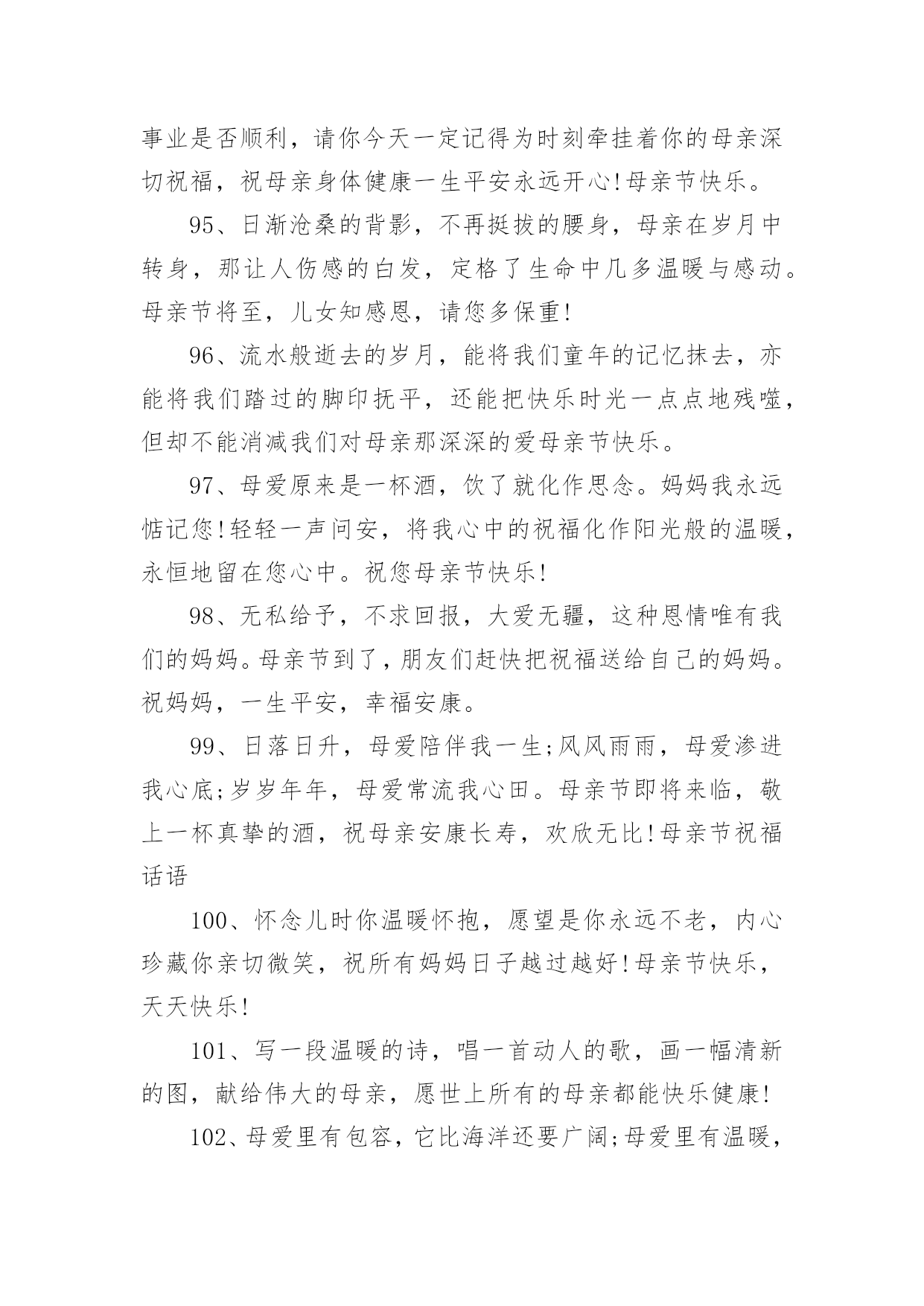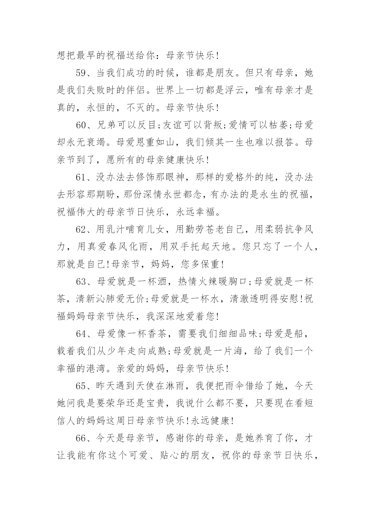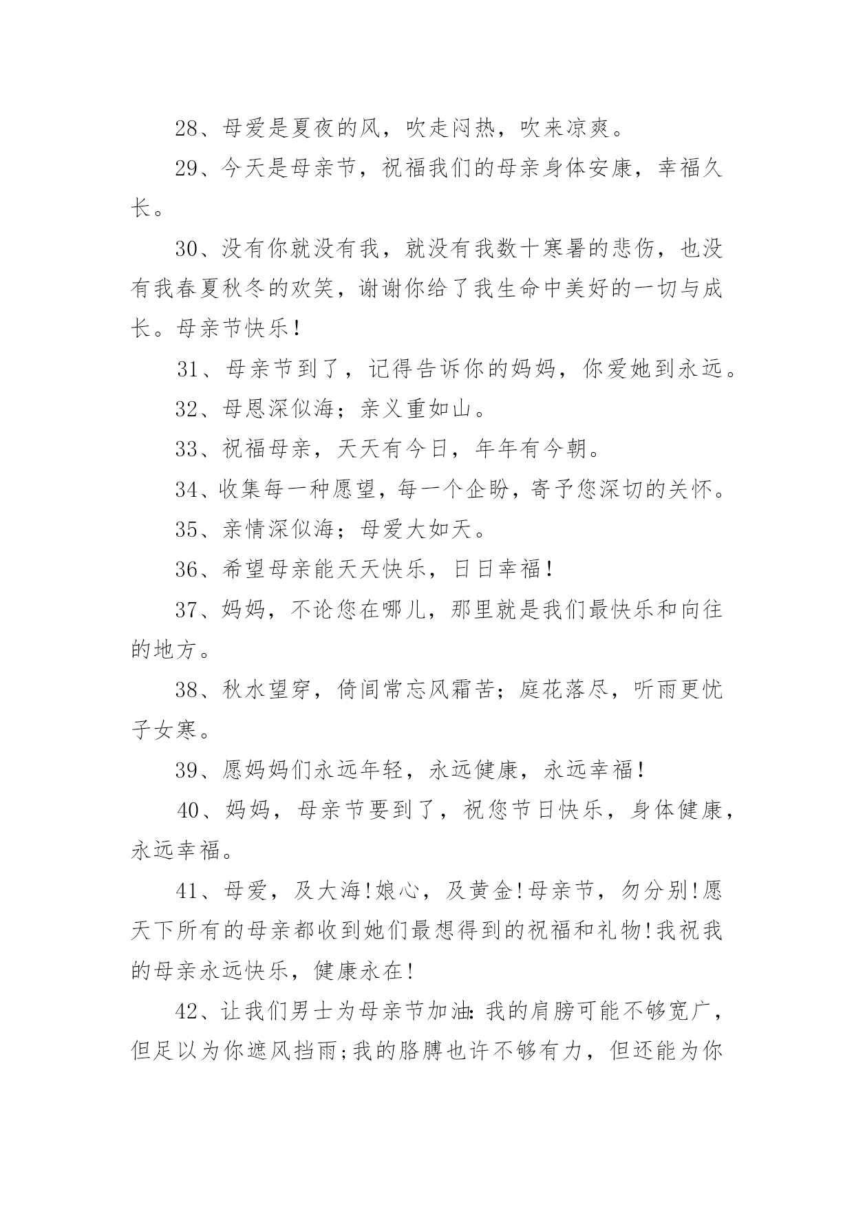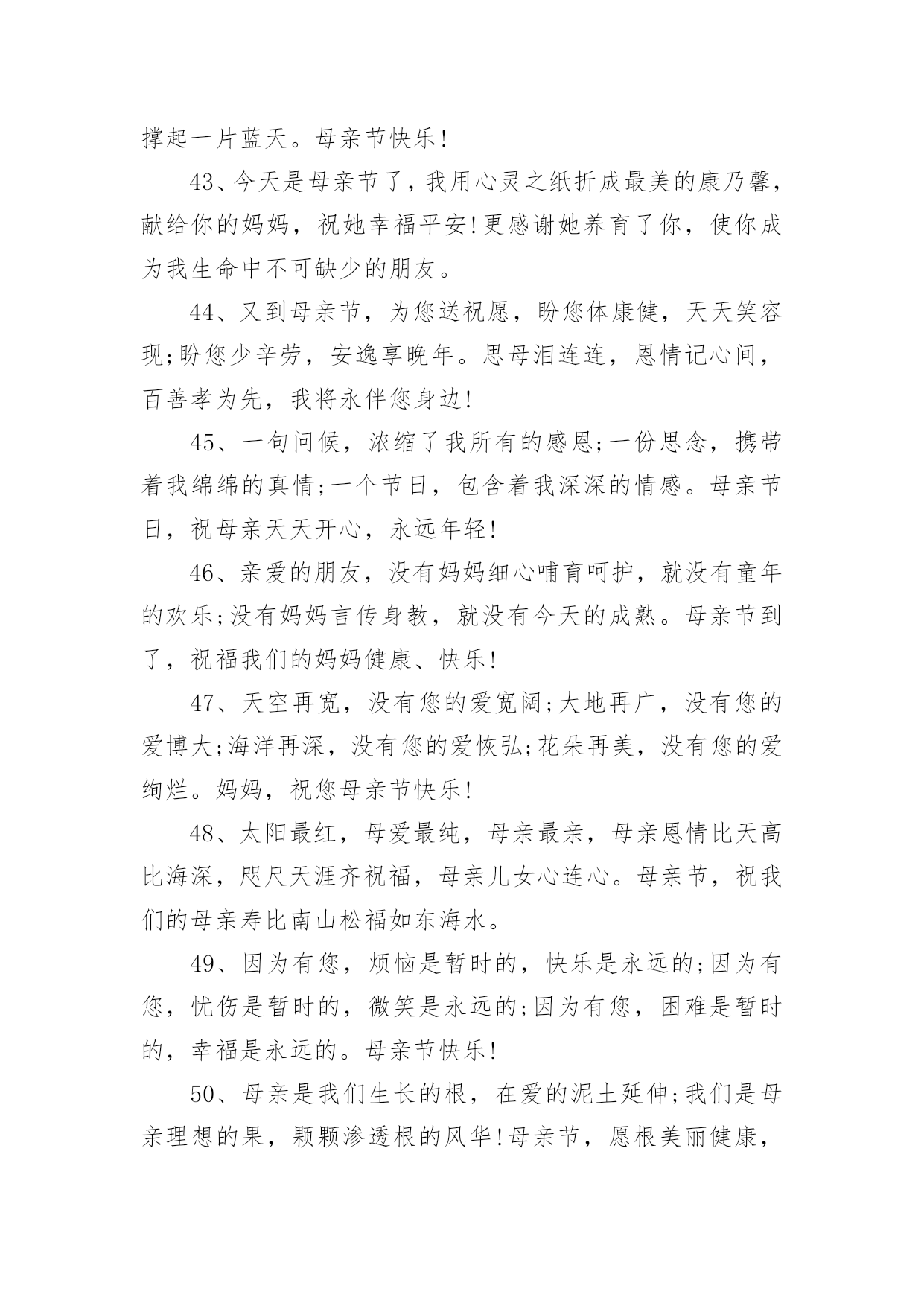 母亲节催泪文案母亲节催泪文案240句随着社交网络的普及,大家都不可避免地会接触到文案吧,借助文案可以达到宣传文化的目的。那什么样的文案才具有启发意义呢?以下是小编帮大家整理的母亲节催泪文案,欢迎阅读与收藏。1、母亲节,愿亲爱的妈妈健康长寿,四季平安。2、永远健康,年轻美丽,快乐幸福,顺心如意,母亲节快乐!3、妈妈,今天是你的节日,祝你每天都开开心心、健健康康!4、母爱无私天下广;亲情有暖世间新。5、妈妈,这世上永远那么温柔的,只有您。感谢您,妈妈!6、母亲节,用心祝福母亲节日快乐,健康长伴。7、妈妈我感谢你赐给了我生命,是您教会了我做人的道理,无论将来怎么样,我永远爱您!8、祝您长寿安康!开心幸福!9、你获得成功的时候,众人都会拥抱你,赞美你;你失败沮丧的时候,只有妈妈安慰你,鼓励你,祝天下所有的母亲永远幸福,母亲节快乐。10、妈妈,我是您的牵挂,您是我的惦念!母亲节快乐!11、温暖您慈爱的心灵,愿您幸福!12、眷恋如无边的海洋,一次又一次起伏的浪,想起您,多好!13、母亲节到,祝您万事顺利,吉祥如意,节日快乐。14、在这个属于您的节日里,祝您母亲节快乐!15、母亲节,感谢您,我的妈妈,祝您幸福安康!16、送给妈妈一朵长寿花,愿妈妈永远没病没灾,健健康康一辈子。17、如果我学得了一丝一毫的好脾气,如果我学得了一点点待人接物的和气,如果我宽恕人,体谅人我都得感谢我的慈母。18、母亲节到了,祝亲爱的妈妈节日快乐,健康平安。19、为您敬碗酒,愿您福运连。20、母亲节到了,祝愿亲爱的妈妈永远美丽,永远健康!21、送给至亲至爱的母亲,送上我最真挚的祝福,祝母亲幸福安康。22、母亲的爱永在你我身边,母亲节祝妈妈节日快乐!23、祝妈妈母亲节快乐,福如东海寿比南山。24、妈妈,谢谢您,是您给了我生命。25、母亲节快乐,再天天开心;母亲节健康,再一生无恙!26、母亲节到,祝母亲生活幸福,开心无数,身体健康,永远吉祥。27、母亲节到了,谢谢您让我心里充满阳光,祝福您幸福万年长!28、母爱是夏夜的风,吹走闷热,吹来凉爽。29、今天是母亲节,祝福我们的母亲身体安康,幸福久长。30、没有你就没有我,就没有我数十寒暑的悲伤,也没有我春夏秋冬的欢笑,谢谢你给了我生命中美好的一切与成长。母亲节快乐!31、母亲节到了,记得告诉你的妈妈,你爱她到永远。32、母恩深似海;亲义重如山。33、祝福母亲,天天有今日,年年有今朝。34、收集每一种愿望,每一个企盼,寄予您深切的关怀。35、亲情深似海;母爱大如天。36、希望母亲能天天快乐,日日幸福!37、妈妈,不论您在哪儿,那里就是我们最快乐和向往的地方。38、秋水望穿,倚闾常忘风霜苦;庭花落尽,听雨更忧子女寒。39、愿妈妈们永远年轻,永远健康,永远幸福!40、妈妈,母亲节要到了,祝您节日快乐,身体健康,永远幸福。41、母爱,及大海!娘心,及黄金!母亲节,勿分别!愿天下所有的母亲都收到她们最想得到的祝福和礼物!我祝我的母亲永远快乐,健康永在!42、让我们男士为母亲节加油:我的肩膀可能不够宽广,但足以为你遮风挡雨;我的胳膊也许不够有力,但还能为你撑起一片蓝天。母亲节快乐!43、今天是母亲节了,我用心灵之纸折成最美的康乃馨,献给你的妈妈,祝她幸福平安!更感谢她养育了你,使你成为我生命中不可缺少的朋友。44、又到母亲节,为您送祝愿,盼您体康健,天天笑容现;盼您少辛劳,安逸享晚年。思母泪连连,恩情记心间,百善孝为先,我将永伴您身边!45、一句问候,浓缩了我所有的感恩;一份思念,携带着我绵绵的真情;一个节日,包含着我深深的情感。母亲节日,祝母亲天天开心,永远年轻!46、亲爱的朋友,没有妈妈细心哺育呵护,就没有童年的欢乐;没有妈妈言传身教,就没有今天的成熟。母亲节到了,祝福我们的妈妈健康、快乐!47、天空再宽,没有您的爱宽阔;大地再广,没有您的爱博大;海洋再深,没有您的爱恢弘;花朵再美,没有您的爱绚烂。妈妈,祝您母亲节快乐!48、太阳最红,母爱最纯,母亲最亲,母亲恩情比天高比海深,咫尺天涯齐祝福,母亲儿女心连心。母亲节,祝我们的母亲寿比南山松福如东海水。49、因为有您,烦恼是暂时的,快乐是永远的;因为有您,忧伤是暂时的,微笑是永远的;因为有您,困难是暂时的,幸福是永远的。母亲节快乐!50、母亲是我们生长的根,在爱的泥土延伸;我们是母亲理想的果,颗颗渗透根的风华!母亲节,愿根美丽健康,果更加茁壮。祝天下所有母亲快乐!51、身在异乡,心在身旁,母亲的微笑是美丽的慈祥,念着从前,祝福永远,母亲的健康真挚的祈愿,母亲节,祝愿天下母亲节日快乐,越活越年轻。52、母亲节到了,再羞涩也要勇敢表达,再简单也要送束鲜花,再忙碌也要抽空回家,再遥远也要通个电话,再熟悉也要发个提醒。母亲节,别忘了。53、太阳总是静静地送来温暖,风儿总是悄悄地送来凉爽,母