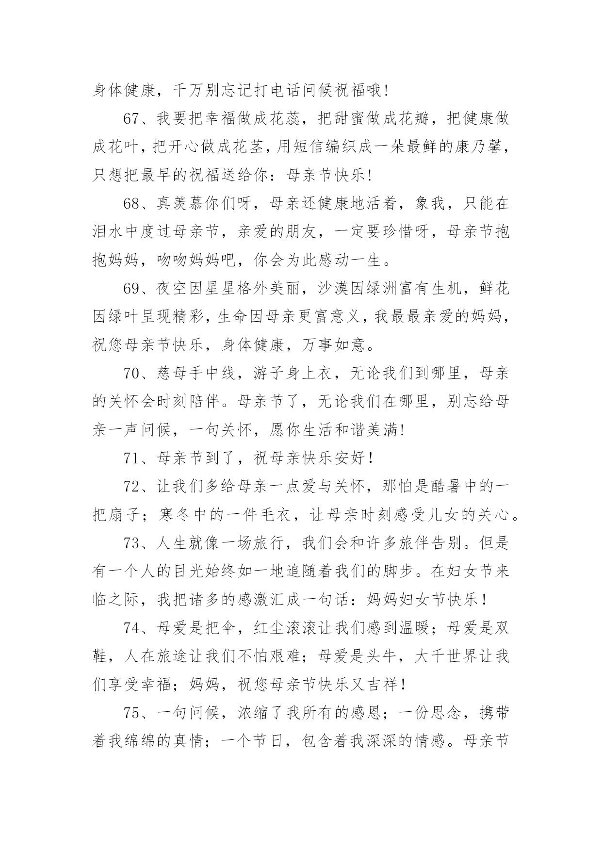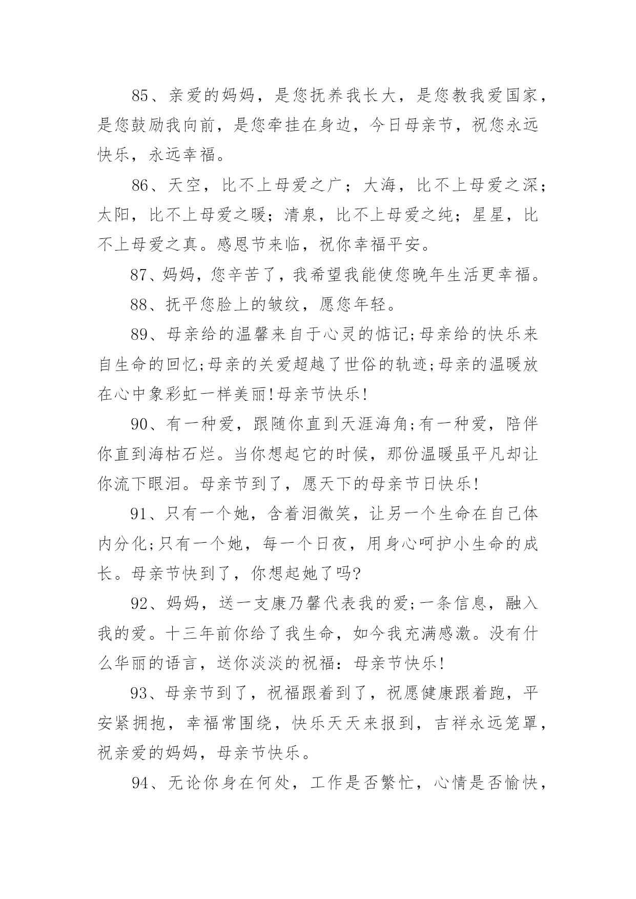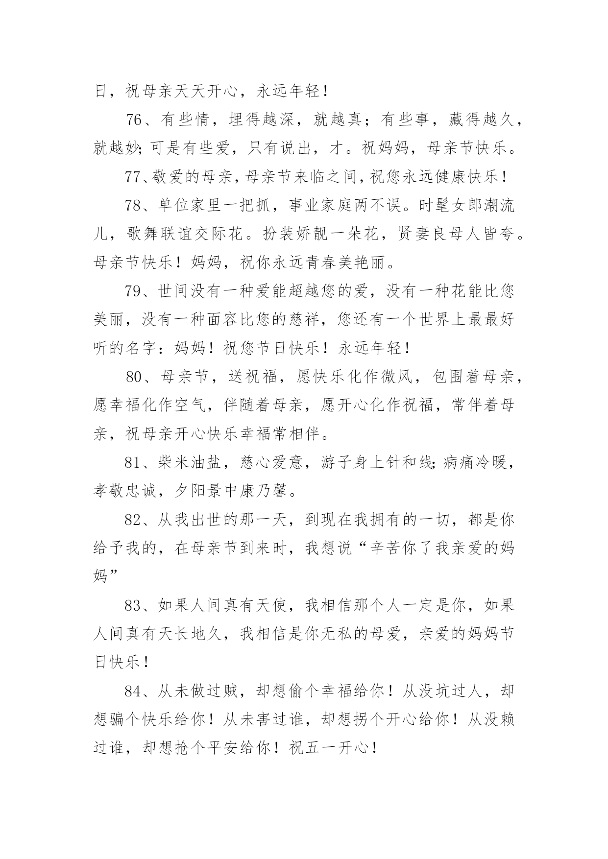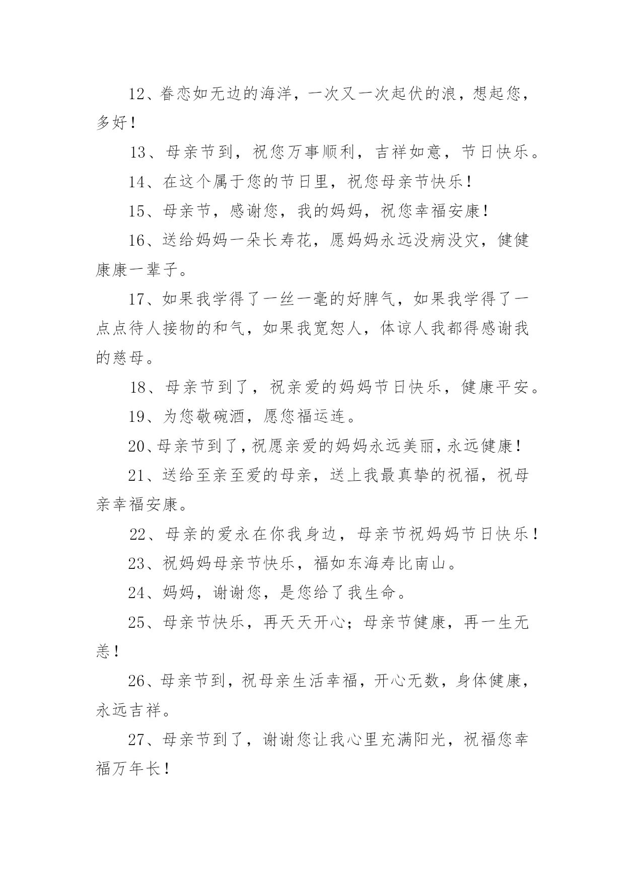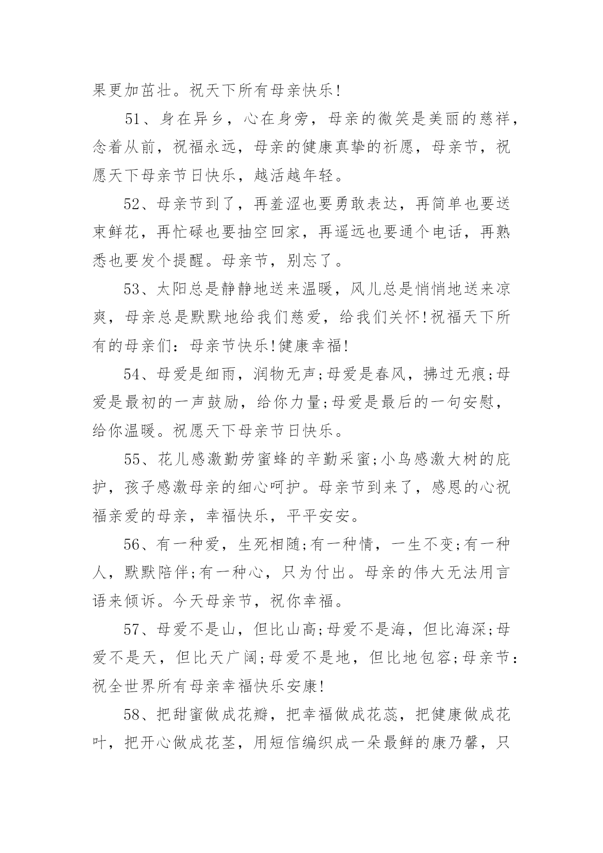 母亲节催泪文案母亲节催泪文案240句随着社交网络的普及,大家都不可避免地会接触到文案吧,借助文案可以达到宣传文化的目的。那什么样的文案才具有启发意义呢?以下是小编帮大家整理的母亲节催泪文案,欢迎阅读与收藏。1、母亲节,愿亲爱的妈妈健康长寿,四季平安。2、永远健康,年轻美丽,快乐幸福,顺心如意,母亲节快乐!3、妈妈,今天是你的节日,祝你每天都开开心心、健健康康!4、母爱无私天下广;亲情有暖世间新。5、妈妈,这世上永远那么温柔的,只有您。感谢您,妈妈!6、母亲节,用心祝福母亲节日快乐,健康长伴。7、妈妈我感谢你赐给了我生命,是您教会了我做人的道理,无论将来怎么样,我永远爱您!8、祝您长寿安康!开心幸福!9、你获得成功的时候,众人都会拥抱你,赞美你;你失败沮丧的时候,只有妈妈安慰你,鼓励你,祝天下所有的母亲永远幸福,母亲节快乐。10、妈妈,我是您的牵挂,您是我的惦念!母亲节快乐!11、温暖您慈爱的心灵,愿您幸福!12、眷恋如无边的海洋,一次又一次起伏的浪,想起您,多好!13、母亲节到,祝您万事顺利,吉祥如意,节日快乐。14、在这个属于您的节日里,祝您母亲节快乐!15、母亲节,感谢您,我的妈妈,祝您幸福安康!16、送给妈妈一朵长寿花,愿妈妈永远没病没灾,健健康康一辈子。17、如果我学得了一丝一毫的好脾气,如果我学得了一点点待人接物的和气,如果我宽恕人,体谅人我都得感谢我的慈母。18、母亲节到了,祝亲爱的妈妈节日快乐,健康平安。19、为您敬碗酒,愿您福运连。20、母亲节到了,祝愿亲爱的妈妈永远美丽,永远健康!21、送给至亲至爱的母亲,送上我最真挚的祝福,祝母亲幸福安康。22、母亲的爱永在你我身边,母亲节祝妈妈节日快乐!23、祝妈妈母亲节快乐,福如东海寿比南山。24、妈妈,谢谢您,是您给了我生命。25、母亲节快乐,再天天开心;母亲节健康,再一生无恙!26、母亲节到,祝母亲生活幸福,开心无数,身体健康,永远吉祥。27、母亲节到了,谢谢您让我心里充满阳光,祝福您幸福万年长!28、母爱是夏夜的风,吹走闷热,吹来凉爽。29、今天是母亲节,祝福我们的母亲身体安康,幸福久长。30、没有你就没有我,就没有我数十寒暑的悲伤,也没有我春夏秋冬的欢笑,谢谢你给了我生命中美好的一切与成长。母亲节快乐!31、母亲节到了,记得告诉你的妈妈,你爱她到永远。32、母恩深似海;亲义重如山。33、祝福母亲,天天有今日,年年有今朝。34、收集每一种愿望,每一个企盼,寄予您深切的关怀。35、亲情深似海;母爱大如天。36、希望母亲能天天快乐,日日幸福!37、妈妈,不论您在哪儿,那里就是我们最快乐和向往的地方。38、秋水望穿,倚闾常忘风霜苦;庭花落尽,听雨更忧子女寒。39、愿妈妈们永远年轻,永远健康,永远幸福!40、妈妈,母亲节要到了,祝您节日快乐,身体健康,永远幸福。41、母爱,及大海!娘心,及黄金!母亲节,勿分别!愿天下所有的母亲都收到她们最想得到的祝福和礼物!我祝我的母亲永远快乐,健康永在!42、让我们男士为母亲节加油:我的肩膀可能不够宽广,但足以为你遮风挡雨;我的胳膊也许不够有力,但还能为你撑起一片蓝天。母亲节快乐!43、今天是母亲节了,我用心灵之纸折成最美的康乃馨,献给你的妈妈,祝她幸福平安!更感谢她养育了你,使你成为我生命中不可缺少的朋友。44、又到母亲节,为您送祝愿,盼您体康健,天天笑容现;盼您少辛劳,安逸享晚年。思母泪连连,恩情记心间,百善孝为先,我将永伴您身边!45、一句问候,浓缩了我所有的感恩;一份思念,携带着我绵绵的真情;一个节日,包含着我深深的情感。母亲节日,祝母亲天天开心,永远年轻!46、亲爱的朋友,没有妈妈细心哺育呵护,就没有童年的欢乐;没有妈妈言传身教,就没有今天的成熟。母亲节到了,祝福我们的妈妈健康、快乐!47、天空再宽,没有您的爱宽阔;大地再广,没有您的爱博大;海洋再深,没有您的爱恢弘;花朵再美,没有您的爱绚烂。妈妈,祝您母亲节快乐!48、太阳最红,母爱最纯,母亲最亲,母亲恩情比天高比海深,咫尺天涯齐祝福,母亲儿女心连心。母亲节,祝我们的母亲寿比南山松福如东海水。49、因为有您,烦恼是暂时的,快乐是永远的;因为有您,忧伤是暂时的,微笑是永远的;因为有您,困难是暂时的,幸福是永远的。母亲节快乐!50、母亲是我们生长的根,在爱的泥土延伸;我们是母亲理想的果,颗颗渗透根的风华!母亲节,愿根美丽健康,果更加茁壮。祝天下所有母亲快乐!51、身在异乡,心在身旁,母亲的微笑是美丽的慈祥,念着从前,祝福永远,母亲的健康真挚的祈愿,母亲节,祝愿天下母亲节日快乐,越活越年轻。52、母亲节到了,再羞涩也要勇敢表达,再简单也要送束鲜花,再忙碌也要抽空回家,再遥远也要通个电话,再熟悉也要发个提醒。母亲节,别忘了。53、太阳总是静静地送来温暖,风儿总是悄悄地送来凉爽,母