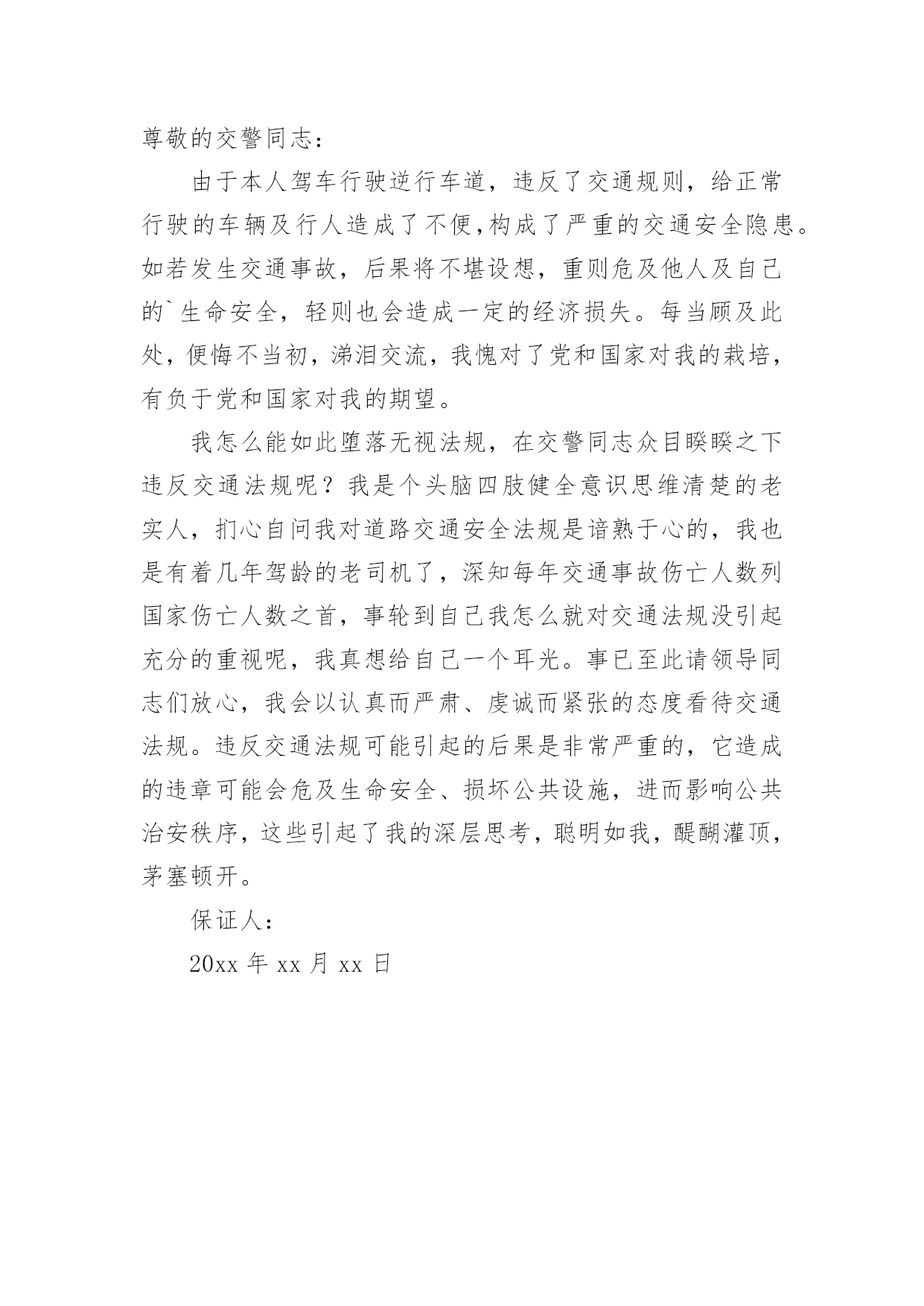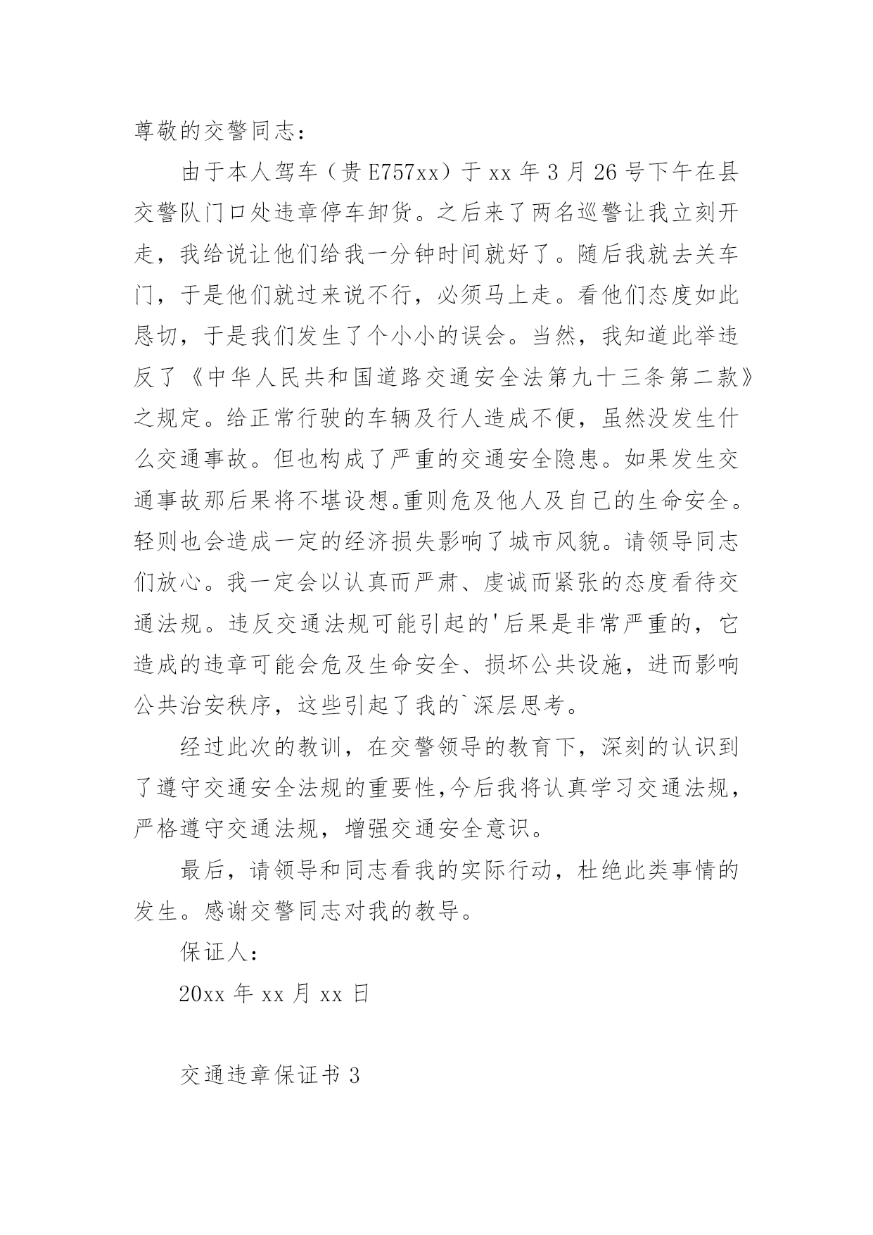 交通违章保证书在学习、工作生活中,越来越多人会去使用保证书,保证书是以集体或个人名义以一种较为强烈的态度向上级组织、领导或个人表决心下保证时所使用的一种书信。那么什么样的保证书才是有效的呢?下面是小编整理的交通违章保证书,供大家参考借鉴,希望可以帮助到有需要的朋友。交通违章保证书1xx道路运输管理所:今天,我怀着愧疚和懊悔写下这份保证书书,以表示我对运输管理部门的批评,意识到自己的'错误深刻认识改正错误的决心。我这种行为在运管里造成了极其坏的影响,我真正意识到了这件事情的严重性,所以我今后要听从指挥,充分领会理解运输管理所部门的要求,并保证不会(有类似)的事情发生。希望运输管理所给我改过自新的机会,对于这一切我还将进一步深入总结,深刻反省,恳请运输管理部门相信我能够吸取教训、改正错误!保证人:20xx年xx月xx日交通违章保证书2尊敬的交警同志:由于本人驾车(贵E757xx)于xx年3月26号下午在县交警队门口处违章停车卸货。之后来了两名巡警让我立刻开走,我给说让他们给我一分钟时间就好了。随后我就去关车门,于是他们就过来说不行,必须马上走。看他们态度如此恳切,于是我们发生了个小小的误会。当然,我知道此举违反了《中华人民共和国道路交通安全法第九十三条第二款》之规定。给正常行驶的车辆及行人造成不便,虽然没发生什么交通事故。但也构成了严重的交通安全隐患。如果发生交通事故那后果将不堪设想。重则危及他人及自己的生命安全。轻则也会造成一定的经济损失影响了城市风貌。请领导同志们放心。我一定会以认真而严肃、虔诚而紧张的态度看待交通法规。违反交通法规可能引起的'后果是非常严重的,它造成的违章可能会危及生命安全、损坏公共设施,进而影响公共治安秩序,这些引起了我的`深层思考。经过此次的教训,在交警领导的教育下,深刻的认识到了遵守交通安全法规的重要性,今后我将认真学习交通法规,严格遵守交通法规,增强交通安全意识。最后,请领导和同志看我的实际行动,杜绝此类事情的发生。感谢交警同志对我的教导。保证人:20xx年xx月xx日交通违章保证书3尊敬的交警同志:由于本人驾车行驶逆行车道,违反了交通规则,给正常行驶的车辆及行人造成了不便,构成了严重的交通安全隐患。如若发生交通事故,后果将不堪设想,重则危及他人及自己的`生命安全,轻则也会造成一定的经济损失。每当顾及此处,便悔不当初,涕泪交流,我愧对了党和国家对我的栽培,有负于党和国家对我的期望。我怎么能如此堕落无视法规,在交警同志众目睽睽之下违反交通法规呢?我是个头脑四肢健全意识思维清楚的老实人,扪心自问我对道路交通安全法规是谙熟于心的,我也是有着几年驾龄的老司机了,深知每年交通事故伤亡人数列国家伤亡人数之首,事轮到自己我怎么就对交通法规没引起充分的重视呢,我真想给自己一个耳光。事已至此请领导同志们放心,我会以认真而严肃、虔诚而紧张的态度看待交通法规。违反交通法规可能引起的后果是非常严重的,它造成的违章可能会危及生命安全、损坏公共设施,进而影响公共治安秩序,这些引起了我的深层思考,聪明如我,醍醐灌顶,茅塞顿开。保证人:20xx年xx月xx日
