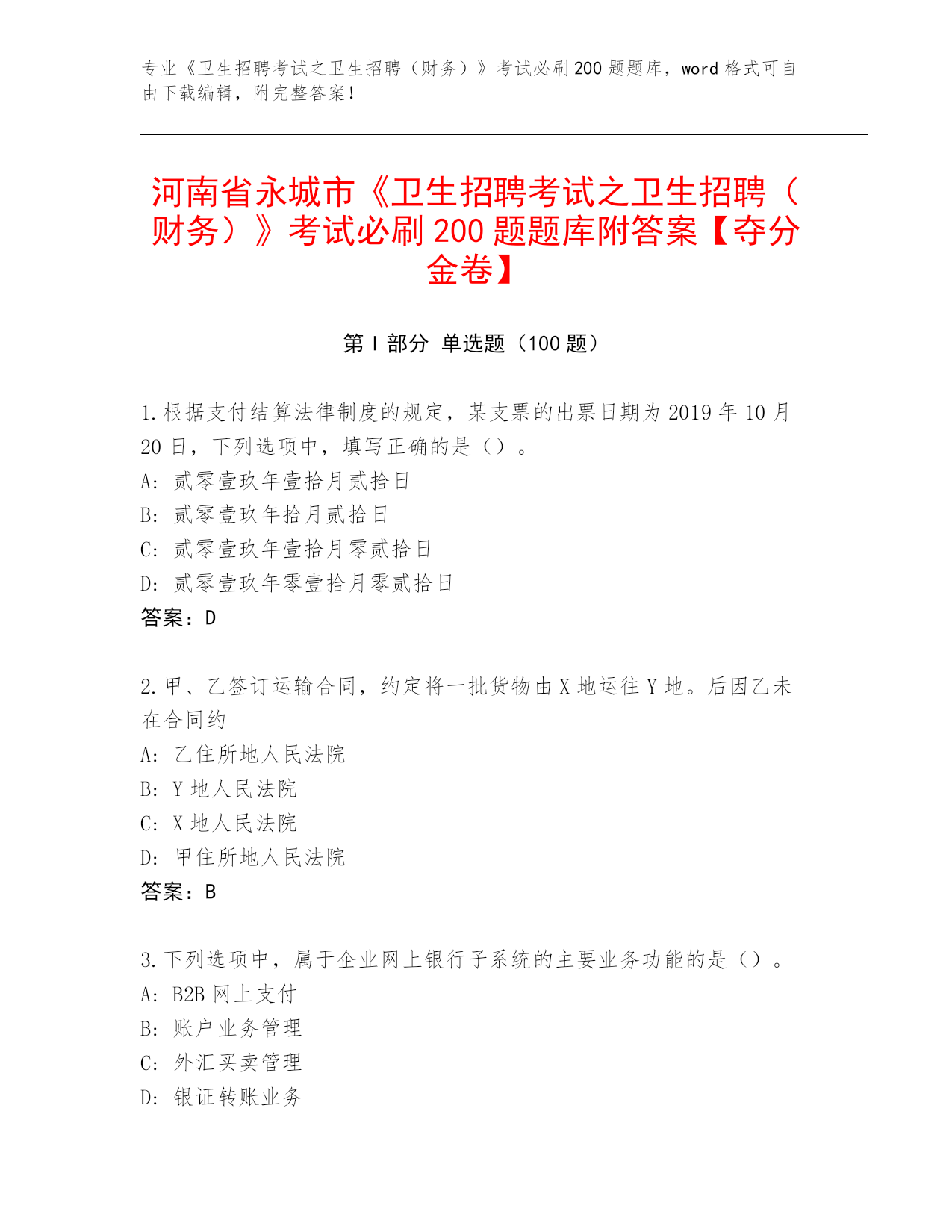 河南省永城市《卫生招聘考试之卫生招聘(财务)》考试必刷200题题库附答案【夺分金卷】