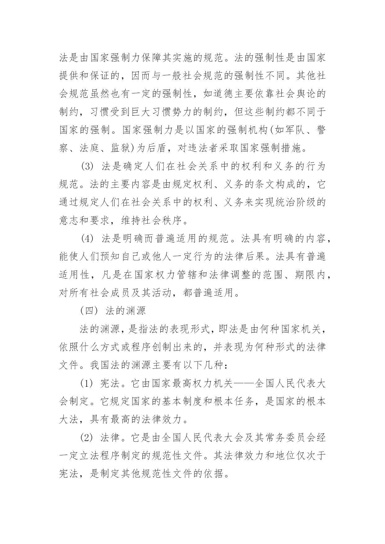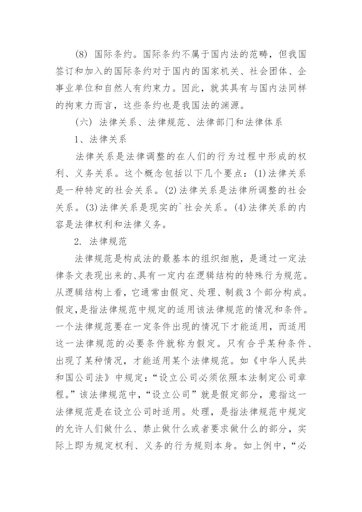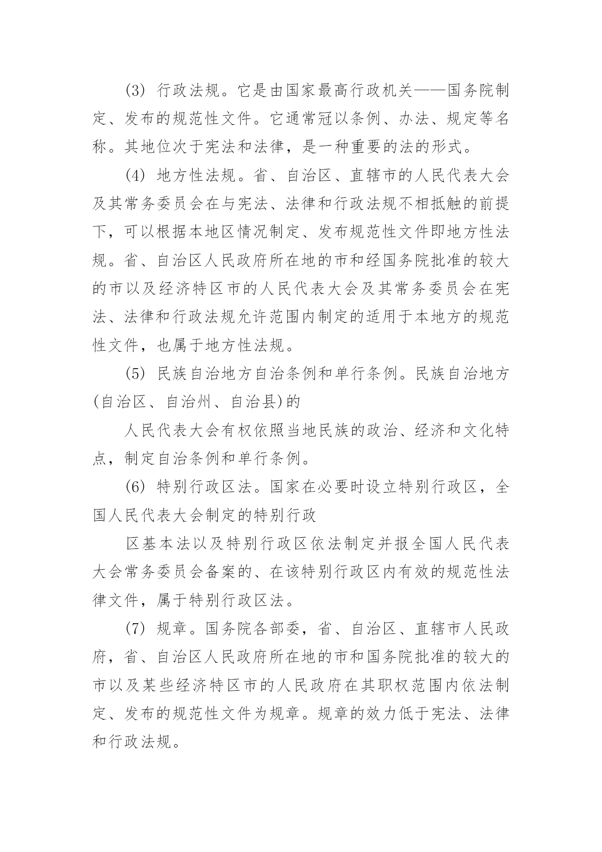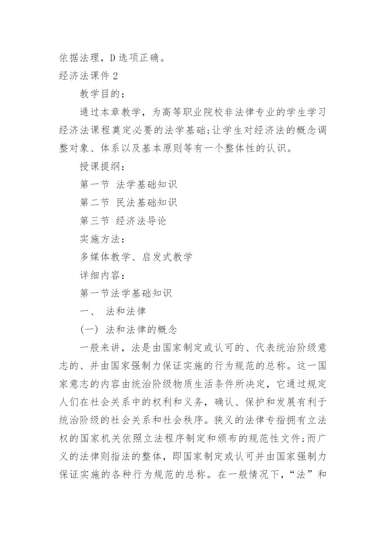 经济法课件经济法课件经济法课件11.根据会计法律制度的规定“在民族自治地方,会计记录可以同时使用当地通用的一种民族文字”。关于该法律规范性质的下列表述中,正确的有()。A.该法律规范属于任意性规范B.该法律规范属于禁止性规范C.该法律规范属于授权性规范D.该法律规范属于强制性规范答案:AC解析:本题考核法律规范的种类。“在民族自治地方,会计记录可以同时使用当地通用的一种民族文字”为授权性规范,也是任意性规范。2.下列关于法律关系的说法中,正确的是()。A.法律关系的主体主要包括自然人、法人和其他组织、国家。其中,自然人具有权利能力和行为能力;社会组织只具有权利能力,而不具有行为能力B.设计图纸、公民肖像和科学发明均可以成为法律关系客体C.自然人的行为能力一般通过自身实现,而法人的行为能力则通过法定代表人或者其他代理人实现D.法律规范所规定的,能够引起法律关系产生、变更和消灭的客观现象称为法律事实答案:BCD解析:本题考核法律关系的说法。法律关系的主体中,不仅自然人具有权利能力和行为能力,社会组织也具有权利能力和行为能力,因此选项A的说法是错误的。3.法律行为的意思表示可以分为有相对人的意思表示和无相对人的意思表示,下列选项中,属于有相对人的意思表示的情形有()。A.要约和承诺B.授予代理权C.遗嘱行为D.债务免除答案:ABD解析:本题考核法律行为的意思表示。选项C属于无相对人的意思表示。4.以下对可撤销的民事行为的表述,其中正确的是()。A.该行为的撤销,应由撤销权人提出并实施,其他人不能主张其效力的消灭B.该行为一经撤销,其效力自行为开始时无效C.如果具有撤销权的当事人未在法定期限内行使撤销权,则该行为视同有效的法律行为,对当事人具有约束力D.该行为撤销前,其效力已经发生,未经撤销,其效力不消灭答案:ABCD解析:本题考核可撤销民事行为的特征。本题的四个选项表述均符合规定。5.业务员张某到某地采购一批等离子电视机,张某到该地后意外发现当地乙公司的液晶电视机很畅销,就用盖有甲公司公章的空白介绍信和空白合同书与乙公司签订了购买200台液晶电视机的合同,并约定货到付款。货到后,甲公司拒绝付款。下列表述中,正确的有()。A.甲公司有权拒绝付款B.甲公司应接受货物并向乙公司付款C.张某无权代理签订购买液晶电视机合同D.若甲公司因该液晶电视机买卖合同受到损失,有权向张某追偿答案:BCD解析:本题考核代理。(1)被代理人(甲公司)将某种有代理权的证明文件(如盖有公章的空白介绍信、空白合同文本、合同专用章等)交给他人(张某),他人以该种文件使第三人(乙公司)相信其有代理权并与之进行法律行为为“表见代理”行为。在此情形下,被代理人应当承担代理的法律后果,所以A选项错误,B选项正确;(2)无权代理是指没有代理权而以他人名义进行的民事行为。无权代理包括三种情况:一是没有代理权的代理;二是超越代理权的代理;三是代理权终止后而为的代理。所以C选项正确;(3)教材中无明确依据,依据法理,D选项正确。经济法课件2教学目的:通过本章教学,为高等职业院校非法律专业的学生学习经济法课程奠定必要的法学基础;让学生对经济法的概念调整对象、体系以及基本原则等有一个整体性的认识。授课提纲:第一节法学基础知识第二节民法基础知识第三节经济法导论实施方法:多媒体教学、启发式教学详细内容:第一节法学基础知识一、法和法律(一)法和法律的概念一般来讲,法是由国家制定或认可的、代表统治阶级意志的、并由国家强制力保证实施的行为规范的总称。这一国家意志的内容由统治阶级物质生活条件所决定,它通过规定人们在社会关系中的权利和义务,确认、保护和发展有利于统治阶级的社会关系和社会秩序。狭义的法律专指拥有立法权的国家机关依照立法程序制定和颁布的规范性文件;而广义的法律则指法的整体,即国家制定或认可并由国家强制力保证实施的各种行为规范的总称。在一般情况下,“法”和广义的“法律”同义,但在某些场合,“法”又和狭义的法律同义,如《中华人民共和国合同法》、《中华人民共和国公司法》等。在我国历史上很长一段时期内把“法”称为“律”,如秦律、汉律、隋律、唐律、明律、大清律等。近代才把法与律连用,称法律。在法学上,法和法律有时有严格区分的必要。法指前面所讲的行为规范的体系或总称,是广义的法;而法律则指法律的渊源或严格的表现形式,是狭义的法或者叫严格意义上的法。(二)法的本质法是统治阶级意志的体现。法不是超阶级的产物,不是社会各阶级的意志都能体现为法,法只能是统治阶级意志的体现。法所体现的统治阶级的意志,不是随心所欲、凭空产生的,而是由统治阶级的物质生活条件决定的,是社会客观需要的反映。它体现的也不是一般的统治阶级意志,而是被奉为法律的统治阶级意志,即统治阶级的国家意志。所以,法是统治阶级意志的体现,这是法的