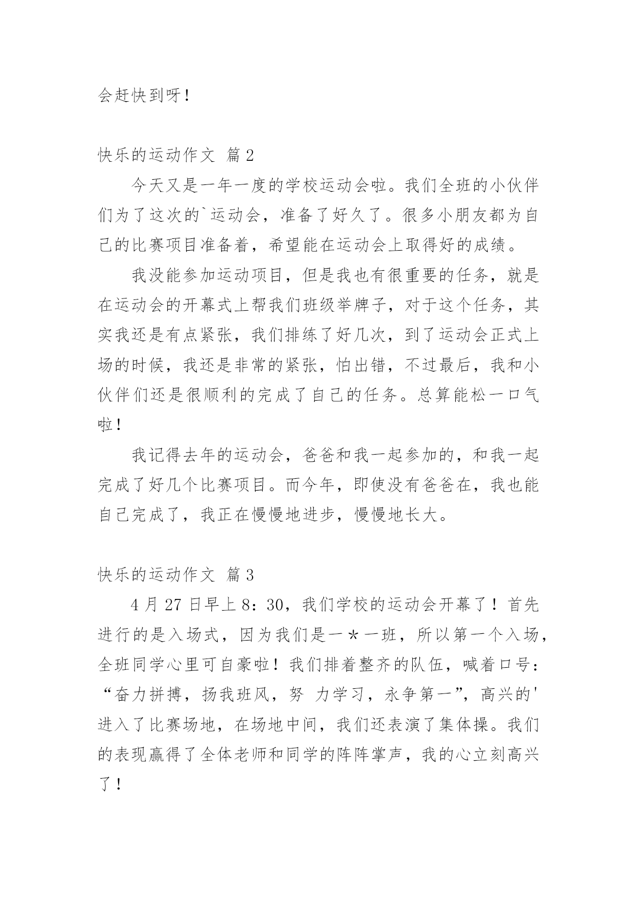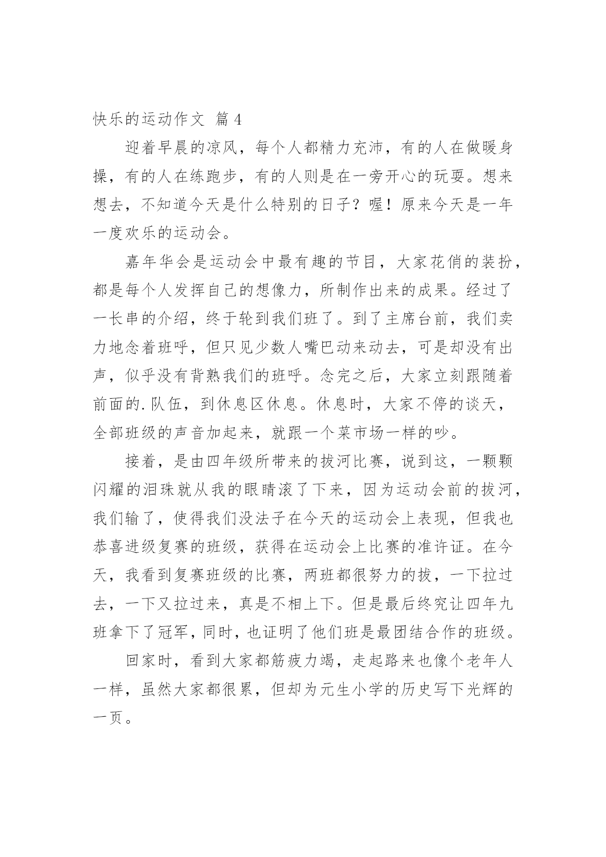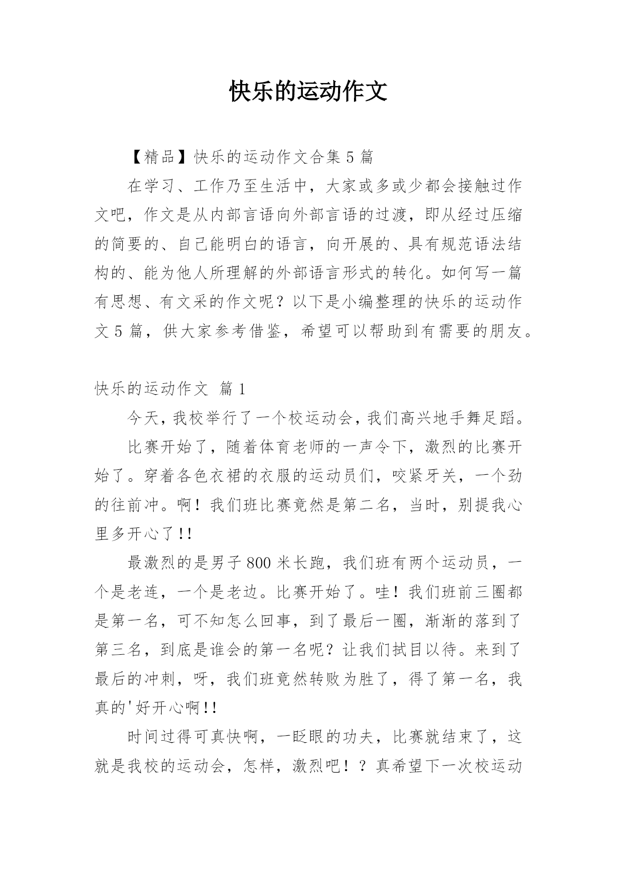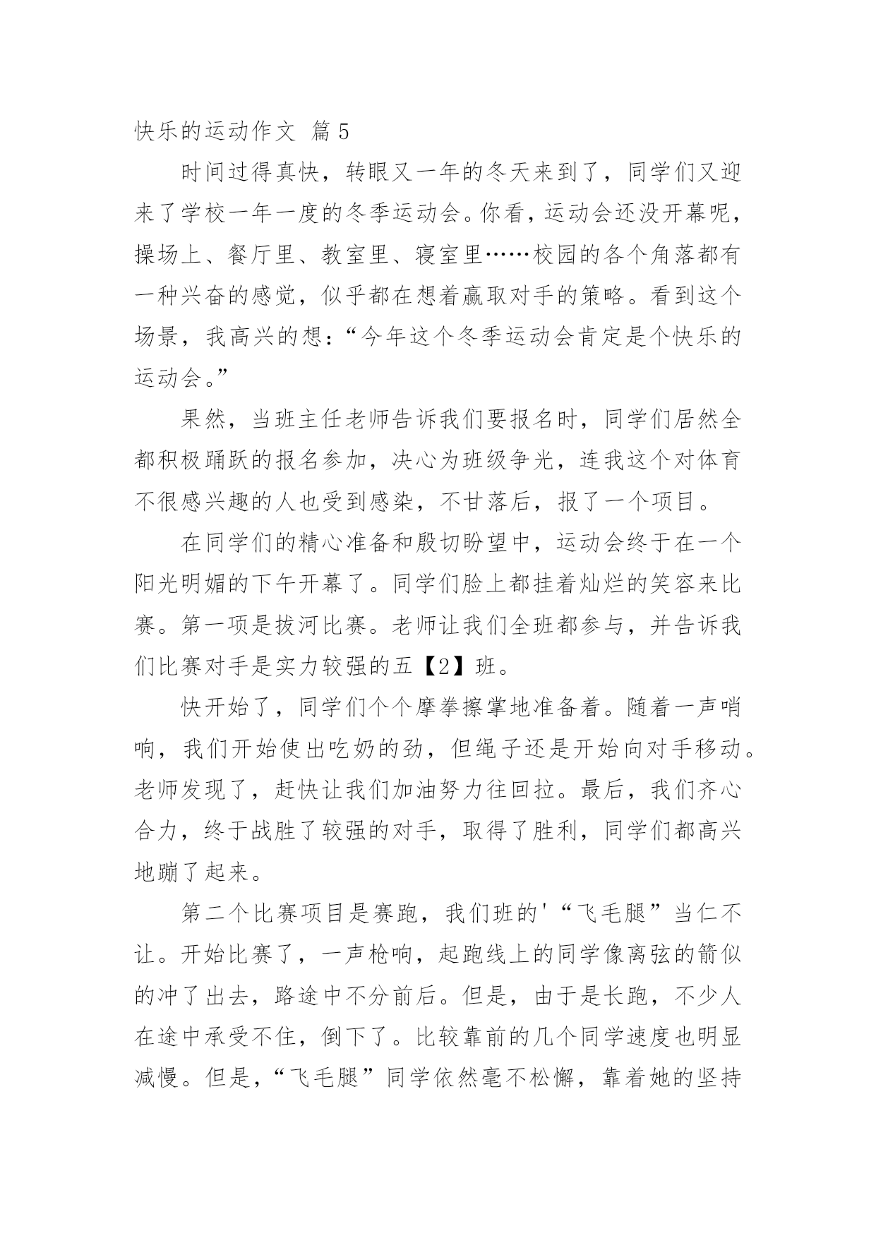 快乐的运动作文【精品】快乐的运动作文合集5篇在学习、工作乃至生活中,大家或多或少都会接触过作文吧,作文是从内部言语向外部言语的过渡,即从经过压缩的简要的、自己能明白的语言,向开展的、具有规范语法结构的、能为他人所理解的外部语言形式的转化。如何写一篇有思想、有文采的作文呢?以下是小编整理的快乐的运动作文5篇,供大家参考借鉴,希望可以帮助到有需要的朋友。快乐的运动作文篇1今天,我校举行了一个校运动会,我们高兴地手舞足蹈。比赛开始了,随着体育老师的一声令下,激烈的比赛开始了。穿着各色衣裙的衣服的运动员们,咬紧牙关,一个劲的往前冲。啊!我们班比赛竟然是第二名,当时,别提我心里多开心了!!最激烈的是男子800米长跑,我们班有两个运动员,一个是老连,一个是老边。比赛开始了。哇!我们班前三圈都是第一名,可不知怎么回事,到了最后一圈,渐渐的落到了第三名,到底是谁会的第一名呢?让我们拭目以待。来到了最后的冲刺,呀,我们班竟然转败为胜了,得了第一名,我真的'好开心啊!!时间过得可真快啊,一眨眼的功夫,比赛就结束了,这就是我校的运动会,怎样,激烈吧!?真希望下一次校运动会赶快到呀!快乐的运动作文篇2今天又是一年一度的学校运动会啦。我们全班的小伙伴们为了这次的`运动会,准备了好久了。很多小朋友都为自己的比赛项目准备着,希望能在运动会上取得好的成绩。我没能参加运动项目,但是我也有很重要的任务,就是在运动会的开幕式上帮我们班级举牌子,对于这个任务,其实我还是有点紧张,我们排练了好几次,到了运动会正式上场的时候,我还是非常的紧张,怕出错,不过最后,我和小伙伴们还是很顺利的完成了自己的任务。总算能松一口气啦!我记得去年的运动会,爸爸和我一起参加的,和我一起完成了好几个比赛项目。而今年,即使没有爸爸在,我也能自己完成了,我正在慢慢地进步,慢慢地长大。快乐的运动作文篇34月27日早上8:30,我们学校的运动会开幕了!首先进行的是入场式,因为我们是一*一班,所以第一个入场,全班同学心里可自豪啦!我们排着整齐的队伍,喊着口号:“奋力拼搏,扬我班风,努力学习,永争第一”,高兴的'进入了比赛场地,在场地中间,我们还表演了集体操。我们的表现赢得了全体老师和同学的阵阵掌声,我的心立刻高兴了!快乐的运动作文篇4迎着早晨的凉风,每个人都精力充沛,有的人在做暖身操,有的人在练跑步,有的人则是在一旁开心的玩耍。想来想去,不知道今天是什么特别的日子?喔!原来今天是一年一度欢乐的运动会。嘉年华会是运动会中最有趣的节目,大家花俏的装扮,都是每个人发挥自己的想像力,所制作出来的成果。经过了一长串的介绍,终于轮到我们班了。到了主席台前,我们卖力地念着班呼,但只见少数人嘴巴动来动去,可是却没有出声,似乎没有背熟我们的班呼。念完之后,大家立刻跟随着前面的.队伍,到休息区休息。休息时,大家不停的谈天,全部班级的声音加起来,就跟一个菜市场一样的吵。接着,是由四年级所带来的拔河比赛,说到这,一颗颗闪耀的泪珠就从我的眼睛滚了下来,因为运动会前的拔河,我们输了,使得我们没法子在今天的运动会上表现,但我也恭喜进级复赛的班级,获得在运动会上比赛的准许证。在今天,我看到复赛班级的比赛,两班都很努力的拔,一下拉过去,一下又拉过来,真是不相上下。但是最后终究让四年九班拿下了冠军,同时,也证明了他们班是最团结合作的班级。回家时,看到大家都筋疲力竭,走起路来也像个老年人一样,虽然大家都很累,但却为元生小学的历史写下光辉的一页。快乐的运动作文篇5时间过得真快,转眼又一年的冬天来到了,同学们又迎来了学校一年一度的冬季运动会。你看,运动会还没开幕呢,操场上、餐厅里、教室里、寝室里……校园的各个角落都有一种兴奋的感觉,似乎都在想着赢取对手的策略。看到这个场景,我高兴的想:“今年这个冬季运动会肯定是个快乐的运动会。”果然,当班主任老师告诉我们要报名时,同学们居然全都积极踊跃的报名参加,决心为班级争光,连我这个对体育不很感兴趣的人也受到感染,不甘落后,报了一个项目。在同学们的精心准备和殷切盼望中,运动会终于在一个阳光明媚的下午开幕了。同学们脸上都挂着灿烂的笑容来比赛。第一项是拔河比赛。老师让我们全班都参与,并告诉我们比赛对手是实力较强的五【2】班。快开始了,同学们个个摩拳擦掌地准备着。随着一声哨响,我们开始使出吃奶的劲,但绳子还是开始向对手移动。老师发现了,赶快让我们加油努力往回拉。最后,我们齐心合力,终于战胜了较强的对手,取得了胜利,同学们都高兴地蹦了起来。第二个比赛项目是赛跑,我们班的'“飞毛腿”当仁不让。开始比赛了,一声枪响,起跑线上的同学像离弦的箭似的冲了出去,路途中不分前后。但是,由于是长跑,不少人在途中承受不住,倒下了。比较靠前的几个同学速度也明显减慢。但是,“飞毛腿”同学依然毫不松懈,靠着她的坚持不懈的毅力,取得