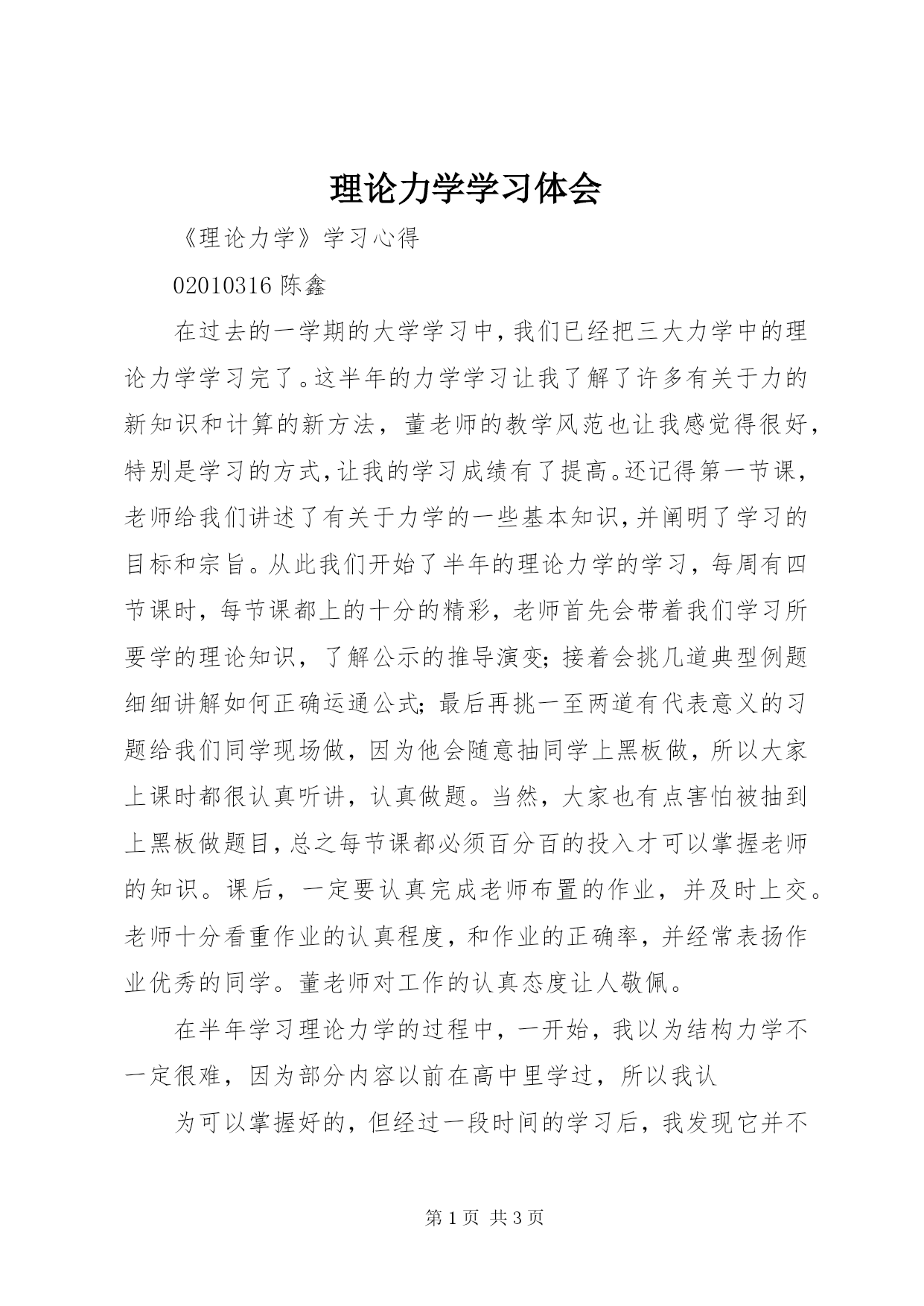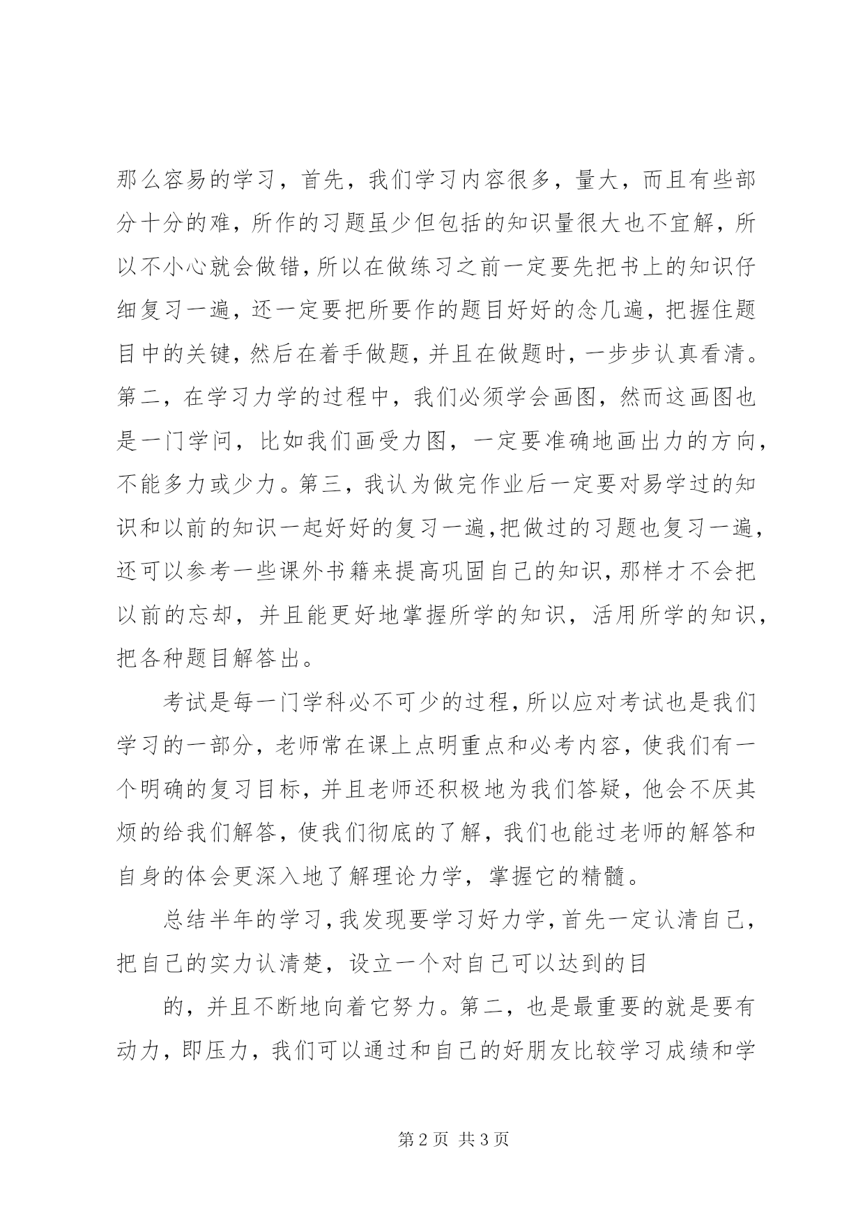 第PAGE\*Arabic\*MERGEFORMAT3页共NUMPAGES\*MERGEFORMAT3页理论力学学习体会《理论力学》学习心得02010316陈鑫在过去的一学期的大学学习中,我们已经把三大力学中的理论力学学习完了。这半年的力学学习让我了解了许多有关于力的新知识和计算的新方法,董老师的教学风范也让我感觉得很好,特别是学习的方式,让我的学习成绩有了提高。还记得第一节课,老师给我们讲述了有关于力学的一些基本知识,并阐明了学习的目标和宗旨。从此我们开始了半年的理论力学的学习,每周有四节课时,每节课都上的十分的精彩,老师首先会带着我们学习所要学的理论知识,了解公示的推导演变;接着会挑几道典型例题细细讲解如何正确运通公式;最后再挑一至两道有代表意义的习题给我们同学现场做,因为他会随意抽同学上黑板做,所以大家上课时都很认真听讲,认真做题。当然,大家也有点害怕被抽到上黑板做题目,总之每节课都必须百分百的投入才可以掌握老师的知识。课后,一定要认真完成老师布置的作业,并及时上交。老师十分看重作业的认真程度,和作业的正确率,并经常表扬作业优秀的同学。董老师对工作的认真态度让人敬佩。在半年学习理论力学的过程中,一开始,我以为结构力学不一定很难,因为部分内容以前在高中里学过,所以我认为可以掌握好的,但经过一段时间的学习后,我发现它并不那么容易的学习,首先,我们学习内容很多,量大,而且有些部分十分的难,所作的习题虽少但包括的知识量很大也不宜解,所以不小心就会做错,所以在做练习之前一定要先把书上的知识仔细复习一遍,还一定要把所要作的题目好好的念几遍,把握住题目中的关键,然后在着手做题,并且在做题时,一步步认真看清。第二,在学习力学的过程中,我们必须学会画图,然而这画图也是一门学问,比如我们画受力图,一定要准确地画出力的方向,不能多力或少力。第三,我认为做完作业后一定要对易学过的知识和以前的知识一起好好的复习一遍,把做过的习题也复习一遍,还可以参考一些课外书籍来提高巩固自己的知识,那样才不会把以前的忘却,并且能更好地掌握所学的知识,活用所学的知识,把各种题目解答出。考试是每一门学科必不可少的过程,所以应对考试也是我们学习的一部分,老师常在课上点明重点和必考内容,使我们有一个明确的复习目标,并且老师还积极地为我们答疑,他会不厌其烦的给我们解答,使我们彻底的了解,我们也能过老师的解答和自身的体会更深入地了解理论力学,掌握它的精髓。总结半年的学习,我发现要学习好力学,首先一定认清自己,把自己的实力认清楚,设立一个对自己可以达到的目的,并且不断地向着它努力。第二,也是最重要的就是要有动力,即压力,我们可以通过和自己的好朋友比较学习成绩和学习的努力程度来刺激自己,激励自己,使自己有压力,有动力,不断的努力,那样才能达到更高的层次,使自己在考试是得到好成绩。最后一条就是要有细心,每做一道题目一定要分清楚步骤,每一步仔细计算,还要认真的验算,看清每一个数字,那样才会更快地得到正确的答案。
