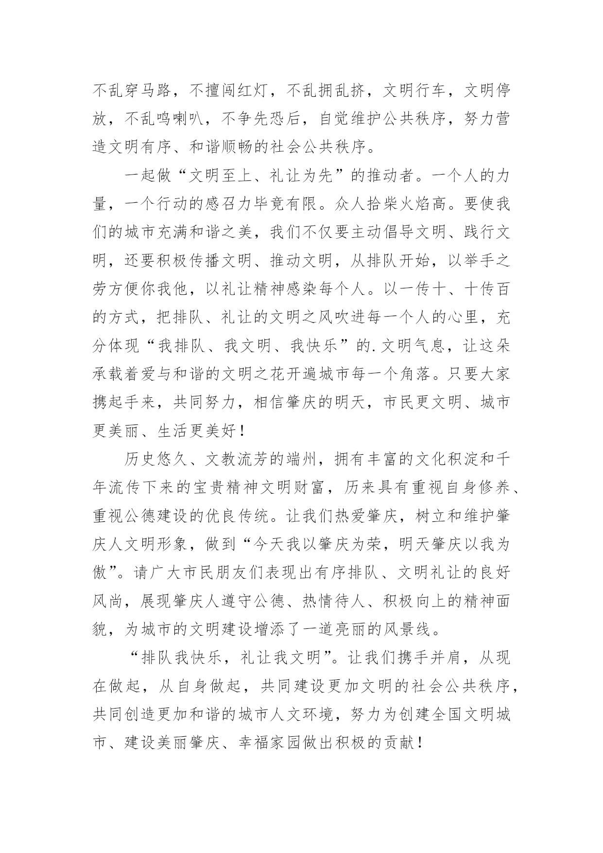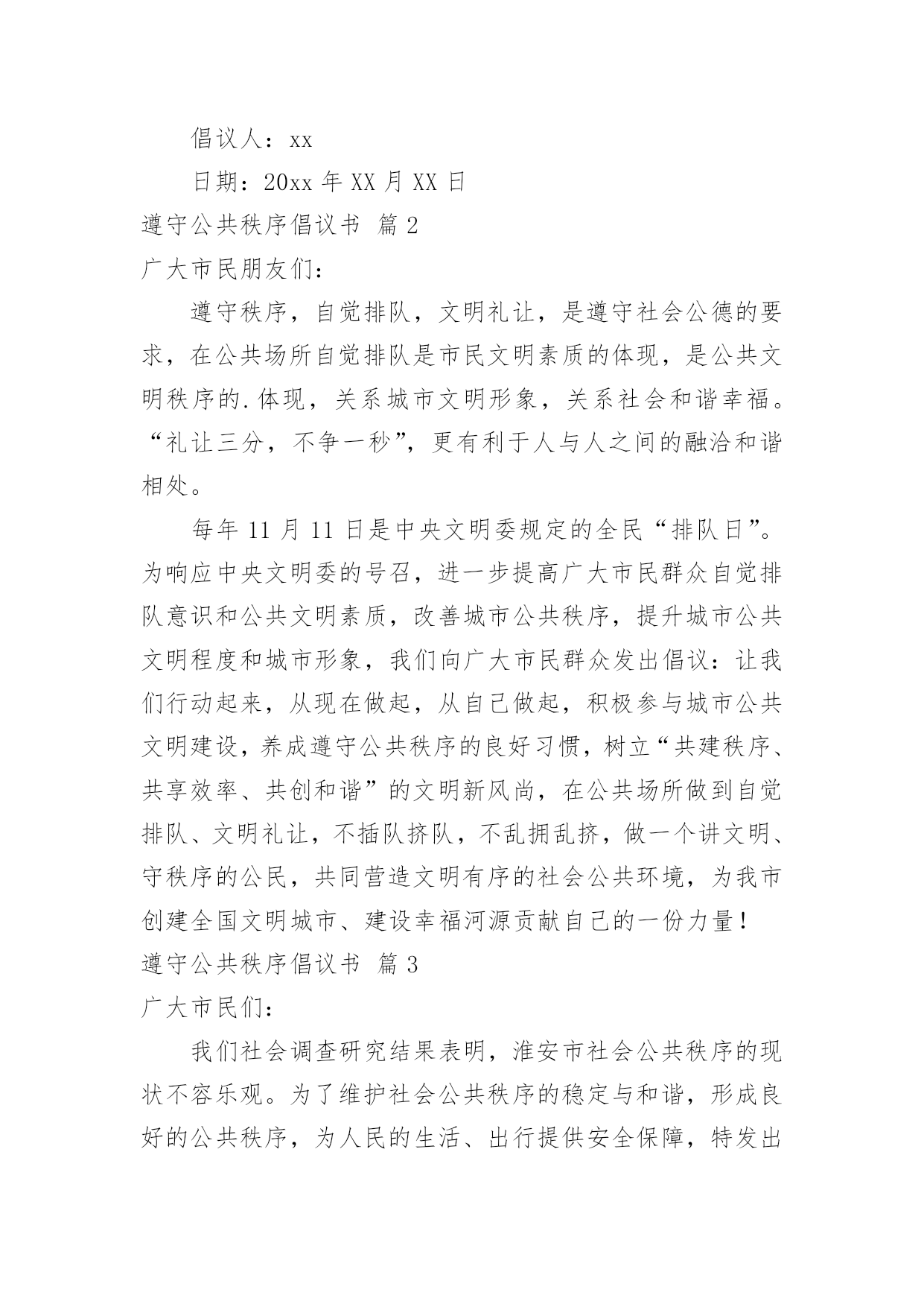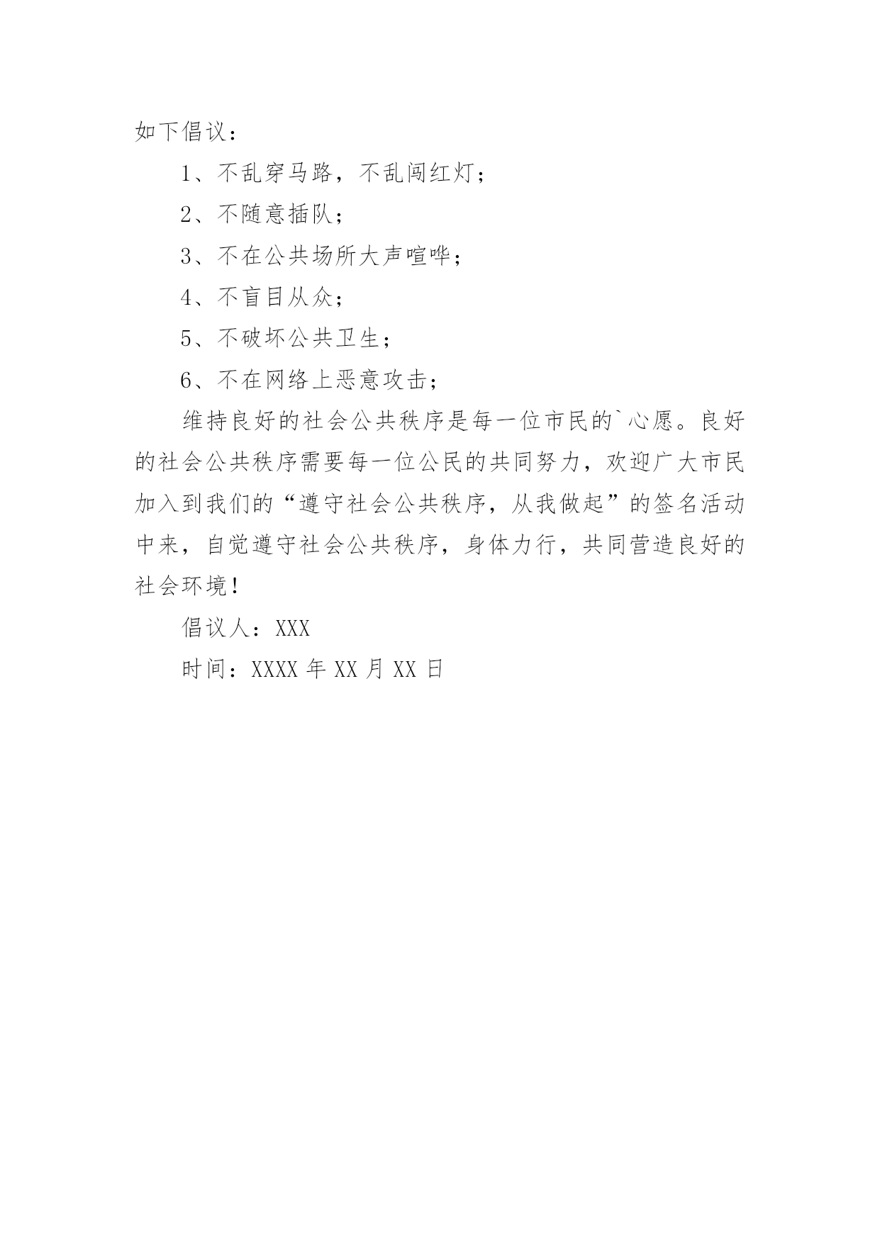 遵守公共秩序倡议书有关遵守公共秩序倡议书三篇在社会发展不断提速的今天,倡议书对我们的作用越来越大,倡议书是一种号召性的专用书信,具有一定的格式要求。怎么写倡议书才能避免踩雷呢?下面是小编为大家整理的遵守公共秩序倡议书3篇,希望对大家有所帮助。遵守公共秩序倡议书篇1尊敬的市民朋友们:自觉排队是一个城市文明程度的体现,体现着一种社会秩序,体现着平等、礼让与和谐。遵守公共秩序,自觉文明礼让,是遵守社会公德的要求,“礼让三先,不争一时”,体现了人与人之间融洽、和谐相处的关系。“同住在肇庆,共爱我的家”。谁不渴望蓝天白云、处处鸟语花香?谁不期盼秩序井然、处处交通顺畅?谁不愿意友好相处、处处文明礼让?每一位市民都是肇庆的主人,我们的生活需要秩序与爱心,我们的城市需要文明与和谐,只有我们共同努力,才能创造美好家园!为此,我们倡议:积极参与在全市开展的“排队我快乐、礼让我文明”“排队日”主题宣传活动活动,从现在做起、从自己做起、从家人做起,在主要公交站点和窗口服务行业单位等公众场合,排队购票、排队上车、排队就诊、排队接受各种服务,做文明示范和排队引导的实践者,在公共场所不插队,不喧哗,不乱穿马路,不擅闯红灯,不乱拥乱挤,文明行车,文明停放,不乱鸣喇叭,不争先恐后,自觉维护公共秩序,努力营造文明有序、和谐顺畅的社会公共秩序。一起做“文明至上、礼让为先”的推动者。一个人的力量,一个行动的感召力毕竟有限。众人拾柴火焰高。要使我们的城市充满和谐之美,我们不仅要主动倡导文明、践行文明,还要积极传播文明、推动文明,从排队开始,以举手之劳方便你我他,以礼让精神感染每个人。以一传十、十传百的方式,把排队、礼让的文明之风吹进每一个人的心里,充分体现“我排队、我文明、我快乐”的.文明气息,让这朵承载着爱与和谐的文明之花开遍城市每一个角落。只要大家携起手来,共同努力,相信肇庆的明天,市民更文明、城市更美丽、生活更美好!历史悠久、文教流芳的端州,拥有丰富的文化积淀和千年流传下来的宝贵精神文明财富,历来具有重视自身修养、重视公德建设的优良传统。让我们热爱肇庆,树立和维护肇庆人文明形象,做到“今天我以肇庆为荣,明天肇庆以我为傲”。请广大市民朋友们表现出有序排队、文明礼让的良好风尚,展现肇庆人遵守公德、热情待人、积极向上的精神面貌,为城市的文明建设增添了一道亮丽的风景线。“排队我快乐,礼让我文明”。让我们携手并肩,从现在做起,从自身做起,共同建设更加文明的社会公共秩序,共同创造更加和谐的城市人文环境,努力为创建全国文明城市、建设美丽肇庆、幸福家园做出积极的贡献!倡议人:xx日期:20xx年XX月XX日遵守公共秩序倡议书篇2广大市民朋友们:遵守秩序,自觉排队,文明礼让,是遵守社会公德的要求,在公共场所自觉排队是市民文明素质的体现,是公共文明秩序的.体现,关系城市文明形象,关系社会和谐幸福。“礼让三分,不争一秒”,更有利于人与人之间的融洽和谐相处。每年11月11日是中央文明委规定的全民“排队日”。为响应中央文明委的号召,进一步提高广大市民群众自觉排队意识和公共文明素质,改善城市公共秩序,提升城市公共文明程度和城市形象,我们向广大市民群众发出倡议:让我们行动起来,从现在做起,从自己做起,积极参与城市公共文明建设,养成遵守公共秩序的良好习惯,树立“共建秩序、共享效率、共创和谐”的文明新风尚,在公共场所做到自觉排队、文明礼让,不插队挤队,不乱拥乱挤,做一个讲文明、守秩序的公民,共同营造文明有序的社会公共环境,为我市创建全国文明城市、建设幸福河源贡献自己的一份力量!遵守公共秩序倡议书篇3广大市民们:我们社会调查研究结果表明,淮安市社会公共秩序的现状不容乐观。为了维护社会公共秩序的稳定与和谐,形成良好的公共秩序,为人民的生活、出行提供安全保障,特发出如下倡议:1、不乱穿马路,不乱闯红灯;2、不随意插队;3、不在公共场所大声喧哗;4、不盲目从众;5、不破坏公共卫生;6、不在网络上恶意攻击;维持良好的社会公共秩序是每一位市民的`心愿。良好的社会公共秩序需要每一位公民的共同努力,欢迎广大市民加入到我们的“遵守社会公共秩序,从我做起”的签名活动中来,自觉遵守社会公共秩序,身体力行,共同营造良好的社会环境!倡议人:XXX时间:XXXX年XX月XX日