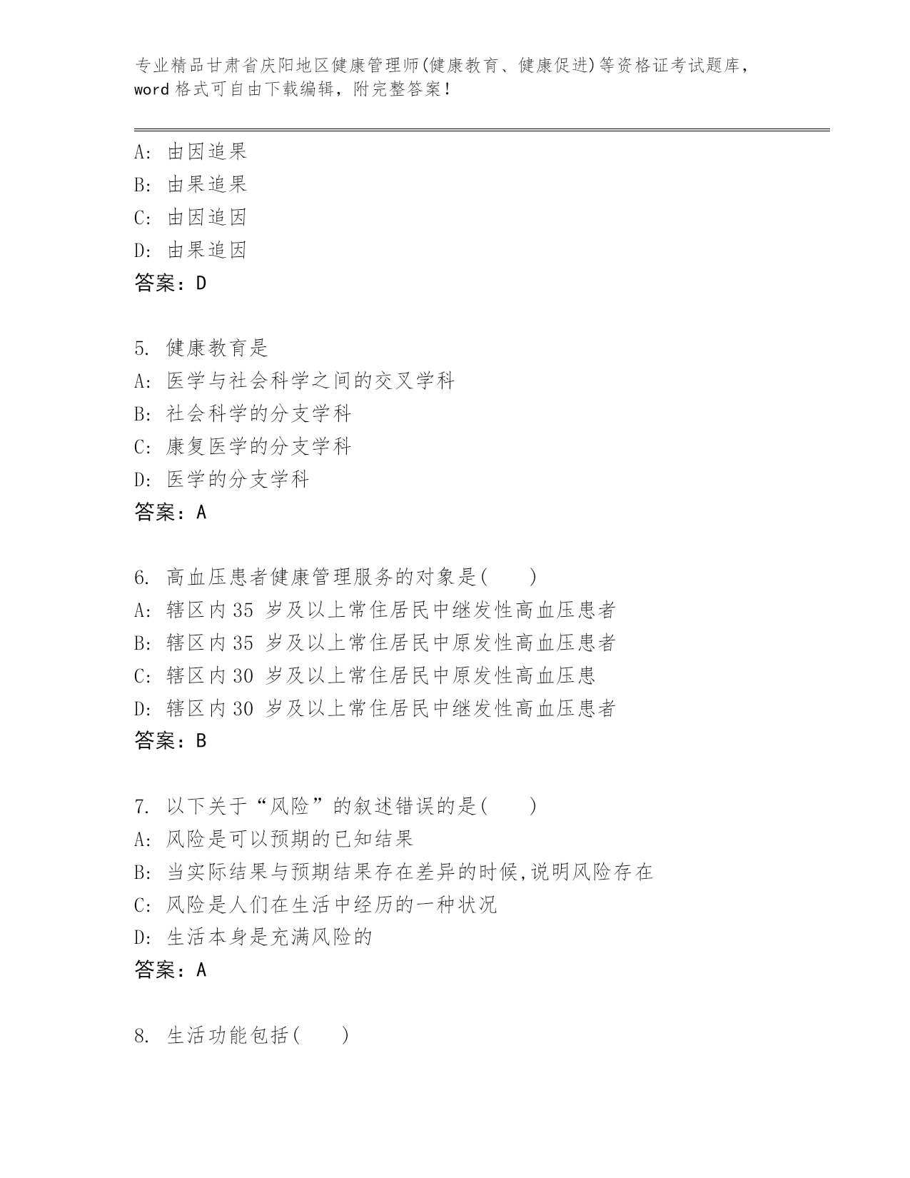 精品甘肃省庆阳地区健康管理师(健康教育、健康促进)等资格证考试完整版(预热题)