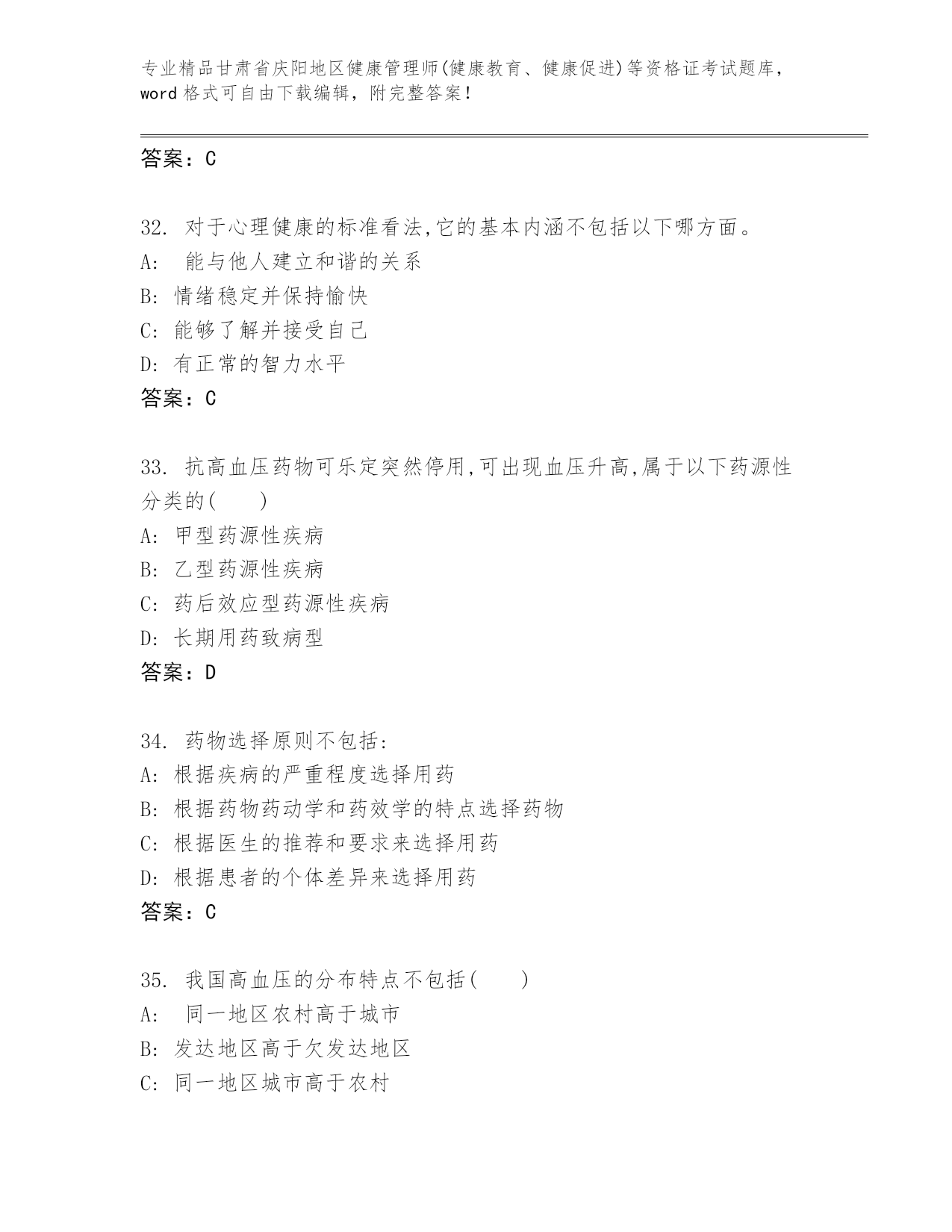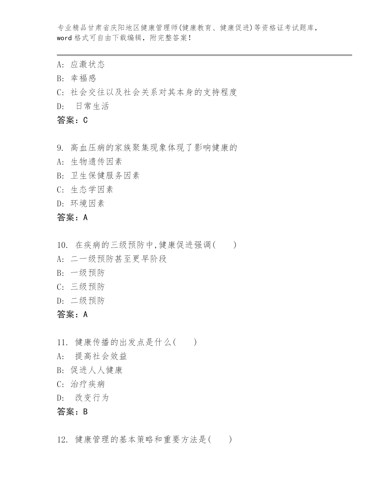 精品甘肃省庆阳地区健康管理师(健康教育、健康促进)等资格证考试完整版(预热题).docx