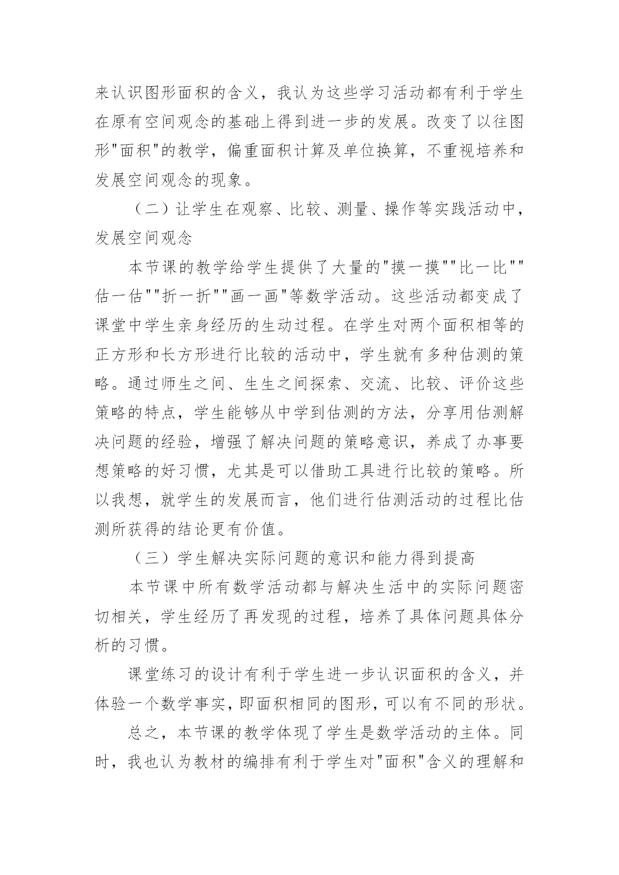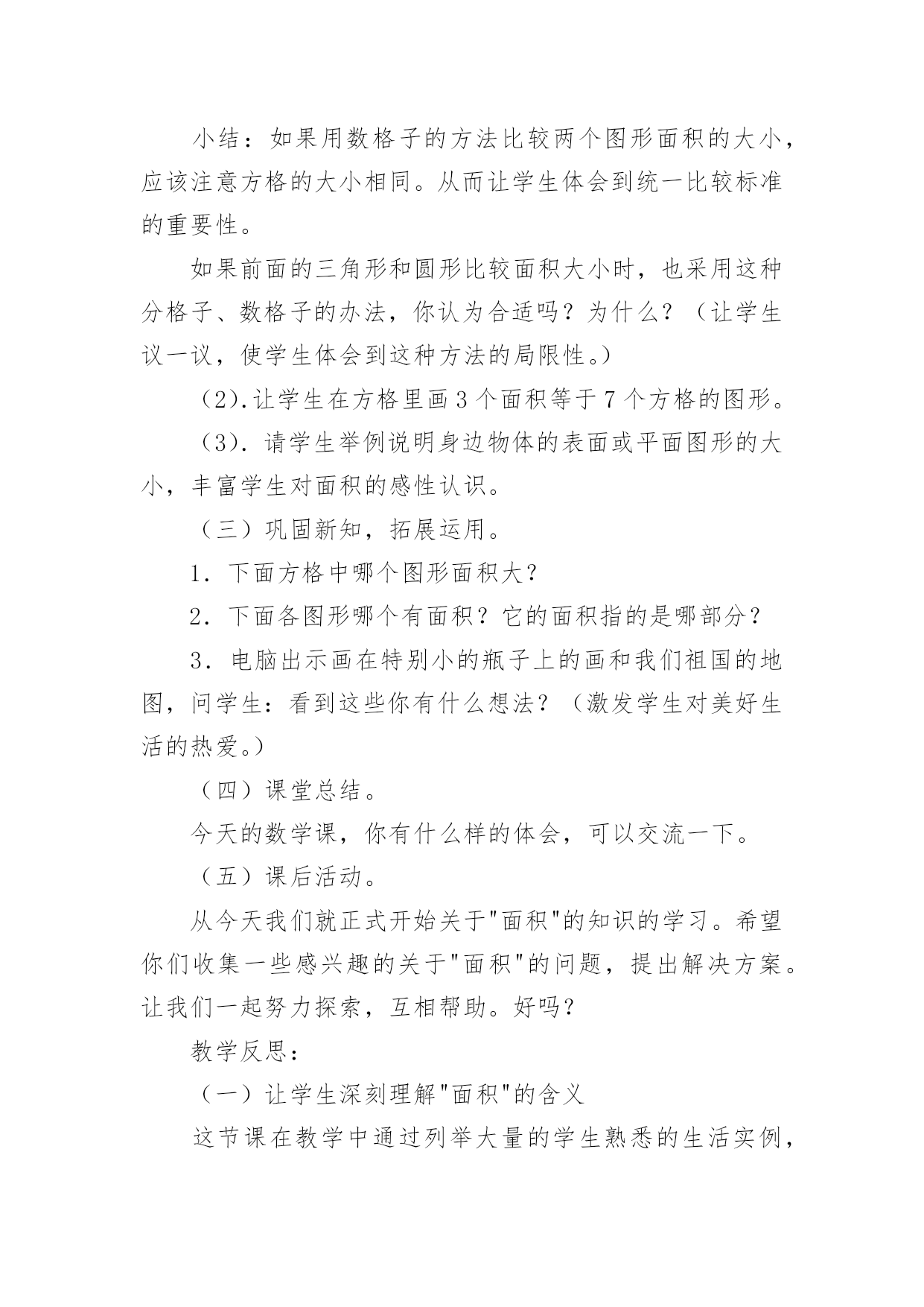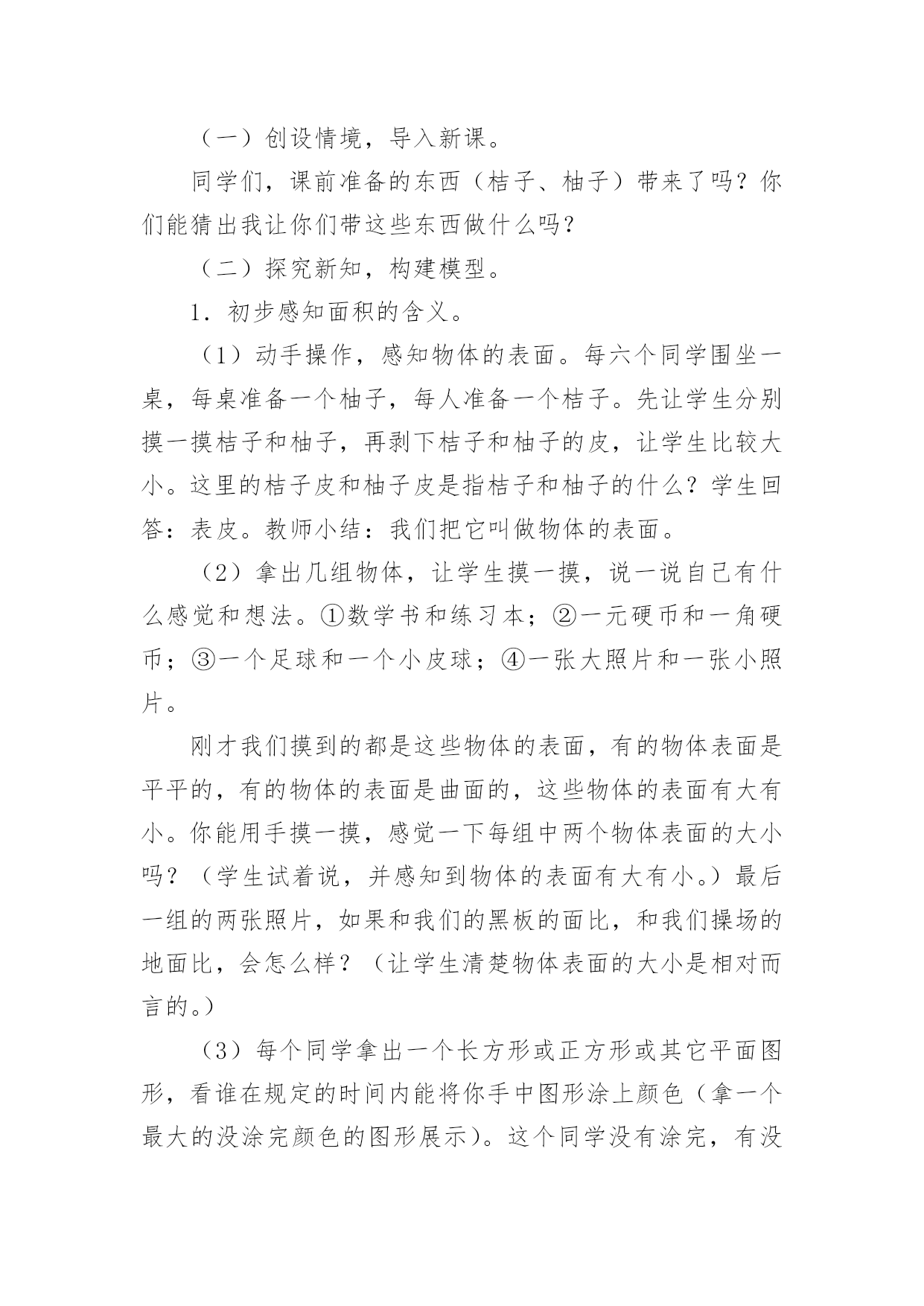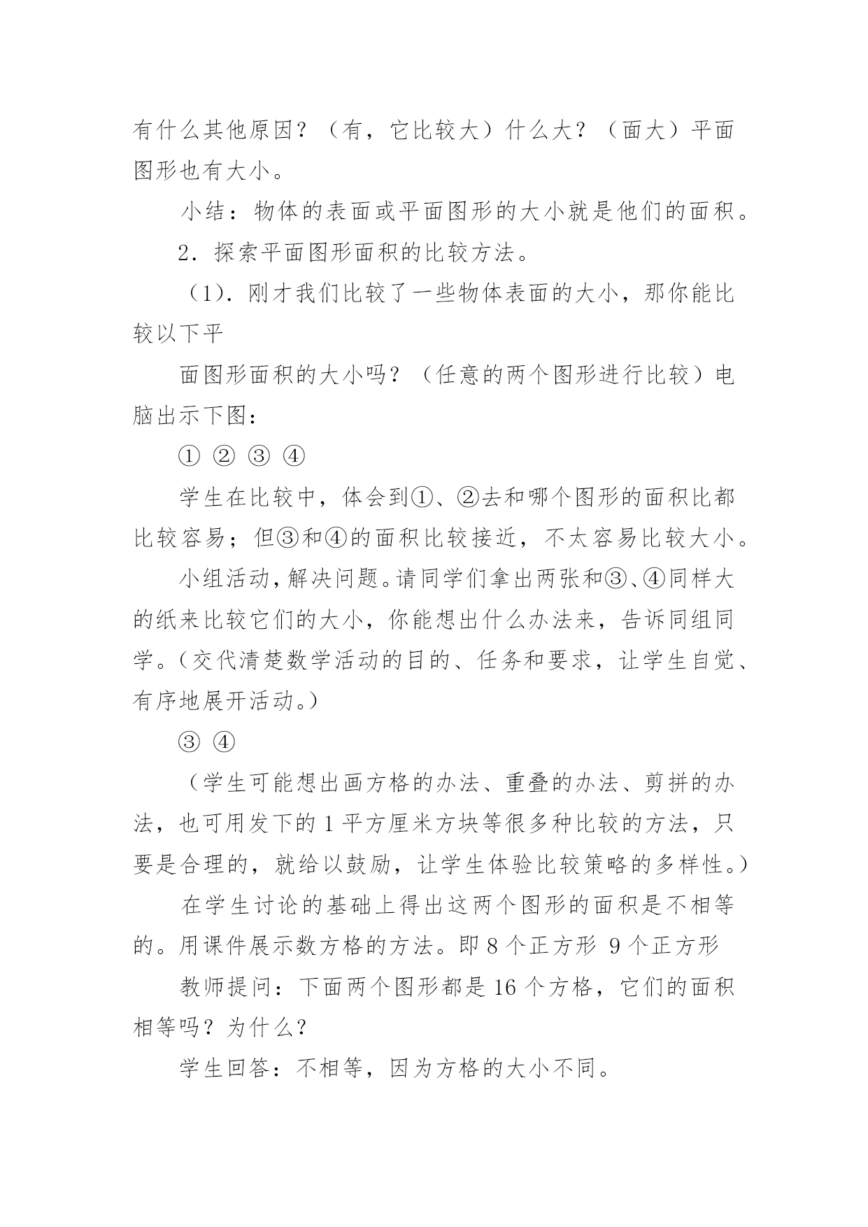 “面积”的教学设计作为一位不辞辛劳的人民教师,常常要根据教学需要编写教学设计,教学设计是实现教学目标的计划性和决策性活动。那么你有了解过教学设计吗?下面是小编精心整理的“面积”的教学设计,欢迎大家分享。教学内容:《九年义务教育课程标准实验教科书o数学》(北师大版)三年级(下册)第42、43页。教学目标:●知识与技能目标在比较物体表面或平面图形的大小的过程中体会面积的含义,知道物体的表面和平面图形有大小之分,能选择不同的方法比较物体表面或平面图形面积的大小。●数学思考、解决问题1.体会利用数格子来比较面积大小的方法,并感知其局限性,体会到在比较面积大小的时候统一标准的必要性。2.建立探索式的学习方式,提高解决问题的能力。●情感与态度目标让学生在有趣的数学活动中体验数学学习的乐趣,增强学生学习数学的自信心;通过分享用估测解决问题的经验,从而增强解决问题的策略意识,养成办事要想策略的好习惯。教学过程:(一)创设情境,导入新课。同学们,课前准备的东西(桔子、柚子)带来了吗?你们能猜出我让你们带这些东西做什么吗?(二)探究新知,构建模型。1.初步感知面积的含义。(1)动手操作,感知物体的表面。每六个同学围坐一桌,每桌准备一个柚子,每人准备一个桔子。先让学生分别摸一摸桔子和柚子,再剥下桔子和柚子的皮,让学生比较大小。这里的桔子皮和柚子皮是指桔子和柚子的什么?学生回答:表皮。教师小结:我们把它叫做物体的表面。(2)拿出几组物体,让学生摸一摸,说一说自己有什么感觉和想法。①数学书和练习本;②一元硬币和一角硬币;③一个足球和一个小皮球;④一张大照片和一张小照片。刚才我们摸到的都是这些物体的表面,有的物体表面是平平的,有的物体的表面是曲面的,这些物体的表面有大有小。你能用手摸一摸,感觉一下每组中两个物体表面的大小吗?(学生试着说,并感知到物体的表面有大有小。)最后一组的两张照片,如果和我们的黑板的面比,和我们操场的地面比,会怎么样?(让学生清楚物体表面的大小是相对而言的。)(3)每个同学拿出一个长方形或正方形或其它平面图形,看谁在规定的时间内能将你手中图形涂上颜色(拿一个最大的没涂完颜色的图形展示)。这个同学没有涂完,有没有什么其他原因?(有,它比较大)什么大?(面大)平面图形也有大小。小结:物体的表面或平面图形的大小就是他们的面积。2.探索平面图形面积的比较方法。(1).刚才我们比较了一些物体表面的大小,那你能比较以下平面图形面积的大小吗?(任意的两个图形进行比较)电脑出示下图:①②③④学生在比较中,体会到①、②去和哪个图形的面积比都比较容易;但③和④的面积比较接近,不太容易比较大小。小组活动,解决问题。请同学们拿出两张和③、④同样大的纸来比较它们的大小,你能想出什么办法来,告诉同组同学。(交代清楚数学活动的目的、任务和要求,让学生自觉、有序地展开活动。)③④(学生可能想出画方格的办法、重叠的办法、剪拼的办法,也可用发下的1平方厘米方块等很多种比较的方法,只要是合理的,就给以鼓励,让学生体验比较策略的多样性。)在学生讨论的基础上得出这两个图形的面积是不相等的。用课件展示数方格的方法。即8个正方形9个正方形教师提问:下面两个图形都是16个方格,它们的面积相等吗?为什么?学生回答:不相等,因为方格的大小不同。小结:如果用数格子的方法比较两个图形面积的大小,应该注意方格的大小相同。从而让学生体会到统一比较标准的重要性。如果前面的三角形和圆形比较面积大小时,也采用这种分格子、数格子的办法,你认为合适吗?为什么?(让学生议一议,使学生体会到这种方法的局限性。)(2).让学生在方格里画3个面积等于7个方格的图形。(3).请学生举例说明身边物体的表面或平面图形的大小,丰富学生对面积的感性认识。(三)巩固新知,拓展运用。1.下面方格中哪个图形面积大?2.下面各图形哪个有面积?它的面积指的是哪部分?3.电脑出示画在特别小的瓶子上的画和我们祖国的地图,问学生:看到这些你有什么想法?(激发学生对美好生活的热爱。)(四)课堂总结。今天的数学课,你有什么样的体会,可以交流一下。(五)课后活动。从今天我们就正式开始关于"面积"的知识的学习。希望你们收集一些感兴趣的关于"面积"的问题,提出解决方案。让我们一起努力探索,互相帮助。好吗?教学反思:(一)让学生深刻理解"面积"的含义这节课在教学中通过列举大量的学生熟悉的生活实例,来认识图形面积的含义,我认为这些学习活动都有利于学生在原有空间观念的基础上得到进一步的发展。改变了以往图形"面积"的教学,偏重面积计算及单位换算,不重视培养和发展空间观念的现象。(二)让学生在观察、比较、测量、操作等实践活动中,发展空间观念本节课的教学给学生提供了大量的"摸一摸""比一比""估一估""折一折""画一画"等数学活动。这些活动都变成了课堂