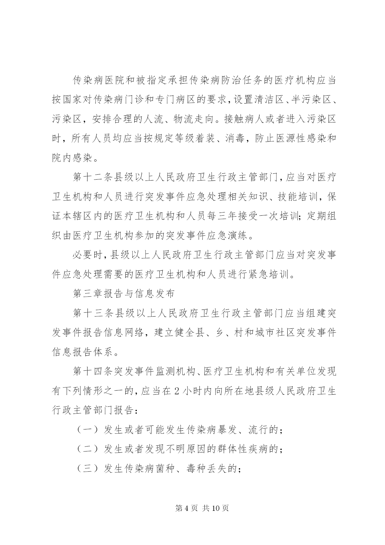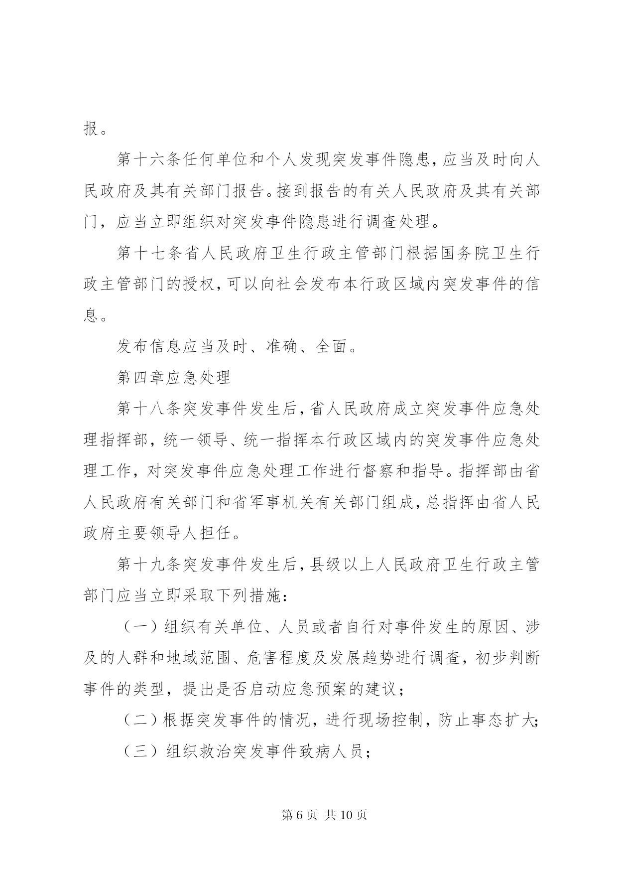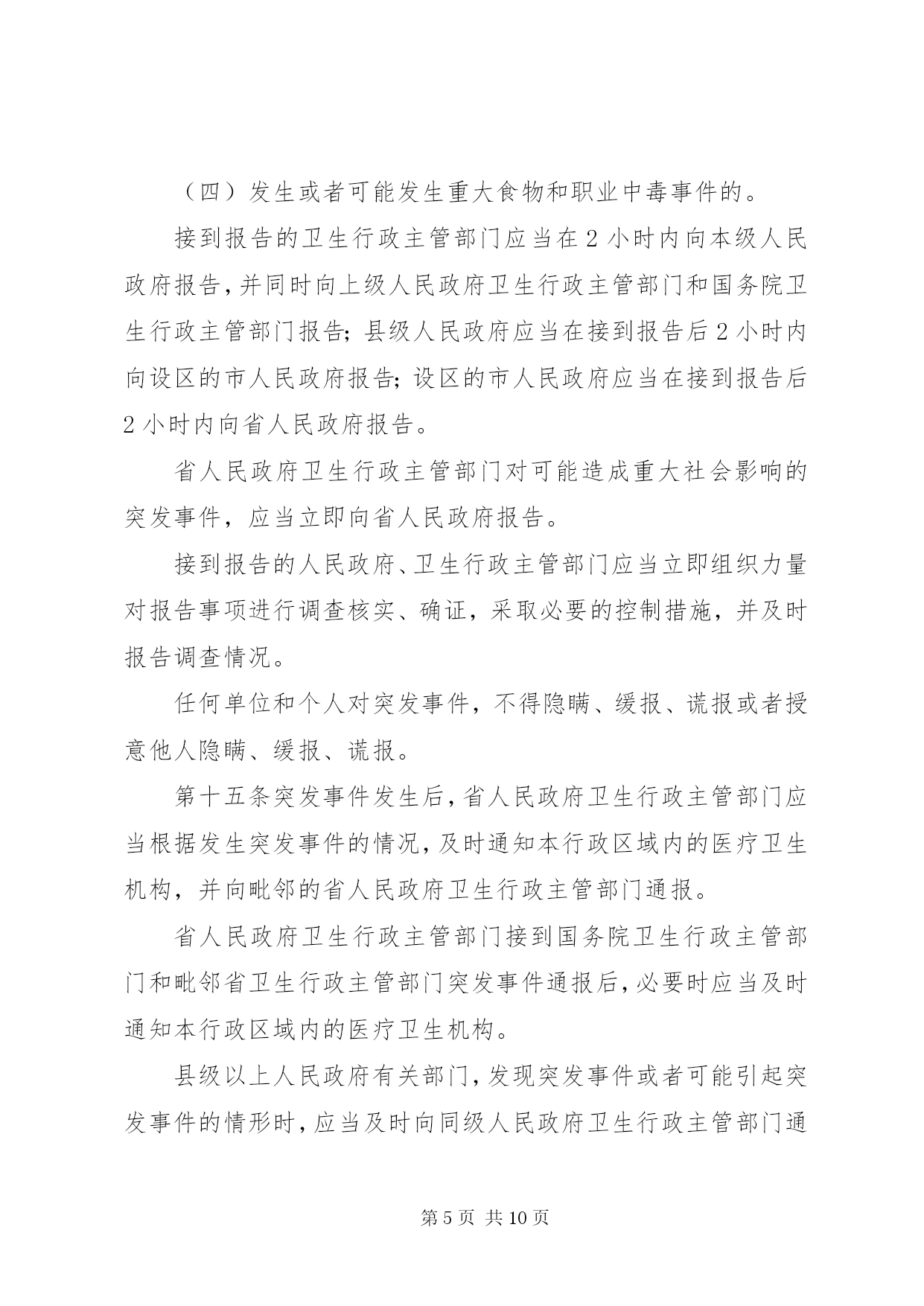 第PAGE\*Arabic\*MERGEFORMAT10页共NUMPAGES\*MERGEFORMAT10页突发公共卫生事件制度第一章总则第一条为了有效预防、及时控制和消除突发公共卫生事件的危害,保障公众身体健康与生命安全,维护正常的社会秩序,根据《突发公共卫生事件应急条例》和其他有关法律法规的规定,制定本办法。第二条本办法所称突发公共卫生事件(以下简称突发事件),是指突然发生,造成或者可能造成社会公众健康严重损害的重大传染病疫情、群体性不明原因疾病、重大食物和职业中毒以及其他严重影响公众健康的事件。第三条在本省行政区域内应急突发事件适用本办法。第四条县级以上人民政府统一领导、统一指挥、统筹协调本行政区域内突发事件应急工作。县级以上人民政府卫生行政主管部门和其他有关部门在各自职责范围内负责突发事件应急的有关工作。乡镇人民政府和街道办事处在上级人民政府领导下,开展突发事件应急工作。第五条县级以上人民政府及其有关部门,应当建立严格的突发事件防范和应急处理责任制,切实履行各自的职责,保证突发事件应急处理工作的正常进行,其主要领导人是第一责任人。第六条村民委员会、居民委员会应当协助当地政府开展突发事件应急工作。任何单位和个人有义务配合做好突发事件应急处理工作。任何单位和个人有权举报政府及其有关部门不履行突发事件应急处理职责或者不按照规定履行职责的情况。第二章预防与应急准备第七条省人民政府根据全国突发事件应急预案(以下简称应急预案),制定本省行政区域的应急预案。省人民政府有关部门、县级以上人民政府及其有关部门应当根据应急预案的要求,制定本地区和本部门的应急实施预案。应急预案和应急实施预案,应当根据突发事件的变化和实施中发现的问题及时修订、补充。第八条应急预案包括以下主要内容:(一)突发事件应急处理指挥部的组成和相关部门的职责;(二)突发事件的监测与预警;(三)突发事件信息的收集、分析、报告、通报制度;(四)突发事件应急处理技术和监测机构及其任务;(五)突发事件的分级和应急处理工作方案;(六)突发事件预防、现场控制,应急设施、设备、救治药品和医疗器械以及其他物资和技术的储备与调度;(七)突发事件应急处理专业队伍的建设和培训。第九条县级以上人民政府应当根据应急预案的要求,建立突发事件应急流行病学调查、传染源隔离、医疗救护、现场处理、监督检查、监测检验、卫生防护等有关物资、设备、设施、技术与人才资源储备,开展防治突发事件相关科学研究,所需经费列入本级政府财政预算。第十条县级以上人民政府应当根据国家突发事件预防控制体系建设的要求,建立和完善突发事件监测和预警系统。疾病预防控制机构负责开展突发事件监测、预警的日常工作。疾病预防控制机构和纳入突发事件监测、预警系统的城市社区卫生组织、乡村卫生组织,应当按照国家统一的监测规范,制定监测计划,科学分析、综合评价监测数据,按照本办法规定的程序和时限报告发现的突发事件潜在隐患以及可能发生的突发事件。县级以上人民政府应当为城市社区卫生组织、乡村卫生组织开展突发事件监测工作提供必要的条件。第十一条县级以上人民政府应当加强疾病预防控制机构、医疗急救服务机构的建设,为其配备相应的现场快速检测监测、实验室检验、交通、通讯、医疗救治仪器、设备、工具及药物、试剂和专业技术人员,提高应对突发事件的能力。设区的市人民政府应当设置与传染病防治工作需要相适应的传染病专科医院,或者指定具备传染病防治条件和能力的医疗机构承担传染病防治任务。县级卫生行政主管部门应当指定一所医疗机构设立传染病隔离病房,进行医学观察与隔离治疗。传染病医院和被指定承担传染病防治任务的医疗机构应当按国家对传染病门诊和专门病区的要求,设置清洁区、半污染区、污染区,安排合理的人流、物流走向。接触病人或者进入污染区时,所有人员均应当按规定等级着装、消毒,防止医源性感染和院内感染。第十二条县级以上人民政府卫生行政主管部门,应当对医疗卫生机构和人员进行突发事件应急处理相关知识、技能培训,保证本辖区内的医疗卫生机构和人员每三年接受一次培训;定期组织由医疗卫生机构参加的突发事件应急演练。必要时,县级以上人民政府卫生行政主管部门应当对突发事件应急处理需要的医疗卫生机构和人员进行紧急培训。第三章报告与信息发布第十三条县级以上人民政府卫生行政主管部门应当组建突发事件报告信息网络,建立健全县、乡、村和城市社区突发事件信息报告体系。第十四条突发事件监测机构、医疗卫生机构和有关单位发现有下列情形之一的,应当在2小时内向所在地县级人民政府卫生行政主管部门报告:(一)发生或者可能发生传染病暴发、流行的;(二)发生或者发现不明原因的群体性疾病的;(三)发生传染病菌种、毒种丢失的;(四)发生或者可能发生重大食物和职业中毒事件的。接到报告的卫生行政主管部门应当在2小时