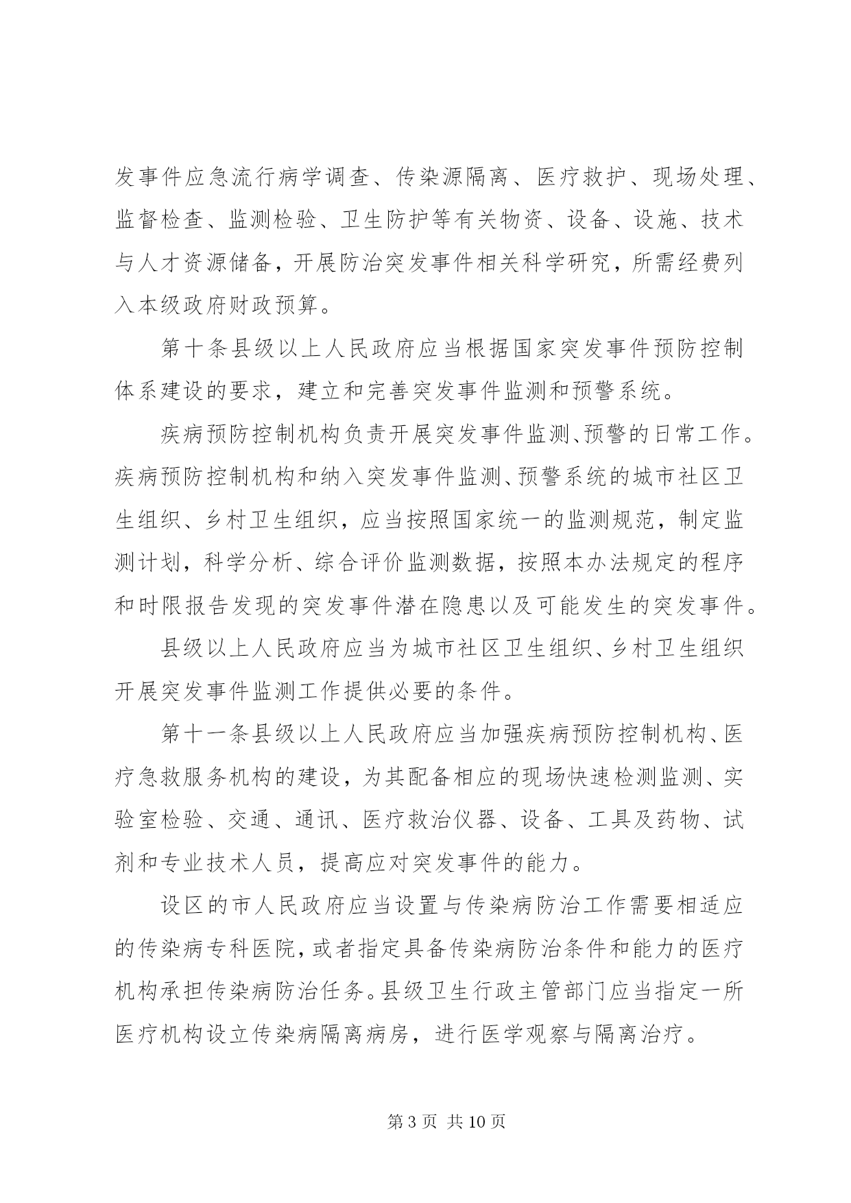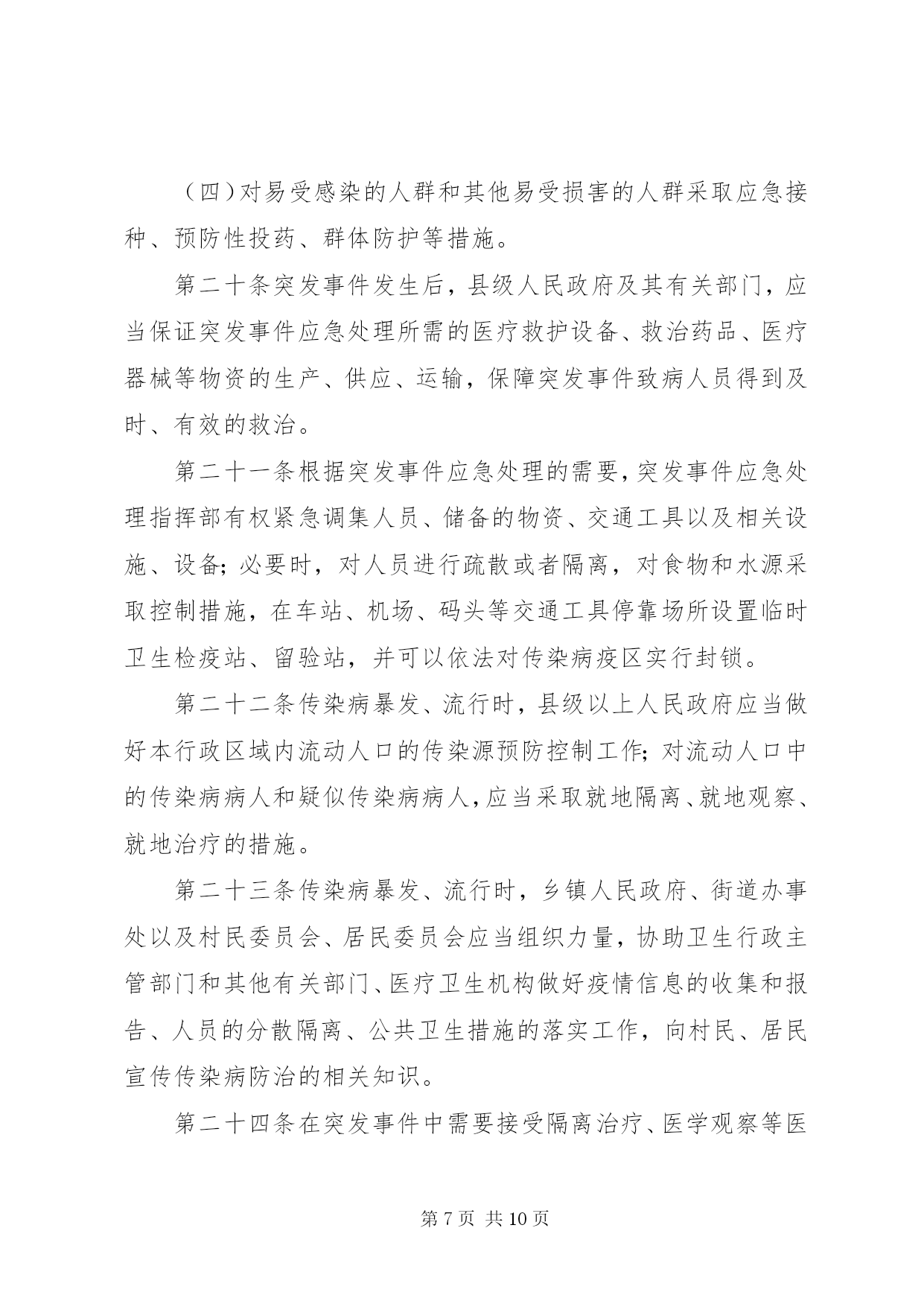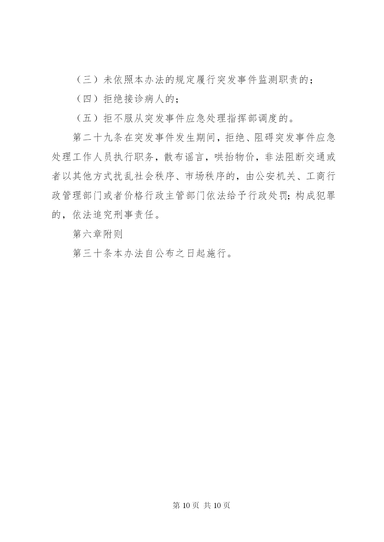 第PAGE\*Arabic\*MERGEFORMAT10页共NUMPAGES\*MERGEFORMAT10页突发公共卫生事件制度第一章总则第一条为了有效预防、及时控制和消除突发公共卫生事件的危害,保障公众身体健康与生命安全,维护正常的社会秩序,根据《突发公共卫生事件应急条例》和其他有关法律法规的规定,制定本办法。第二条本办法所称突发公共卫生事件(以下简称突发事件),是指突然发生,造成或者可能造成社会公众健康严重损害的重大传染病疫情、群体性不明原因疾病、重大食物和职业中毒以及其他严重影响公众健康的事件。第三条在本省行政区域内应急突发事件适用本办法。第四条县级以上人民政府统一领导、统一指挥、统筹协调本行政区域内突发事件应急工作。县级以上人民政府卫生行政主管部门和其他有关部门在各自职责范围内负责突发事件应急的有关工作。乡镇人民政府和街道办事处在上级人民政府领导下,开展突发事件应急工作。第五条县级以上人民政府及其有关部门,应当建立严格的突发事件防范和应急处理责任制,切实履行各自的职责,保证突发事件应急处理工作的正常进行,其主要领导人是第一责任人。第六条村民委员会、居民委员会应当协助当地政府开展突发事件应急工作。任何单位和个人有义务配合做好突发事件应急处理工作。任何单位和个人有权举报政府及其有关部门不履行突发事件应急处理职责或者不按照规定履行职责的情况。第二章预防与应急准备第七条省人民政府根据全国突发事件应急预案(以下简称应急预案),制定本省行政区域的应急预案。省人民政府有关部门、县级以上人民政府及其有关部门应当根据应急预案的要求,制定本地区和本部门的应急实施预案。应急预案和应急实施预案,应当根据突发事件的变化和实施中发现的问题及时修订、补充。第八条应急预案包括以下主要内容:(一)突发事件应急处理指挥部的组成和相关部门的职责;(二)突发事件的监测与预警;(三)突发事件信息的收集、分析、报告、通报制度;(四)突发事件应急处理技术和监测机构及其任务;(五)突发事件的分级和应急处理工作方案;(六)突发事件预防、现场控制,应急设施、设备、救治药品和医疗器械以及其他物资和技术的储备与调度;(七)突发事件应急处理专业队伍的建设和培训。第九条县级以上人民政府应当根据应急预案的要求,建立突发事件应急流行病学调查、传染源隔离、医疗救护、现场处理、监督检查、监测检验、卫生防护等有关物资、设备、设施、技术与人才资源储备,开展防治突发事件相关科学研究,所需经费列入本级政府财政预算。第十条县级以上人民政府应当根据国家突发事件预防控制体系建设的要求,建立和完善突发事件监测和预警系统。疾病预防控制机构负责开展突发事件监测、预警的日常工作。疾病预防控制机构和纳入突发事件监测、预警系统的城市社区卫生组织、乡村卫生组织,应当按照国家统一的监测规范,制定监测计划,科学分析、综合评价监测数据,按照本办法规定的程序和时限报告发现的突发事件潜在隐患以及可能发生的突发事件。县级以上人民政府应当为城市社区卫生组织、乡村卫生组织开展突发事件监测工作提供必要的条件。第十一条县级以上人民政府应当加强疾病预防控制机构、医疗急救服务机构的建设,为其配备相应的现场快速检测监测、实验室检验、交通、通讯、医疗救治仪器、设备、工具及药物、试剂和专业技术人员,提高应对突发事件的能力。设区的市人民政府应当设置与传染病防治工作需要相适应的传染病专科医院,或者指定具备传染病防治条件和能力的医疗机构承担传染病防治任务。县级卫生行政主管部门应当指定一所医疗机构设立传染病隔离病房,进行医学观察与隔离治疗。传染病医院和被指定承担传染病防治任务的医疗机构应当按国家对传染病门诊和专门病区的要求,设置清洁区、半污染区、污染区,安排合理的人流、物流走向。接触病人或者进入污染区时,所有人员均应当按规定等级着装、消毒,防止医源性感染和院内感染。第十二条县级以上人民政府卫生行政主管部门,应当对医疗卫生机构和人员进行突发事件应急处理相关知识、技能培训,保证本辖区内的医疗卫生机构和人员每三年接受一次培训;定期组织由医疗卫生机构参加的突发事件应急演练。必要时,县级以上人民政府卫生行政主管部门应当对突发事件应急处理需要的医疗卫生机构和人员进行紧急培训。第三章报告与信息发布第十三条县级以上人民政府卫生行政主管部门应当组建突发事件报告信息网络,建立健全县、乡、村和城市社区突发事件信息报告体系。第十四条突发事件监测机构、医疗卫生机构和有关单位发现有下列情形之一的,应当在2小时内向所在地县级人民政府卫生行政主管部门报告:(一)发生或者可能发生传染病暴发、流行的;(二)发生或者发现不明原因的群体性疾病的;(三)发生传染病菌种、毒种丢失的;(四)发生或者可能发生重大食物和职业中毒事件的。接到报告的卫生行政主管部门应当在2小时