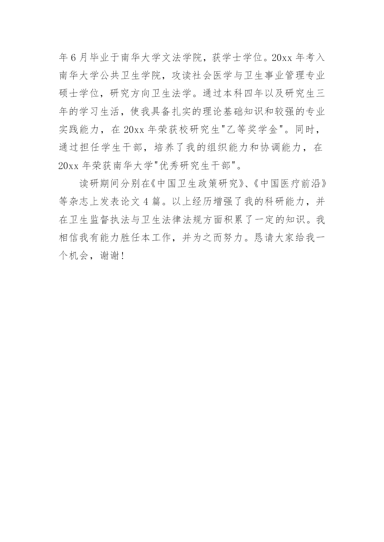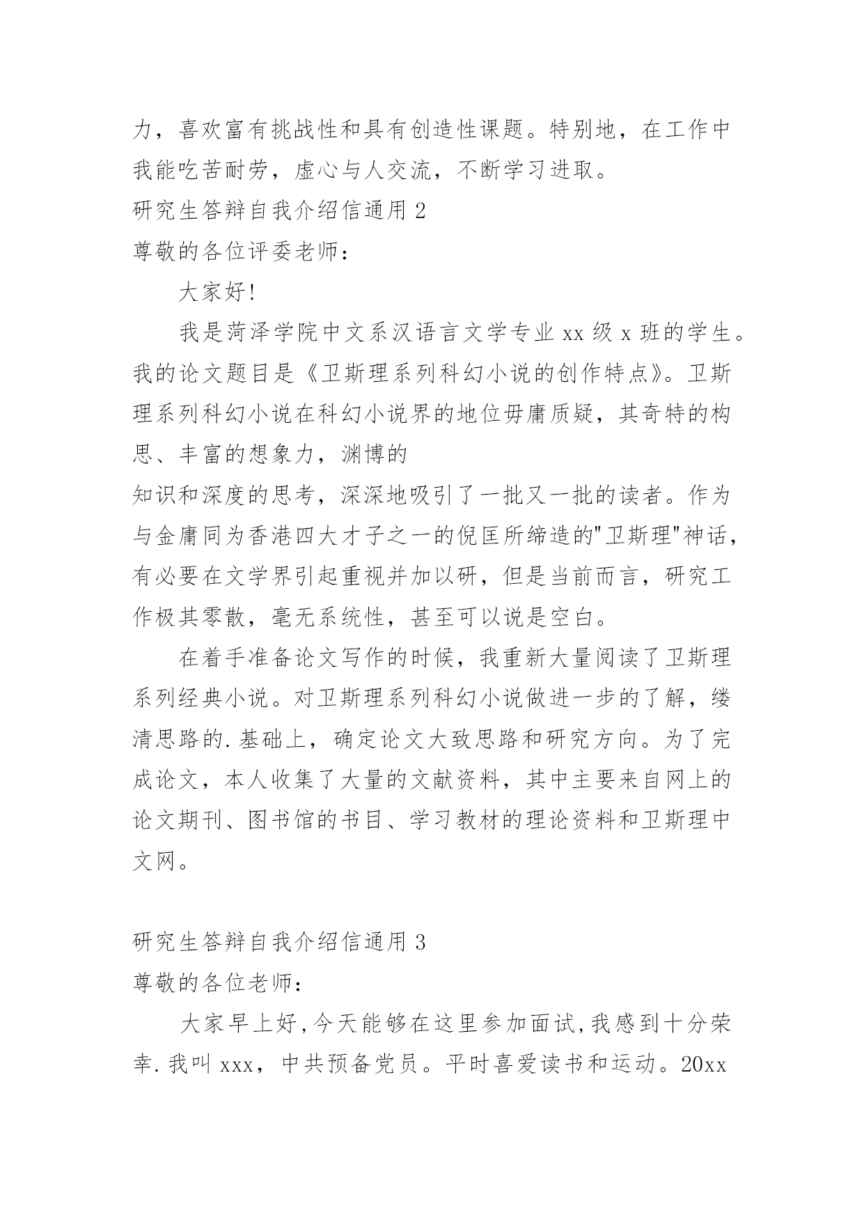 研究生答辩自我介绍信研究生答辩自我介绍信通用在日新月异的现代社会中,越来越多人会去使用介绍信,介绍信是介绍派出人员的身份和任务的专用信件。你所见过的介绍信是什么样的呢?以下是小编为大家收集的研究生答辩自我介绍信通用,欢迎阅读,希望大家能够喜欢。研究生答辩自我介绍信通用1我认为人生就是一个不断提升自己思想、道德、专业技术和生活品位的过程。我是一个对理想有着执着追求的完美主义者,但比起最终的结果我更加看中追求理想的那个艰辛的过程。我觉得是金子总会发光。一个人,不管他当前所处何种境遇,他的人生境界不能完全地被限定。当然一个人当前的才华也不能完全决定他将来全部的社会贡献。人的一生应该是一个奋发有为、不断超越和突破的过程!我为人热情,大方,英语流利,兼通纯粹数学和应用数学的基本专业技术。读研三年以来,对于专业课,我抱以极大的兴趣,广泛地学习了与微分几何、偏微分方程和拓扑学有关的现代数学课程。在思想认知方面,我认真研读了哲学、科学技术、美学等的基础内容及其历史,领略了先贤智慧的博大精深和道德的敬畏虔诚。关于将来的工作我有着较强的团队协作能力,能承受压力,喜欢富有挑战性和具有创造性课题。特别地,在工作中我能吃苦耐劳,虚心与人交流,不断学习进取。研究生答辩自我介绍信通用2尊敬的各位评委老师:大家好!我是菏泽学院中文系汉语言文学专业xx级x班的学生。我的论文题目是《卫斯理系列科幻小说的创作特点》。卫斯理系列科幻小说在科幻小说界的地位毋庸质疑,其奇特的构思、丰富的想象力,渊博的知识和深度的思考,深深地吸引了一批又一批的读者。作为与金庸同为香港四大才子之一的倪匡所缔造的"卫斯理"神话,有必要在文学界引起重视并加以研,但是当前而言,研究工作极其零散,毫无系统性,甚至可以说是空白。在着手准备论文写作的时候,我重新大量阅读了卫斯理系列经典小说。对卫斯理系列科幻小说做进一步的了解,缕清思路的.基础上,确定论文大致思路和研究方向。为了完成论文,本人收集了大量的文献资料,其中主要来自网上的论文期刊、图书馆的书目、学习教材的理论资料和卫斯理中文网。研究生答辩自我介绍信通用3尊敬的各位老师:大家早上好,今天能够在这里参加面试,我感到十分荣幸.我叫xxx,中共预备党员。平时喜爱读书和运动。20xx年6月毕业于南华大学文法学院,获学士学位。20xx年考入南华大学公共卫生学院,攻读社会医学与卫生事业管理专业硕士学位,研究方向卫生法学。通过本科四年以及研究生三年的学习生活,使我具备扎实的理论基础知识和较强的专业实践能力,在20xx年荣获校研究生"乙等奖学金"。同时,通过担任学生干部,培养了我的组织能力和协调能力,在20xx年荣获南华大学"优秀研究生干部"。读研期间分别在《中国卫生政策研究》、《中国医疗前沿》等杂志上发表论文4篇。以上经历增强了我的科研能力,并在卫生监督执法与卫生法律法规方面积累了一定的知识。我相信我有能力胜任本工作,并为之而努力。恳请大家给我一个机会,谢谢!