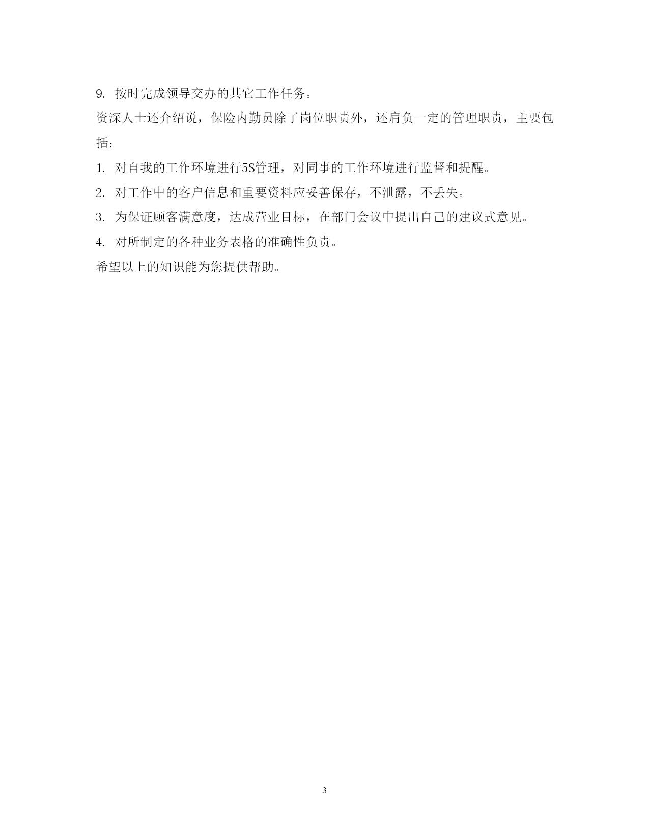 此资料由网络收集而来,如有侵权请告知上传者立即删除。资料共分享,我们负责传递知识。PAGEPAGE3保险内勤岗位职责篇一:5-保险内勤工作内容保险内勤工作内容内勤在企事业单位里是一个重要的组成部分,几乎涉及单位整体运作的方方面面。保险内勤主要配合相关内勤主管进行单证整理,出单及保单核对,业务相关资料录入存档等工作。总体来说工作比较琐碎,熟悉计算机操作及EXCEL表格的人员优势比较大。下面乔布简历小编就给大家讲一下保险内勤工作内容:主要的工作内容:出单及核对保单,提醒外勤续保;录入与存档业务相关的资料;配合内勤主管进行单证整理。从思想上坚定信心,明确方向,充分认识市场形势。利用各种机会,转变工作人员的观念,增强公司凝聚力。针对全年各阶段经营重点,积极配合公司各项安排,结合实际情况,适时推出竞赛方案,有针对性的进行业绩拉动。团队主管强化目标意识,增强主管的带动意识;团队精英强化荣誉感,加强训练和培养。针对各个层级人员,明确职责定位,强化岗位意识和工作责任心。促进各个部门传达咨询,研讨工作方法,商议各类问题。除此之外,还有理赔内勤:负责接报案,审核索赔材料是否齐全有效,缮制赔案,提交审批等;理赔外勤:负责案件的现场查勘和核定损失,相对于业务员,仍然属于内勤;财务内勤:与其它单位职责差不多,不同的是还包括应收保费的控制。以上就是乔布简历小编给大家整理的保险内勤工作内容,希望对大家能有所帮助。本文来源个人简历模板http://cv.qiaobutang.com/篇二:保险公司内勤组织架构与工作职责保险公司内勤组织架构与工作职责一、个人业务部工作职责:??????根据公司业务发展战略,拟订实施业务;推动、队伍发展、品质提升、产品销售等方面的经营策略;个险业务计划的制订与推动;营销队伍管理制度的实施;营销政策的宣导和业务进程的追踪,协调与相关部门的工作安排;销售队伍薪酬、考核、品质管理。二、教育培训部工作职责:????协助个人业务部开展业务人员制式培训,根据需求安排非制式培训;专、兼职讲师队伍培养;诊断培训需求,规划培训课程,进行教学研究和课程开发;培训教材编写和培训资料管理。篇三:汽车4S知识-保险内勤员岗位职责汽车4S知识-保险内勤员岗位职责汽车4S店保险内勤员岗位职责有哪些呢?想必很多初进此行业的人都不是很清楚,今天请汽车4S店资深人士为大家伙儿讲述汽车4S店保险内勤员的岗位职责。资深人士介绍说,汽车4S店保险内勤员的岗位职责内容包括:1.收集保险维修竣工的维修单据,协助保险理赔员完善手续2.负责车辆的事故车定损金额核算,填写理赔案件。3.向顾客介绍公司保险政策。4.协调保险公司车险部门相关人员,配合财务部做好保险理赔台帐的对帐工作。5.协助保险理赔员接待保险事故车。6.对每日、周、也的业务数据进行汇总,上报至保险主管。7.准时参加公司开放的培训课程及会议。8.开发潜在保险用户,建议保险到期用户续保。9.按时完成领导交办的其它工作任务。资深人士还介绍说,保险内勤员除了岗位职责外,还肩负一定的管理职责,主要包括:1.对自我的工作环境进行5S管理,对同事的工作环境进行监督和提醒。2.对工作中的客户信息和重要资料应妥善保存,不泄露,不丢失。3.为保证顾客满意度,达成营业目标,在部门会议中提出自己的建议式意见。4.对所制定的各种业务表格的准确性负责。希望以上的知识能为您提供帮助。