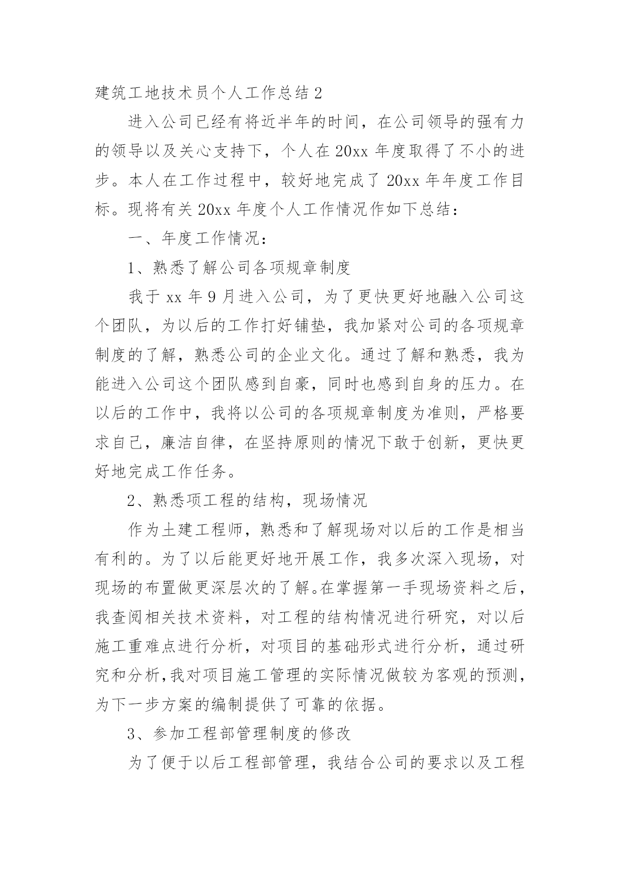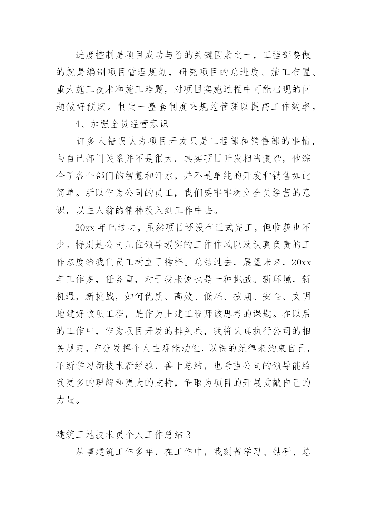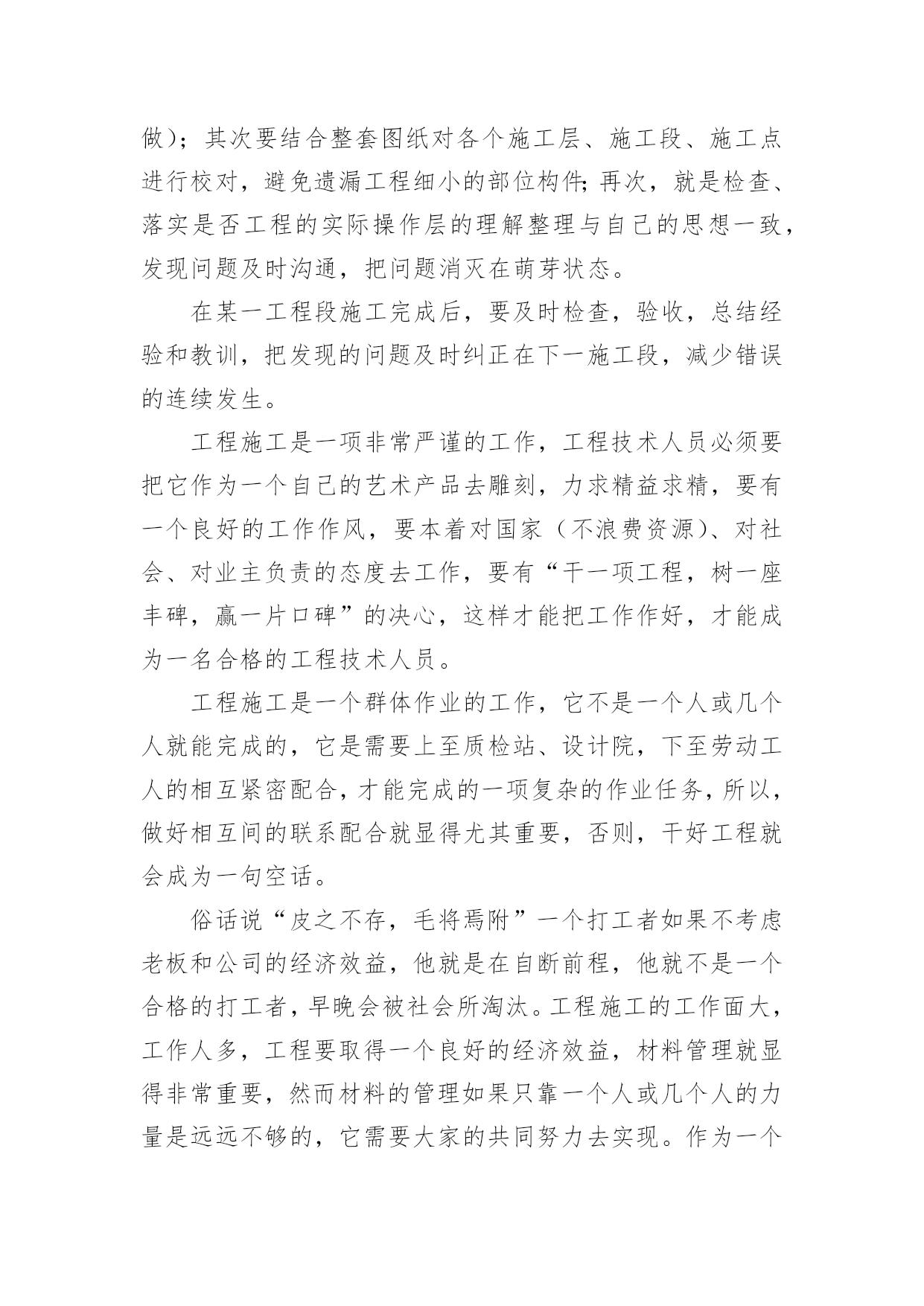 建筑工地技术员个人工作总结总结就是把一个时间段取得的成绩、存在的问题及得到的经验和教训进行一次全面系统的总结的书面材料,它可使零星的、肤浅的、表面的感性认知上升到全面的、系统的、本质的理性认识上来,不妨坐下来好好写写总结吧。我们该怎么去写总结呢?以下是小编整理的建筑工地技术员个人工作总结,仅供参考,欢迎大家阅读。建筑工地技术员个人工作总结1本人在毕业后就参加了工作,一直在施工单位从事技术施工,有一定的施工经验,并且有信心把xx楼工程圆满地交给业主使用。工程施工是按照设计图纸把设计师的思想完成从意识形态到实物形态的转变过程,要搞好工程施工,就必须首先熟悉施工图纸,掌据设计师的意图,完成从图纸了解设计意图再回头修订图纸的过程(即完成图纸的施工前会审),其次要强化对图纸的了解程度,熟悉工程的基本概况,考虑具体的施工方案,初步明确工程技术施工的重点、难点,为以后的施工操作行为做准备。在工程施工过程中,测量放线工作是重中之重,它贯穿整个工程施工的始终,是工程施工的灵魂,要想工程干好,必须把测量放线的工作做好,所以施测、校对、复核的程序就一个都不能少(并且施测、复核的工作要有不同的人来做);其次要结合整套图纸对各个施工层、施工段、施工点进行校对,避免遗漏工程细小的部位构件;再次,就是检查、落实是否工程的实际操作层的理解整理与自己的思想一致,发现问题及时沟通,把问题消灭在萌芽状态。在某一工程段施工完成后,要及时检查,验收,总结经验和教训,把发现的问题及时纠正在下一施工段,减少错误的连续发生。工程施工是一项非常严谨的工作,工程技术人员必须要把它作为一个自己的艺术产品去雕刻,力求精益求精,要有一个良好的工作作风,要本着对国家(不浪费资源)、对社会、对业主负责的态度去工作,要有“干一项工程,树一座丰碑,赢一片口碑”的决心,这样才能把工作作好,才能成为一名合格的工程技术人员。工程施工是一个群体作业的工作,它不是一个人或几个人就能完成的,它是需要上至质检站、设计院,下至劳动工人的相互紧密配合,才能完成的一项复杂的作业任务,所以,做好相互间的联系配合就显得尤其重要,否则,干好工程就会成为一句空话。俗话说“皮之不存,毛将焉附”一个打工者如果不考虑老板和公司的经济效益,他就是在自断前程,他就不是一个合格的打工者,早晚会被社会所淘汰。工程施工的工作面大,工作人多,工程要取得一个良好的经济效益,材料管理就显得非常重要,然而材料的管理如果只靠一个人或几个人的力量是远远不够的,它需要大家的共同努力去实现。作为一个技术员,对材料的管理既要从技术的角度去考虑如何节约,还要配合项目经理和同事对现场进行有效的监控,使现场的工人养成节约材料的良好习惯,为公司创造更好的经济效益,为自己的发展奠定良好的基础。工程工期的长短也是体现一个工程经济效益的重要指标,工期的缩短不但能使工程提前投入运营,为甲方创造可观的收益,也可以减少我们施工单位众多机械、材料的租赁费,减少人员管理的费用,为公司为老板降低施工成本,提高经济效益;在这个方面甲方和我们施工单位的利益空前一致,所以工程的工期是大家共同关注的焦点,作为工程管理人员中的一员,协助项目经理,大家一起出谋划策缩短工程工期就是义不容辞。一个人的能力和精力是有限的,为了能更好的正确理解图纸和规范,勤沟通,事前请示就能避免很多不必要的争辩和返工,达到大家思想的一致统一,使工程能够顺利、如期地达到计划要求。我虽然年纪较轻,工作阅历不太深,施工经验有限,但我会发挥年轻人的好学、勤快、能吃苦耐劳、精力冲沛等优势,弥补以上的缺点,勤学勤问,努力成为一个优秀的技术人才,为宏升公司的发展尽力。我喜欢我的专业,更热爱我的岗位,我相信,在甲方和工程部的指导下,x楼工程能够顺利地进行施工,并按照合同的要求圆满地完成竣工验收的任务。建筑工地技术员个人工作总结2进入公司已经有将近半年的时间,在公司领导的强有力的领导以及关心支持下,个人在20xx年度取得了不小的进步。本人在工作过程中,较好地完成了20xx年年度工作目标。现将有关20xx年度个人工作情况作如下总结:一、年度工作情况:1、熟悉了解公司各项规章制度我于xx年9月进入公司,为了更快更好地融入公司这个团队,为以后的工作打好铺垫,我加紧对公司的各项规章制度的了解,熟悉公司的企业文化。通过了解和熟悉,我为能进入公司这个团队感到自豪,同时也感到自身的压力。在以后的工作中,我将以公司的各项规章制度为准则,严格要求自己,廉洁自律,在坚持原则的情况下敢于创新,更快更好地完成工作任务。2、熟悉项工程的结构,现场情况作为土建工程师,熟悉和了解现场对以后的工作是相当有利的。为了以后能更好地开展工作,我多次深入现场,对现场的布置做更深层次的了解。在掌握第一手现场资料之后,我查阅相关技术资料,对工程的结构情况进行研究,对以后