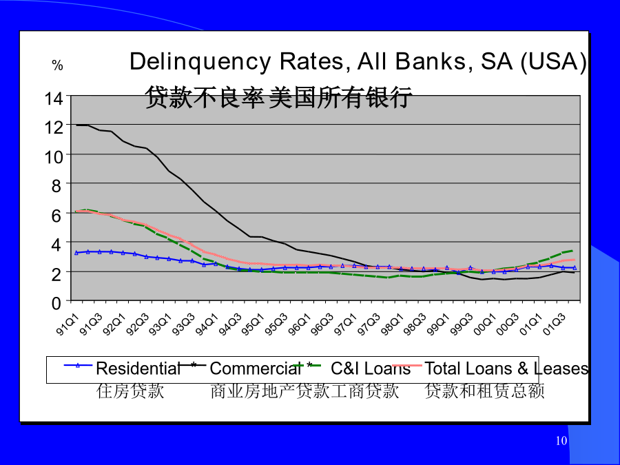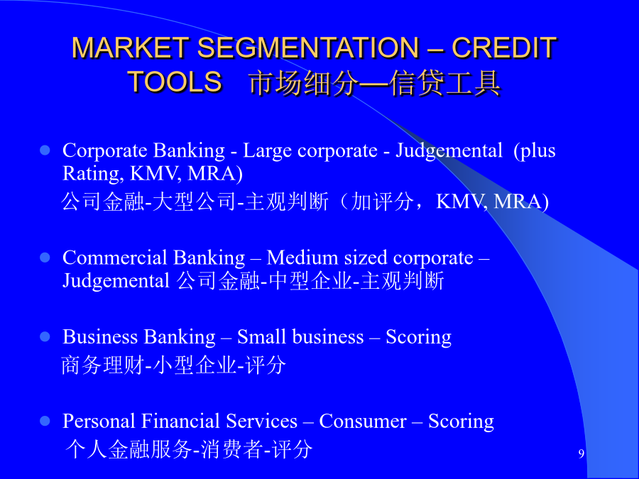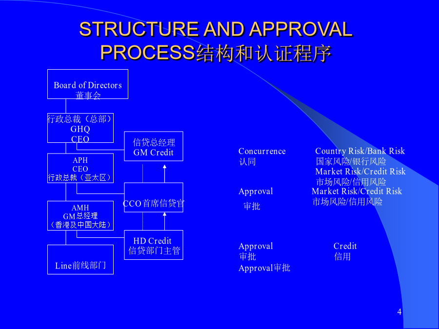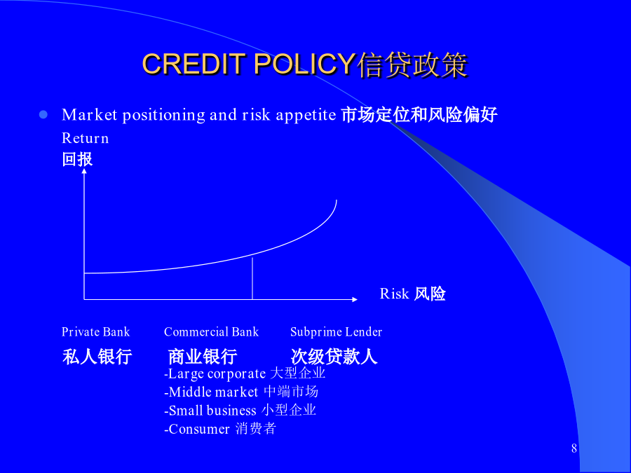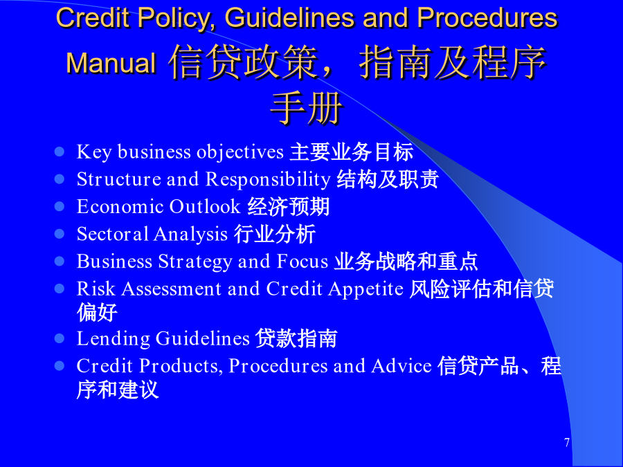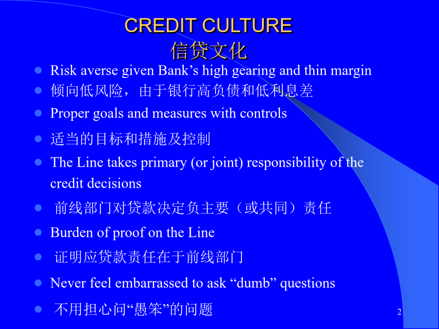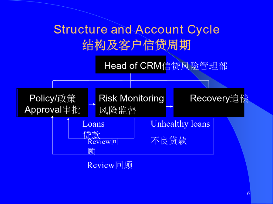 CREDITRISKMANAGEMENT信贷风险管理CREDITCULTURE信贷文化CREDITRISKMANAGEMENT信贷风险管理STRUCTUREANDAPPROVALPROCESS结构和认证程序ALTERNATIVES选择StructureandAccountCycle结构及客户信贷周期CreditPolicy,GuidelinesandProceduresManual信贷政策,指南及程序手册CREDITPOLICY信贷政策MARKETSEGMENTATION–CREDITTOOLS市场细分—信贷工具DelinquencyRates,AllBanks,SA(USA)Charge-OffRates,AllBanks,SA(USA)冲销率所有银行美国LoanQualityinHK香港地区贷款质量CREDITRISKASSESSMENT信贷风险评估SmallBusiness小型企业英国小型公司主要业务的设立与终止Consumer消费贷款MortgageLoanQuality(HK)香港地区住房贷款质量CreditCardQuality信用卡质量Scoring评分CREDITRISKMONITORING信贷风险监督PRICINGSTRATEGY定价战略DEBTRECOVERY(1)贷款收回(1)DEBTRECOVERY(2)贷款收回(2)DEBTRECOVERY(3)贷款收回(3)DEBTRECOVERY(4)贷款收回(4)