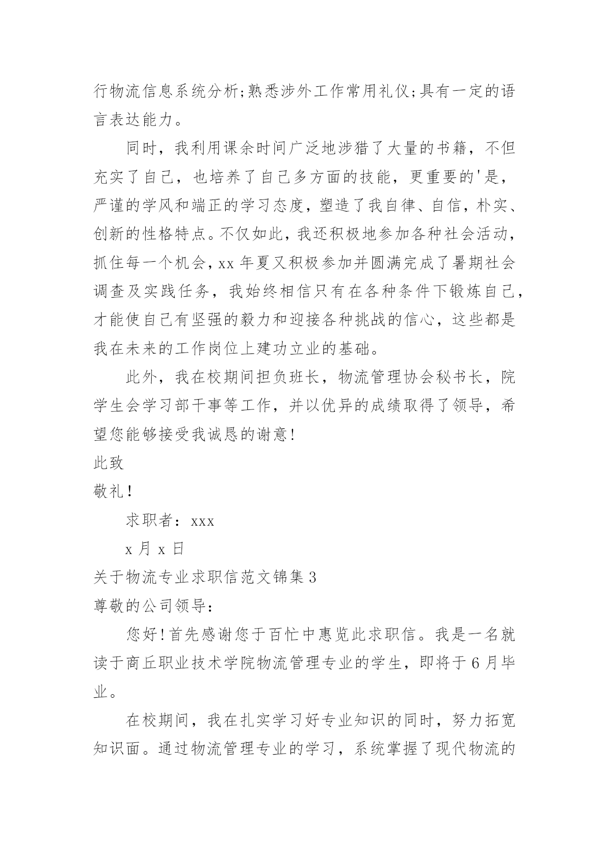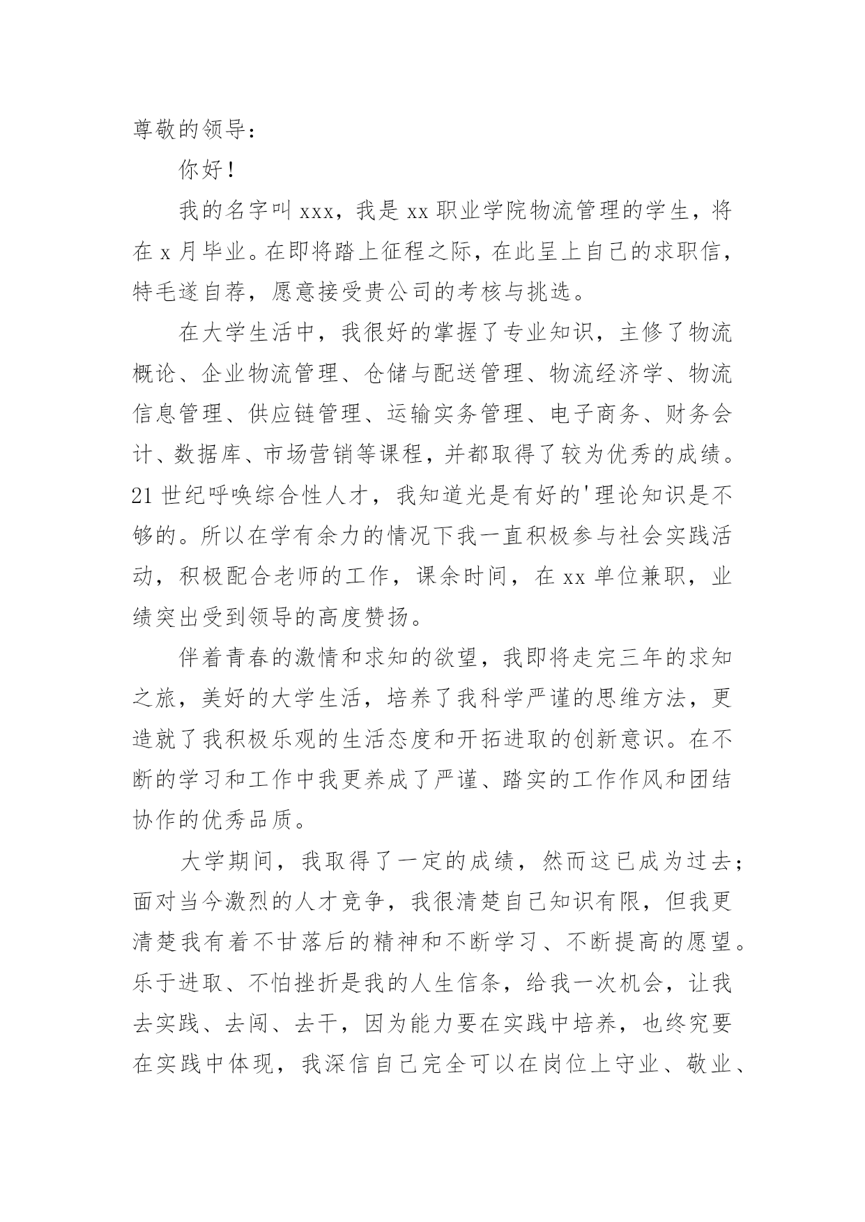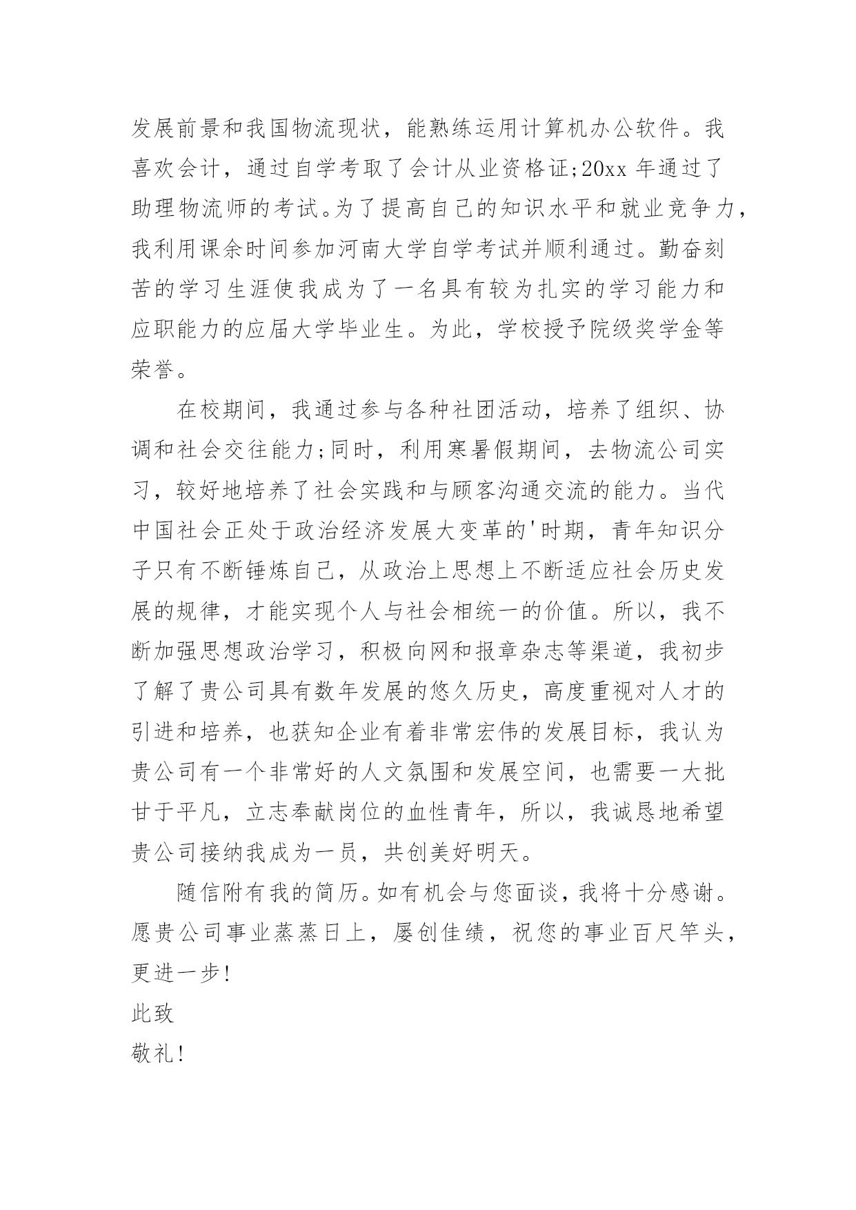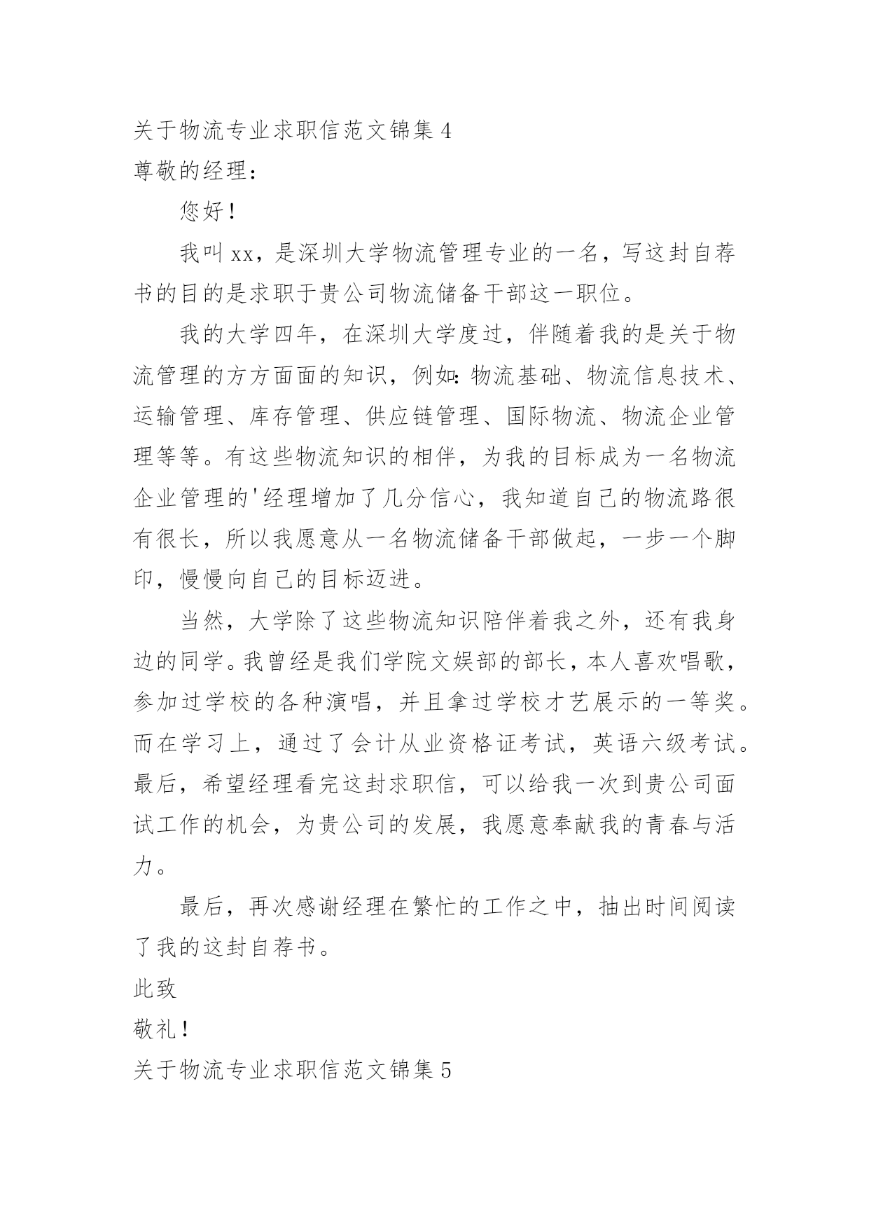 物流专业求职信关于物流专业求职信范文锦集时间过得真快,总在不经意间流逝,相信很多朋友又忙着找工作呢吧,你的求职信写好了吗?你知道求职信要如何写吗?以下是小编收集整理的关于物流专业求职信范文锦集,仅供参考,欢迎大家阅读。关于物流专业求职信范文锦集1尊敬的领导:您好!非常感谢您在百忙之中阅读我的自荐信。自从我考入了xxx学院物流管理系以来,这里成了我锻炼成长的沃土,为了早日从一个不喑世事的中学生蜕变成一名全面发展、素质优良的大学生,我积极的投入到学习和生活中,得益于良好的校风,师友的严格教益及个人努力下,我具备了扎实的.专业基础知识、系统的掌握了《现代物流管理基础》、《物流配送中心规划与设计》、《供应链管理》《经济法》《商品学》等一系列有关的理论;可初步从事物流管理业务;进行物流系统调查分析;评价与选择物流技术方案和进行物流信息系统分析;熟悉涉外工作常用礼仪;具有一定的语言表达能力。同时,我利用课余时间广泛地涉猎了大量的书籍,不但充实了自己,也培养了自己多方面的技能,更重要的是,严谨的学风和端正的学习态度,塑造了我自律、自信,朴实、创新的性格特点。不仅如此,我还积极地参加各种社会活动,抓住每一个机会,xx年夏又积极参加并圆满完成了暑期社会调查及实践任务,我始终相信只有在各种条件下锻炼自己,才能使自己有坚强的毅力和迎接各种挑战的信心,这些都是我在未来的工作岗位上建功立业的基础。此外,我在校期间担负班长,物流管理协会秘书长,院学生会学习部干事等工作,并以优异的成绩取得了领导,希望您能够接受我诚恳的谢意!敬礼求职者:x月x日关于物流专业求职信范文锦集2尊敬的领导:您好!非常感谢您在百忙之中阅读我的自荐信自从我考入了xxx学院物流管理系以来,这里成了我锻炼成长的沃土,为了早日从一个不喑世事的中学生蜕变成一名全面发展、素质优良的大学生,我积极的投入到学习和生活中,得益于良好的校风,师友的严格教益及个人努力下,我具备了扎实的专业基础知识、系统的掌握了《现代物流管理基础》、《物流配送中心规划与设计》、《供应链管理》《经济法》《商品学》等一系列有关的理论;可初步从事物流管理业务;进行物流系统调查分析;评价与选择物流技术方案和进行物流信息系统分析;熟悉涉外工作常用礼仪;具有一定的语言表达能力。同时,我利用课余时间广泛地涉猎了大量的书籍,不但充实了自己,也培养了自己多方面的技能,更重要的'是,严谨的学风和端正的学习态度,塑造了我自律、自信,朴实、创新的性格特点。不仅如此,我还积极地参加各种社会活动,抓住每一个机会,xx年夏又积极参加并圆满完成了暑期社会调查及实践任务,我始终相信只有在各种条件下锻炼自己,才能使自己有坚强的毅力和迎接各种挑战的信心,这些都是我在未来的工作岗位上建功立业的基础。此外,我在校期间担负班长,物流管理协会秘书长,院学生会学习部干事等工作,并以优异的成绩取得了领导,希望您能够接受我诚恳的谢意!此致敬礼!求职者:xxxx月x日关于物流专业求职信范文锦集3尊敬的公司领导:您好!首先感谢您于百忙中惠览此求职信。我是一名就读于商丘职业技术学院物流管理专业的学生,即将于6月毕业。在校期间,我在扎实学习好专业知识的同时,努力拓宽知识面。通过物流管理专业的学习,系统掌握了现代物流的发展前景和我国物流现状,能熟练运用计算机办公软件。我喜欢会计,通过自学考取了会计从业资格证;20xx年通过了助理物流师的考试。为了提高自己的知识水平和就业竞争力,我利用课余时间参加河南大学自学考试并顺利通过。勤奋刻苦的学习生涯使我成为了一名具有较为扎实的学习能力和应职能力的应届大学毕业生。为此,学校授予院级奖学金等荣誉。在校期间,我通过参与各种社团活动,培养了组织、协调和社会交往能力;同时,利用寒暑假期间,去物流公司实习,较好地培养了社会实践和与顾客沟通交流的能力。当代中国社会正处于政治经济发展大变革的'时期,青年知识分子只有不断锤炼自己,从政治上思想上不断适应社会历史发展的规律,才能实现个人与社会相统一的价值。所以,我不断加强思想政治学习,积极向网和报章杂志等渠道,我初步了解了贵公司具有数年发展的悠久历史,高度重视对人才的引进和培养,也获知企业有着非常宏伟的发展目标,我认为贵公司有一个非常好的人文氛围和发展空间,也需要一大批甘于平凡,立志奉献岗位的血性青年,所以,我诚恳地希望贵公司接纳我成为一员,共创美好明天。随信附有我的简历。如有机会与您面谈,我将十分感谢。愿贵公司事业蒸蒸日上,屡创佳绩,祝您的事业百尺竿头,更进一步!此致敬礼!关于物流专业求职信范文锦集4尊敬的经理:您好!我叫xx,是深圳大学物流管理专业的一名,写这封自荐书的目的是求职于贵公司物流储备干部这一职位。我的大学四年,在深圳大学度过,伴随着我的是关于物流管理的方方面面的知识,例如:物流基础、物流信息