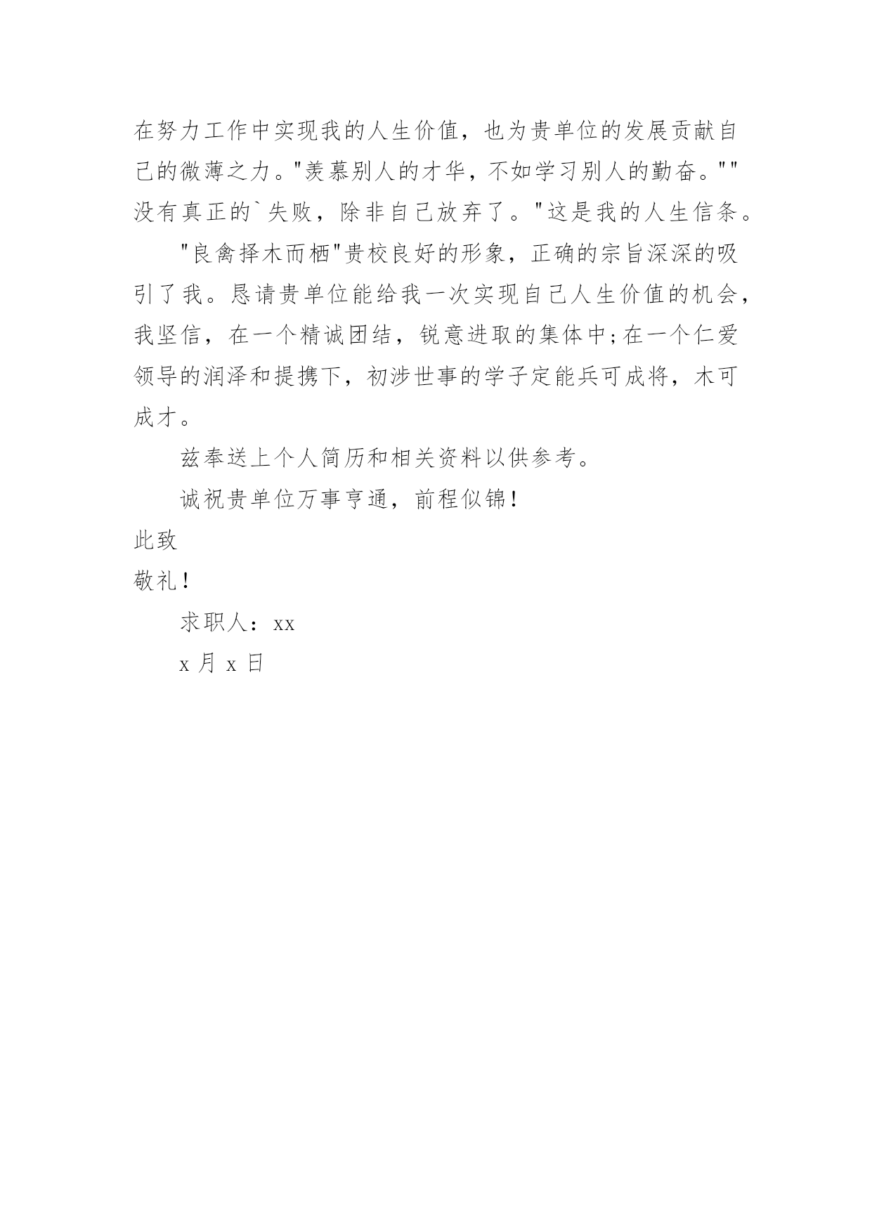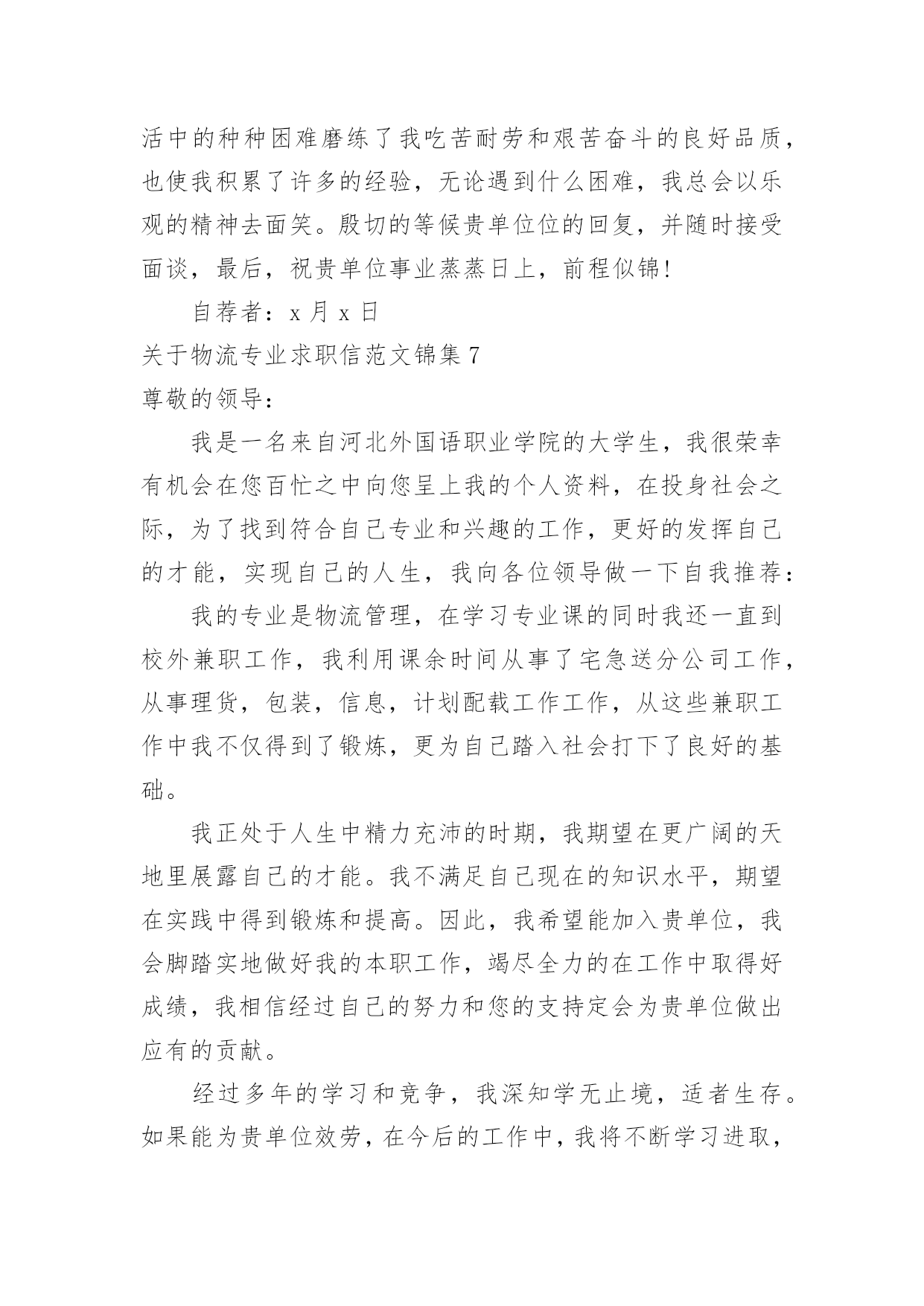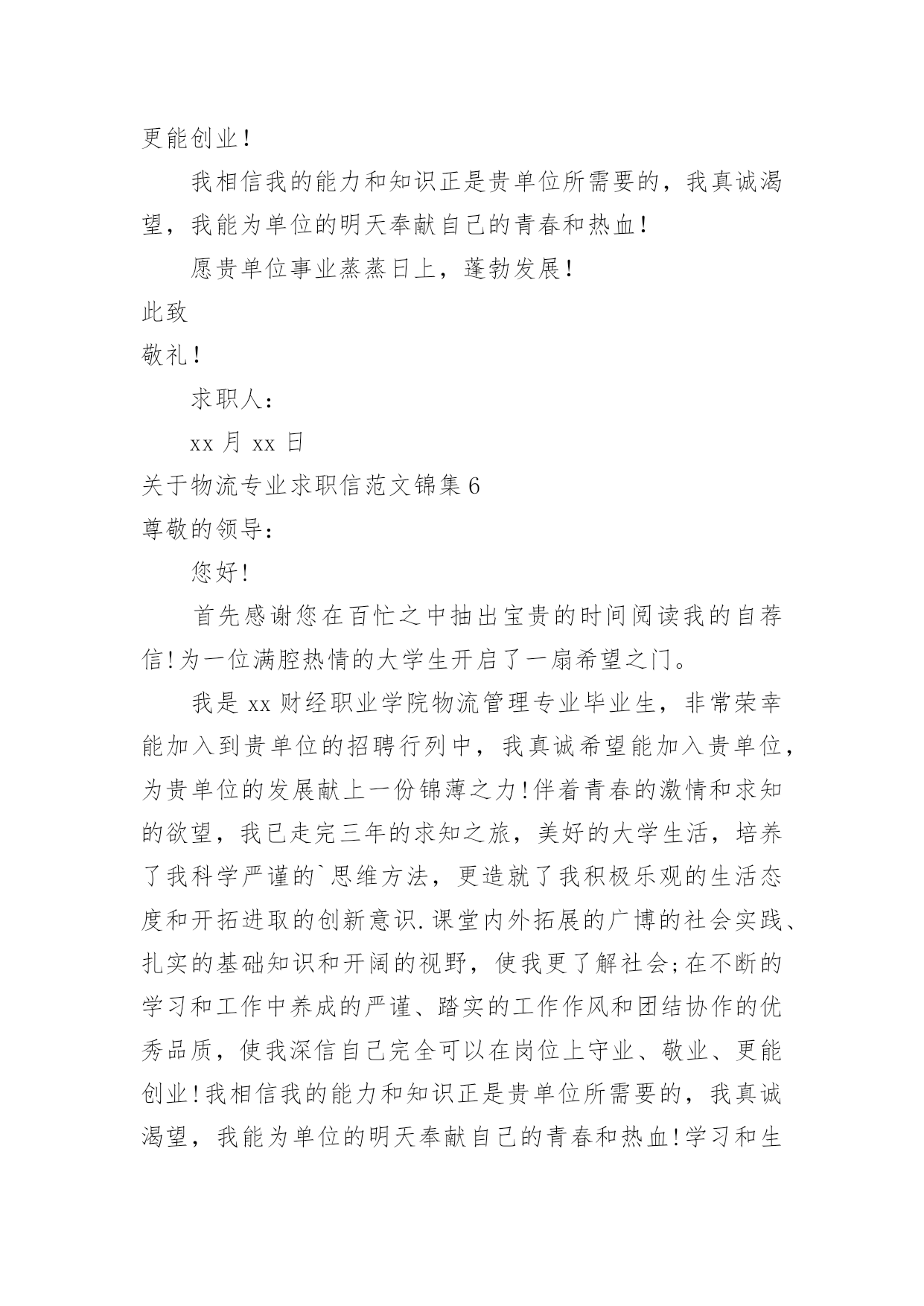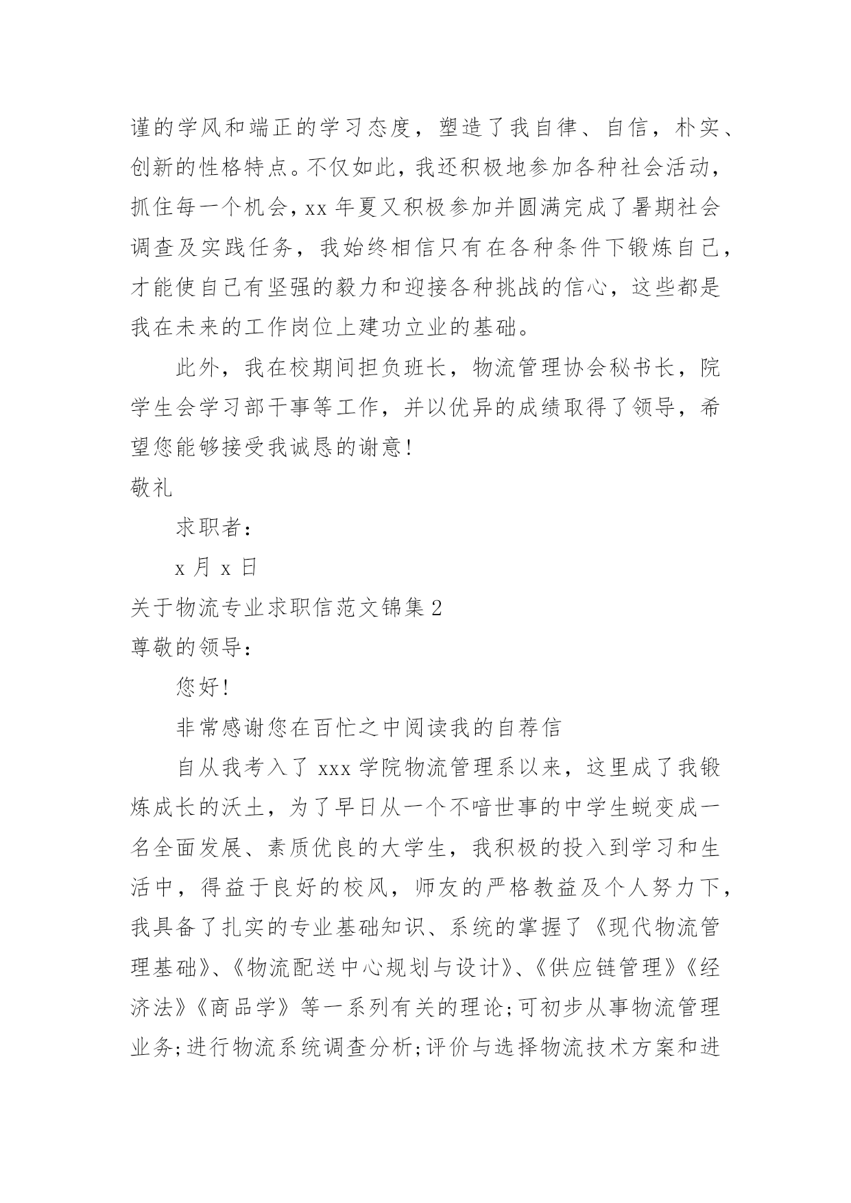 物流专业求职信关于物流专业求职信范文锦集时间过得真快,总在不经意间流逝,相信很多朋友又忙着找工作呢吧,你的求职信写好了吗?你知道求职信要如何写吗?以下是小编收集整理的关于物流专业求职信范文锦集,仅供参考,欢迎大家阅读。关于物流专业求职信范文锦集1尊敬的领导:您好!非常感谢您在百忙之中阅读我的自荐信。自从我考入了xxx学院物流管理系以来,这里成了我锻炼成长的沃土,为了早日从一个不喑世事的中学生蜕变成一名全面发展、素质优良的大学生,我积极的投入到学习和生活中,得益于良好的校风,师友的严格教益及个人努力下,我具备了扎实的.专业基础知识、系统的掌握了《现代物流管理基础》、《物流配送中心规划与设计》、《供应链管理》《经济法》《商品学》等一系列有关的理论;可初步从事物流管理业务;进行物流系统调查分析;评价与选择物流技术方案和进行物流信息系统分析;熟悉涉外工作常用礼仪;具有一定的语言表达能力。同时,我利用课余时间广泛地涉猎了大量的书籍,不但充实了自己,也培养了自己多方面的技能,更重要的是,严谨的学风和端正的学习态度,塑造了我自律、自信,朴实、创新的性格特点。不仅如此,我还积极地参加各种社会活动,抓住每一个机会,xx年夏又积极参加并圆满完成了暑期社会调查及实践任务,我始终相信只有在各种条件下锻炼自己,才能使自己有坚强的毅力和迎接各种挑战的信心,这些都是我在未来的工作岗位上建功立业的基础。此外,我在校期间担负班长,物流管理协会秘书长,院学生会学习部干事等工作,并以优异的成绩取得了领导,希望您能够接受我诚恳的谢意!敬礼求职者:x月x日关于物流专业求职信范文锦集2尊敬的领导:您好!非常感谢您在百忙之中阅读我的自荐信自从我考入了xxx学院物流管理系以来,这里成了我锻炼成长的沃土,为了早日从一个不喑世事的中学生蜕变成一名全面发展、素质优良的大学生,我积极的投入到学习和生活中,得益于良好的校风,师友的严格教益及个人努力下,我具备了扎实的专业基础知识、系统的掌握了《现代物流管理基础》、《物流配送中心规划与设计》、《供应链管理》《经济法》《商品学》等一系列有关的理论;可初步从事物流管理业务;进行物流系统调查分析;评价与选择物流技术方案和进行物流信息系统分析;熟悉涉外工作常用礼仪;具有一定的语言表达能力。同时,我利用课余时间广泛地涉猎了大量的书籍,不但充实了自己,也培养了自己多方面的技能,更重要的'是,严谨的学风和端正的学习态度,塑造了我自律、自信,朴实、创新的性格特点。不仅如此,我还积极地参加各种社会活动,抓住每一个机会,xx年夏又积极参加并圆满完成了暑期社会调查及实践任务,我始终相信只有在各种条件下锻炼自己,才能使自己有坚强的毅力和迎接各种挑战的信心,这些都是我在未来的工作岗位上建功立业的基础。此外,我在校期间担负班长,物流管理协会秘书长,院学生会学习部干事等工作,并以优异的成绩取得了领导,希望您能够接受我诚恳的谢意!此致敬礼!求职者:xxxx月x日关于物流专业求职信范文锦集3尊敬的公司领导:您好!首先感谢您于百忙中惠览此求职信。我是一名就读于商丘职业技术学院物流管理专业的学生,即将于6月毕业。在校期间,我在扎实学习好专业知识的同时,努力拓宽知识面。通过物流管理专业的学习,系统掌握了现代物流的发展前景和我国物流现状,能熟练运用计算机办公软件。我喜欢会计,通过自学考取了会计从业资格证;20xx年通过了助理物流师的考试。为了提高自己的知识水平和就业竞争力,我利用课余时间参加河南大学自学考试并顺利通过。勤奋刻苦的学习生涯使我成为了一名具有较为扎实的学习能力和应职能力的应届大学毕业生。为此,学校授予院级奖学金等荣誉。在校期间,我通过参与各种社团活动,培养了组织、协调和社会交往能力;同时,利用寒暑假期间,去物流公司实习,较好地培养了社会实践和与顾客沟通交流的能力。当代中国社会正处于政治经济发展大变革的'时期,青年知识分子只有不断锤炼自己,从政治上思想上不断适应社会历史发展的规律,才能实现个人与社会相统一的价值。所以,我不断加强思想政治学习,积极向网和报章杂志等渠道,我初步了解了贵公司具有数年发展的悠久历史,高度重视对人才的引进和培养,也获知企业有着非常宏伟的发展目标,我认为贵公司有一个非常好的人文氛围和发展空间,也需要一大批甘于平凡,立志奉献岗位的血性青年,所以,我诚恳地希望贵公司接纳我成为一员,共创美好明天。随信附有我的简历。如有机会与您面谈,我将十分感谢。愿贵公司事业蒸蒸日上,屡创佳绩,祝您的事业百尺竿头,更进一步!此致敬礼!关于物流专业求职信范文锦集4尊敬的经理:您好!我叫xx,是深圳大学物流管理专业的一名,写这封自荐书的目的是求职于贵公司物流储备干部这一职位。我的大学四年,在深圳大学度过,伴随着我的是关于物流管理的方方面面的知识,例如:物流基础、物流信息