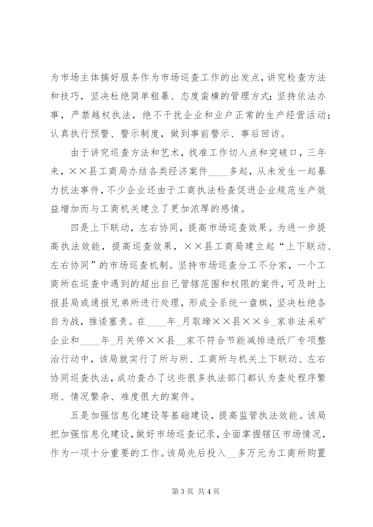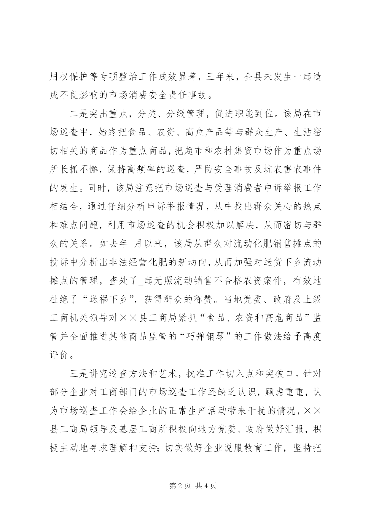 第PAGE\*Arabic\*MERGEFORMAT4页共NUMPAGES\*MERGEFORMAT4页县工商局服务效能情况汇报××县工商局____年__月成功进行“精局强所”改革,全局___名公务员,其中___名在基层工商所一线工作,工商所干部占全局总人数的__%。在“精局强所”的新形势下,××县工商局以提高服务经济和监管执法效能为目标,在抓规范、抓重点、抓突破、抓协作、抓信息化建设五个方面下功夫,有效地提高了巡查执法服务效能。一是加强管理,落实责任,严格规范巡查人员行为。××县工商局在成功进行“小局大所”、“精局强所”改革后,各项工商职权下放使得基层工商所的责任进一步加大,任务也更为繁重,新形势对市场巡查人员的要求也越来越高。为此,该局在__个工商所全部建立“分片管理、责任到人”的市场巡查管理模式,加强对巡查人员的管理,加强规范化建设,严格规范公务员行为,从而为提高巡查效能创造有利条件。加强程序化建设,严格要求工商所巡查人员在巡查时按照法定程序进行,依法管理,文明执法,保持良好的工商人员形象。加强制度化建设,要求工商干部严格执行市场巡查纪律,杜绝酒后上岗,禁止巡查过程中擅自在辖区市场购物,以及利用“案、费、证、照”谋取私利。一旦发现违规行为,实行连查和倒查制度,严肃追究片区负责人及相关人员的责任。由于制度规范、责任明确,××县工商局在食品安全监管、红盾打假护农、商标专用权保护等专项整治工作成效显著,三年来,全县未发生一起造成不良影响的市场消费安全责任事故。二是突出重点,分类、分级管理,促进职能到位。该局在市场巡查中,始终把食品、农资、高危产品等与群众生产、生活密切相关的商品作为重点商品,把超市和农村集贸市场作为重点场所长抓不懈,保持高频率的巡查,严防安全事故及坑农害农事件的发生。同时,该局注意把市场巡查与受理消费者申诉举报工作相结合,通过仔细分析申诉举报情况,从中找出群众关心的热点和难点问题,利用市场巡查的机会积极加以解决,从而密切与群众的关系。如去年_月以来,该局从群众对流动化肥销售摊点的投诉中分析出非法经营化肥的新动向,从而加强对送货下乡流动摊点的管理,查处了_起无照流动销售不合格农资案件,有效地杜绝了“送祸下乡”,获得群众的称赞。当地党委、政府及上级工商机关领导对××县工商局紧抓“食品、农资和高危商品”监管并全面推进其他商品监管的“巧弹钢琴”的工作做法给予高度评价。三是讲究巡查方法和艺术,找准工作切入点和突破口。针对部分企业对工商部门的市场巡查工作还缺乏认识,顾虑重重,认为市场巡查工作会给企业的正常生产活动带来干扰的情况,××县工商局领导及基层工商所积极向地方党委、政府做好汇报,积极主动地寻求理解和支持;切实做好企业说服教育工作,坚持把为市场主体搞好服务作为市场巡查工作的出发点,讲究检查方法和技巧,坚决杜绝简单粗暴、态度蛮横的管理方式;坚持依法办事,严禁越权执法,绝不干扰企业和业户正常的生产经营活动;认真执行预警、警示制度,做到事前警示、事后回访。由于讲究巡查方法和艺术,找准工作切入点和突破口,三年来,××县工商局办结各类经济案件____多起,从未发生一起暴力抗法事件,不少企业还由于工商执法检查促进企业规范生产效益增加而与工商机关建立了更加浓厚的感情。四是上下联动,左右协同,提高市场巡查效果。为进一步提高执法效能,提高巡查效果,××县工商局建立起“上下联动、左右协同”的市场巡查机制。坚持市场巡查分工不分家,一个工商所在巡查中遇到的超出自己管辖范围和权限的案件,可及时上报县局或通报兄弟所进行处理,形成全系统一盘棋,坚决杜绝各自为战,推诿塞责。在____年_月取缔××县××乡_家非法采矿企业和____年_月关停××县__家不符合节能减排造纸厂专项整治行动中,该局就实行了所与所、工商所与机关上下联动、左右协同巡查执法,成功查办了这些很多执法部门都认为查处程序繁琐、情况繁杂、难度很大的案件。五是加强信息化建设等基础建设,提高监管执法效能。该局把加强信息化建设,做好市场巡查记录,全面掌握辖区市场情况,作为一项十分重要的工作。该局先后投入__多万元为工商所购置__多台电脑、打印机、传真机等信息化办公设备,要求市场巡查人员在巡查工作中要认真详细地做好记录,并及时录入电脑,不能为巡而巡,为查而查,一查了之。