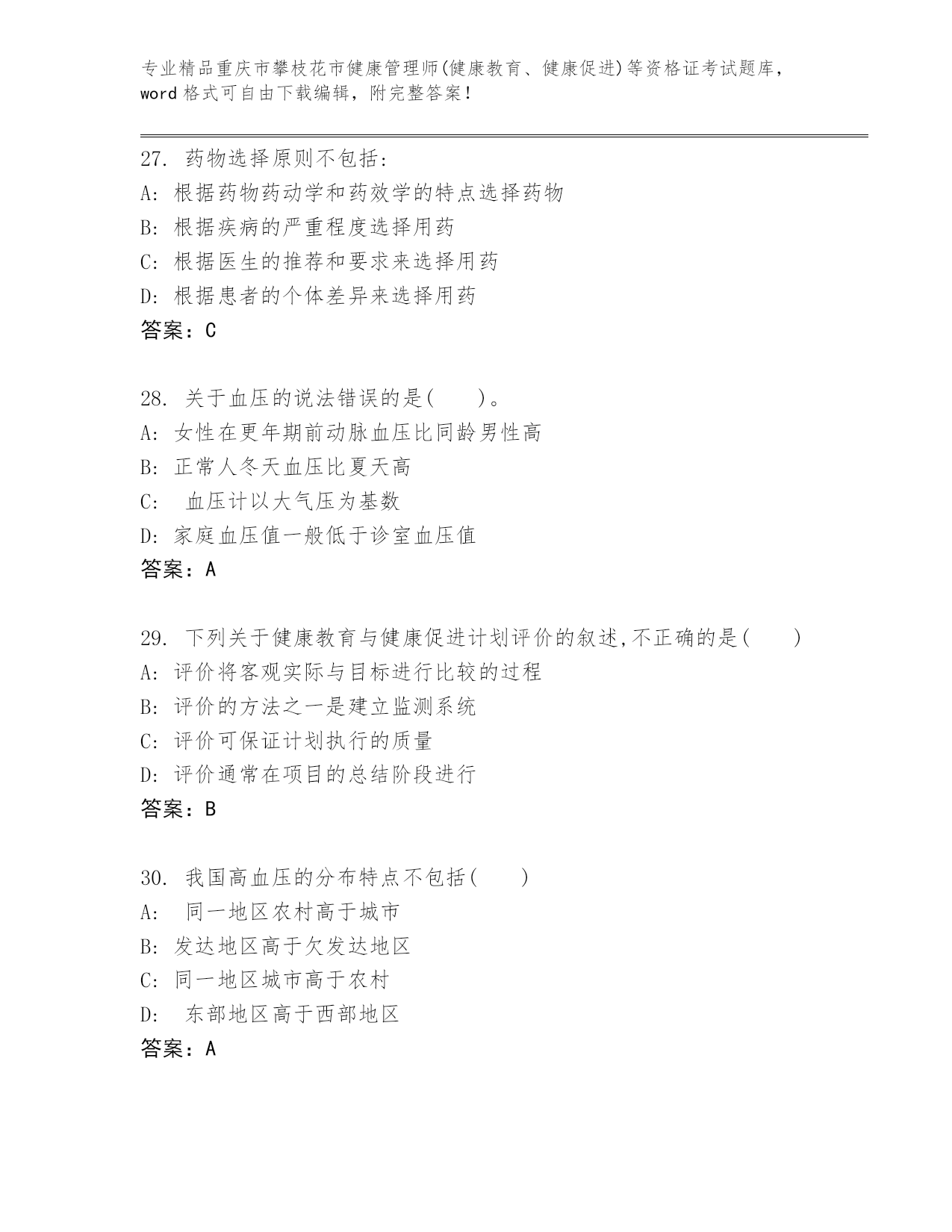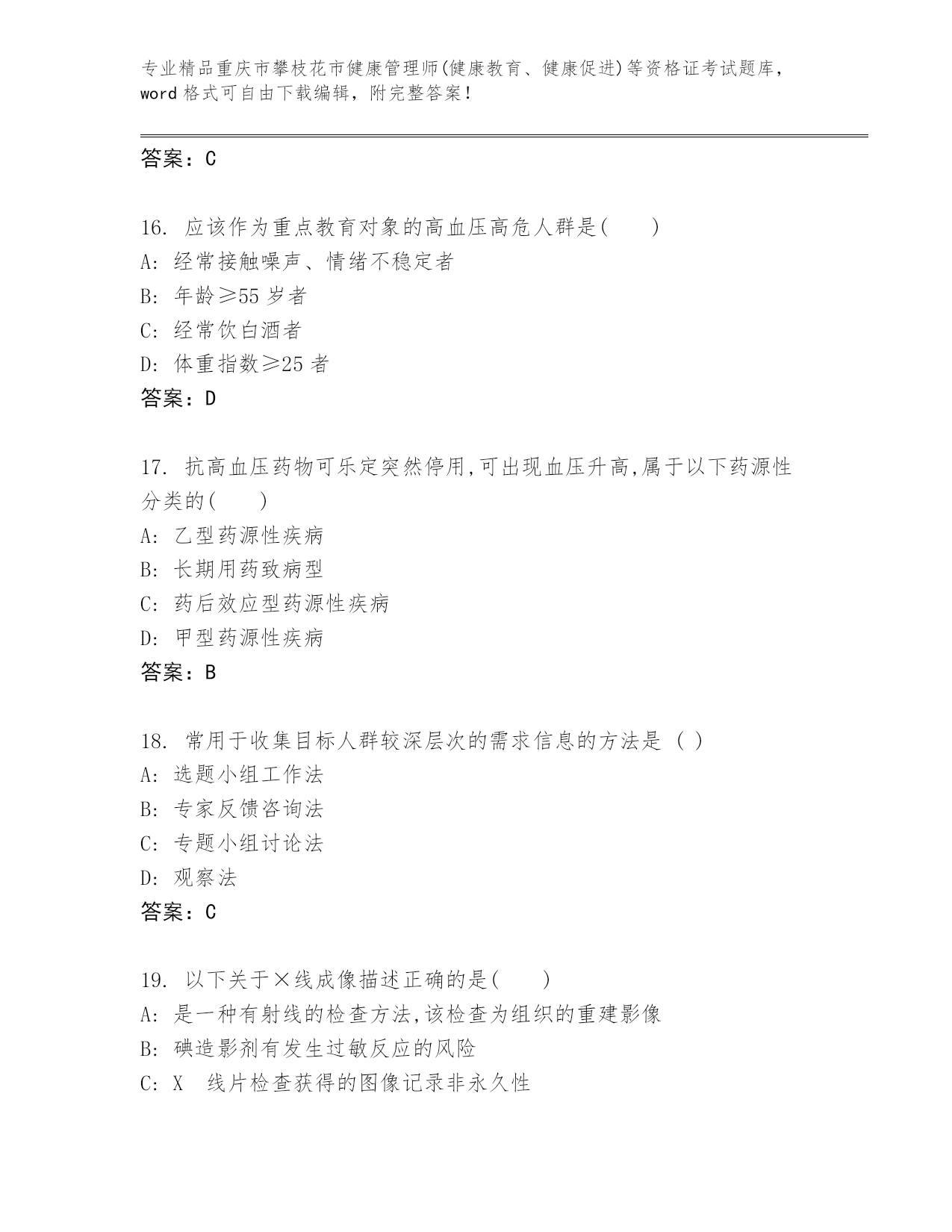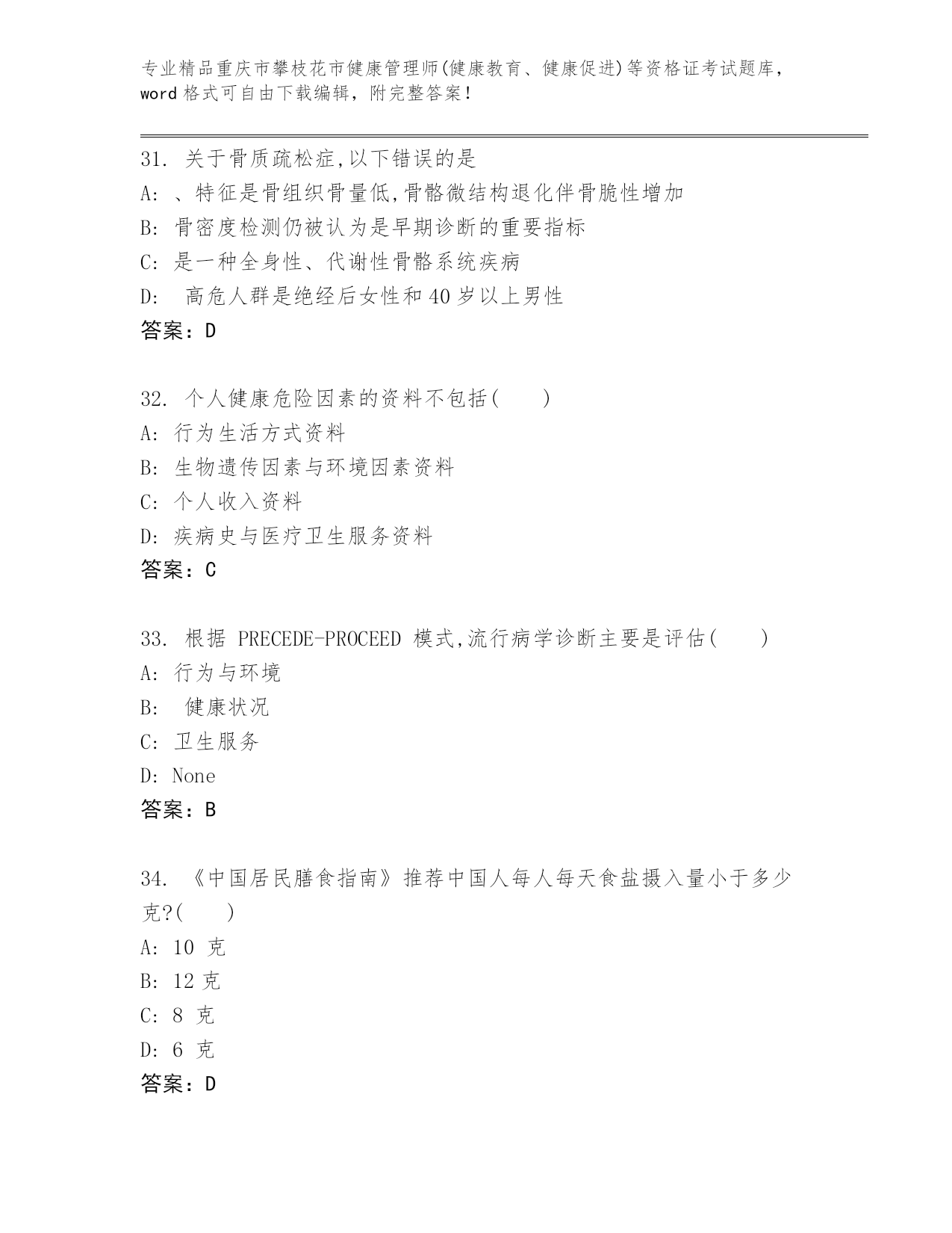 重庆市攀枝花市健康管理师(健康教育、健康促进)等资格证考试内部题库精品(B卷)