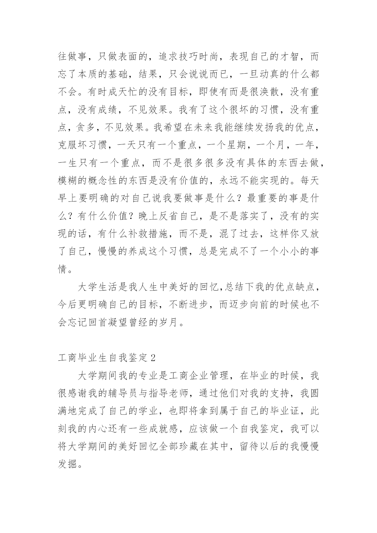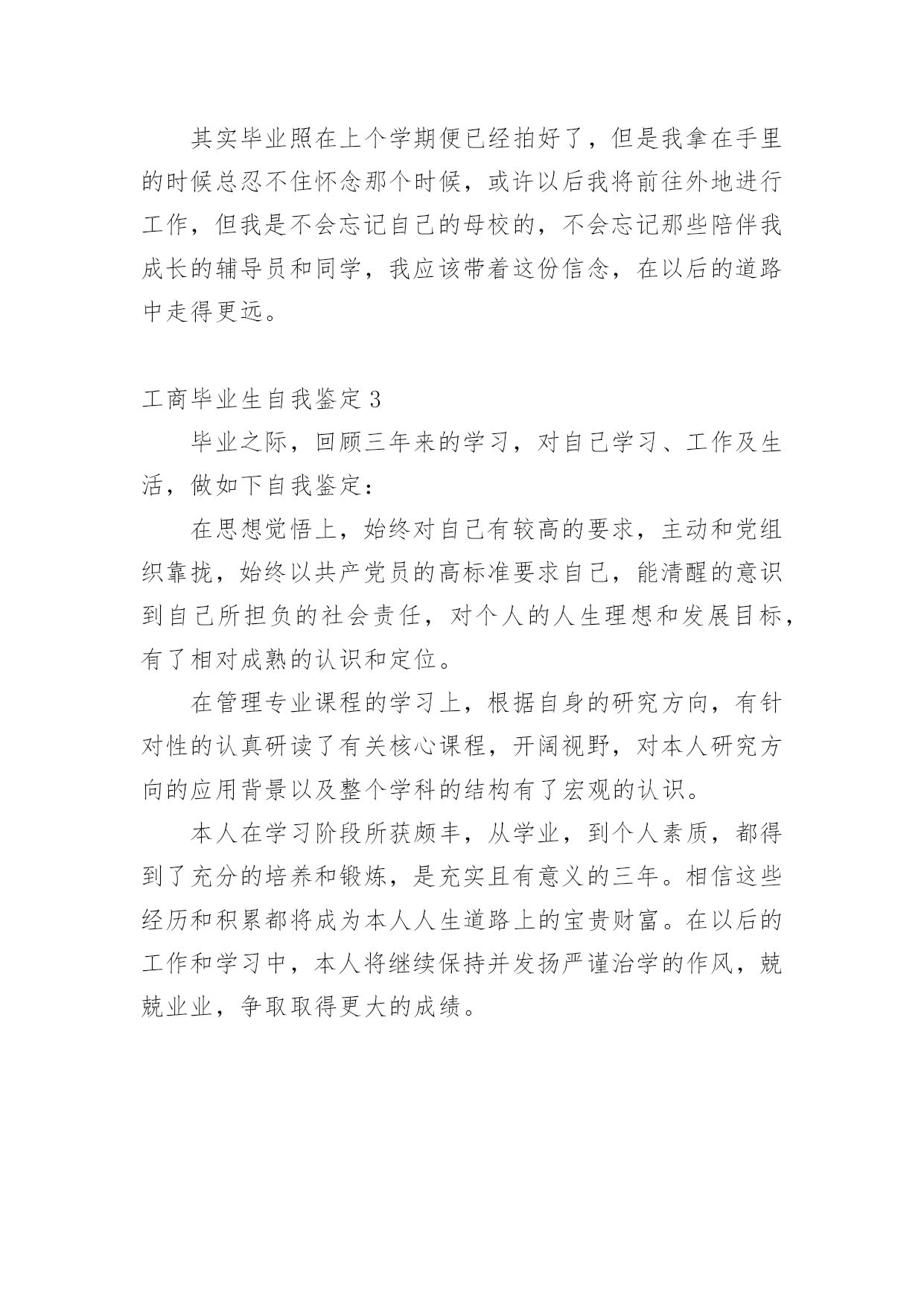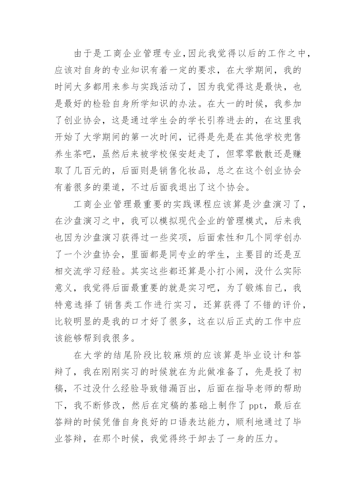 工商毕业生自我鉴定工商毕业生自我鉴定范文(精选3篇)自我鉴定是对自己过去某一阶段的学习或工作的自我分析和总结,写自我鉴定可以让我们审视自身,不妨坐下来好好写写自我鉴定吧。你所见过的自我鉴定应该是什么样的?以下是小编为大家整理的工商毕业生自我鉴定范文(精选3篇),供大家参考借鉴,希望可以帮助到有需要的朋友。工商毕业生自我鉴定1我是一名即将从南昌大学工商管理专业毕业的本科毕业生,通过几年的大学生活,我成长了很多。在即将毕业之时,我对自己的收获和感受作一个小结,并以此为我今后行动的指南。精彩的大学生活给了我很多挑战自我的机会,如系学生会的竞选,院里组织的演讲比赛,文化艺术节的文艺汇演、英语演讲比赛等。在参与这些活动的过程中,我结交了一些很好的朋友,学到了为人处事的方法,锻炼了自己的能力。这些经历使我明白有些事情如果尝试了,成功的机会就有一半,如果不去尝试,成功的`几率只能为零。机会来临时,我们就要好好地把握住。回顾下我的大学生活,发现也存在不少缺点。注意力不集中,不成长时间的专注一件事,造成自己做事不够精,不够细。没有真实的去做一件事,往往是什么也没有做成。往往做事,只做表面的,追求技巧时尚,表现自己的才智,而忘了本质的基础,结果,只会说说而已,一旦动真的什么都不会。有时成天忙的没有目标,即使有而是很涣散,没有重点,没有成绩,不见效果。我有了这个很坏的习惯,没有重点,贪多,不见效果。我希望在未来我能继续发扬我的优点,克服坏习惯,一天只有一个重点,一个星期,一个月,一年,一生只有一个重点,而不是很多很多没有具体的东西去做,模糊的概念性的东西是没有价值的,永远不能实现的。每天早上要明确的对自己说我要做事是什么?最重要的事是什么?有什么价值?晚上反省自己,是不是落实了,没有的实现的话,有什么补救措施,而不是,混了过去,这样你又放了自己,慢慢的养成这个习惯,总是完成不了一个小小的事情。大学生活是我人生中美好的回忆,总结下我的优点缺点,今后更明确自己的目标,不断进步,而迈步向前的时候也不会忘记回首凝望曾经的岁月。工商毕业生自我鉴定2大学期间我的专业是工商企业管理,在毕业的时候,我很感谢我的辅导员与指导老师,通过他们对我的支持,我圆满地完成了自己的学业,也即将拿到属于自己的毕业证,此刻我的内心还有一些成就感,应该做一个自我鉴定,我可以将大学期间的美好回忆全部珍藏在其中,留待以后的我慢慢发掘。由于是工商企业管理专业,因此我觉得以后的工作之中,应该对自身的专业知识有着一定的要求,在大学期间,我的时间大多都用来参与实践活动了,因为我觉得这是最快,也是最好的检验自身所学知识的办法。在大一的时候,我参加了创业协会,这是通过学生会的学长引荐进去的,在这里我开始了大学期间的第一次时间,记得是先是在其他学校兜售养生茶吧,虽然后来被学校保安赶走了,但零零散散还是赚取了几百元的,后面则是销售化妆品,总之在这个创业协会有着很多的渠道,不过后面我退出了这个协会。工商企业管理最重要的实践课程应该算是沙盘演习了,在沙盘演习之中,我可以模拟现代企业的管理模式,后来我也因为沙盘演习获得过一些奖项,后面索性和几个同学创办了一个沙盘协会,里面都是同专业的学生,主要目的还是互相交流学习经验。其实这些都还算是小打小闹,没什么实际意义,我觉得后面最重要的就是实习吧,为了锻炼自己,我特意选择了销售类工作进行实习,还算获得了不错的评价,比较明显的是我的口才好了很多,这在以后正式的工作中应该能够帮到我很多。在大学的结尾阶段比较麻烦的应该算是毕业设计和答辩了,我在刚刚实习的时候就在为此做准备了,先是投了初稿,不过没什么经验导致错漏百出,后面在指导老师的帮助下,我不断修改,然后在定稿的基础上制作了ppt,最后在答辩的时候凭借自身良好的口语表达能力,顺利地通过了毕业答辩,在那个时候,我觉得终于卸去了一身的压力。其实毕业照在上个学期便已经拍好了,但是我拿在手里的时候总忍不住怀念那个时候,或许以后我将前往外地进行工作,但我是不会忘记自己的母校的,不会忘记那些陪伴我成长的辅导员和同学,我应该带着这份信念,在以后的道路中走得更远。工商毕业生自我鉴定3毕业之际,回顾三年来的学习,对自己学习、工作及生活,做如下自我鉴定:在思想觉悟上,始终对自己有较高的要求,主动和党组织靠拢,始终以共产党员的高标准要求自己,能清醒的意识到自己所担负的社会责任,对个人的人生理想和发展目标,有了相对成熟的认识和定位。在管理专业课程的学习上,根据自身的研究方向,有针对性的认真研读了有关核心课程,开阔视野,对本人研究方向的应用背景以及整个学科的结构有了宏观的认识。本人在学习阶段所获颇丰,从学业,到个人素质,都得到了充分的培养和锻炼,是充实且有意义的三年。相信这些经历和积累都将成为本人人生道路上的宝贵财富。在以后的工作和学习中,本人