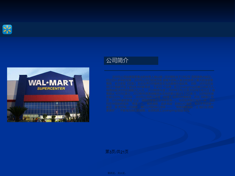 会计学沃尔玛公司由美国零售业的传奇人物山姆~沃尔顿先生于1962年在阿肯色州成立。经过四十多年的发展,沃尔玛公司已经成为美国最大的私人雇主和世界上最大的连锁零售商,多次荣登《财富》杂志世界500强榜首及当选最具价值品牌。目前,沃尔玛在全球15个国家开设了超过8,400家商场,下设55个品牌,员工(yuángōng)总数210多万人,每周光临沃尔玛的顾客2亿人次。2010财政年度(2009年2月1日至2010年1月31日)销售额达4050亿美元,2010财年慈善捐赠资金及物资累计超过5.12亿美元,比09财年增长超过20%。2010年,沃尔玛公司再次荣登《财富》世界500强榜首,并在《财富》杂志“2010年最受赞赏企业”调查的零售企业中排名第一。与在世界其它地方一样,沃尔玛在中国始终坚持“尊重个人、服务顾客、追求卓越”的核心价值观,专注于开好每一家店,服务好每一位顾客,履行公司的核心使命——“帮助顾客省钱,让他们生活得更美好”,不断地为我们的顾客、会员和员工(yuángōng)创造非凡。快速反应系统(xìtǒng)
