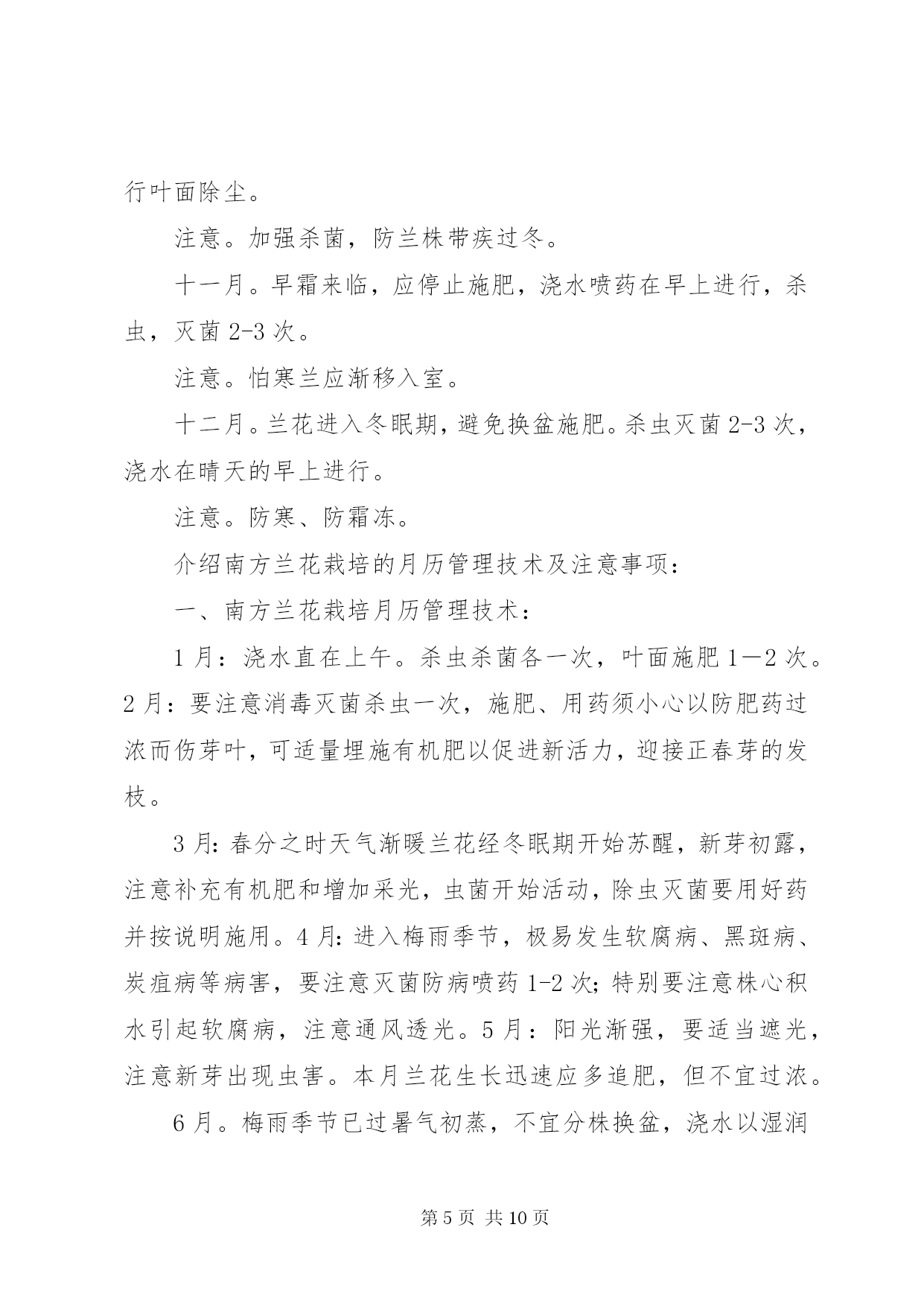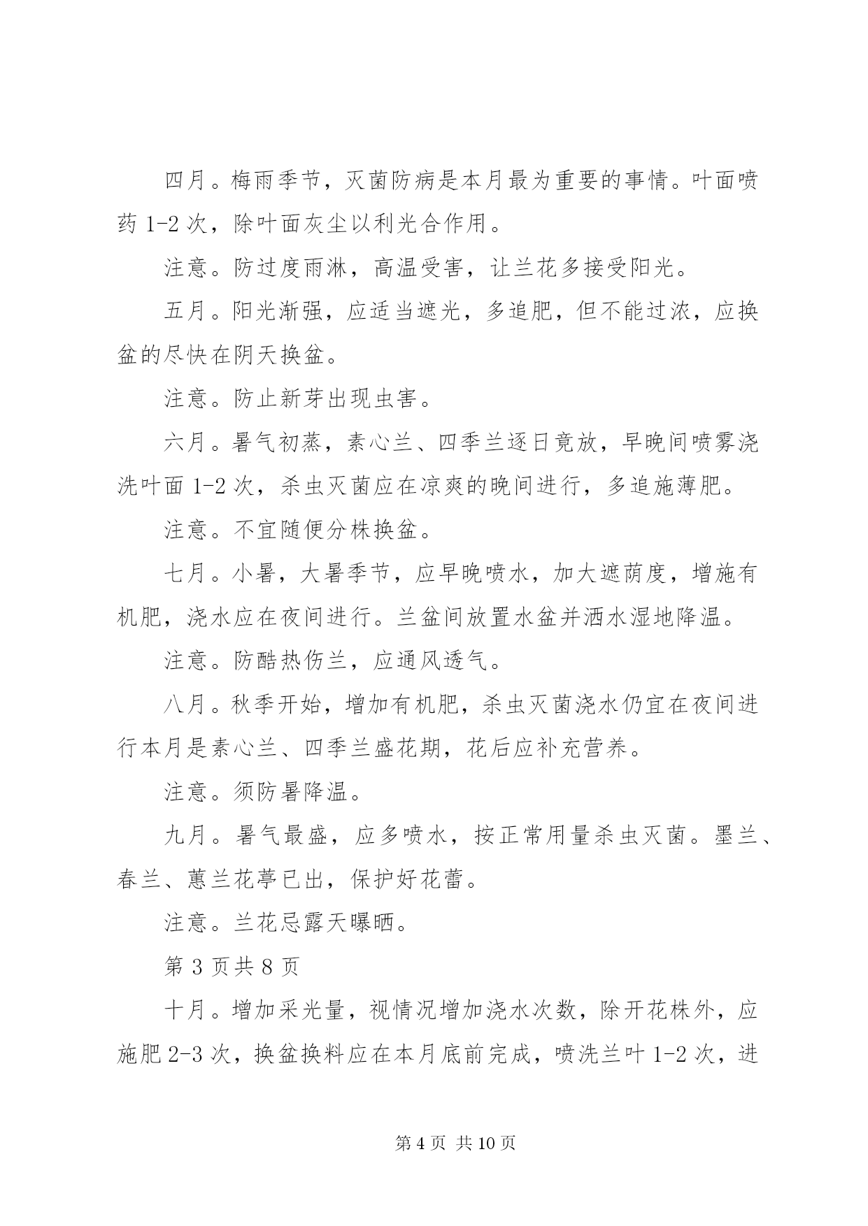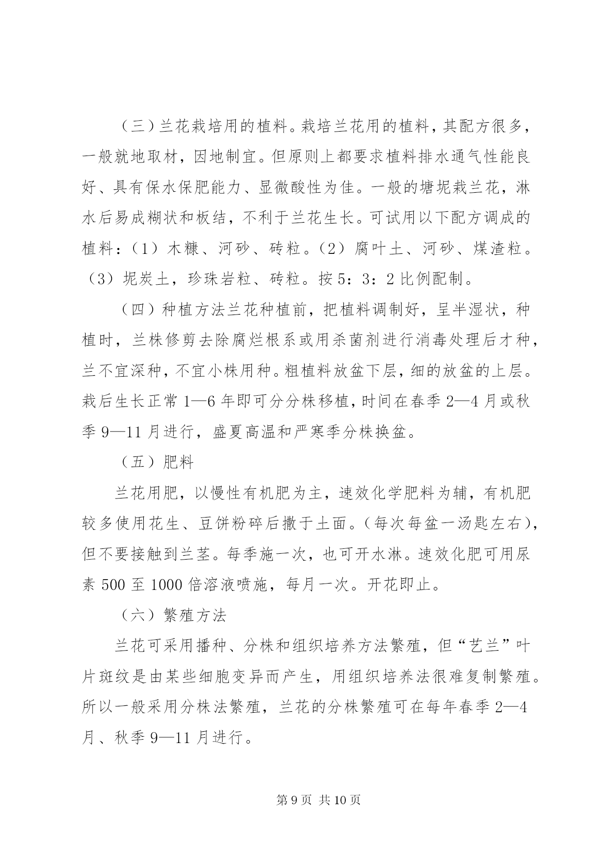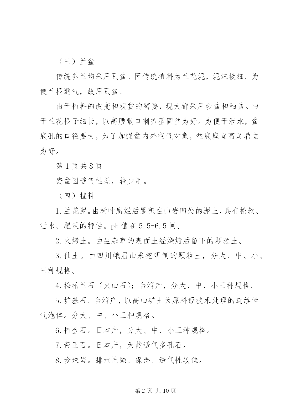 第PAGE\*Arabic\*MERGEFORMAT10页共NUMPAGES\*MERGEFORMAT10页切花百合栽培技术经验总结兰花栽培技术种植兰花,首先要做好兰场、兰棚及兰盆、植料等准备工作以后,才可实施栽种。一、栽培管理(一)兰场兰场应选择背西朝东方向的场所,东南方向空旷,西背方向有高墙或大树。既能见初阳、又能挡烈日。周围小环境空气清洁,有一定湿度保证的院落。注意透风、受露、避烈日、忌烟等。若建在屋顶或楼层阳台,除上面遮荫外,靠西北方向主要张挂帘子以防午后落日斜照灼伤草叶。兰棚下面最好用泥地或下设清水池,以保持兰棚周围空气潮湿。并注意地面清洁,防止病虫害滋生。当室外气温降至5℃左右,须将兰盆移入室内,以防冻伤兰根。(二)兰棚兰花喜阴透风之处,室外若无兰棚庇荫,必遭受烈日曝晒、狂雨冲袭。传统兰棚用竹架上放布幔和竹帘。晴天遮烈日,雨天防雨,晚上拉开遮帘让兰沐浴露水。现代兰棚多用金属制成,用遮光网和塑料布防晒挡雨。兰花台架可分阶梯式和平台式,便于管理。室内养护,不需搭棚。(三)兰盆传统养兰均采用瓦盆。因传统植料为兰花泥,泥沫极细。为使兰根通气,故用瓦盆。由于植料的改变和观赏的需要,现大都采用砂盆和釉盆。由于兰花根子细长,以高腰敞口喇叭型圆盆为好。为便于泄水,盆底孔的口径要大,为了加强盆内外空气对象,盆底座宜高足鼎立为好。瓷盆因透气性差,较少用。(四)植料1.兰花泥。由树叶腐烂后累积在山岩凹处的泥土,具有松软、泄水、肥沃的特性。ph值在5.5-6.5间。2.火烤土。由生杂草的表面土经烧烤后留下的颗粒土。3.仙土。由四川峨眉山采挖研制的颗粒土,分大、中、小、三种规格。4.松柏兰石(火山石);台湾产,分大、中、小三种规格。5.圹基石。台湾产,以高山矿土为原料经技术处理的连续性气泡体。分大、中、小三种规格。6.植金石。日本产,分大、中、小三种规格。7.帝王石。日本产,天然透气多孔石。8.珍珠岩。排水性强、保湿、透气性较佳。(五)栽种首先将兰盆用清水浸透,盆底用塑料网罩遮住盆底孔,用粗石或粗仙土垫底,高度为盆深的1/3。若用粗粒仙土,必须先用水浸泡十天。待放入兰花,理顺兰根后放入中粒仙土或粗粒花泥。放置到离盆口一寸附近,用最细的仙土或兰花泥充实兰花假鳞附近,上面再覆盖一层中粒偏细之仙土或细石子。盆中安放兰苗时要注意为以后新苗留出空间。浇水阴放一星期后,便可正常放入兰棚养护。初学种兰者可先种些普通或报岁兰(墨兰),取得经验后再逐步提高档次。二、兰花管理简介一月。兰花喜润畏湿,喜干畏燥,此月浇水宜在上午,杀虫、杀菌各一次,叶面施肥1-2次。注意。防寒风侵袭,此月不施肥。二月。春芽萌动,每十天灭菌杀虫一次,薄肥间施。注意。防肥药过浓而伤害芽叶。三月。春分时节,天气渐暖。尽早剪除已观赏过的花枝及败叶,可叶面和盆土施肥交叉进行,以淡为宜。此月兰花分株换盆的最佳时期。注意。补充有机肥和增加采光并杀虫灭菌。四月。梅雨季节,灭菌防病是本月最为重要的事情。叶面喷药1-2次,除叶面灰尘以利光合作用。注意。防过度雨淋,高温受害,让兰花多接受阳光。五月。阳光渐强,应适当遮光,多追肥,但不能过浓,应换盆的尽快在阴天换盆。注意。防止新芽出现虫害。六月。暑气初蒸,素心兰、四季兰逐日竟放,早晚间喷雾浇洗叶面1-2次,杀虫灭菌应在凉爽的晚间进行,多追施薄肥。注意。不宜随便分株换盆。七月。小暑,大暑季节,应早晚喷水,加大遮荫度,增施有机肥,浇水应在夜间进行。兰盆间放置水盆并洒水湿地降温。注意。防酷热伤兰,应通风透气。八月。秋季开始,增加有机肥,杀虫灭菌浇水仍宜在夜间进行本月是素心兰、四季兰盛花期,花后应补充营养。注意。须防暑降温。九月。暑气最盛,应多喷水,按正常用量杀虫灭菌。墨兰、春兰、蕙兰花葶已出,保护好花蕾。注意。兰花忌露天曝晒。十月。增加采光量,视情况增加浇水次数,除开花株外,应施肥2-3次,换盆换料应在本月底前完成,喷洗兰叶1-2次,进行叶面除尘。注意。加强杀菌,防兰株带疾过冬。十一月。早霜来临,应停止施肥,浇水喷药在早上进行,杀虫,灭菌2-3次。注意。怕寒兰应渐移入室。十二月。兰花进入冬眠期,避免换盆施肥。杀虫灭菌2-3次,浇水在晴天的早上进行。注意。防寒、防霜冻。介绍南方兰花栽培的月历管理技术及注意事项:一、南方兰花栽培月历管理技术:1月:浇水直在上午。杀虫杀菌各一次,叶面施肥1-2次。2月:要注意消毒灭菌杀虫一次,施肥、用药须小心以防肥药过浓而伤芽叶,可适量埋施有机肥以促进新活力,迎接正春芽的发枝。3月:春分之时天气渐暖兰花经冬眠期开始苏醒,新芽初露,注意补充有机肥和增加采光,虫菌开始活动,除虫灭菌要用好药并按说明施用。4月:进入梅雨季节,极易发生软腐病、黑斑病、炭疽病等病害,要注意灭菌防病喷药1-2次;特别要注意株心积水引起软腐