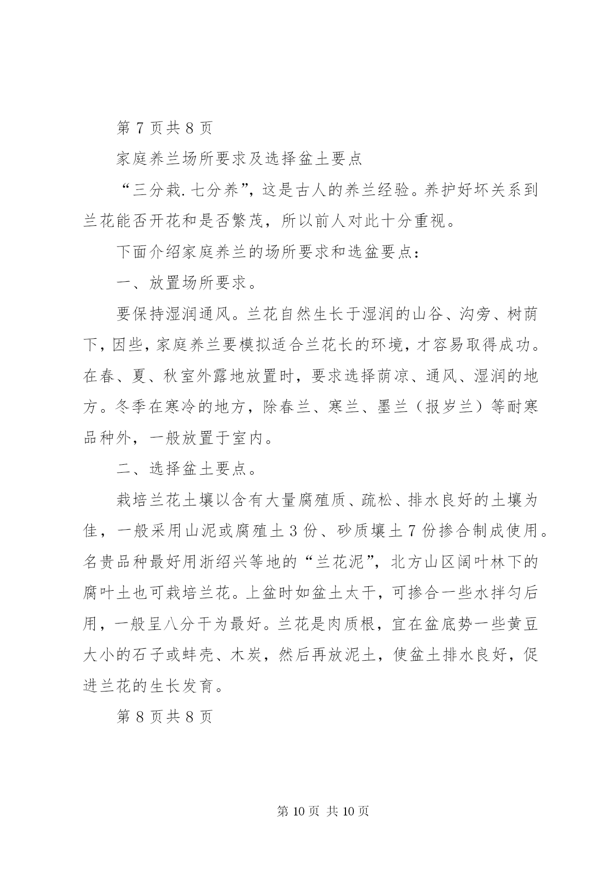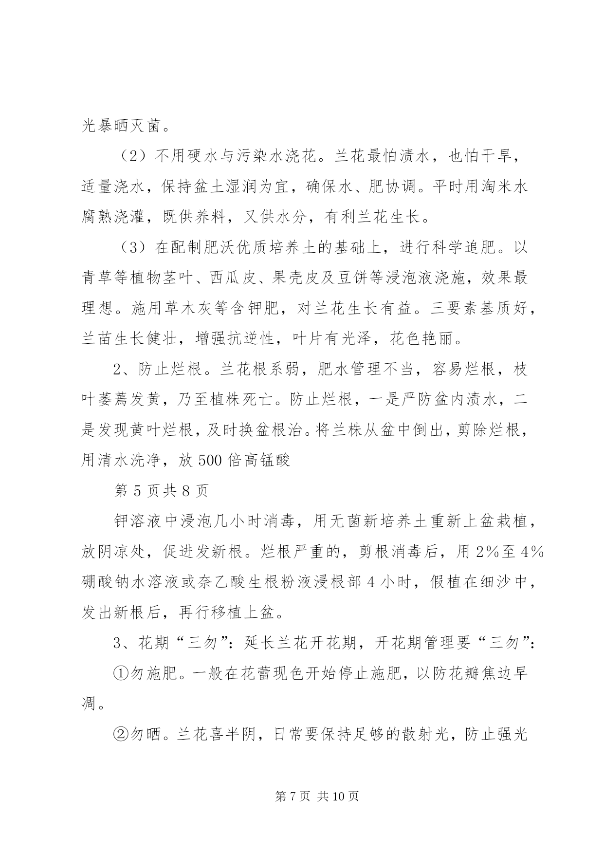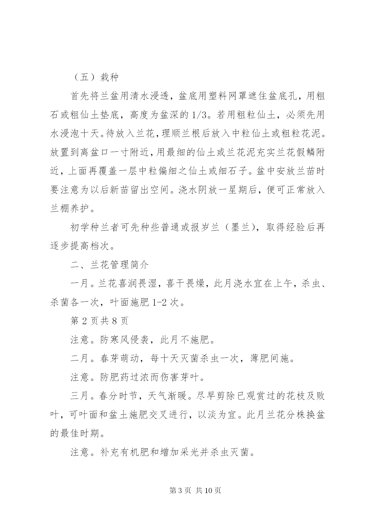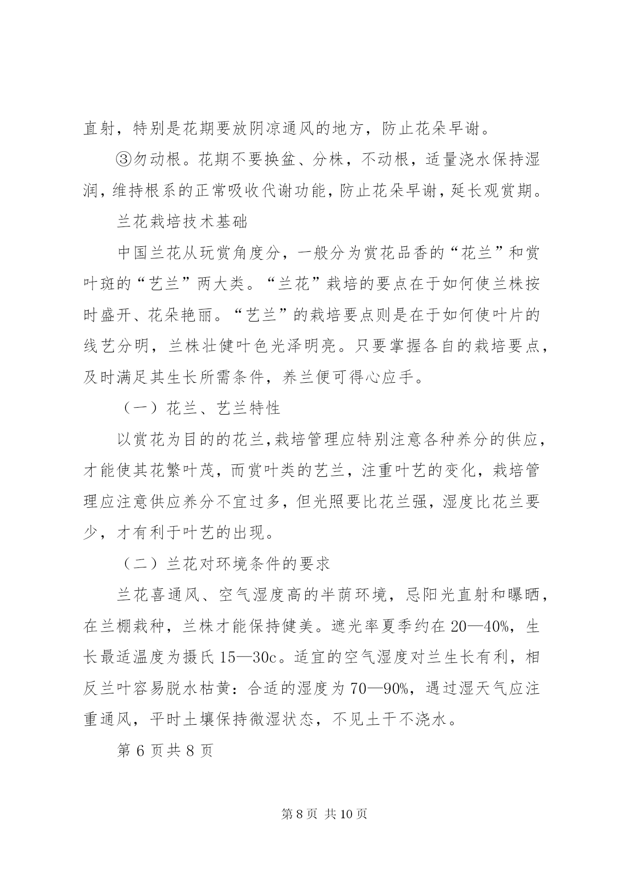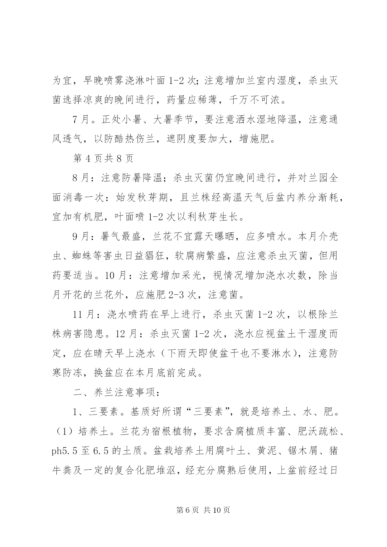 第PAGE\*Arabic\*MERGEFORMAT10页共NUMPAGES\*MERGEFORMAT10页切花百合栽培技术经验总结兰花栽培技术种植兰花,首先要做好兰场、兰棚及兰盆、植料等准备工作以后,才可实施栽种。一、栽培管理(一)兰场兰场应选择背西朝东方向的场所,东南方向空旷,西背方向有高墙或大树。既能见初阳、又能挡烈日。周围小环境空气清洁,有一定湿度保证的院落。注意透风、受露、避烈日、忌烟等。若建在屋顶或楼层阳台,除上面遮荫外,靠西北方向主要张挂帘子以防午后落日斜照灼伤草叶。兰棚下面最好用泥地或下设清水池,以保持兰棚周围空气潮湿。并注意地面清洁,防止病虫害滋生。当室外气温降至5℃左右,须将兰盆移入室内,以防冻伤兰根。(二)兰棚兰花喜阴透风之处,室外若无兰棚庇荫,必遭受烈日曝晒、狂雨冲袭。传统兰棚用竹架上放布幔和竹帘。晴天遮烈日,雨天防雨,晚上拉开遮帘让兰沐浴露水。现代兰棚多用金属制成,用遮光网和塑料布防晒挡雨。兰花台架可分阶梯式和平台式,便于管理。室内养护,不需搭棚。(三)兰盆传统养兰均采用瓦盆。因传统植料为兰花泥,泥沫极细。为使兰根通气,故用瓦盆。由于植料的改变和观赏的需要,现大都采用砂盆和釉盆。由于兰花根子细长,以高腰敞口喇叭型圆盆为好。为便于泄水,盆底孔的口径要大,为了加强盆内外空气对象,盆底座宜高足鼎立为好。瓷盆因透气性差,较少用。(四)植料1.兰花泥。由树叶腐烂后累积在山岩凹处的泥土,具有松软、泄水、肥沃的特性。ph值在5.5-6.5间。2.火烤土。由生杂草的表面土经烧烤后留下的颗粒土。3.仙土。由四川峨眉山采挖研制的颗粒土,分大、中、小、三种规格。4.松柏兰石(火山石);台湾产,分大、中、小三种规格。5.圹基石。台湾产,以高山矿土为原料经技术处理的连续性气泡体。分大、中、小三种规格。6.植金石。日本产,分大、中、小三种规格。7.帝王石。日本产,天然透气多孔石。8.珍珠岩。排水性强、保湿、透气性较佳。(五)栽种首先将兰盆用清水浸透,盆底用塑料网罩遮住盆底孔,用粗石或粗仙土垫底,高度为盆深的1/3。若用粗粒仙土,必须先用水浸泡十天。待放入兰花,理顺兰根后放入中粒仙土或粗粒花泥。放置到离盆口一寸附近,用最细的仙土或兰花泥充实兰花假鳞附近,上面再覆盖一层中粒偏细之仙土或细石子。盆中安放兰苗时要注意为以后新苗留出空间。浇水阴放一星期后,便可正常放入兰棚养护。初学种兰者可先种些普通或报岁兰(墨兰),取得经验后再逐步提高档次。二、兰花管理简介一月。兰花喜润畏湿,喜干畏燥,此月浇水宜在上午,杀虫、杀菌各一次,叶面施肥1-2次。注意。防寒风侵袭,此月不施肥。二月。春芽萌动,每十天灭菌杀虫一次,薄肥间施。注意。防肥药过浓而伤害芽叶。三月。春分时节,天气渐暖。尽早剪除已观赏过的花枝及败叶,可叶面和盆土施肥交叉进行,以淡为宜。此月兰花分株换盆的最佳时期。注意。补充有机肥和增加采光并杀虫灭菌。四月。梅雨季节,灭菌防病是本月最为重要的事情。叶面喷药1-2次,除叶面灰尘以利光合作用。注意。防过度雨淋,高温受害,让兰花多接受阳光。五月。阳光渐强,应适当遮光,多追肥,但不能过浓,应换盆的尽快在阴天换盆。注意。防止新芽出现虫害。六月。暑气初蒸,素心兰、四季兰逐日竟放,早晚间喷雾浇洗叶面1-2次,杀虫灭菌应在凉爽的晚间进行,多追施薄肥。注意。不宜随便分株换盆。七月。小暑,大暑季节,应早晚喷水,加大遮荫度,增施有机肥,浇水应在夜间进行。兰盆间放置水盆并洒水湿地降温。注意。防酷热伤兰,应通风透气。八月。秋季开始,增加有机肥,杀虫灭菌浇水仍宜在夜间进行本月是素心兰、四季兰盛花期,花后应补充营养。注意。须防暑降温。九月。暑气最盛,应多喷水,按正常用量杀虫灭菌。墨兰、春兰、蕙兰花葶已出,保护好花蕾。注意。兰花忌露天曝晒。十月。增加采光量,视情况增加浇水次数,除开花株外,应施肥2-3次,换盆换料应在本月底前完成,喷洗兰叶1-2次,进行叶面除尘。注意。加强杀菌,防兰株带疾过冬。十一月。早霜来临,应停止施肥,浇水喷药在早上进行,杀虫,灭菌2-3次。注意。怕寒兰应渐移入室。十二月。兰花进入冬眠期,避免换盆施肥。杀虫灭菌2-3次,浇水在晴天的早上进行。注意。防寒、防霜冻。介绍南方兰花栽培的月历管理技术及注意事项:一、南方兰花栽培月历管理技术:1月:浇水直在上午。杀虫杀菌各一次,叶面施肥1-2次。2月:要注意消毒灭菌杀虫一次,施肥、用药须小心以防肥药过浓而伤芽叶,可适量埋施有机肥以促进新活力,迎接正春芽的发枝。3月:春分之时天气渐暖兰花经冬眠期开始苏醒,新芽初露,注意补充有机肥和增加采光,虫菌开始活动,除虫灭菌要用好药并按说明施用。4月:进入梅雨季节,极易发生软腐病、黑斑病、炭疽病等病害,要注意灭菌防病喷药1-2次;特别要注意株心积水引起软腐