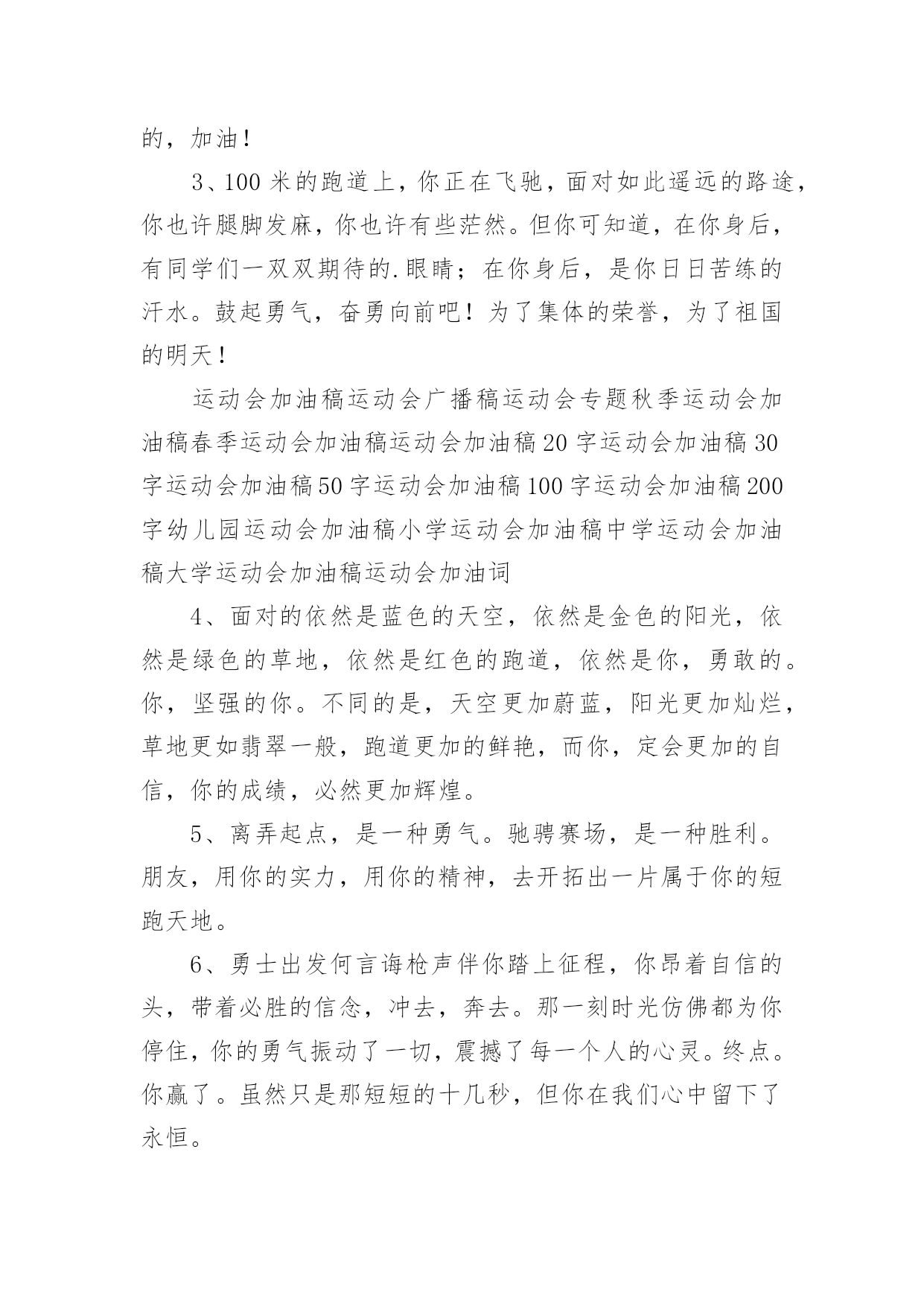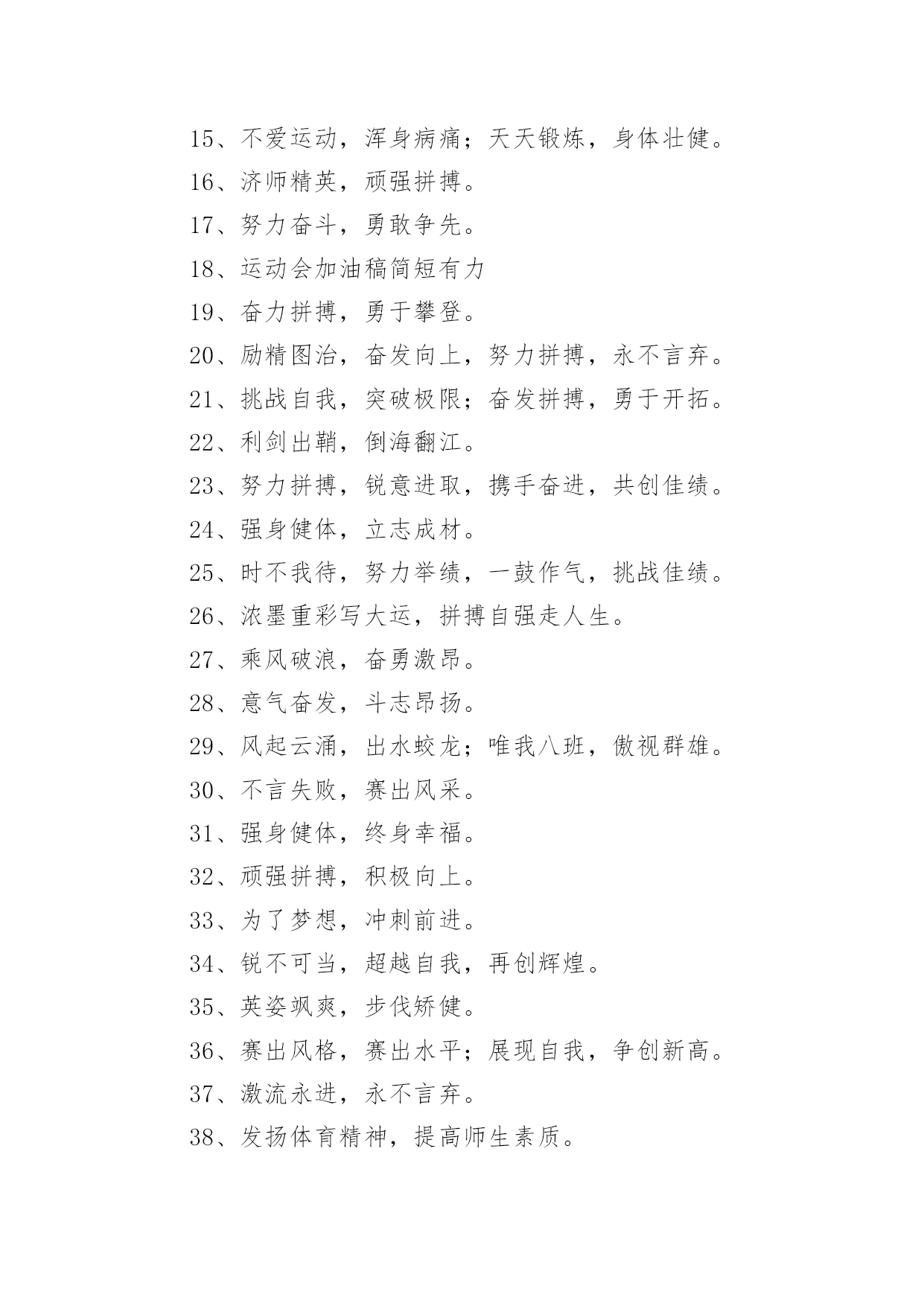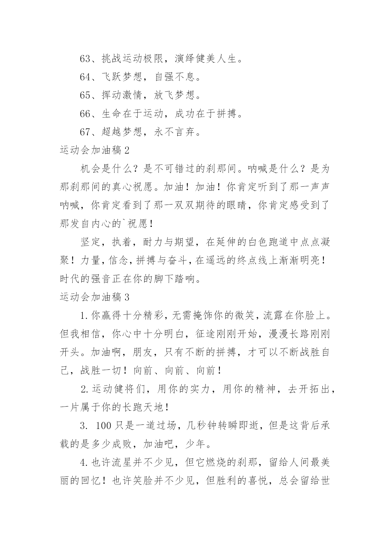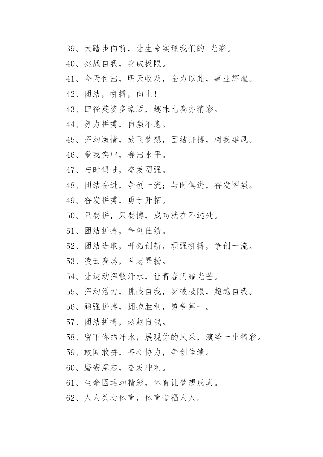 运动会加油稿运动会加油稿15篇【优选】在现在社会,很多情况下我们需要用到加油稿,加油稿是用于给别人加油鼓气,提升别人气势的文稿。相信许多人会觉得加油稿很难写吧,下面是小编精心整理的运动会加油稿,欢迎大家借鉴与参考,希望对大家有所帮助。运动会加油稿11、青春无畏,逐梦扬威。2、互相学习,取长补短,再接再厉,勇攀高峰。3、与时俱进,开拓创新,顽强拼搏,勇夺第一。4、锻炼意志,强身健体。5、七彩阳光,积极向上。6、体育如花绽放快乐校园,青春似火燃烧亮丽人生。7、努力拼搏,锐意进取。8、青春如火,超越自我,八年五班,奋勇拼搏。9、用心积极,努力拼搏,磨练意志,强健体魄。10、励精图治,开拓进取。11、顽强拼搏,勇夺第一。12、体坛青春际会,校园运动乐章。13、健康的体魄,永恒的追求。14、互相学习,取长补短,再接再厉,勇攀高峰。15、不爱运动,浑身病痛;天天锻炼,身体壮健。16、济师精英,顽强拼搏。17、努力奋斗,勇敢争先。18、运动会加油稿简短有力19、奋力拼搏,勇于攀登。20、励精图治,奋发向上,努力拼搏,永不言弃。21、挑战自我,突破极限;奋发拼搏,勇于开拓。22、利剑出鞘,倒海翻江。23、努力拼搏,锐意进取,携手奋进,共创佳绩。24、强身健体,立志成材。25、时不我待,努力举绩,一鼓作气,挑战佳绩。26、浓墨重彩写大运,拼搏自强走人生。27、乘风破浪,奋勇激昂。28、意气奋发,斗志昂扬。29、风起云涌,出水蛟龙;唯我八班,傲视群雄。30、不言失败,赛出风采。31、强身健体,终身幸福。32、顽强拼搏,积极向上。33、为了梦想,冲刺前进。34、锐不可当,超越自我,再创辉煌。35、英姿飒爽,步伐矫健。36、赛出风格,赛出水平;展现自我,争创新高。37、激流永进,永不言弃。38、发扬体育精神,提高师生素质。39、大踏步向前,让生命实现我们的.光彩。40、挑战自我,突破极限。41、今天付出,明天收获,全力以赴,事业辉煌。42、团结,拼搏,向上!43、田径英姿多豪迈,趣味比赛亦精彩。44、努力拼搏,自强不息。45、挥动激情,放飞梦想,团结拼搏,树我雄风。46、爱我实中,赛出水平。47、与时俱进,奋发图强。48、团结奋进,争创一流;与时俱进,奋发图强。49、奋发拼搏,勇于开拓。50、只要拼,只要博,成功就在不远处。51、团结拼搏,争创佳绩。52、团结进取,开拓创新,顽强拼搏,争创一流。53、凌云赛场,斗志昂扬。54、让运动挥散汗水,让青春闪耀光芒。55、挥动活力,挑战自我,突破极限,超越自我。56、顽强拼搏,拥抱胜利,勇争第一。57、团结拼搏,超越自我。58、留下你的汗水,展现你的风采,演绎一出精彩。59、敢闯敢拼,齐心协力,争创佳绩。60、磨砺意志,奋发冲刺。61、生命因运动精彩,体育让梦想成真。62、人人关心体育,体育造福人人。63、挑战运动极限,演绎健美人生。64、飞跃梦想,自强不息。65、挥动激情,放飞梦想。66、生命在于运动,成功在于拼搏。67、超越梦想,永不言弃。运动会加油稿2机会是什么?是不可错过的刹那间。呐喊是什么?是为那刹那间的真心祝愿。加油!加油!你肯定听到了那一声声呐喊,你肯定看到了那一双双期待的眼睛,你肯定感受到了那发自内心的`祝愿!坚定,执着,耐力与期望,在延伸的白色跑道中点点凝聚!力量,信念,拼搏与奋斗,在遥远的终点线上渐渐明亮!时代的强音正在你的脚下踏响。运动会加油稿31.你赢得十分精彩,无需掩饰你的微笑,流露在你脸上。但我相信,你心中十分明白,征途刚刚开始,漫漫长路刚刚开头。加油啊,朋友,只有不断的拼搏,才可以不断战胜自己,战胜一切!向前、向前、向前!2.运动健将们,用你的实力,用你的精神,去开拓出,一片属于你的长跑天地!3.100只是一道过场,几秒钟转瞬即逝,但是这背后承载的是多少成败,加油吧,少年。4.也许流星并不少见,但它燃烧的刹那,留给人间最美丽的回忆!也许笑脸并不少见,但胜利的喜悦,总会留给世界精彩的一瞬!是的,那些以前美妙的东西只有短短的一瞬间,但那却把最辉煌的一刻留给了人间。胜利,是每个人所追求的,胜利的喜悦,是胜利与重新开始的转折,胜利是新的开始!5.跑道,是你勇气的选择,驰骋赛场,获得胜利,是你实力的体现,是你的战场,在这里你所向披靡。6.不为鲜花的围绕,不为刹那的荣耀,只有执着的信念,化作不停的奔跑,心中燃烧着梦想,脚下不停的步伐。7.虽然你们在场上的时间很短暂,但你们的身影依然停留在人们的脑海里,因为你们是赛场上最可爱的人,不为掌声的注释,不为刻意的征服,不为失败的痛苦,只有辛勤的汗水化作成功的脚步8.心中坚定的信念,脚下沉稳的步伐,你用行动告诉我们一个不变之理,没有走不完的路,没有过不了的山,成功正在终点冲着你高高的招手,用你那顽强的`意志去努力,去迎接终点的鲜花与掌声,相信成功务