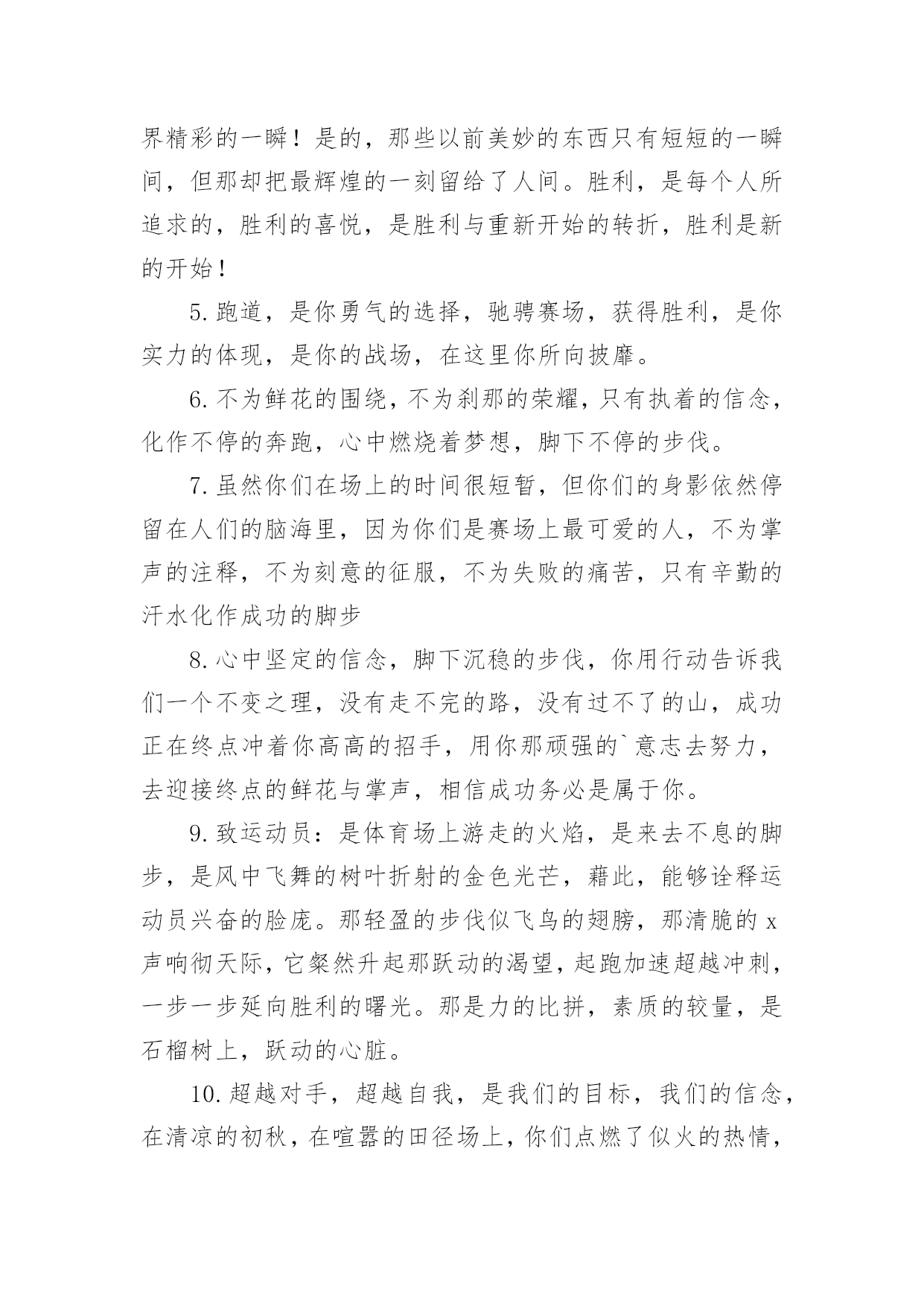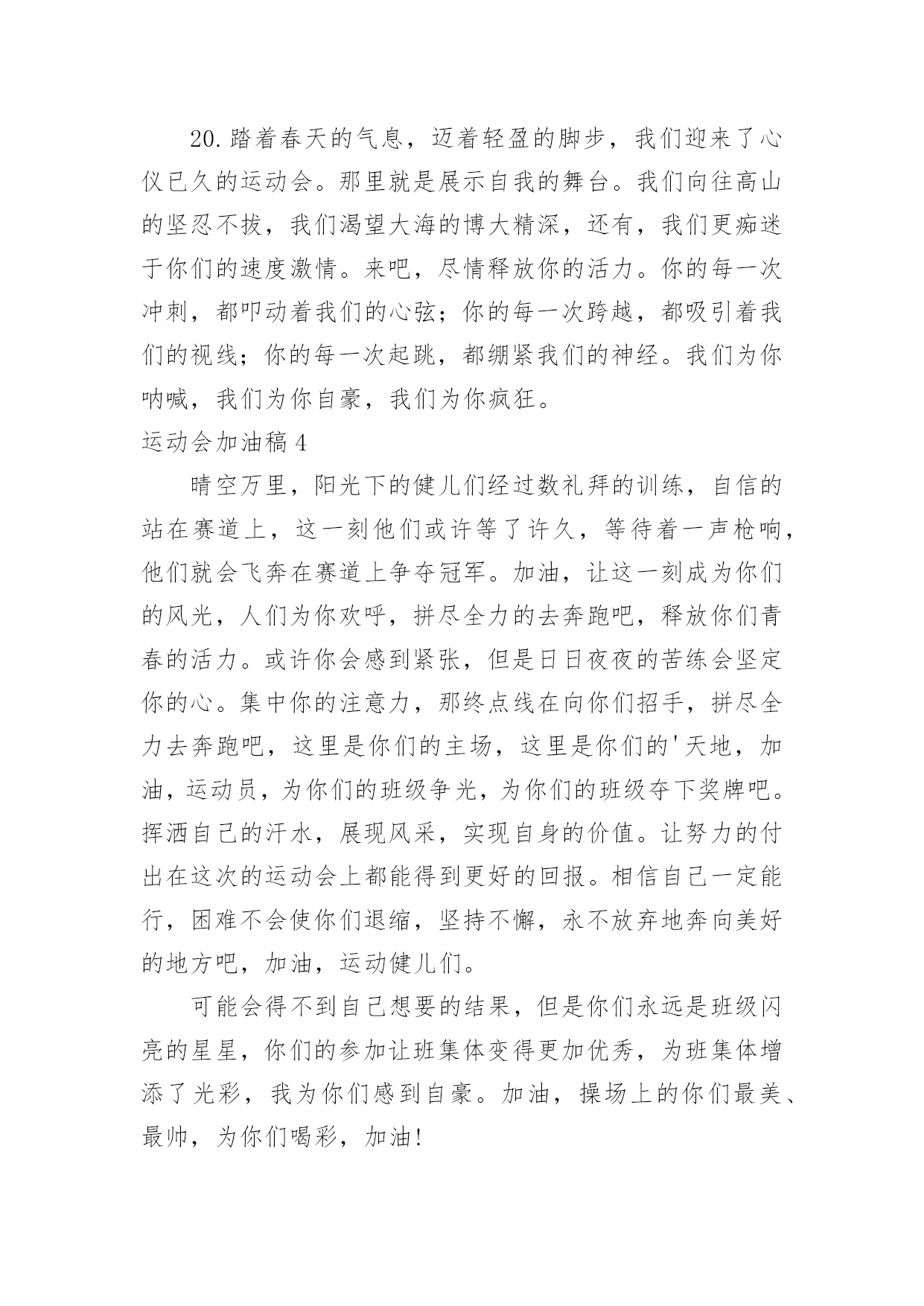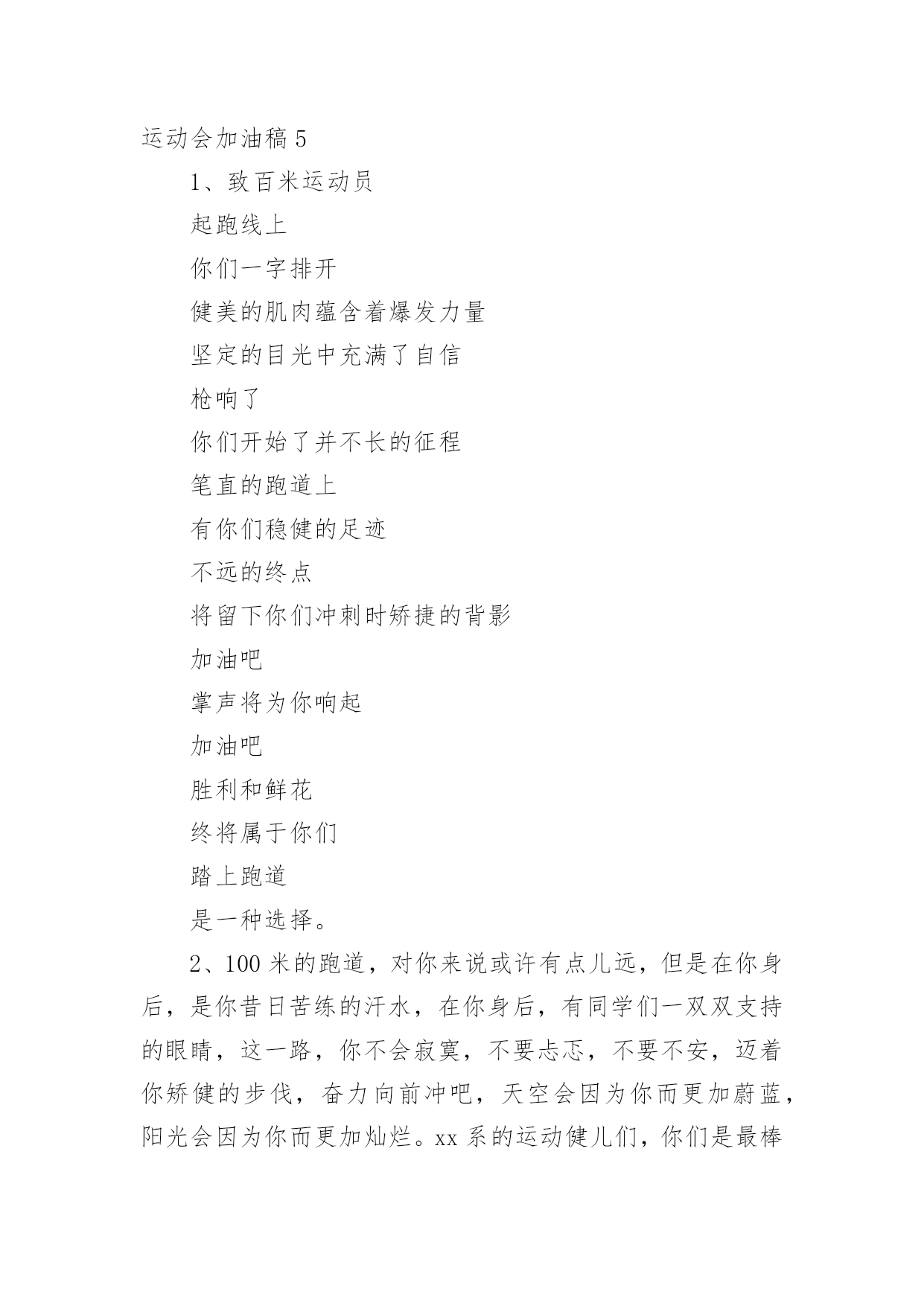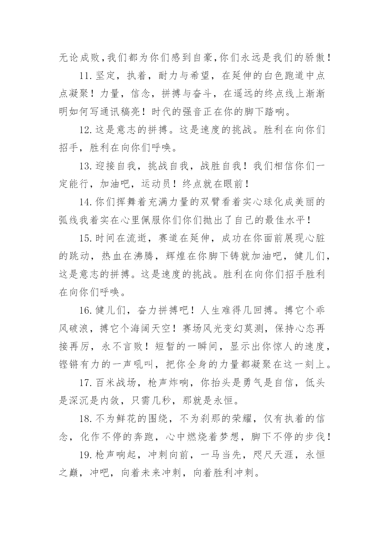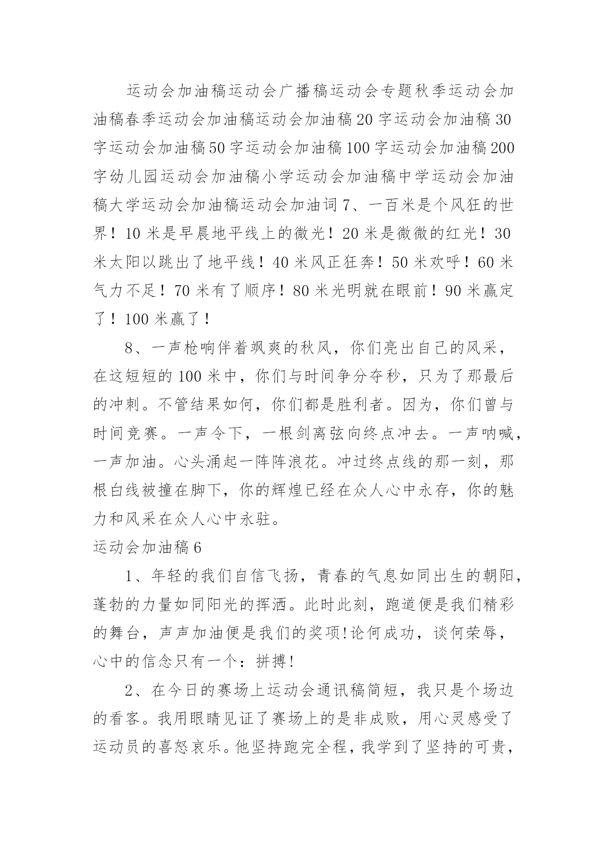 运动会加油稿运动会加油稿15篇【优选】在现在社会,很多情况下我们需要用到加油稿,加油稿是用于给别人加油鼓气,提升别人气势的文稿。相信许多人会觉得加油稿很难写吧,下面是小编精心整理的运动会加油稿,欢迎大家借鉴与参考,希望对大家有所帮助。运动会加油稿11、青春无畏,逐梦扬威。2、互相学习,取长补短,再接再厉,勇攀高峰。3、与时俱进,开拓创新,顽强拼搏,勇夺第一。4、锻炼意志,强身健体。5、七彩阳光,积极向上。6、体育如花绽放快乐校园,青春似火燃烧亮丽人生。7、努力拼搏,锐意进取。8、青春如火,超越自我,八年五班,奋勇拼搏。9、用心积极,努力拼搏,磨练意志,强健体魄。10、励精图治,开拓进取。11、顽强拼搏,勇夺第一。12、体坛青春际会,校园运动乐章。13、健康的体魄,永恒的追求。14、互相学习,取长补短,再接再厉,勇攀高峰。15、不爱运动,浑身病痛;天天锻炼,身体壮健。16、济师精英,顽强拼搏。17、努力奋斗,勇敢争先。18、运动会加油稿简短有力19、奋力拼搏,勇于攀登。20、励精图治,奋发向上,努力拼搏,永不言弃。21、挑战自我,突破极限;奋发拼搏,勇于开拓。22、利剑出鞘,倒海翻江。23、努力拼搏,锐意进取,携手奋进,共创佳绩。24、强身健体,立志成材。25、时不我待,努力举绩,一鼓作气,挑战佳绩。26、浓墨重彩写大运,拼搏自强走人生。27、乘风破浪,奋勇激昂。28、意气奋发,斗志昂扬。29、风起云涌,出水蛟龙;唯我八班,傲视群雄。30、不言失败,赛出风采。31、强身健体,终身幸福。32、顽强拼搏,积极向上。33、为了梦想,冲刺前进。34、锐不可当,超越自我,再创辉煌。35、英姿飒爽,步伐矫健。36、赛出风格,赛出水平;展现自我,争创新高。37、激流永进,永不言弃。38、发扬体育精神,提高师生素质。39、大踏步向前,让生命实现我们的.光彩。40、挑战自我,突破极限。41、今天付出,明天收获,全力以赴,事业辉煌。42、团结,拼搏,向上!43、田径英姿多豪迈,趣味比赛亦精彩。44、努力拼搏,自强不息。45、挥动激情,放飞梦想,团结拼搏,树我雄风。46、爱我实中,赛出水平。47、与时俱进,奋发图强。48、团结奋进,争创一流;与时俱进,奋发图强。49、奋发拼搏,勇于开拓。50、只要拼,只要博,成功就在不远处。51、团结拼搏,争创佳绩。52、团结进取,开拓创新,顽强拼搏,争创一流。53、凌云赛场,斗志昂扬。54、让运动挥散汗水,让青春闪耀光芒。55、挥动活力,挑战自我,突破极限,超越自我。56、顽强拼搏,拥抱胜利,勇争第一。57、团结拼搏,超越自我。58、留下你的汗水,展现你的风采,演绎一出精彩。59、敢闯敢拼,齐心协力,争创佳绩。60、磨砺意志,奋发冲刺。61、生命因运动精彩,体育让梦想成真。62、人人关心体育,体育造福人人。63、挑战运动极限,演绎健美人生。64、飞跃梦想,自强不息。65、挥动激情,放飞梦想。66、生命在于运动,成功在于拼搏。67、超越梦想,永不言弃。运动会加油稿2机会是什么?是不可错过的刹那间。呐喊是什么?是为那刹那间的真心祝愿。加油!加油!你肯定听到了那一声声呐喊,你肯定看到了那一双双期待的眼睛,你肯定感受到了那发自内心的`祝愿!坚定,执着,耐力与期望,在延伸的白色跑道中点点凝聚!力量,信念,拼搏与奋斗,在遥远的终点线上渐渐明亮!时代的强音正在你的脚下踏响。运动会加油稿31.你赢得十分精彩,无需掩饰你的微笑,流露在你脸上。但我相信,你心中十分明白,征途刚刚开始,漫漫长路刚刚开头。加油啊,朋友,只有不断的拼搏,才可以不断战胜自己,战胜一切!向前、向前、向前!2.运动健将们,用你的实力,用你的精神,去开拓出,一片属于你的长跑天地!3.100只是一道过场,几秒钟转瞬即逝,但是这背后承载的是多少成败,加油吧,少年。4.也许流星并不少见,但它燃烧的刹那,留给人间最美丽的回忆!也许笑脸并不少见,但胜利的喜悦,总会留给世界精彩的一瞬!是的,那些以前美妙的东西只有短短的一瞬间,但那却把最辉煌的一刻留给了人间。胜利,是每个人所追求的,胜利的喜悦,是胜利与重新开始的转折,胜利是新的开始!5.跑道,是你勇气的选择,驰骋赛场,获得胜利,是你实力的体现,是你的战场,在这里你所向披靡。6.不为鲜花的围绕,不为刹那的荣耀,只有执着的信念,化作不停的奔跑,心中燃烧着梦想,脚下不停的步伐。7.虽然你们在场上的时间很短暂,但你们的身影依然停留在人们的脑海里,因为你们是赛场上最可爱的人,不为掌声的注释,不为刻意的征服,不为失败的痛苦,只有辛勤的汗水化作成功的脚步8.心中坚定的信念,脚下沉稳的步伐,你用行动告诉我们一个不变之理,没有走不完的路,没有过不了的山,成功正在终点冲着你高高的招手,用你那顽强的`意志去努力,去迎接终点的鲜花与掌声,相信成功务