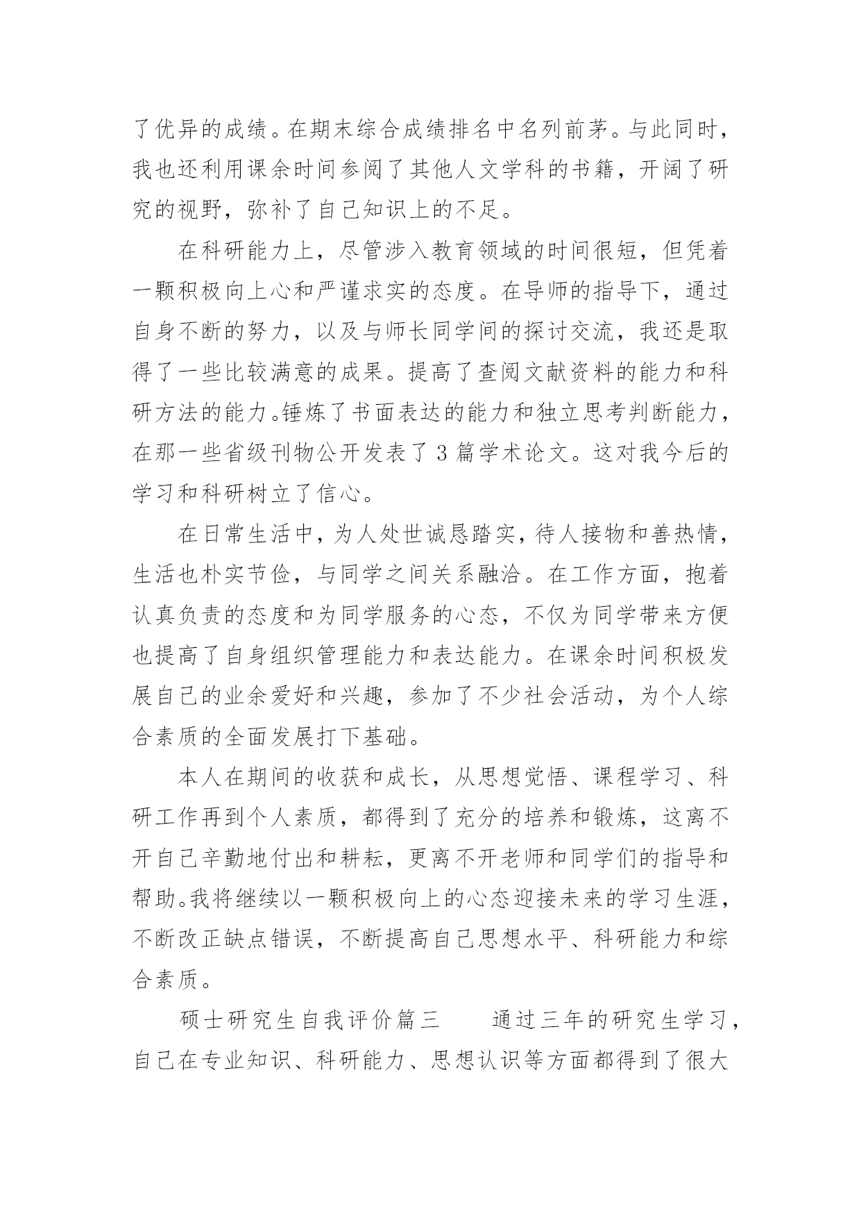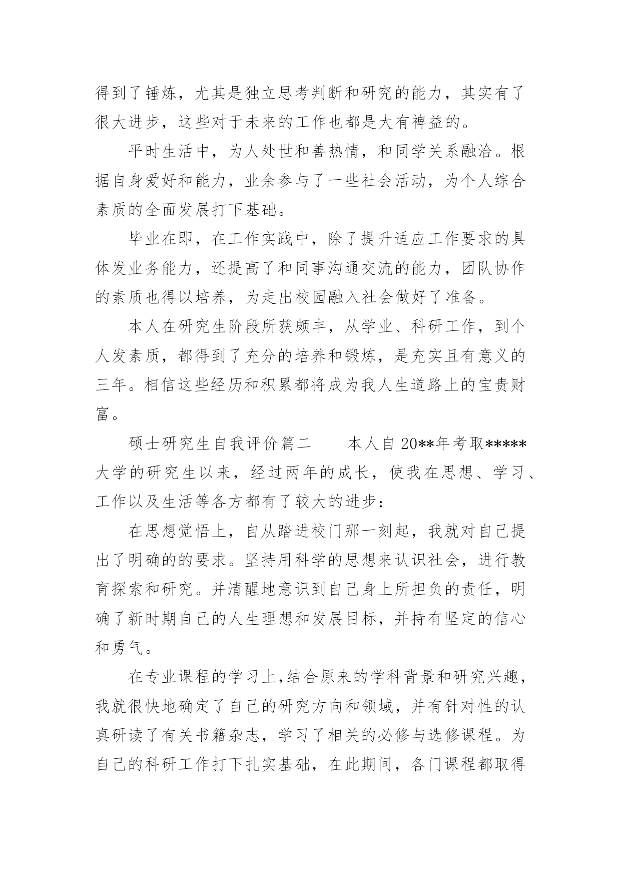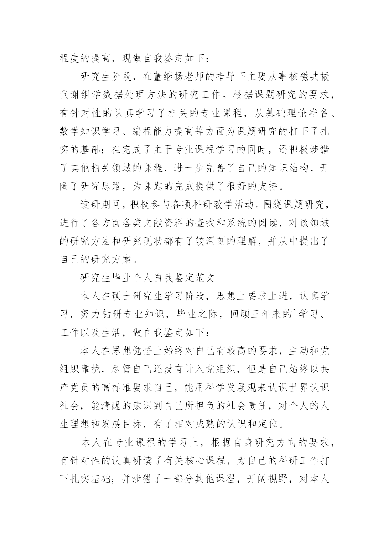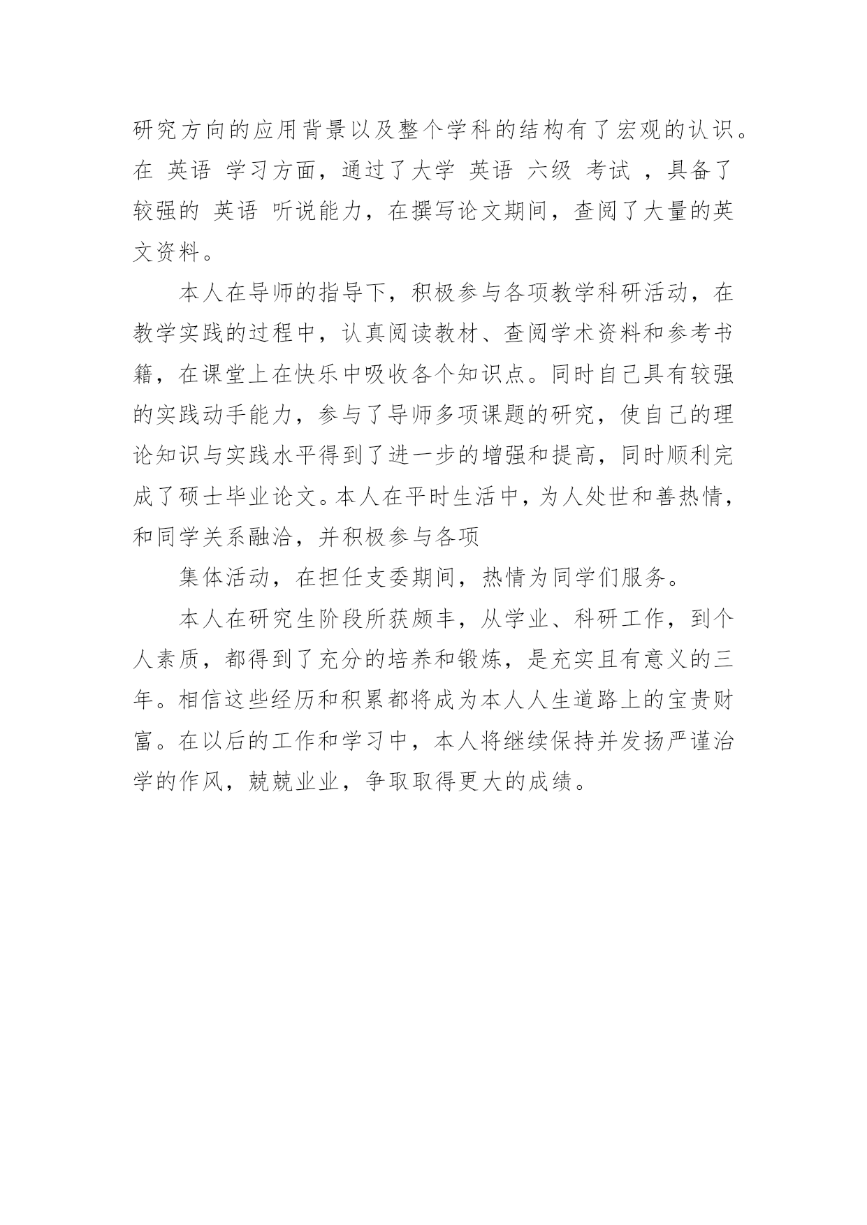 硕士研究生自我评价报告硕士研究生自我评价报告模板研究生在大学潜心学习的多年,也渐渐的开始明确自己的发展研究方向,而每位硕士研究生的自我评价应该怎么样写在导师看来才不错。以下是为大家整理关于硕士研究生自我评价的集锦,希望能够帮到你。硕士研究生自我评价篇一本人作为研究生在复旦大学数学所攻读计算数学专业近三年,毕业之际,回顾三年来的学习、工作以及生活,做自我鉴定如下:本人在思想觉悟上始终对自己有较高的要求,能用科学发展观来认识世界认识社会,能清醒的意识到自己所担负的社会责任,对个人的人生理想和发展目标,有了相对成熟的认识和定位。在专业课程的学习上,根据自身研究方向的要求,有针对性的认真研读了有关核心课程,为自己的科研工作打下扎实基础;并涉猎了一部分其他课程,开阔视野,对本研究方向的应用背景以及整个学科的结构有了宏观的认识。学习成绩也比较理想。在外语方面,研究生阶段着重加强了书面与写作的训练,并取得了一定效果。在科研工作上,根据导师的指导,研读了大量论著,逐步明确了研究方向,通过自身不断的努力,以及与师长同学间的探讨交流,取得了一些比较满意的成果。在这期间,查阅资料,综合分析等基本素质不断提高,书面表达的能力也得到了锤炼,尤其是独立思考判断和研究的能力,其实有了很大进步,这些对于未来的工作也都是大有裨益的。平时生活中,为人处世和善热情,和同学关系融洽。根据自身爱好和能力,业余参与了一些社会活动,为个人综合素质的全面发展打下基础。毕业在即,在工作实践中,除了提升适应工作要求的具体发业务能力,还提高了和同事沟通交流的能力,团队协作的素质也得以培养,为走出校园融入社会做好了准备。本人在研究生阶段所获颇丰,从学业、科研工作,到个人发素质,都得到了充分的培养和锻炼,是充实且有意义的三年。相信这些经历和积累都将成为我人生道路上的宝贵财富。硕士研究生自我评价篇二本人自20**年考取*****大学的研究生以来,经过两年的成长,使我在思想、学习、工作以及生活等各方都有了较大的进步:在思想觉悟上,自从踏进校门那一刻起,我就对自己提出了明确的的要求。坚持用科学的思想来认识社会,进行教育探索和研究。并清醒地意识到自己身上所担负的责任,明确了新时期自己的人生理想和发展目标,并持有坚定的信心和勇气。在专业课程的学习上,结合原来的学科背景和研究兴趣,我就很快地确定了自己的研究方向和领域,并有针对性的认真研读了有关书籍杂志,学习了相关的必修与选修课程。为自己的科研工作打下扎实基础,在此期间,各门课程都取得了优异的成绩。在期末综合成绩排名中名列前茅。与此同时,我也还利用课余时间参阅了其他人文学科的书籍,开阔了研究的视野,弥补了自己知识上的不足。在科研能力上,尽管涉入教育领域的时间很短,但凭着一颗积极向上心和严谨求实的态度。在导师的指导下,通过自身不断的努力,以及与师长同学间的探讨交流,我还是取得了一些比较满意的成果。提高了查阅文献资料的能力和科研方法的能力。锤炼了书面表达的能力和独立思考判断能力,在那一些省级刊物公开发表了3篇学术论文。这对我今后的学习和科研树立了信心。在日常生活中,为人处世诚恳踏实,待人接物和善热情,生活也朴实节俭,与同学之间关系融洽。在工作方面,抱着认真负责的态度和为同学服务的心态,不仅为同学带来方便也提高了自身组织管理能力和表达能力。在课余时间积极发展自己的业余爱好和兴趣,参加了不少社会活动,为个人综合素质的全面发展打下基础。本人在期间的收获和成长,从思想觉悟、课程学习、科研工作再到个人素质,都得到了充分的培养和锻炼,这离不开自己辛勤地付出和耕耘,更离不开老师和同学们的指导和帮助。我将继续以一颗积极向上的心态迎接未来的学习生涯,不断改正缺点错误,不断提高自己思想水平、科研能力和综合素质。硕士研究生自我评价篇三通过三年的研究生学习,自己在专业知识、科研能力、思想认识等方面都得到了很大程度的提高,现做自我鉴定如下:研究生阶段,在董继扬老师的指导下主要从事核磁共振代谢组学数据处理方法的研究工作。根据课题研究的要求,有针对性的认真学习了相关的专业课程,从基础理论准备、数学知识学习、编程能力提高等方面为课题研究的打下了扎实的基础;在完成了主干专业课程学习的同时,还积极涉猎了其他相关领域的课程,进一步完善了自己的知识结构,开阔了研究思路,为课题的完成提供了很好的支持。读研期间,积极参与各项科研教学活动。围绕课题研究,进行了各方面各类文献资料的查找和系统的阅读,对该领域的研究方法和研究现状都有了较深刻的理解,并从中提出了自己的研究方案。研究生毕业个人自我鉴定范文本人在硕士研究生学习阶段,思想上要求上进,认真学习,努力钻研专业知识,毕业之际,回顾三年来的`学习、工作以及生活,做自我鉴定如下:本人在思想觉悟上始终对自己有较高的要求,主动和党组织靠拢,尽管自己还